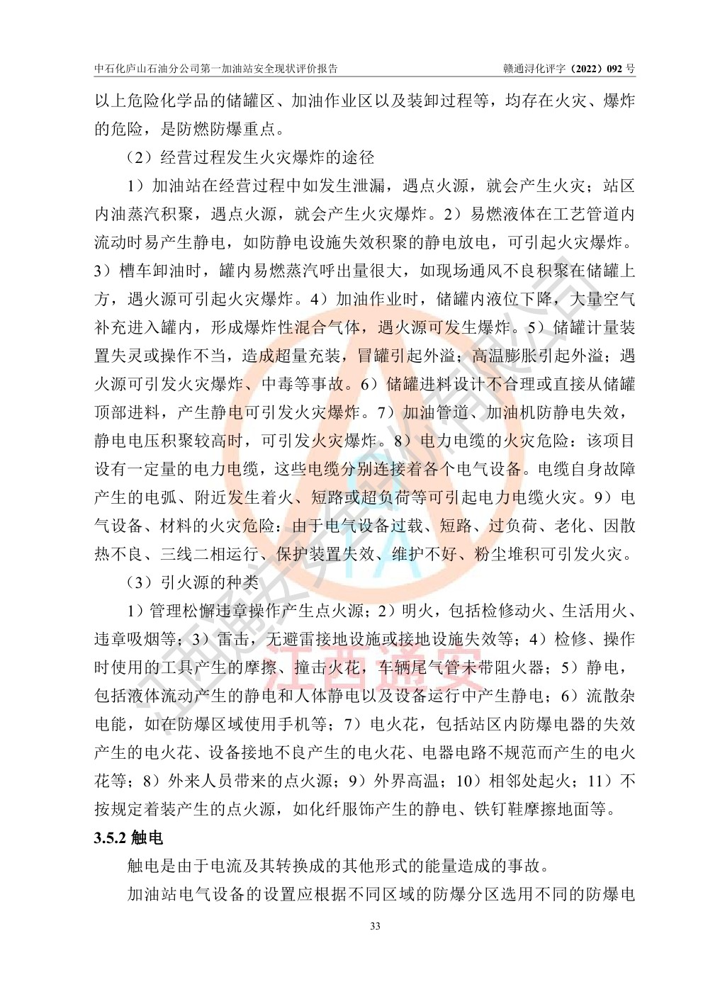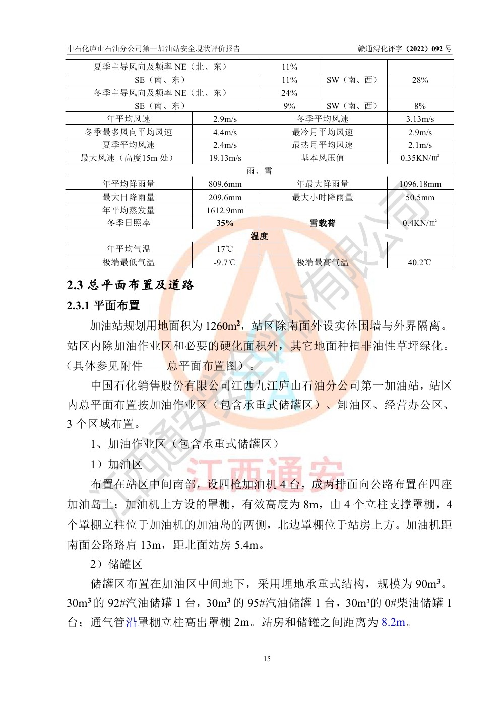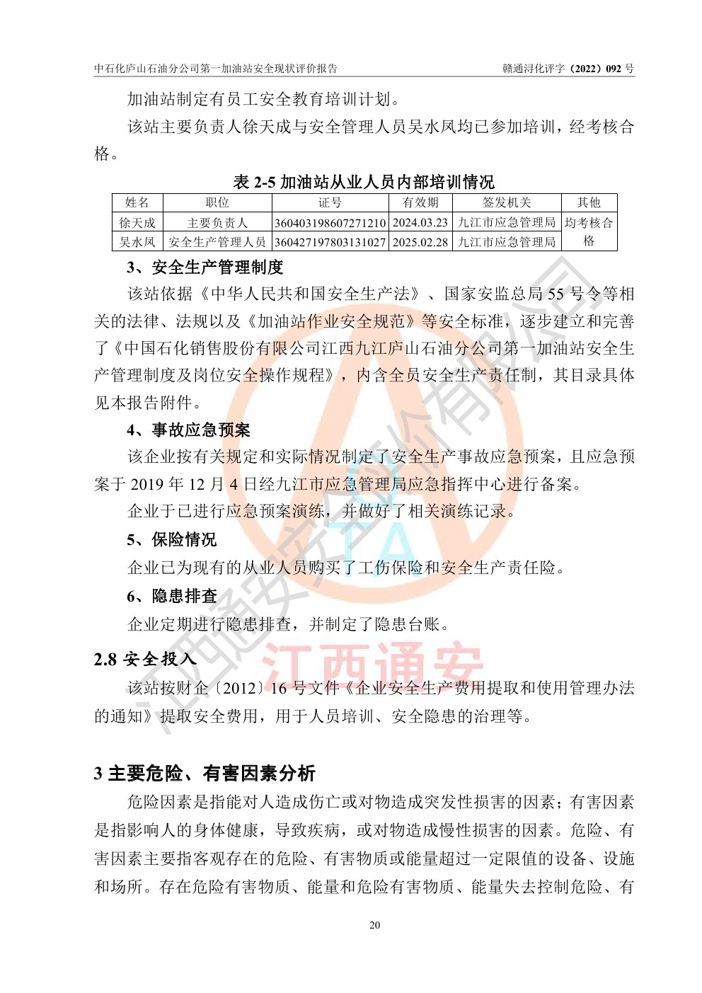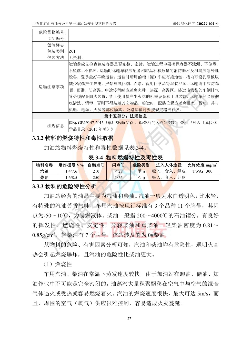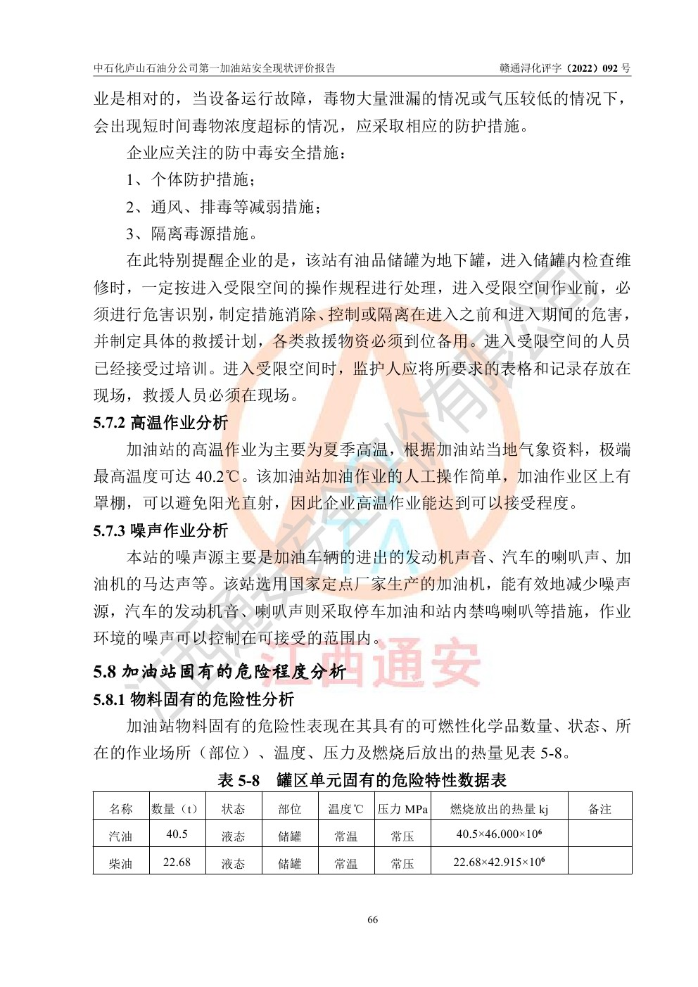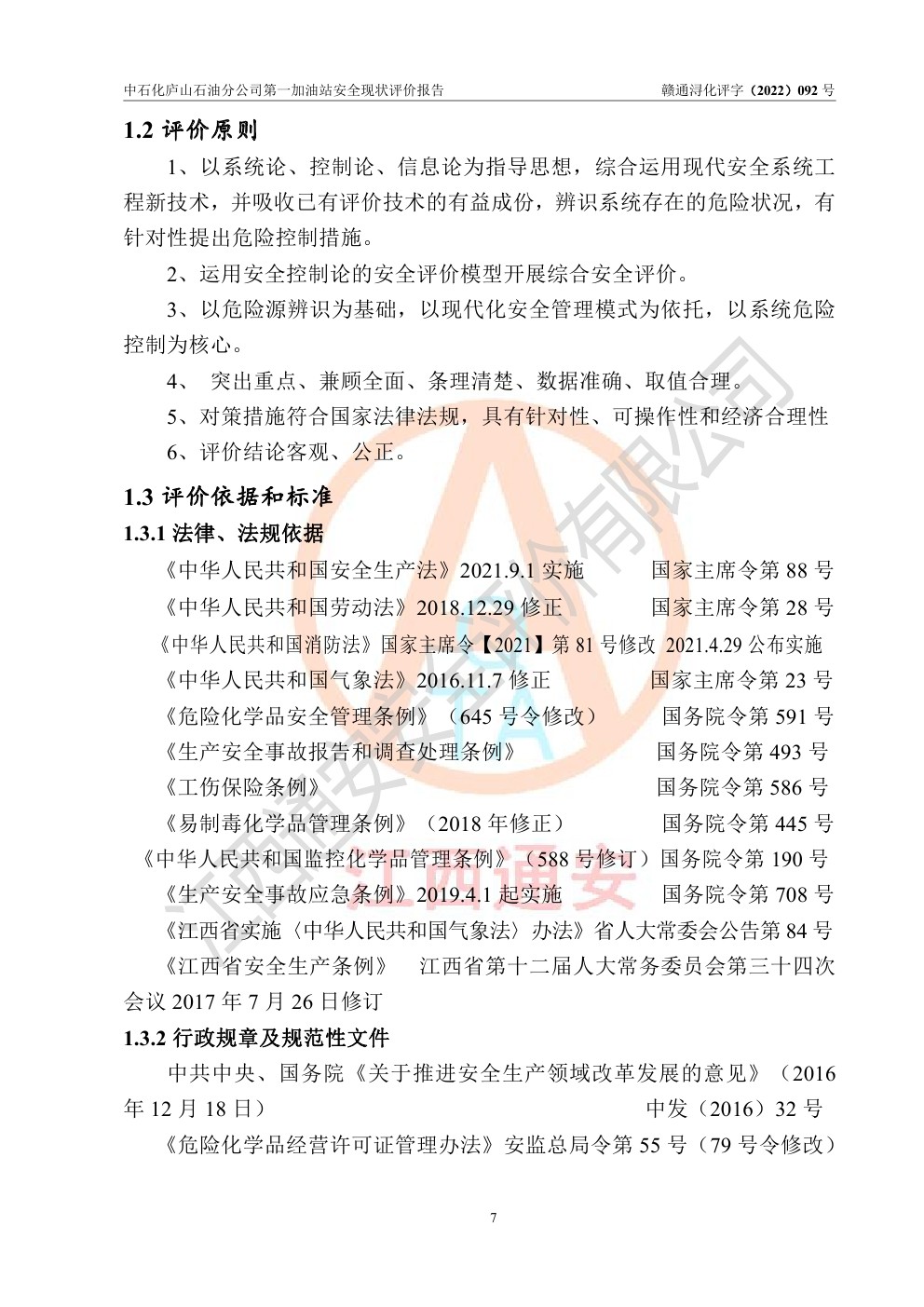 該企業(yè)屬三級加油站,主要從事成品油零售經(jīng)營,經(jīng)營的油品有0#柴油、92#汽油、95#汽油。 該項(xiàng)目為一功能集中的加油站,且設(shè)備設(shè)施集中在站區(qū)內(nèi),根據(jù)空間相對獨(dú)立、事故范圍相對固定、具有明顯特征界限的原則,評價(jià)小組確定將其劃分為一個評價(jià)單元。選擇安全檢查表法和危險(xiǎn)指數(shù)方法進(jìn)行評價(jià)。 1、加油站涉及的汽油、柴油屬于易燃液體,汽油屬于重點(diǎn)監(jiān)管的危險(xiǎn)化學(xué)品;不構(gòu)成《危險(xiǎn)化學(xué)品重大危險(xiǎn)源辨識》規(guī)定危險(xiǎn)化學(xué)品重大危險(xiǎn)源。 2、經(jīng)營過程中存在的主要危險(xiǎn)有:火災(zāi)、爆炸等。 3、中國石化銷售股份有限公司江西九江廬山石油分公司**加油站涉及的安全條件、安全經(jīng)營條件、安全生產(chǎn)管理符合《危險(xiǎn)化學(xué)品經(jīng)營許可證管理辦法》、《汽車加油加氣加氫站技術(shù)標(biāo)準(zhǔn)》等**有關(guān)法規(guī)、標(biāo)準(zhǔn)、規(guī)范要求,能滿足危險(xiǎn)化學(xué)品經(jīng)營安全條件。 |