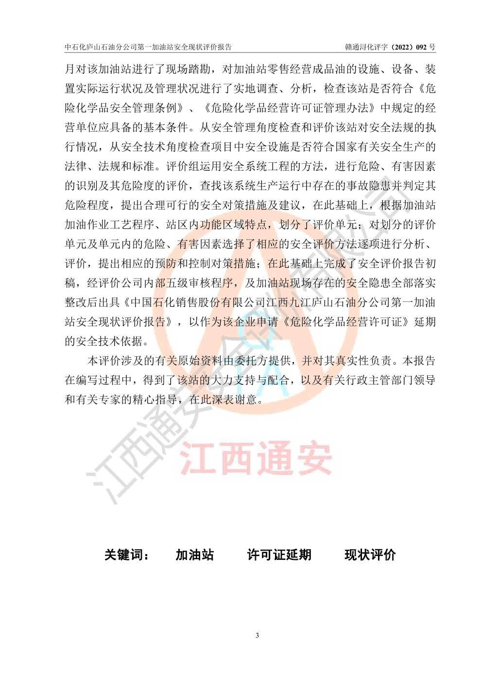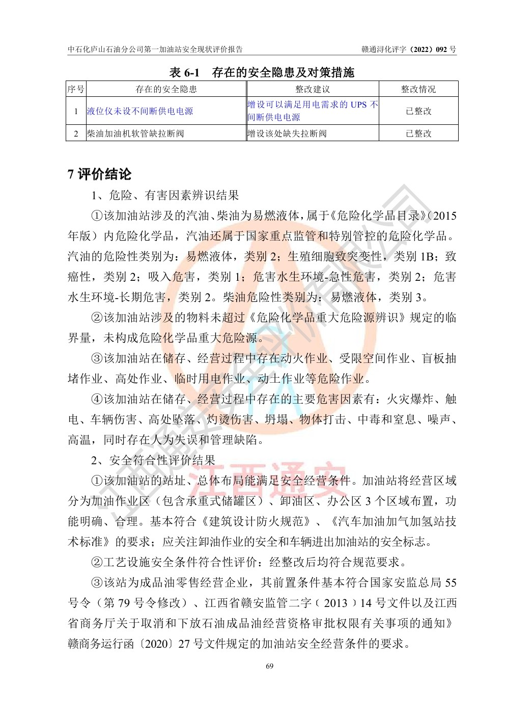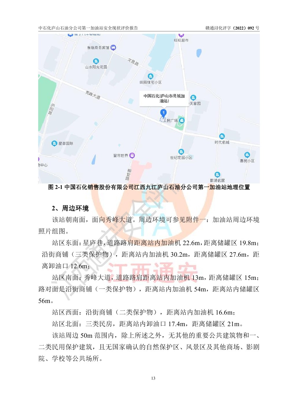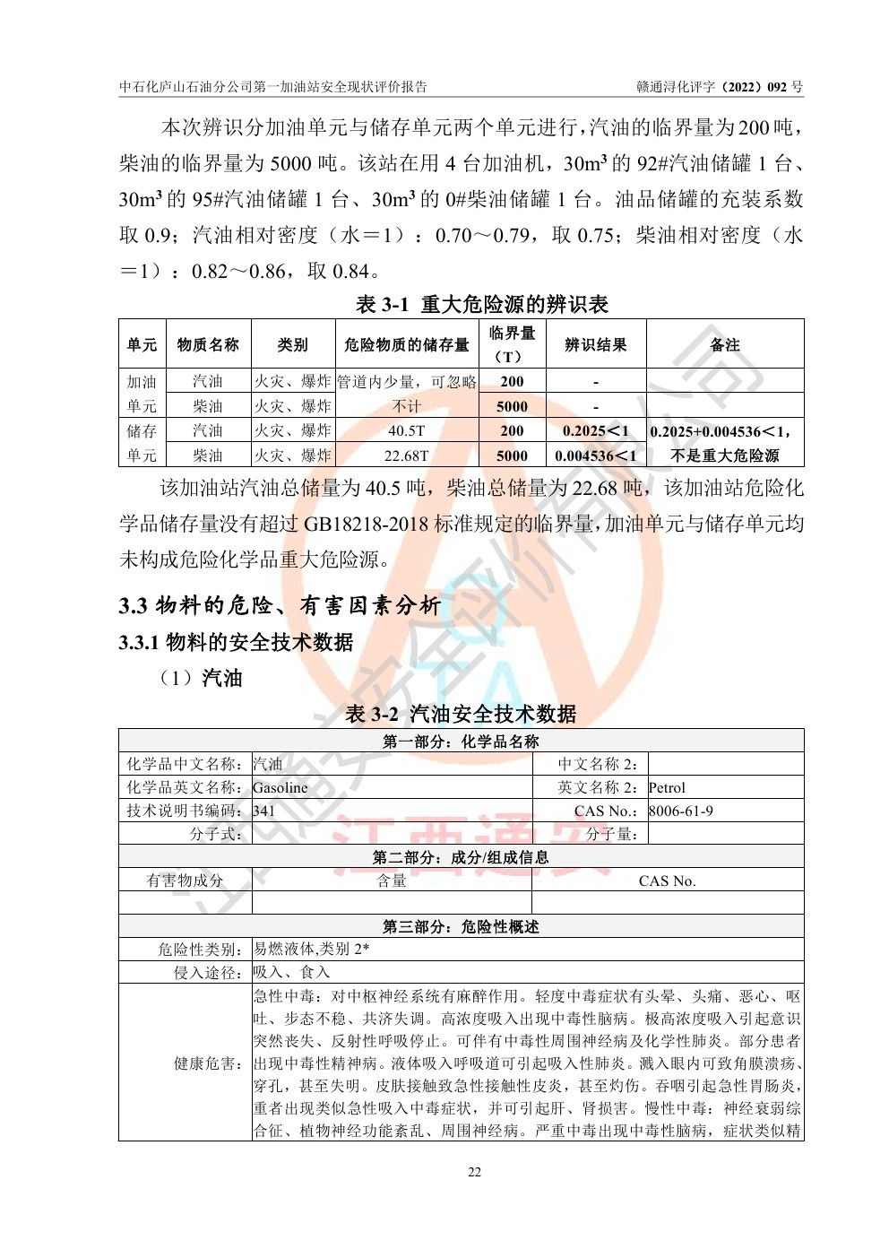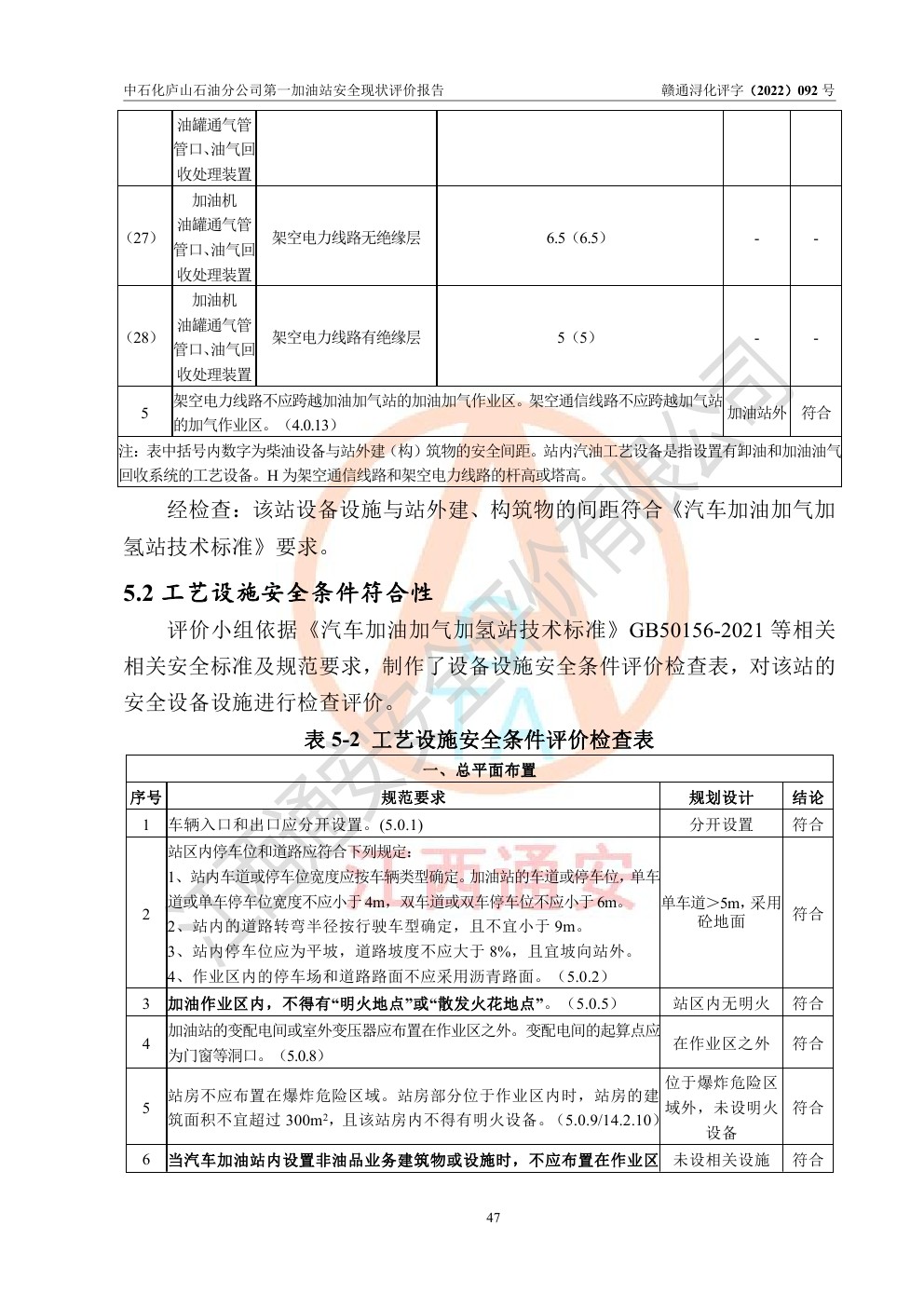 該企業(yè)屬三級加油站,主要從事成品油零售經(jīng)營,經(jīng)營的油品有0#柴油、92#汽油、95#汽油。 該項(xiàng)目為一功能集中的加油站,且設(shè)備設(shè)施集中在站區(qū)內(nèi),根據(jù)空間相對獨(dú)立、事故范圍相對固定、具有明顯特征界限的原則,評價(jià)小組確定將其劃分為一個評價(jià)單元。選擇安全檢查表法和危險(xiǎn)指數(shù)方法進(jìn)行評價(jià)。 1、加油站涉及的汽油、柴油屬于易燃液體,汽油屬于重點(diǎn)監(jiān)管的危險(xiǎn)化學(xué)品;不構(gòu)成《危險(xiǎn)化學(xué)品重大危險(xiǎn)源辨識》規(guī)定危險(xiǎn)化學(xué)品重大危險(xiǎn)源。 2、經(jīng)營過程中存在的主要危險(xiǎn)有:火災(zāi)、爆炸等。 3、中國石化銷售股份有限公司江西九江廬山石油分公司**加油站涉及的安全條件、安全經(jīng)營條件、安全生產(chǎn)管理符合《危險(xiǎn)化學(xué)品經(jīng)營許可證管理辦法》、《汽車加油加氣加氫站技術(shù)標(biāo)準(zhǔn)》等**有關(guān)法規(guī)、標(biāo)準(zhǔn)、規(guī)范要求,能滿足危險(xiǎn)化學(xué)品經(jīng)營安全條件。 |