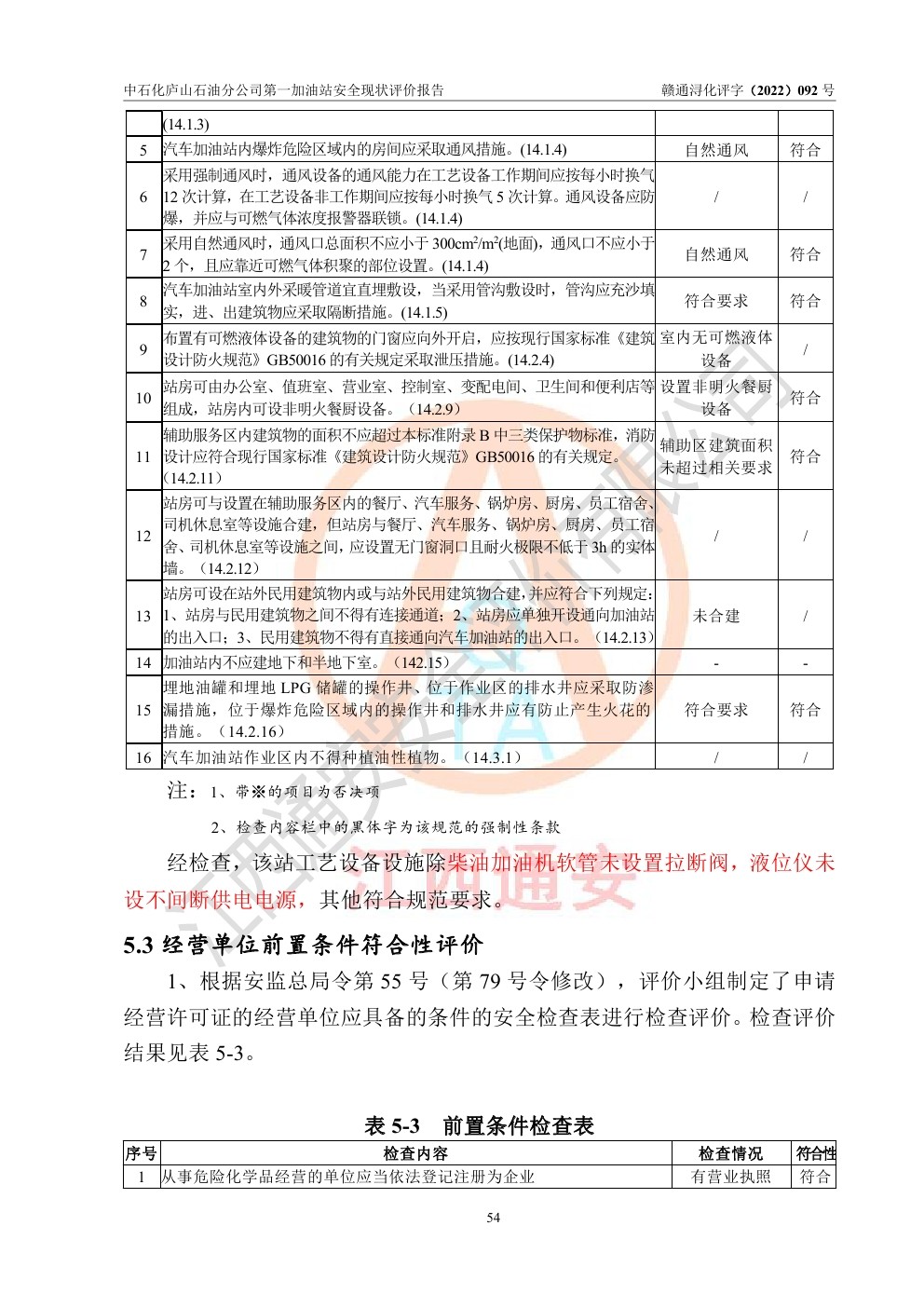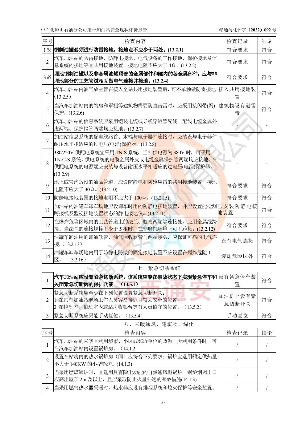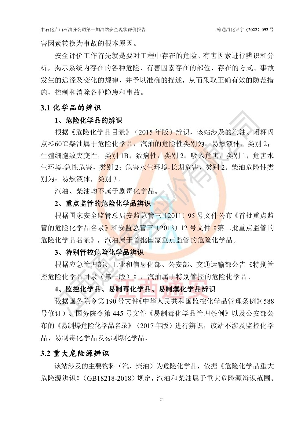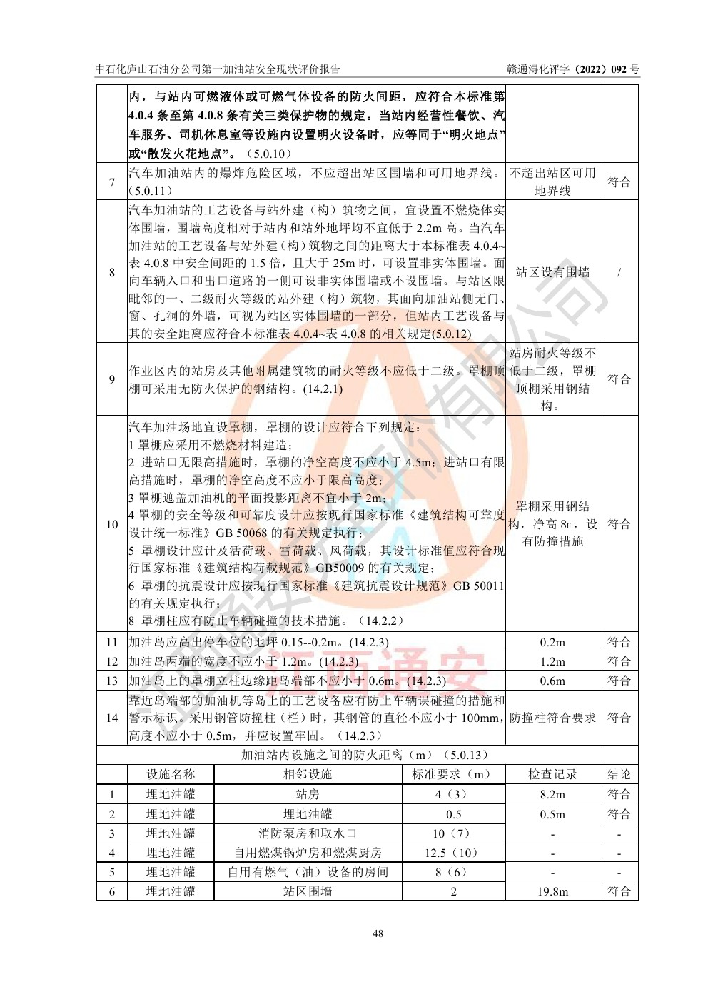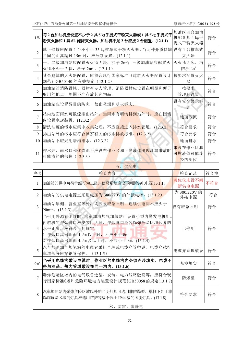 該企業(yè)屬三級加油站,主要從事成品油零售經(jīng)營,經(jīng)營的油品有0#柴油、92#汽油、95#汽油。 該項(xiàng)目為一功能集中的加油站,且設(shè)備設(shè)施集中在站區(qū)內(nèi),根據(jù)空間相對獨(dú)立、事故范圍相對固定、具有明顯特征界限的原則,評價(jià)小組確定將其劃分為一個評價(jià)單元。選擇安全檢查表法和危險(xiǎn)指數(shù)方法進(jìn)行評價(jià)。 1、加油站涉及的汽油、柴油屬于易燃液體,汽油屬于重點(diǎn)監(jiān)管的危險(xiǎn)化學(xué)品;不構(gòu)成《危險(xiǎn)化學(xué)品重大危險(xiǎn)源辨識》規(guī)定危險(xiǎn)化學(xué)品重大危險(xiǎn)源。 2、經(jīng)營過程中存在的主要危險(xiǎn)有:火災(zāi)、爆炸等。 3、中國石化銷售股份有限公司江西九江廬山石油分公司**加油站涉及的安全條件、安全經(jīng)營條件、安全生產(chǎn)管理符合《危險(xiǎn)化學(xué)品經(jīng)營許可證管理辦法》、《汽車加油加氣加氫站技術(shù)標(biāo)準(zhǔn)》等**有關(guān)法規(guī)、標(biāo)準(zhǔn)、規(guī)范要求,能滿足危險(xiǎn)化學(xué)品經(jīng)營安全條件。 |