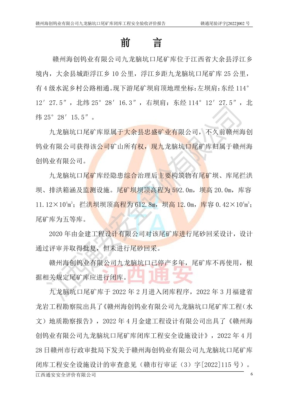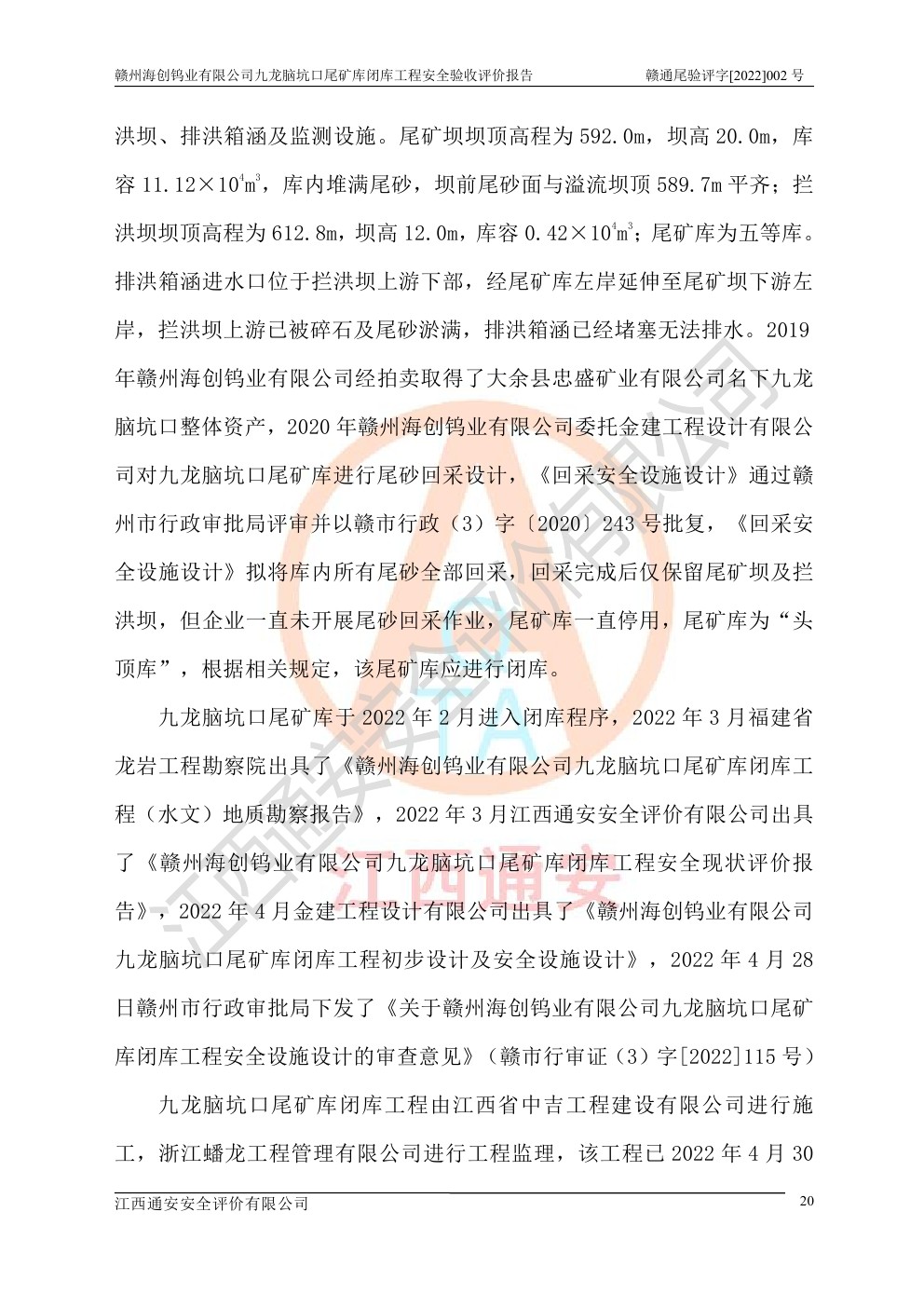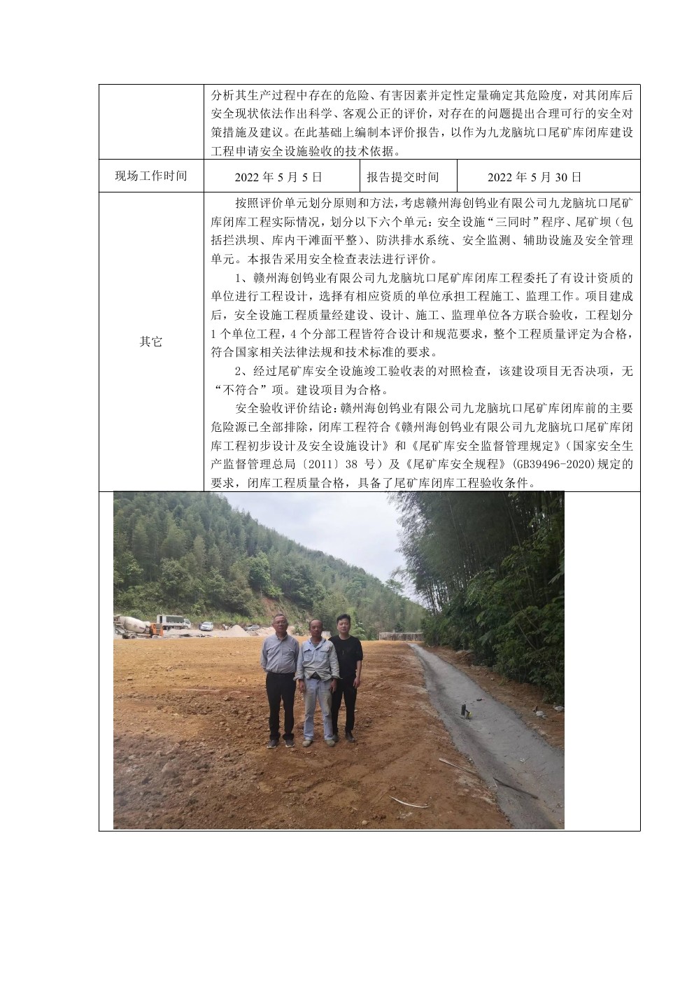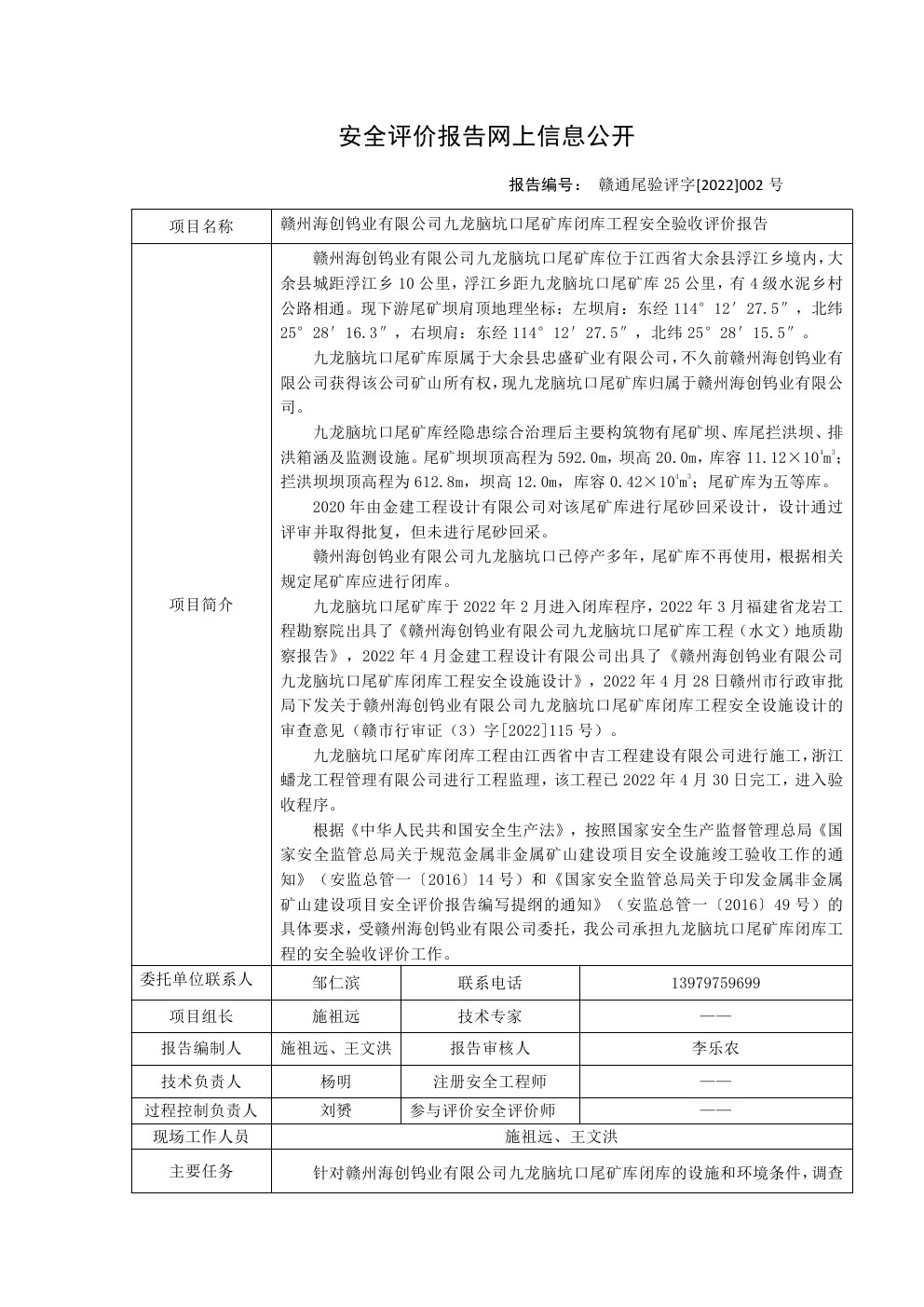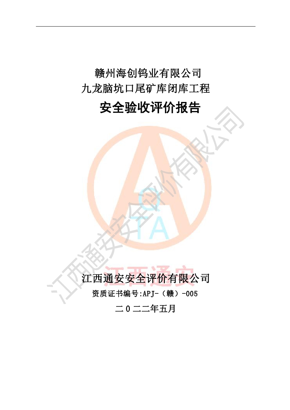 贛州海創(chuàng)鎢業(yè)有限公司九龍腦坑口尾礦庫閉庫工程安全驗(yàn)收評(píng)價(jià)報(bào)告