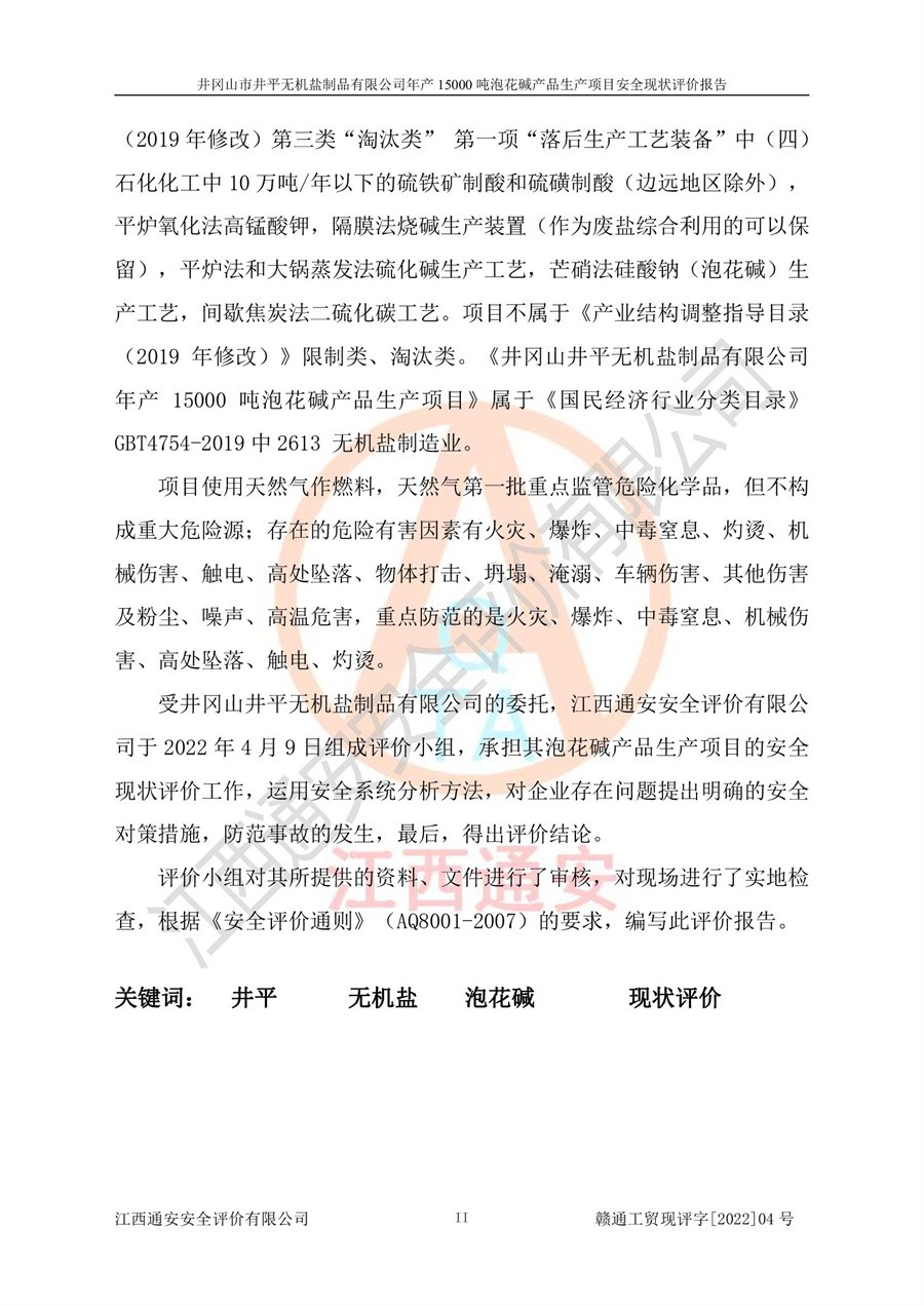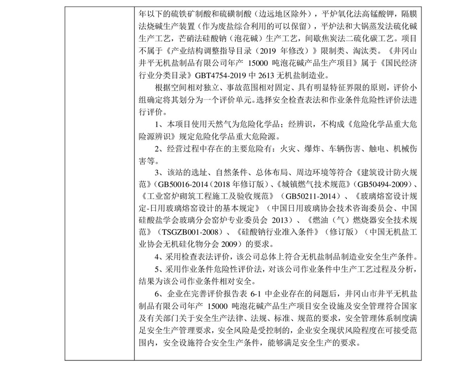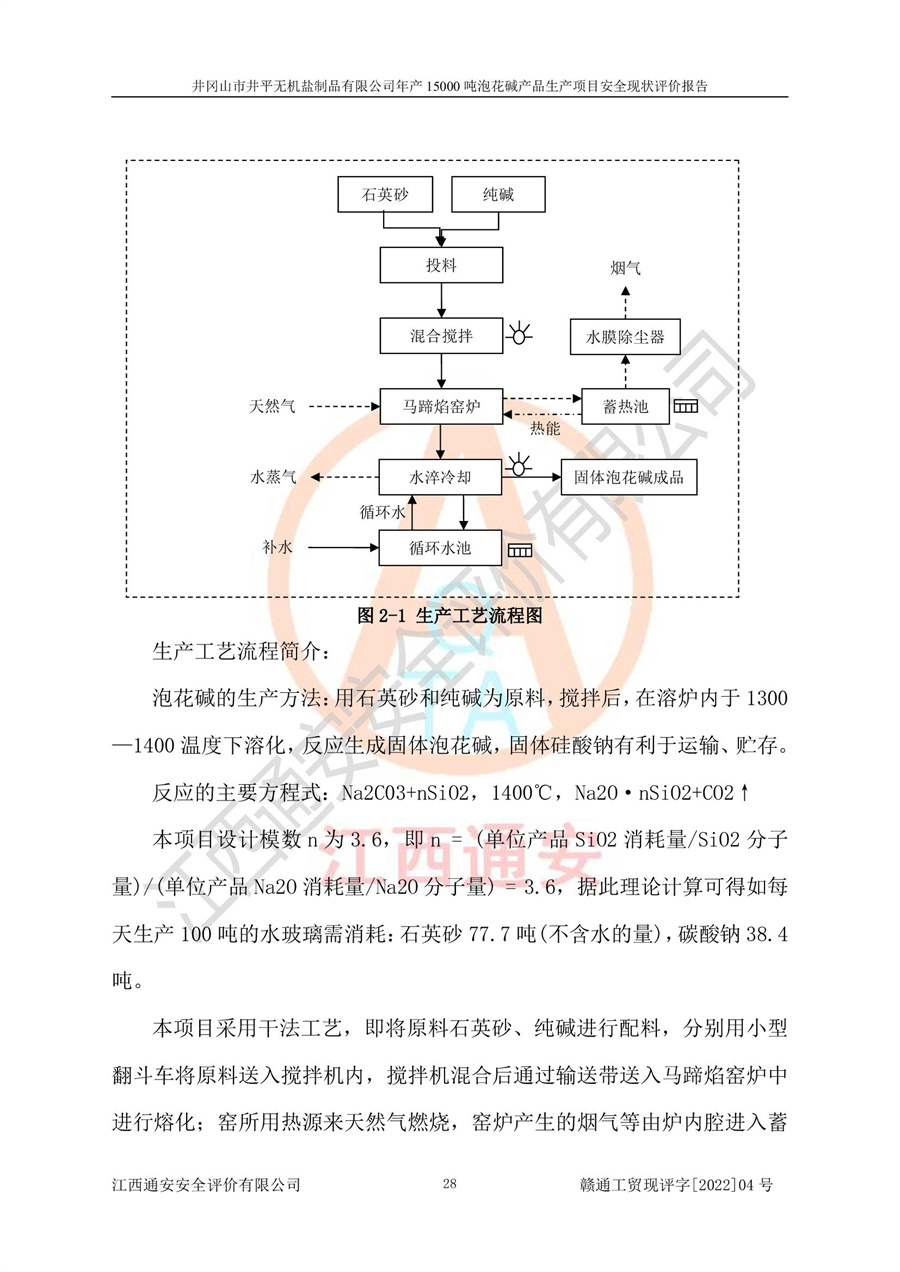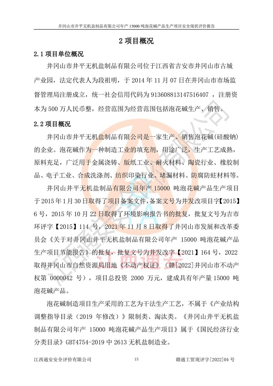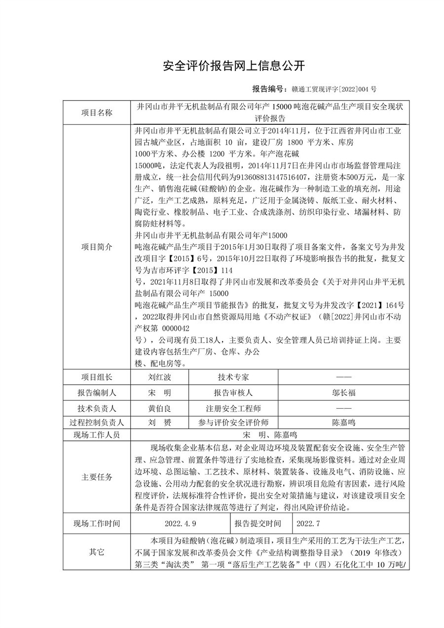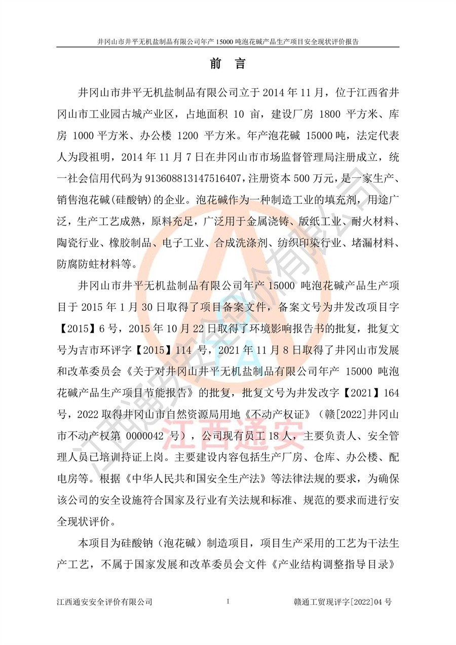 井岡山市井平無機鹽制品有限公司年產(chǎn)15000噸泡花堿產(chǎn)品生產(chǎn)項目安全現(xiàn)狀評價報告