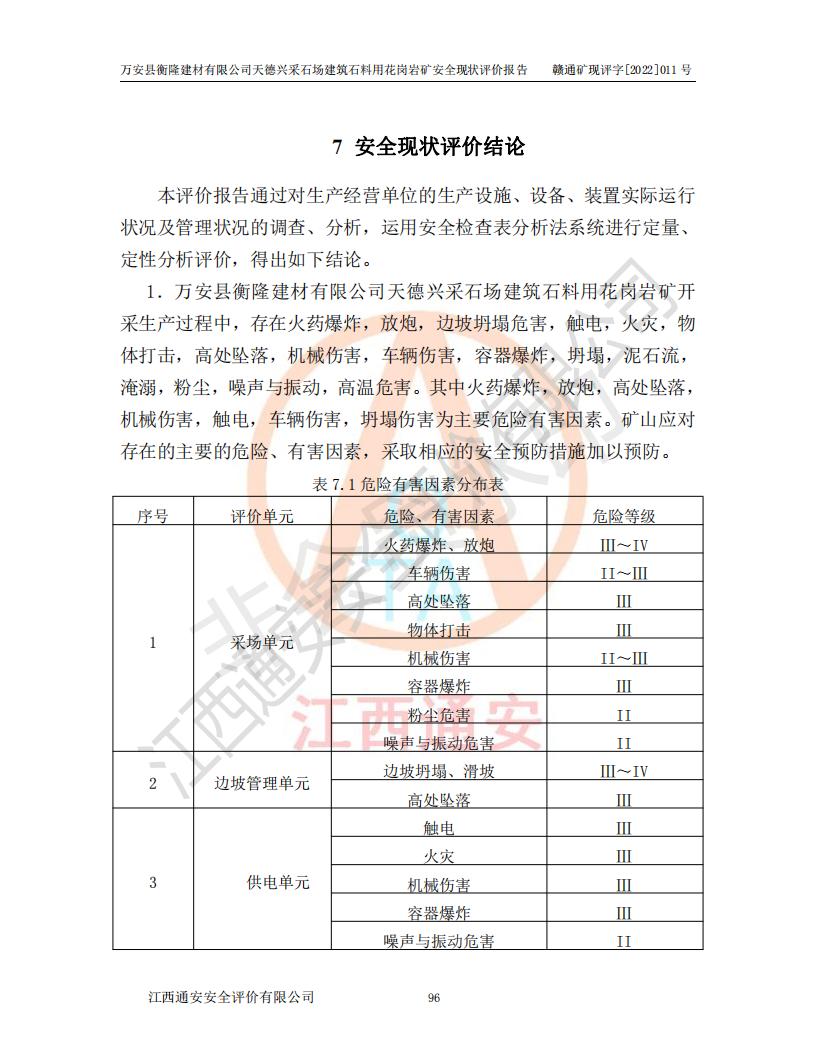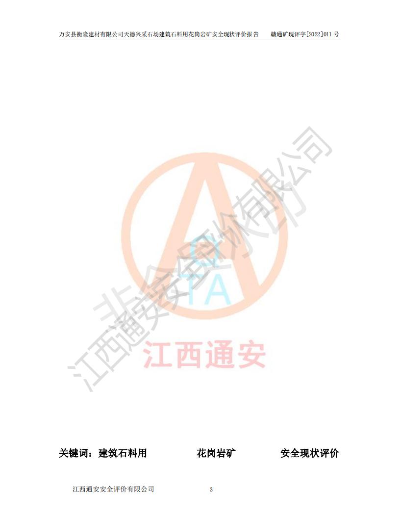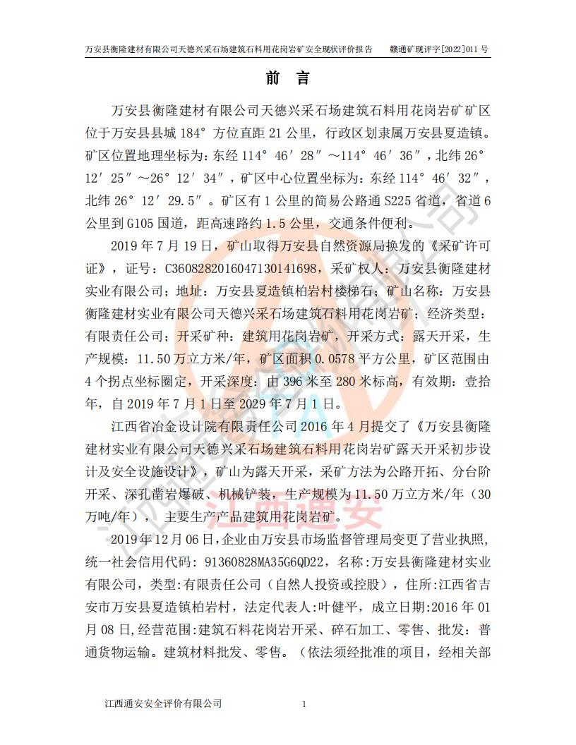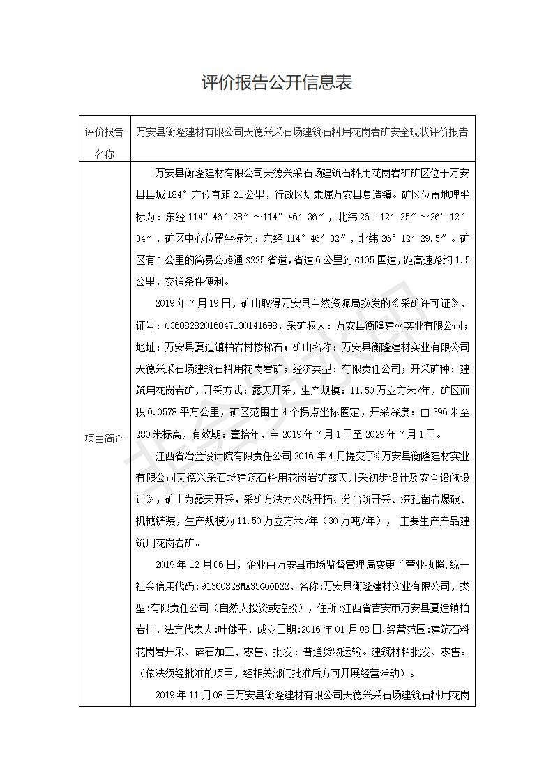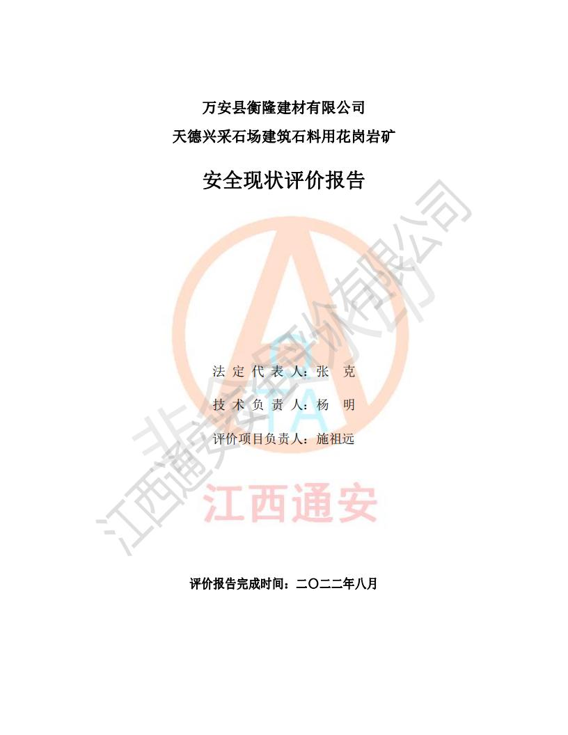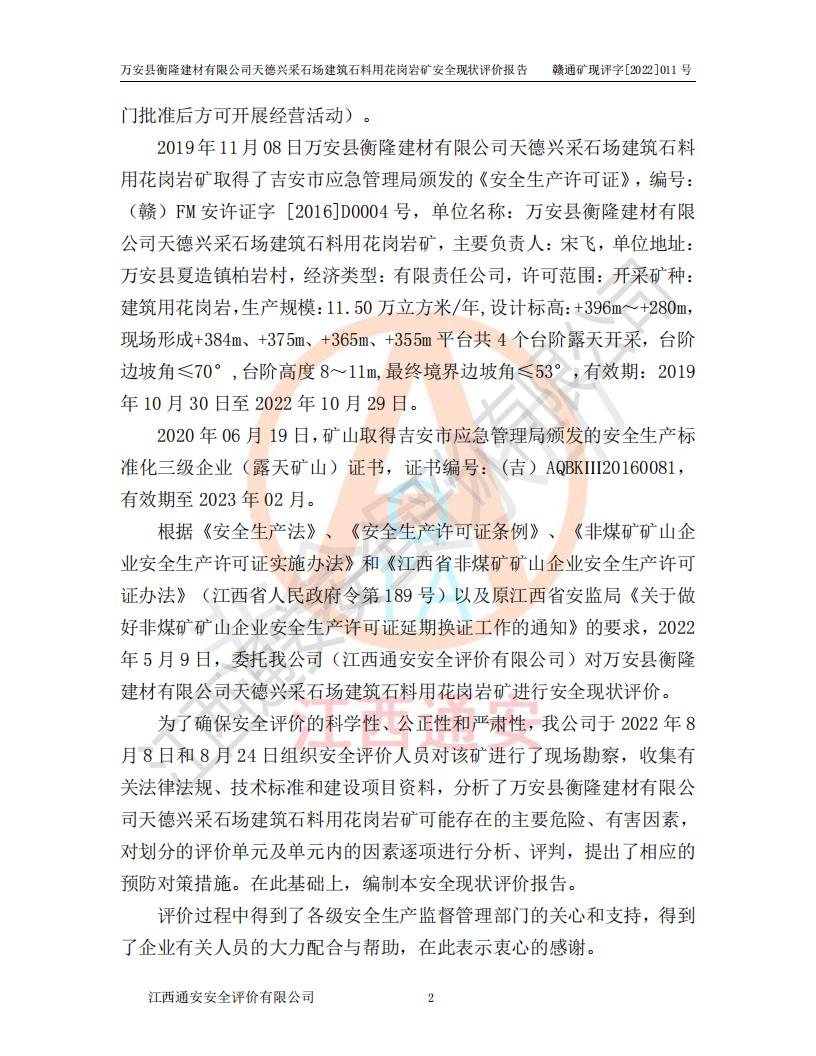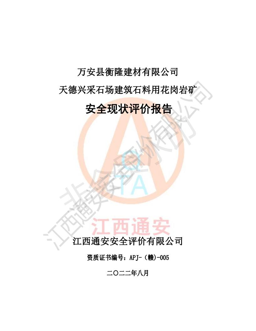 萬安縣衡隆建材有限公司天德興采石場建筑石料用花崗巖礦安全現(xiàn)狀評價報告