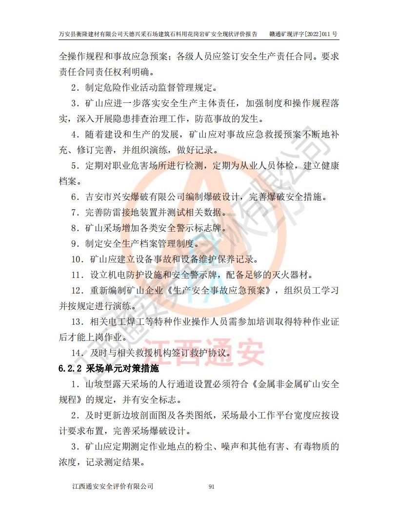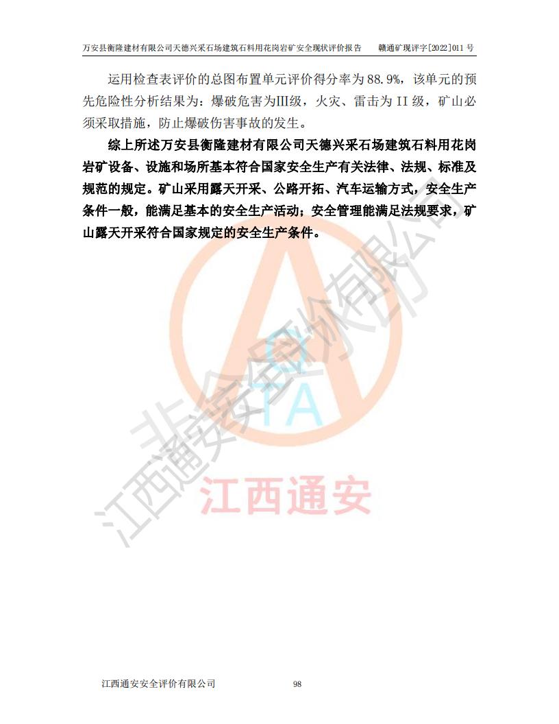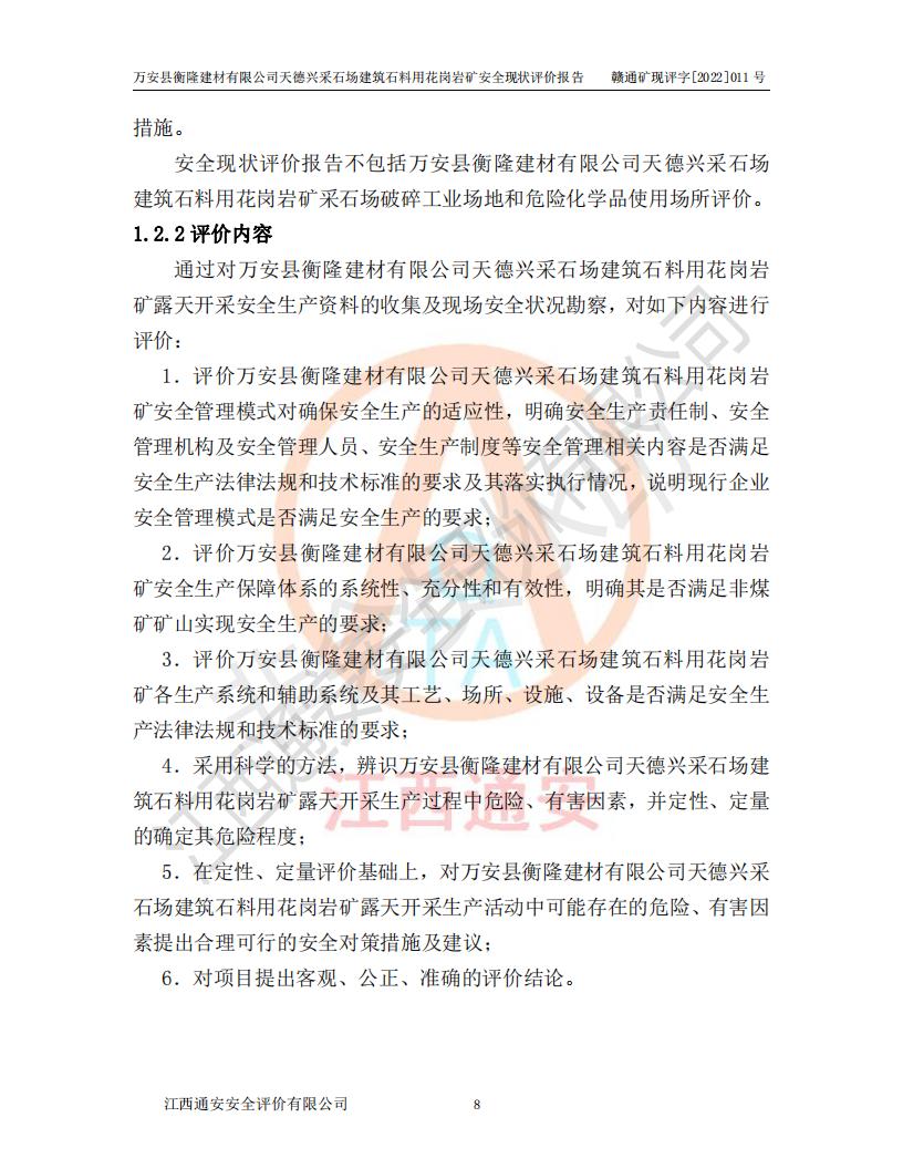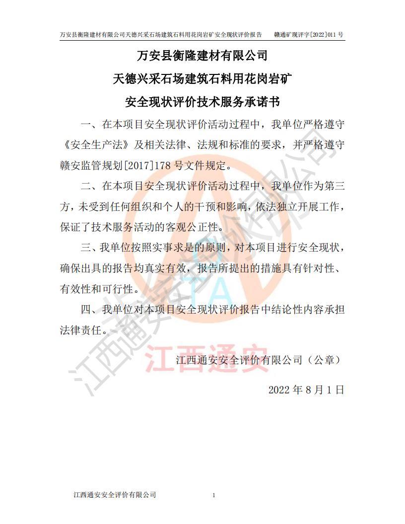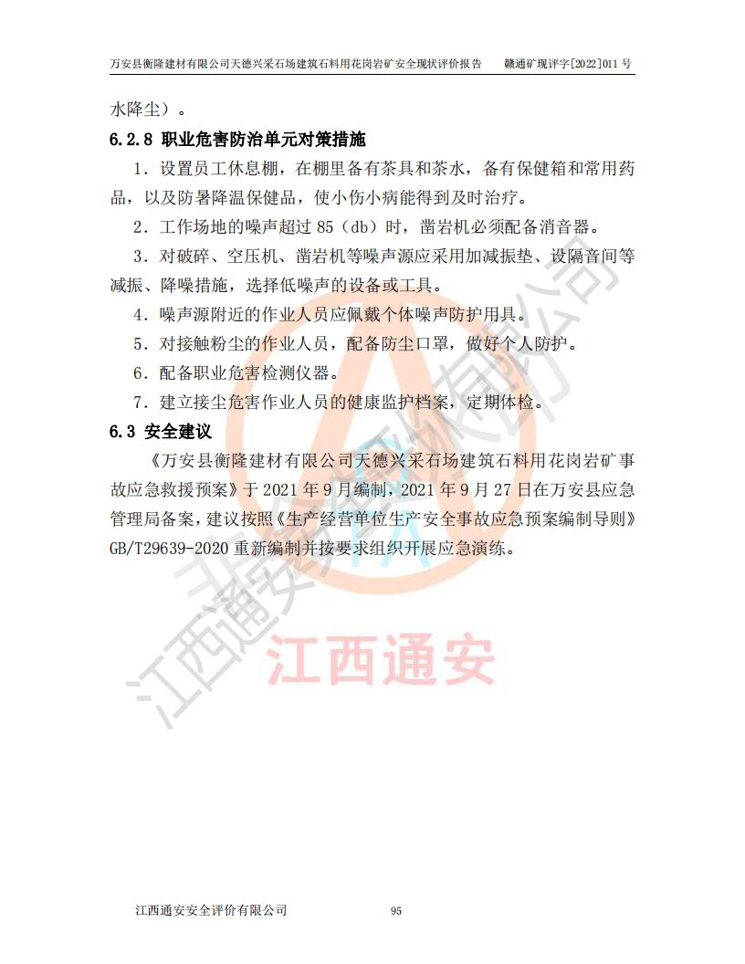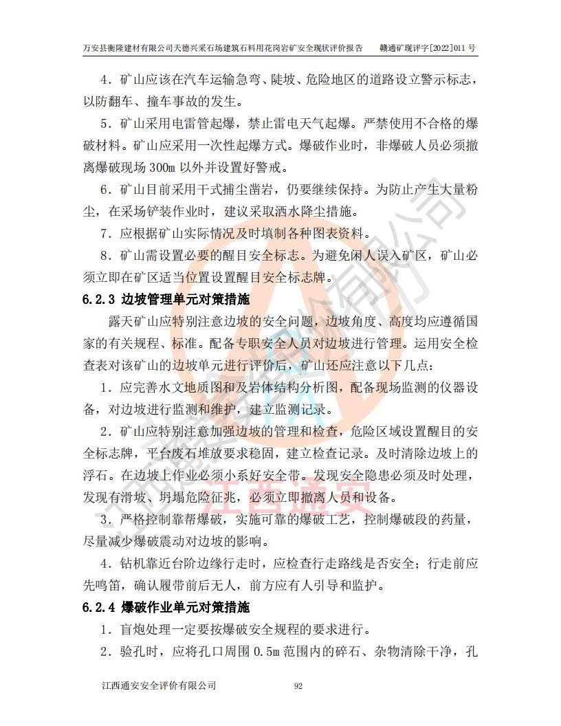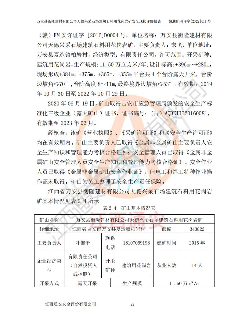 萬安縣衡隆建材有限公司天德興采石場建筑石料用花崗巖礦安全現(xiàn)狀評價報告
