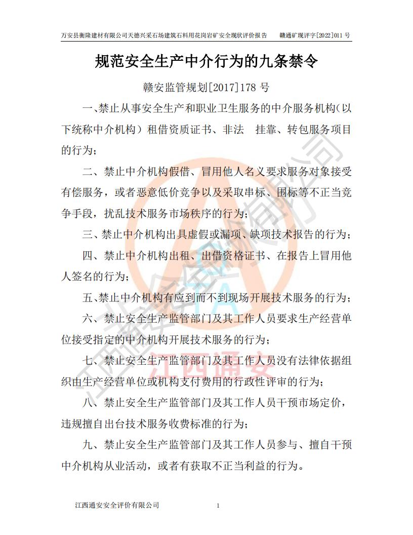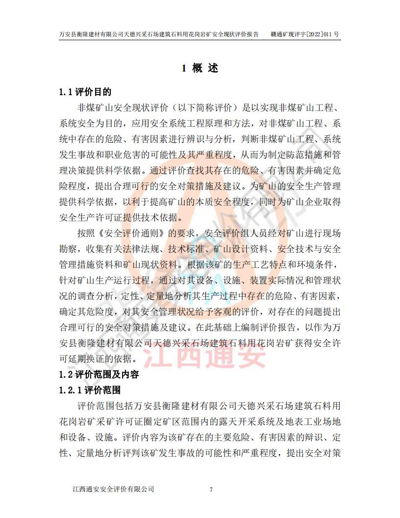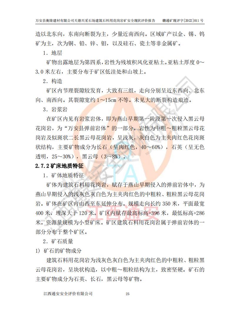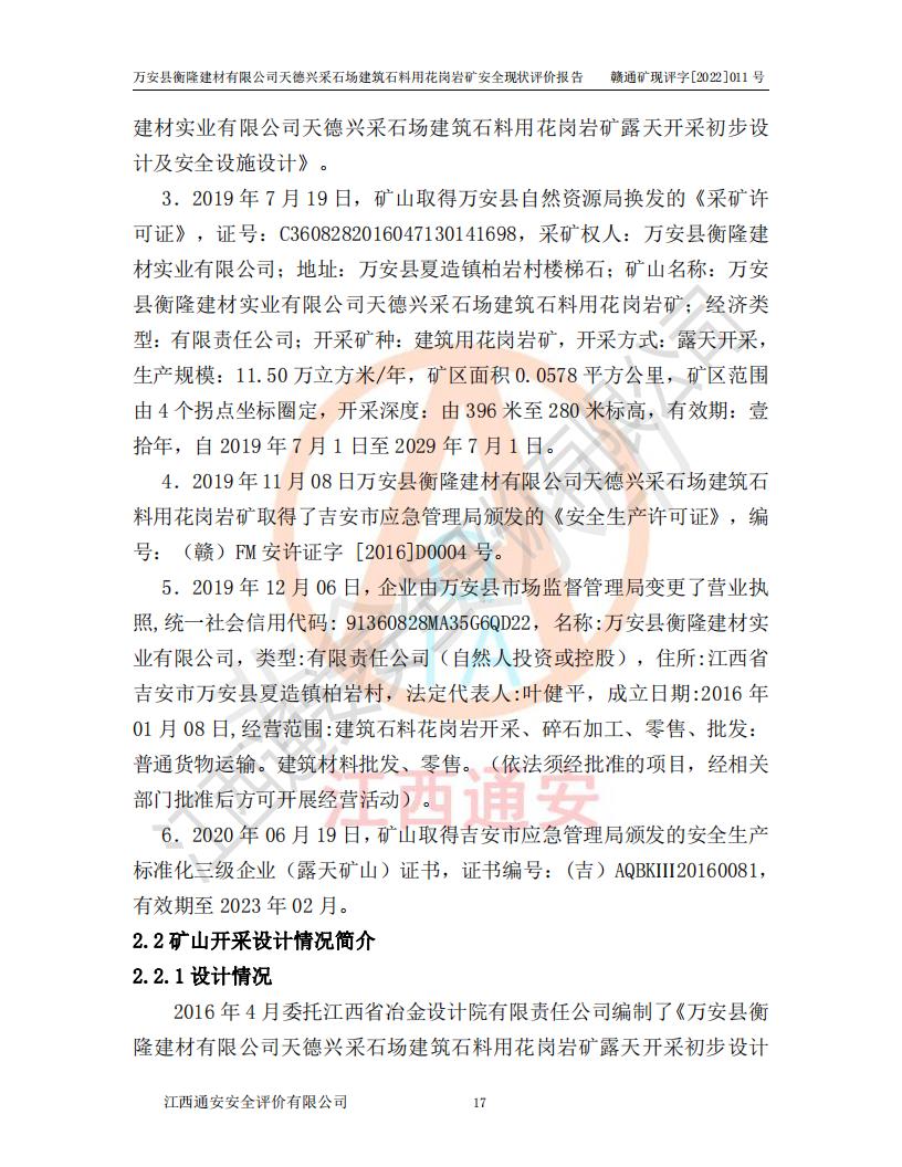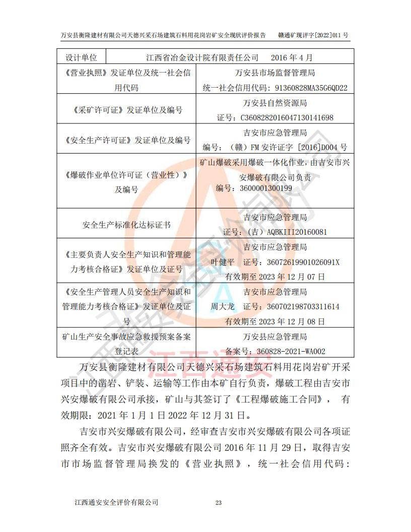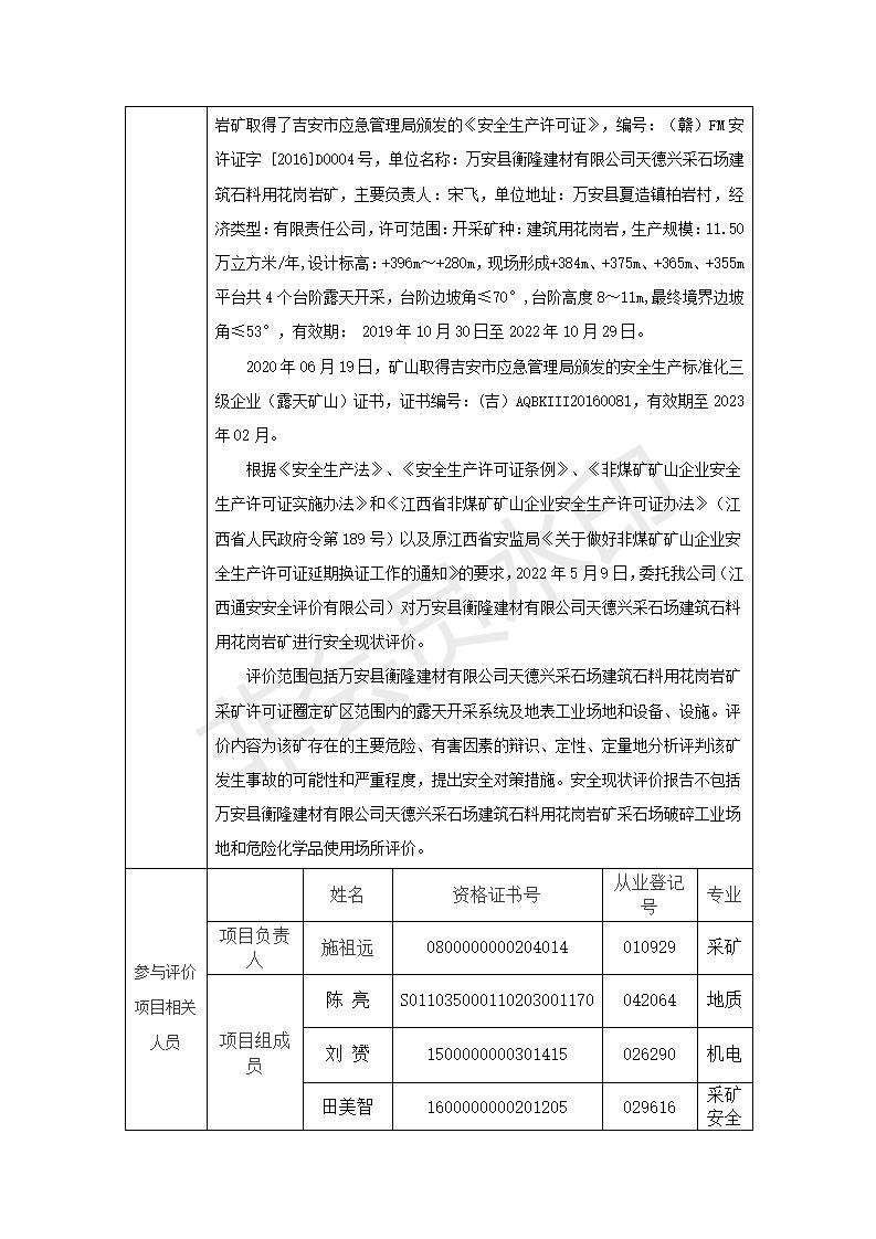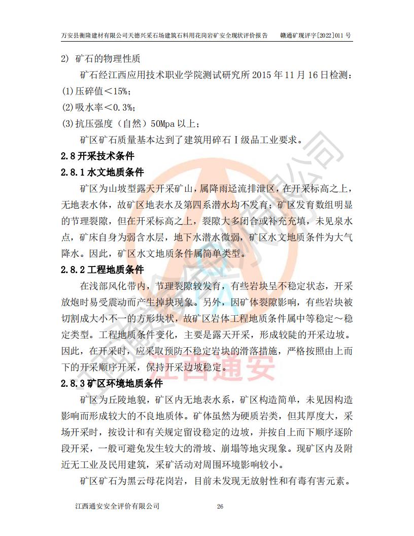 萬安縣衡隆建材有限公司天德興采石場建筑石料用花崗巖礦安全現(xiàn)狀評價報告