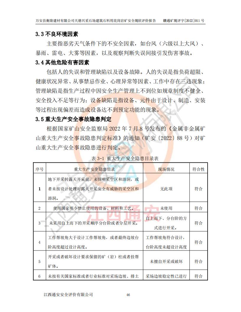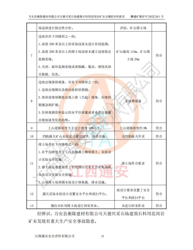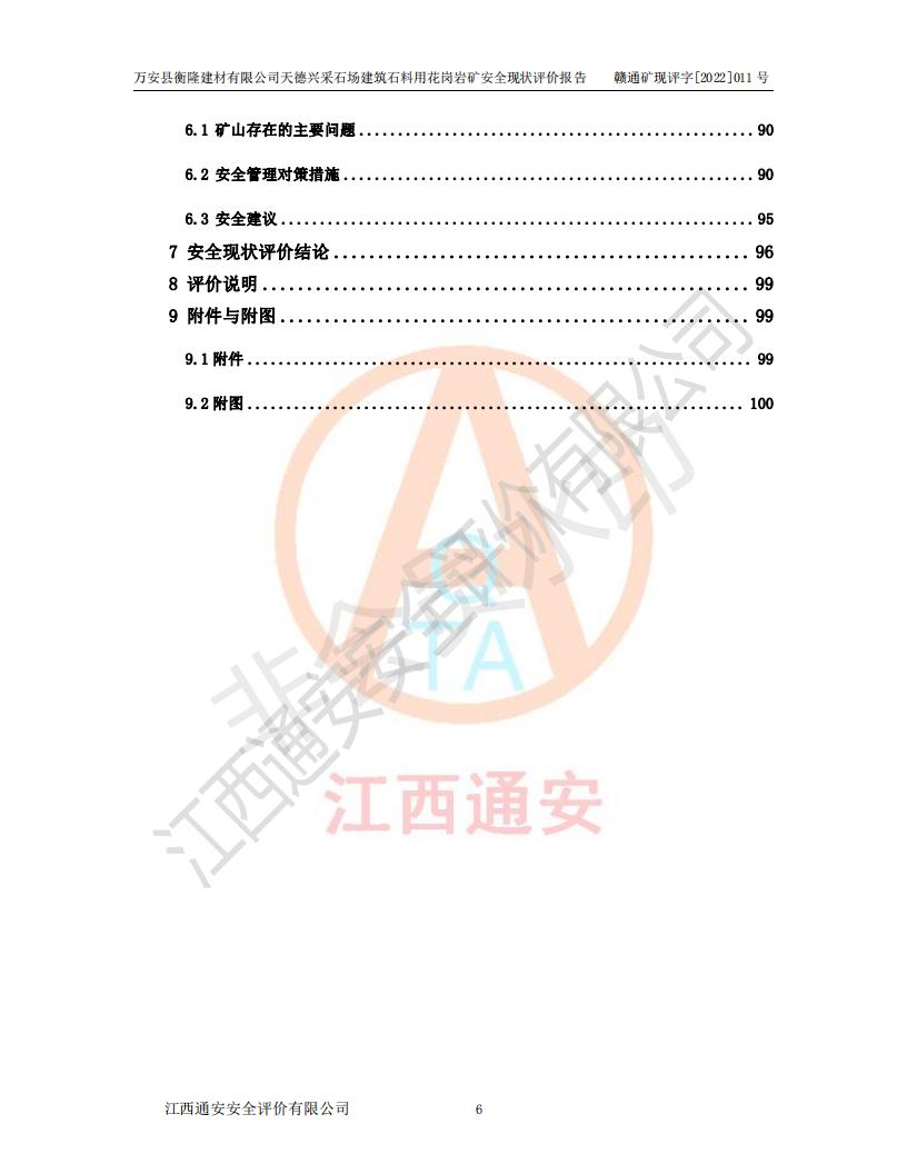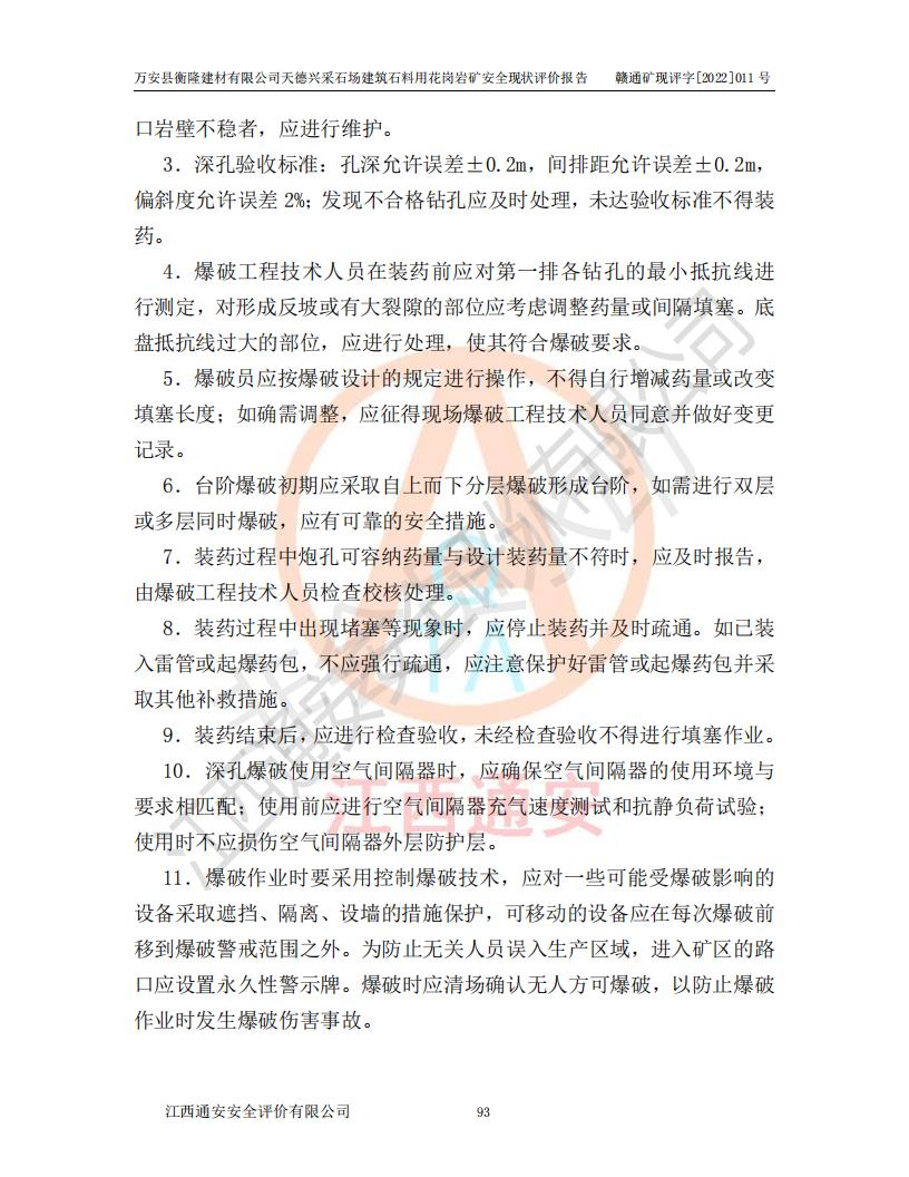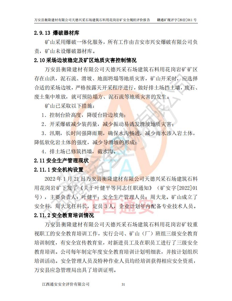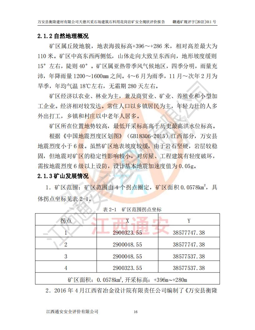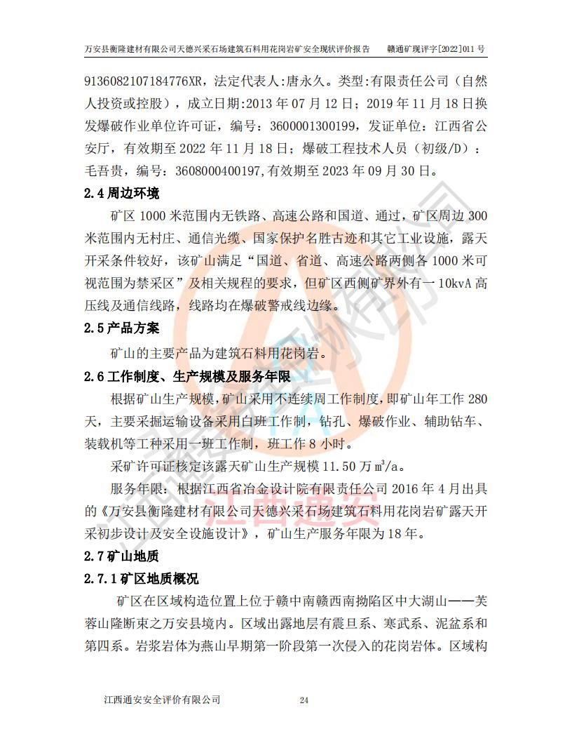 萬安縣衡隆建材有限公司天德興采石場建筑石料用花崗巖礦安全現(xiàn)狀評價報告