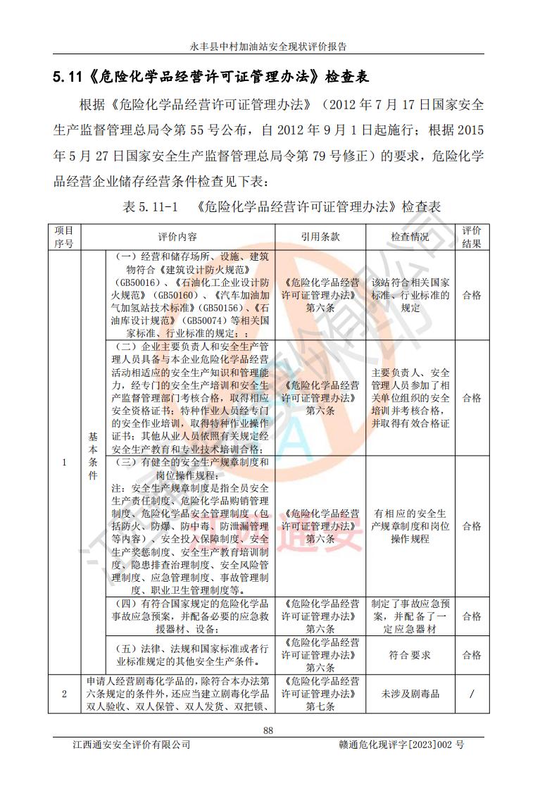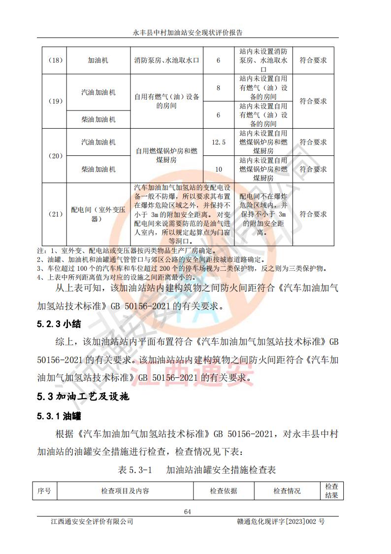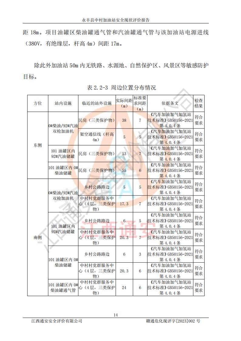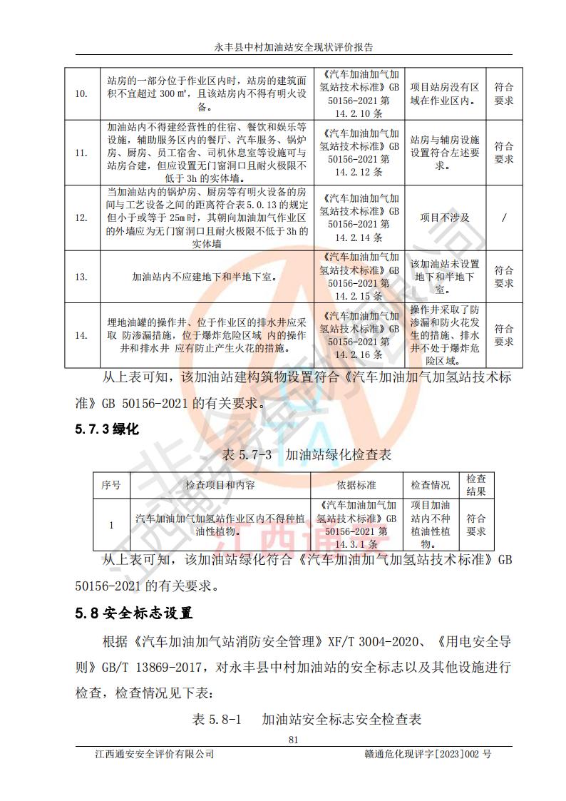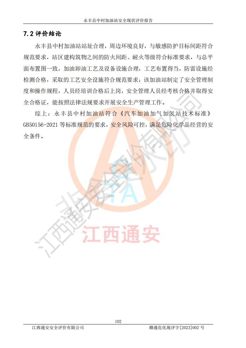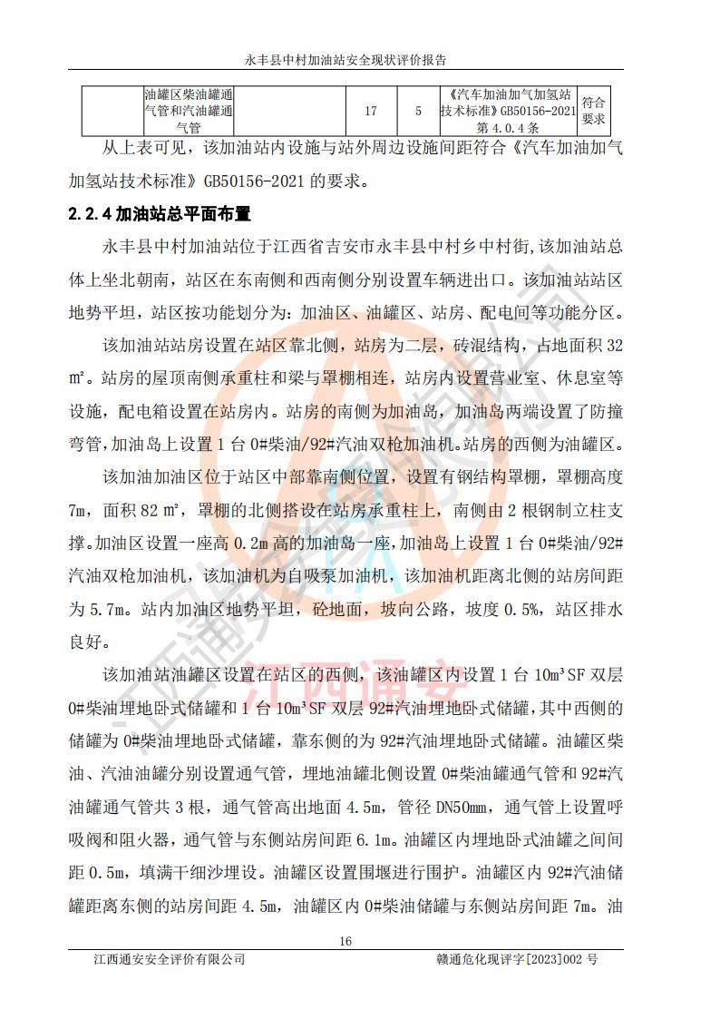 綜上:永豐縣中村加油站符合《汽車加油加氣加氫站技術(shù)標(biāo)準(zhǔn)》GB50156-2021等標(biāo)準(zhǔn)規(guī)范的要求,安全風(fēng)險(xiǎn)可控,滿足危險(xiǎn)化學(xué)品經(jīng)營(yíng)的安全條件。