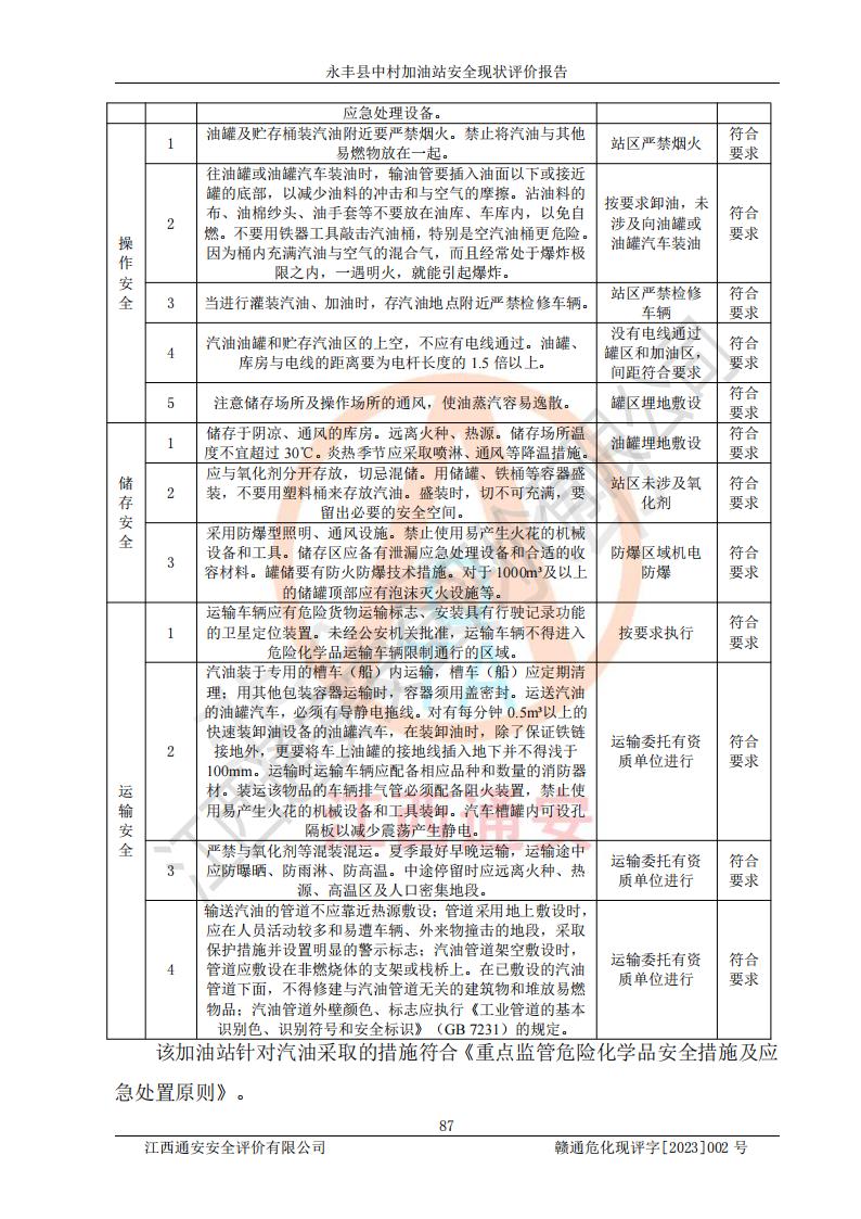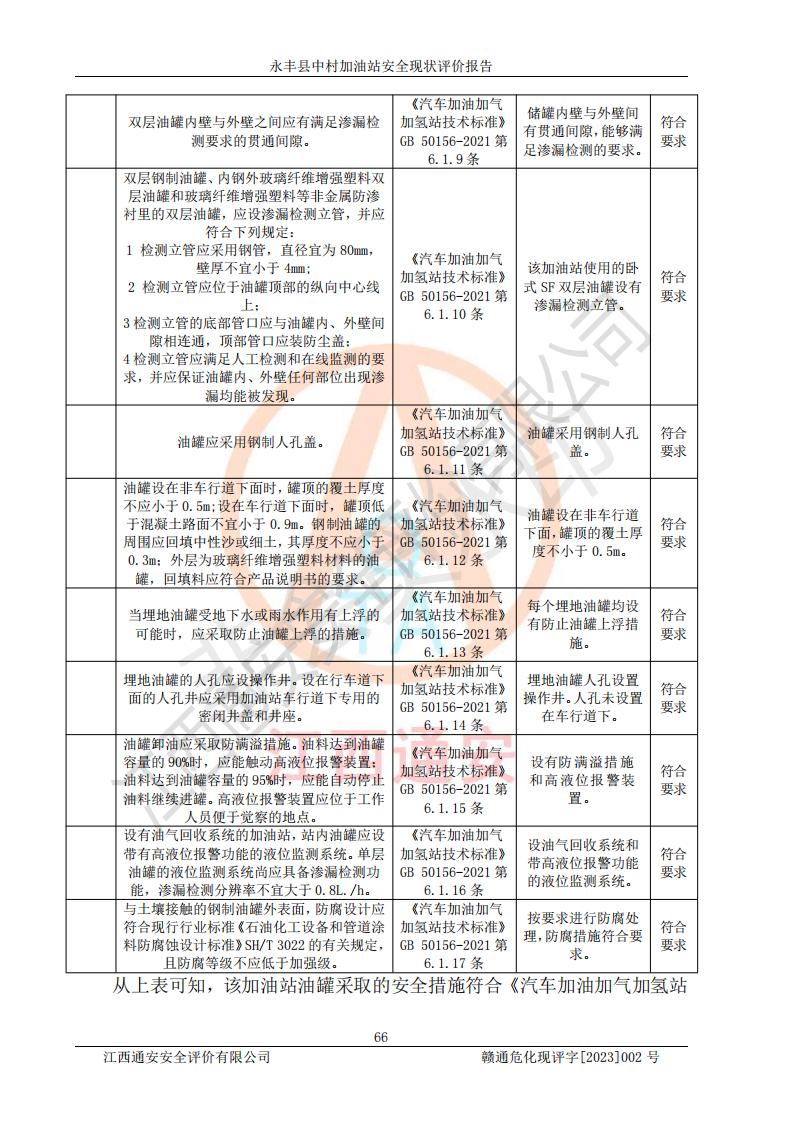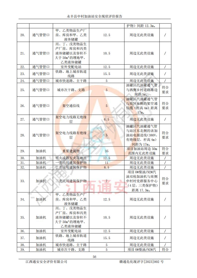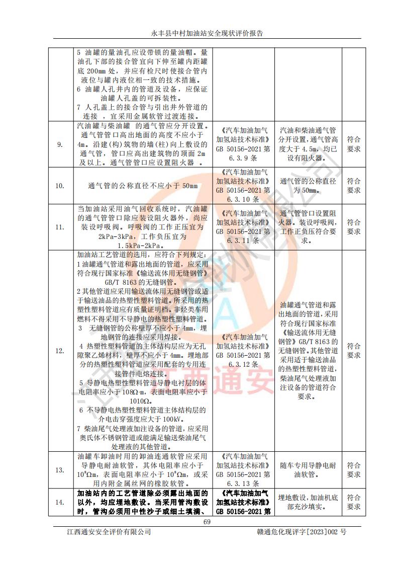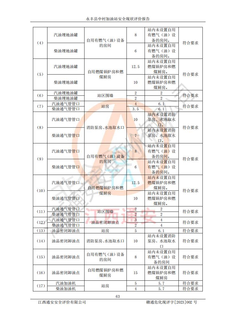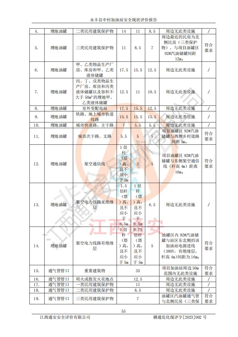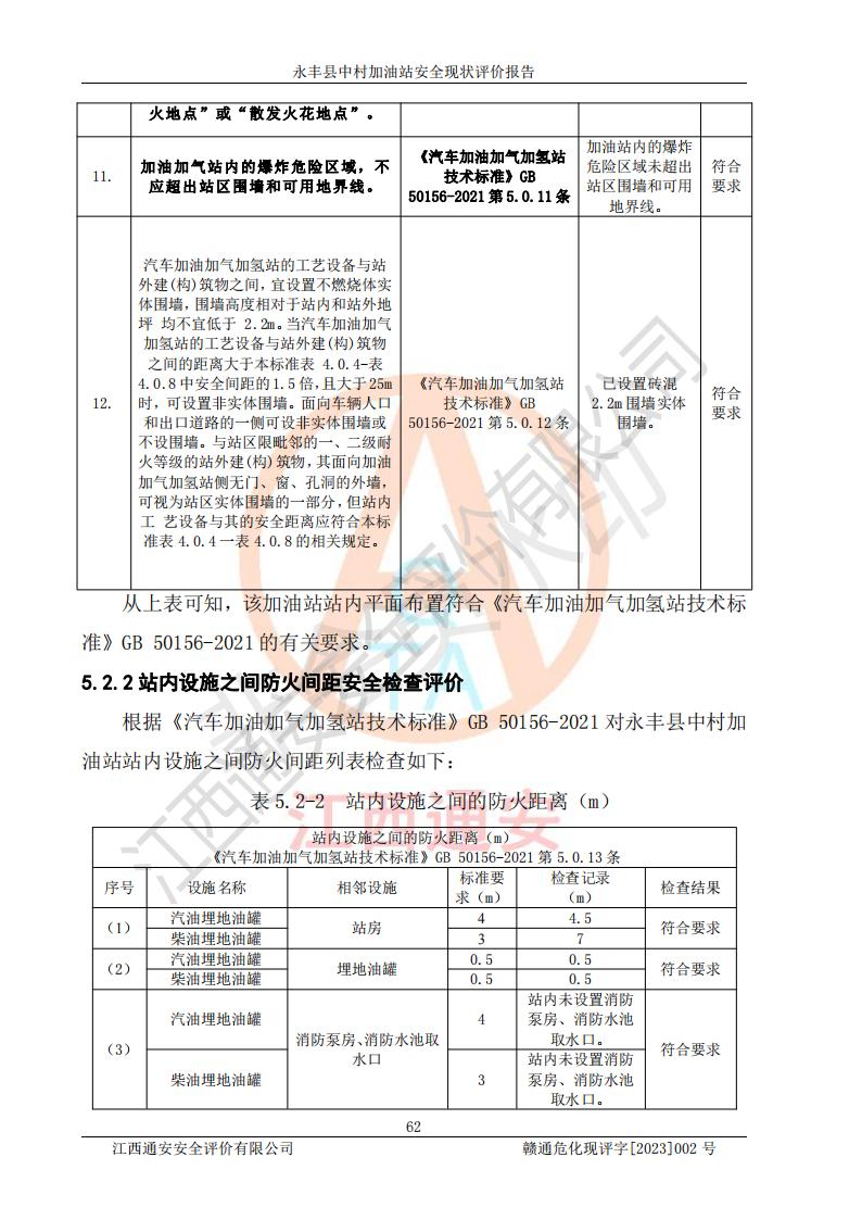 綜上:永豐縣中村加油站符合《汽車加油加氣加氫站技術(shù)標(biāo)準(zhǔn)》GB50156-2021等標(biāo)準(zhǔn)規(guī)范的要求,安全風(fēng)險(xiǎn)可控,滿足危險(xiǎn)化學(xué)品經(jīng)營(yíng)的安全條件。