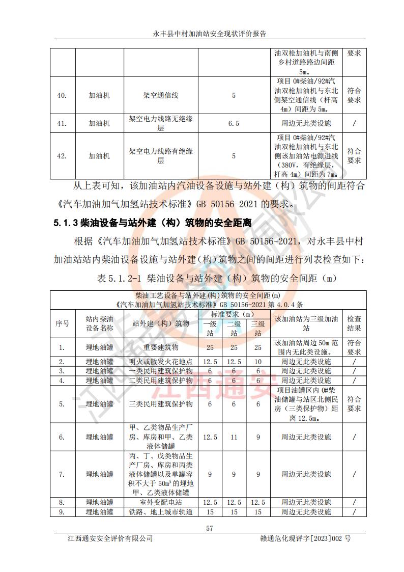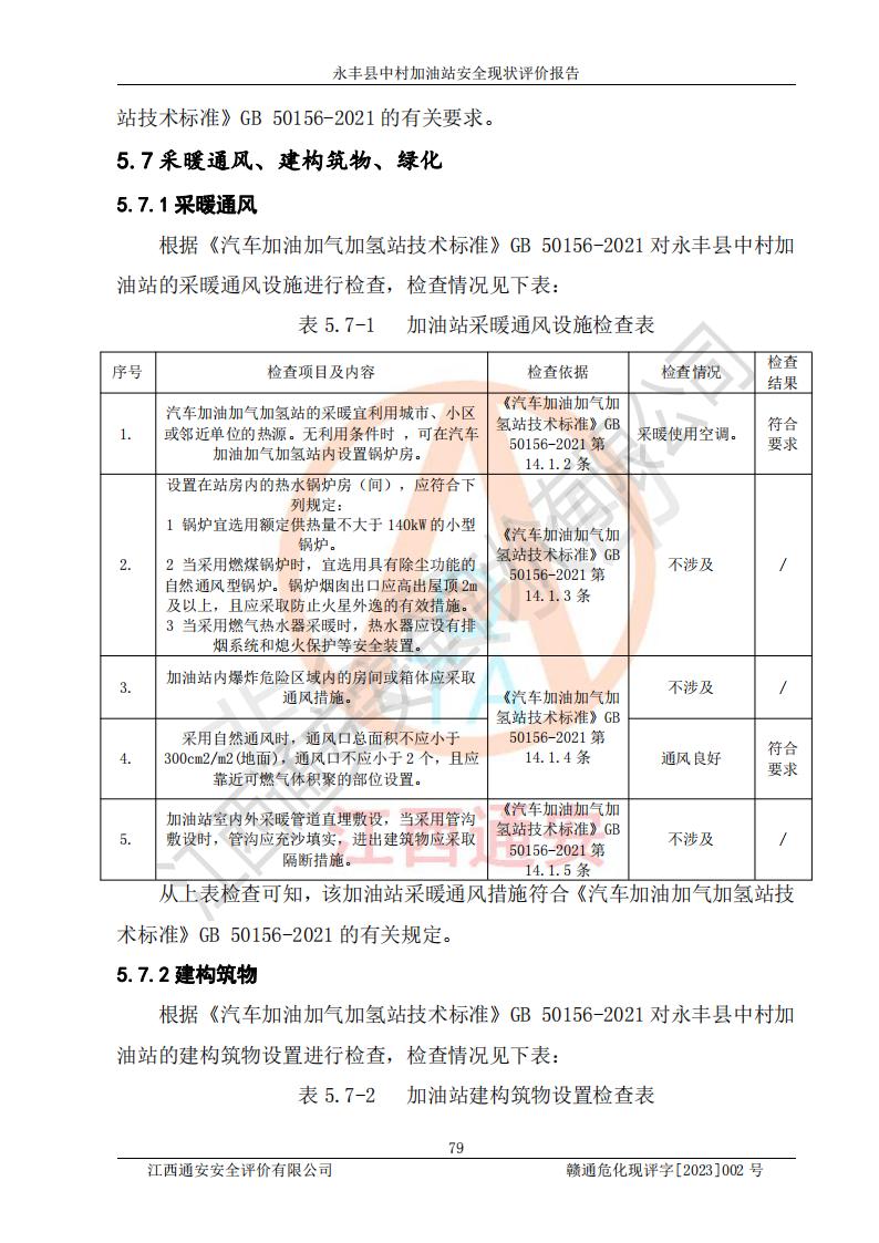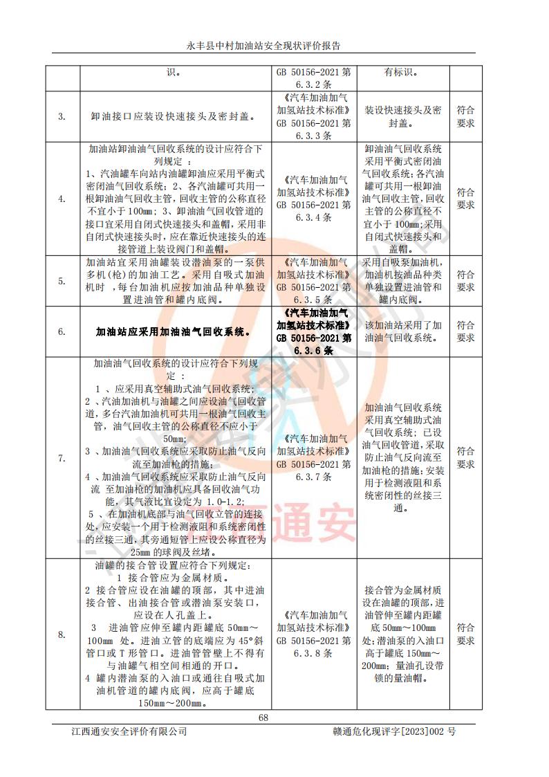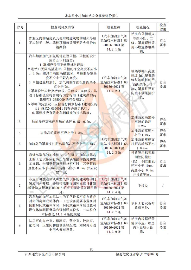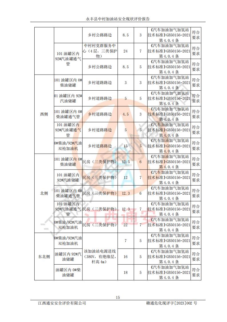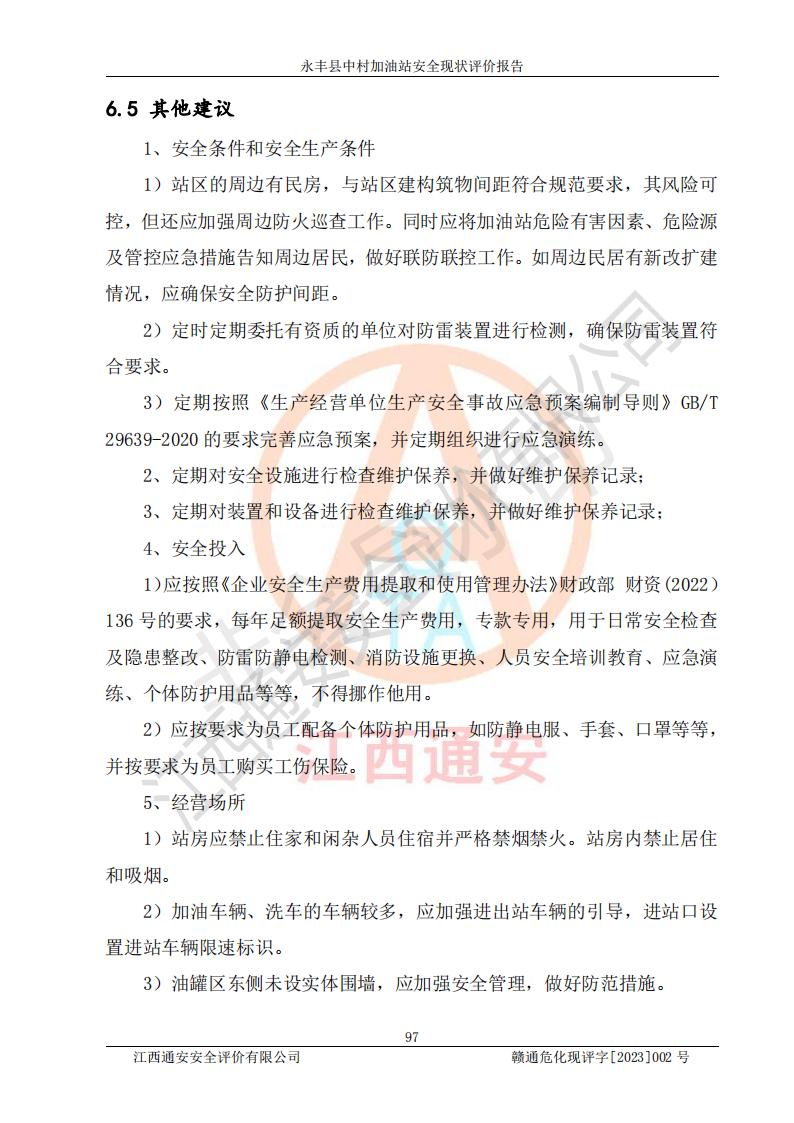 綜上:永豐縣中村加油站符合《汽車加油加氣加氫站技術(shù)標(biāo)準(zhǔn)》GB50156-2021等標(biāo)準(zhǔn)規(guī)范的要求,安全風(fēng)險(xiǎn)可控,滿足危險(xiǎn)化學(xué)品經(jīng)營(yíng)的安全條件。