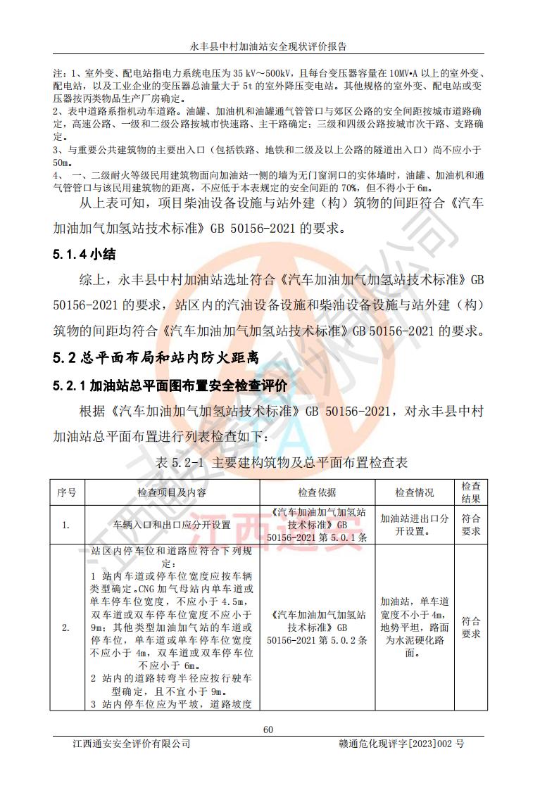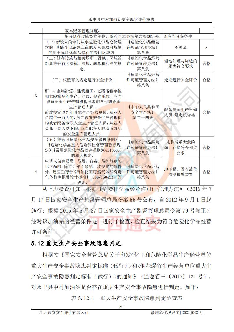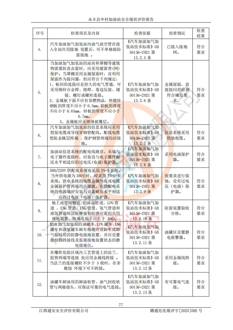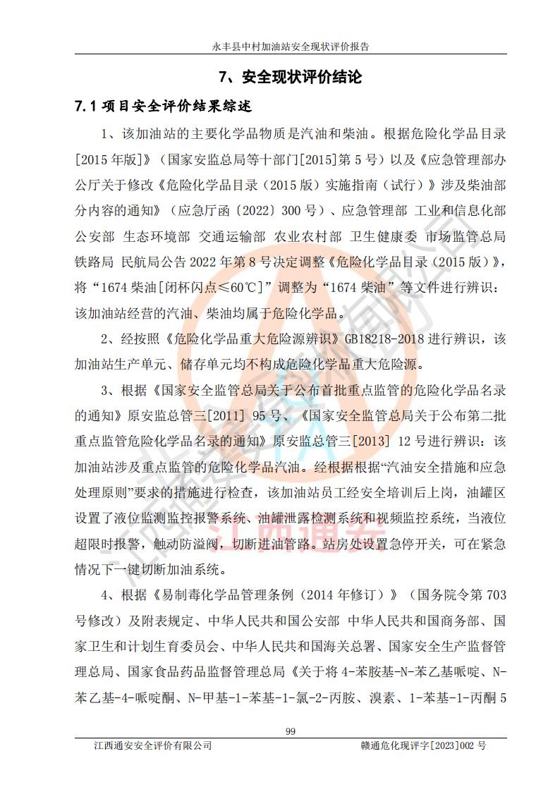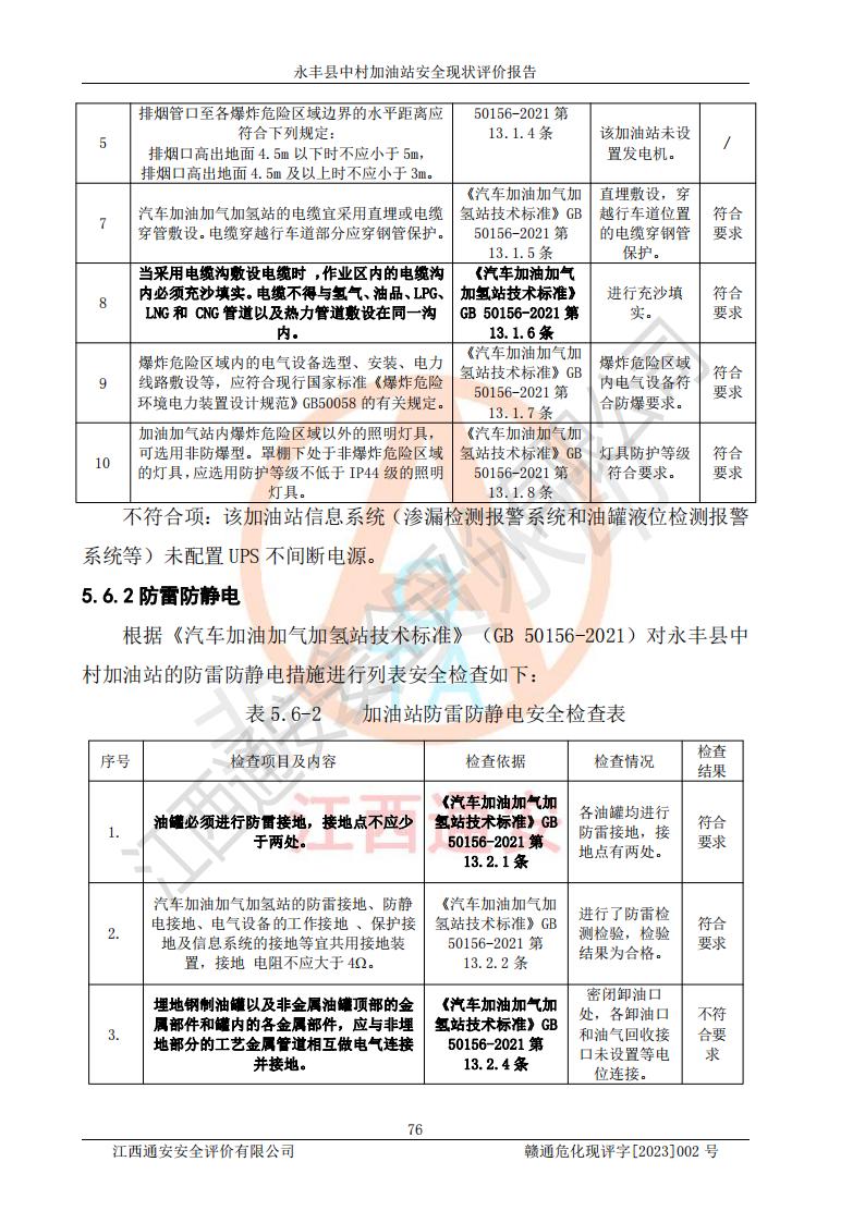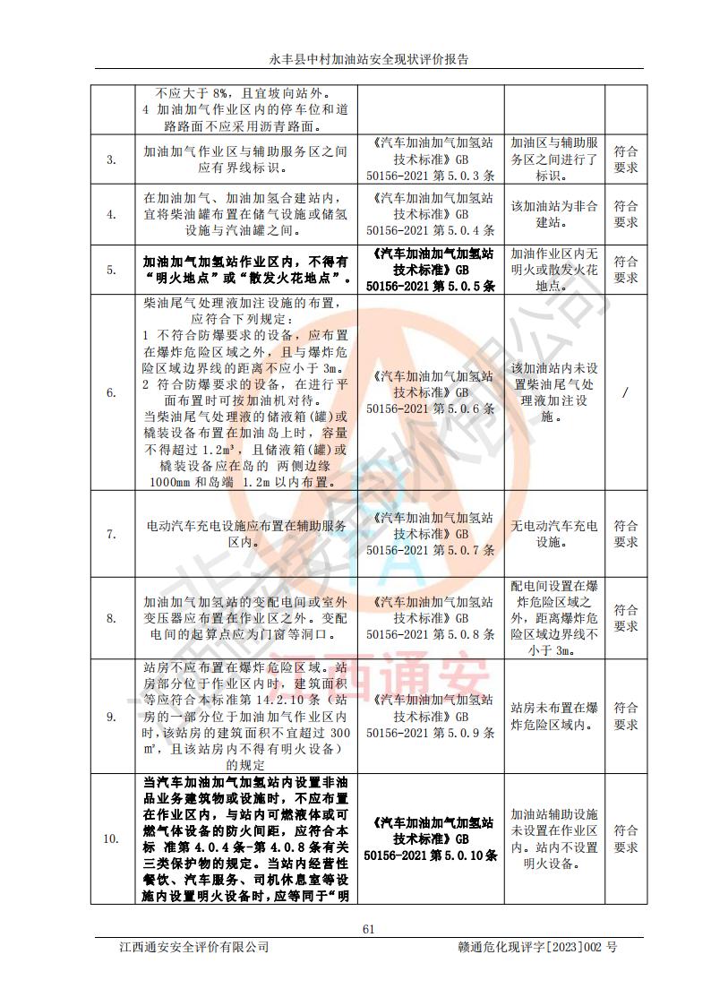 綜上:永豐縣中村加油站符合《汽車加油加氣加氫站技術(shù)標(biāo)準(zhǔn)》GB50156-2021等標(biāo)準(zhǔn)規(guī)范的要求,安全風(fēng)險(xiǎn)可控,滿足危險(xiǎn)化學(xué)品經(jīng)營(yíng)的安全條件。