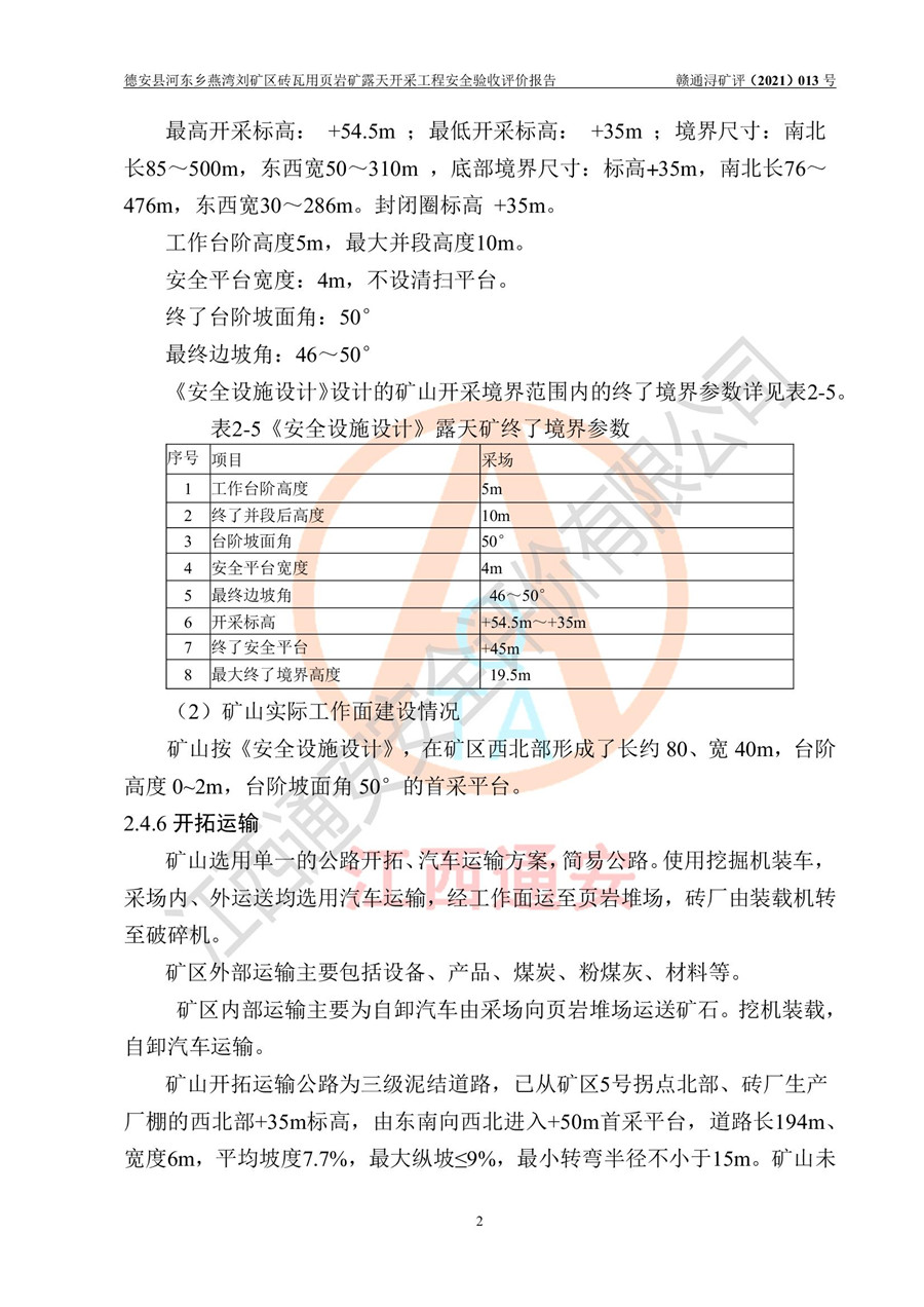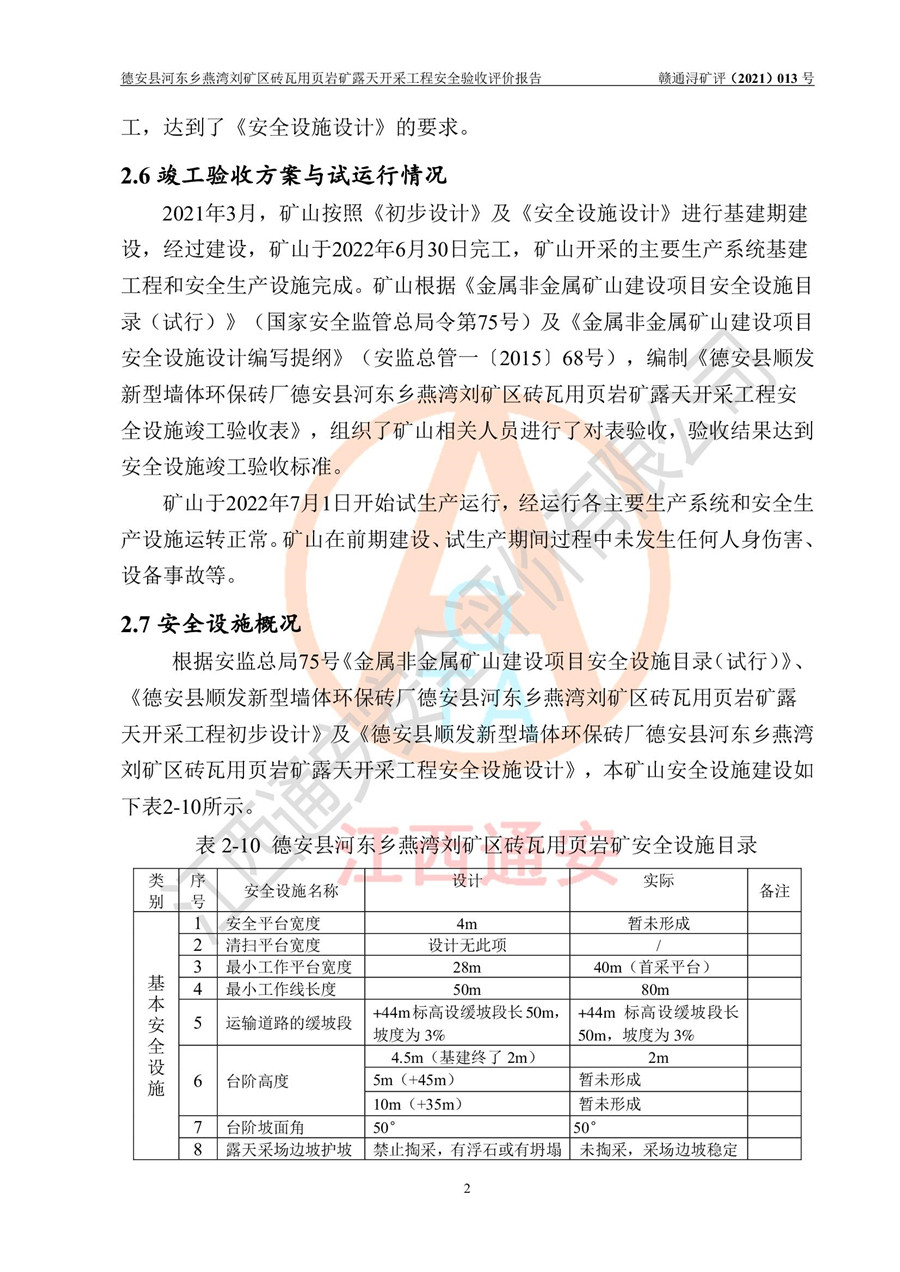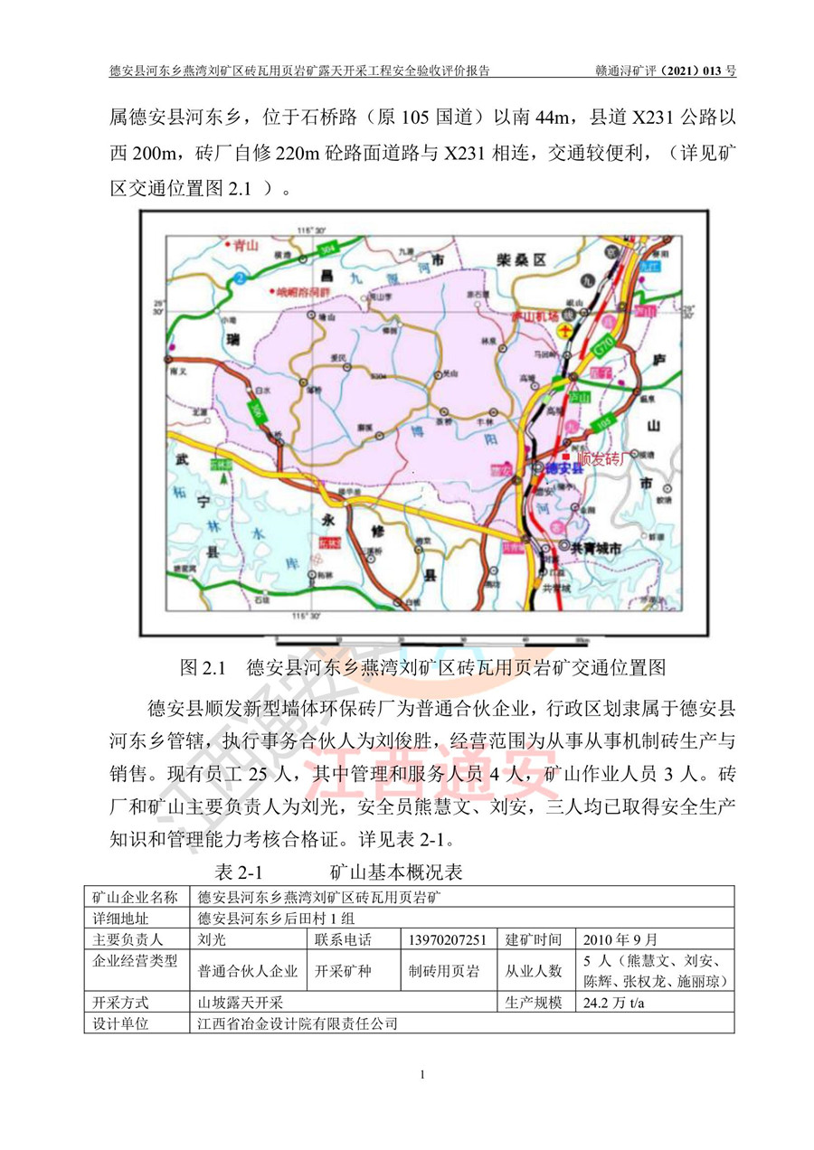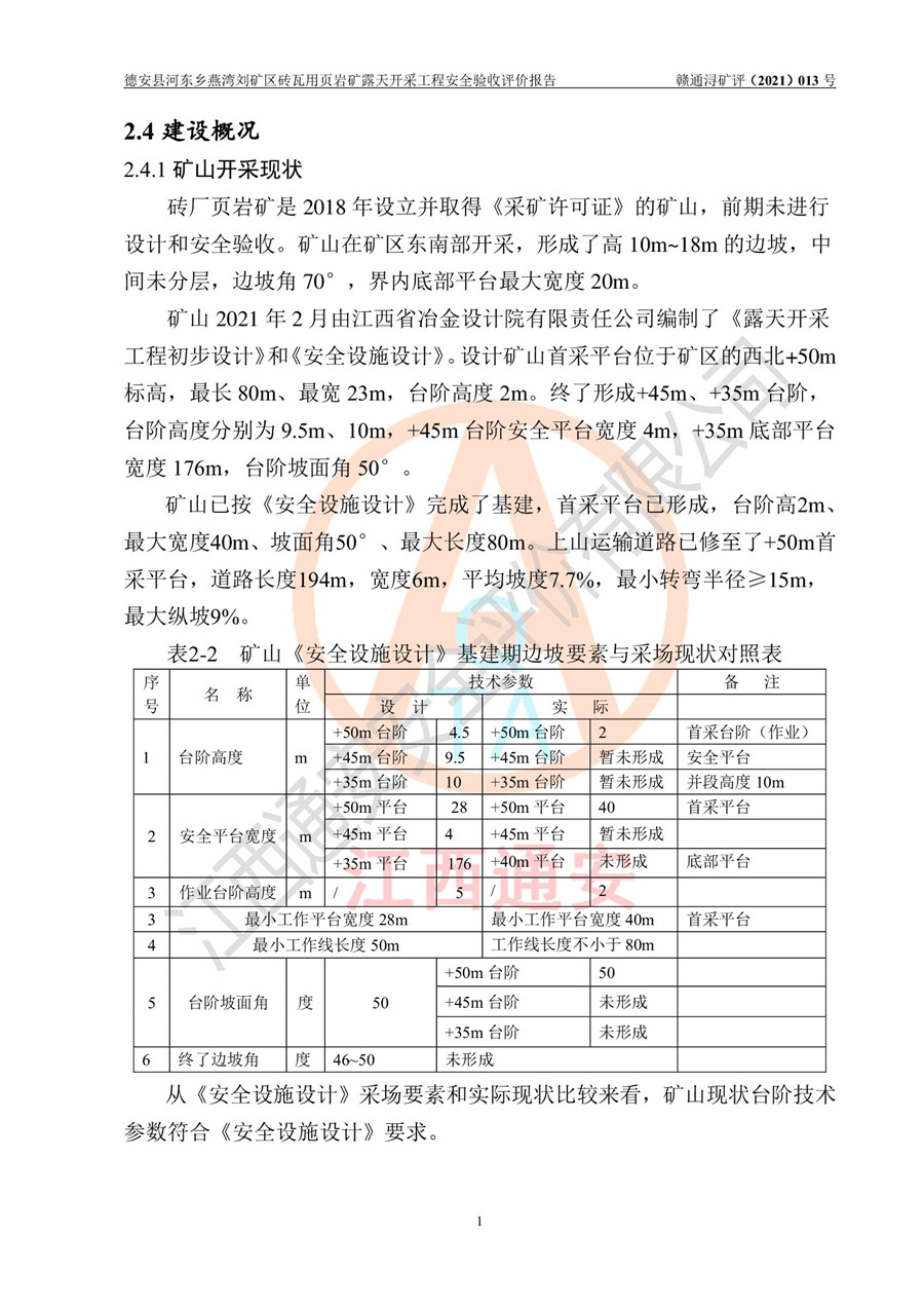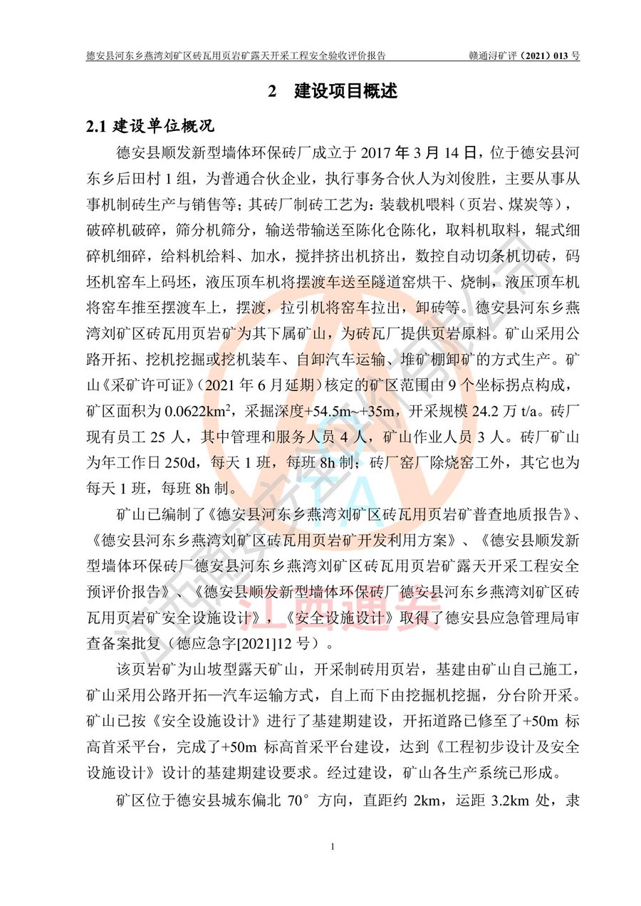 德安縣順發(fā)新型墻體**磚廠成立于2017年3月14日,位于德安縣河?xùn)|鄉(xiāng)后田村1組,為普通合伙企業(yè),執(zhí)行事務(wù)合伙人為劉俊勝,主要從事從事機制磚生產(chǎn)與銷售等。其下屬礦山——德安縣河?xùn)|鄉(xiāng)燕灣劉礦區(qū)磚瓦用頁巖礦于2018年9由江西省地質(zhì)礦產(chǎn)勘查開發(fā)局九一六大隊編制了《德安縣河?xùn)|鄉(xiāng)燕灣劉礦區(qū)磚瓦用頁巖礦普查地質(zhì)報告》,2018年10由九江市鑫晟礦業(yè)有限公司編制了《德安縣河?xùn)|鄉(xiāng)燕灣劉礦區(qū)磚瓦用頁巖礦開發(fā)利用方案》,2020年4月,委托昆明陽光安全科技工程有限公司編制了《德安縣順發(fā)新型墻體**磚廠德安縣河?xùn)|鄉(xiāng)燕灣劉礦區(qū)磚瓦用頁巖礦露天開采工程安全預(yù)評價報告》,2020年6月取得了《采礦許可證》(2021年6月延期),《采礦許可證》核定的礦區(qū)范圍由9個坐標(biāo)拐點構(gòu)成,礦區(qū)面積為0.0622km2,采掘深度+54.5m~+35m,開采規(guī)模24.2萬t/a。礦山2021年2月由江西省冶金設(shè)計院有限責(zé)任公司編制了《德安縣順發(fā)新型墻體**磚廠德安縣河?xùn)|鄉(xiāng)燕灣劉礦區(qū)磚瓦用頁巖礦露天開采工程安全設(shè)施設(shè)計》(以下簡稱《安全設(shè)施設(shè)計》),《安全設(shè)施設(shè)計》于2021年3月3日取得了德安縣應(yīng)急管理局審查備案批復(fù)(德應(yīng)急字[2021]12號)。 該礦山為山坡露天礦山,開采制磚用頁巖,基建由礦山自己施工?!栋踩O(shè)施設(shè)計》設(shè)計礦山采用公路開拓—汽車運輸方式,自上而下由挖掘機挖掘,分臺階分階段開采。礦山已按《安全設(shè)施設(shè)計》進行了基建期建設(shè),開拓道路已修至了+50m標(biāo)高首采平臺,完成了+50m標(biāo)高首采平臺建設(shè),達到了礦山《初步設(shè)計》及《安全設(shè)施設(shè)計》設(shè)計基建期建設(shè)要求 |