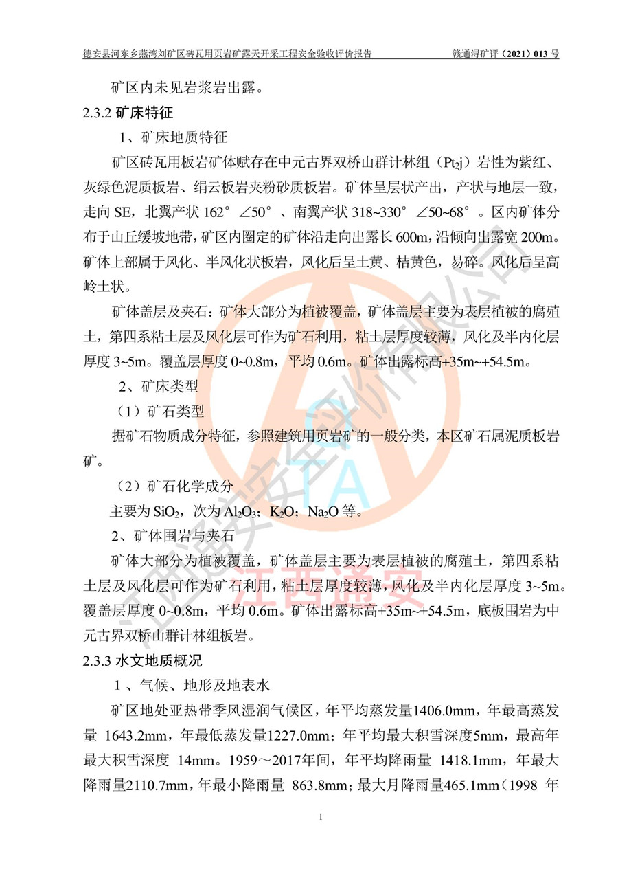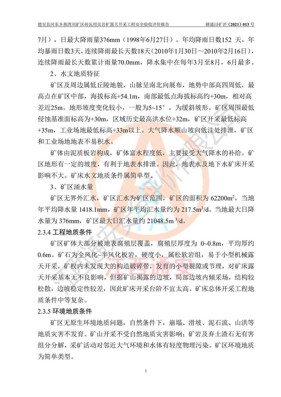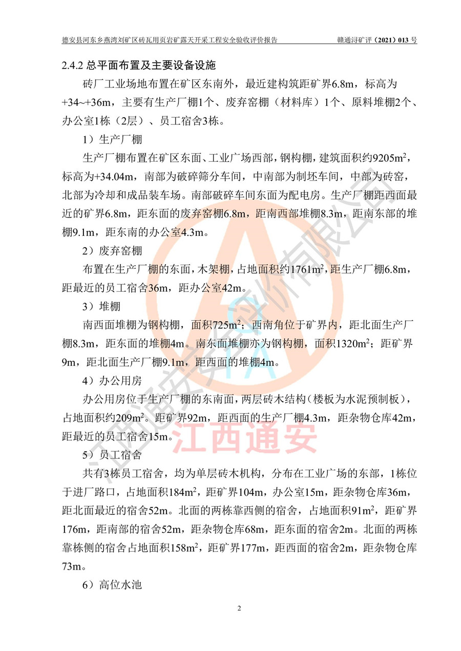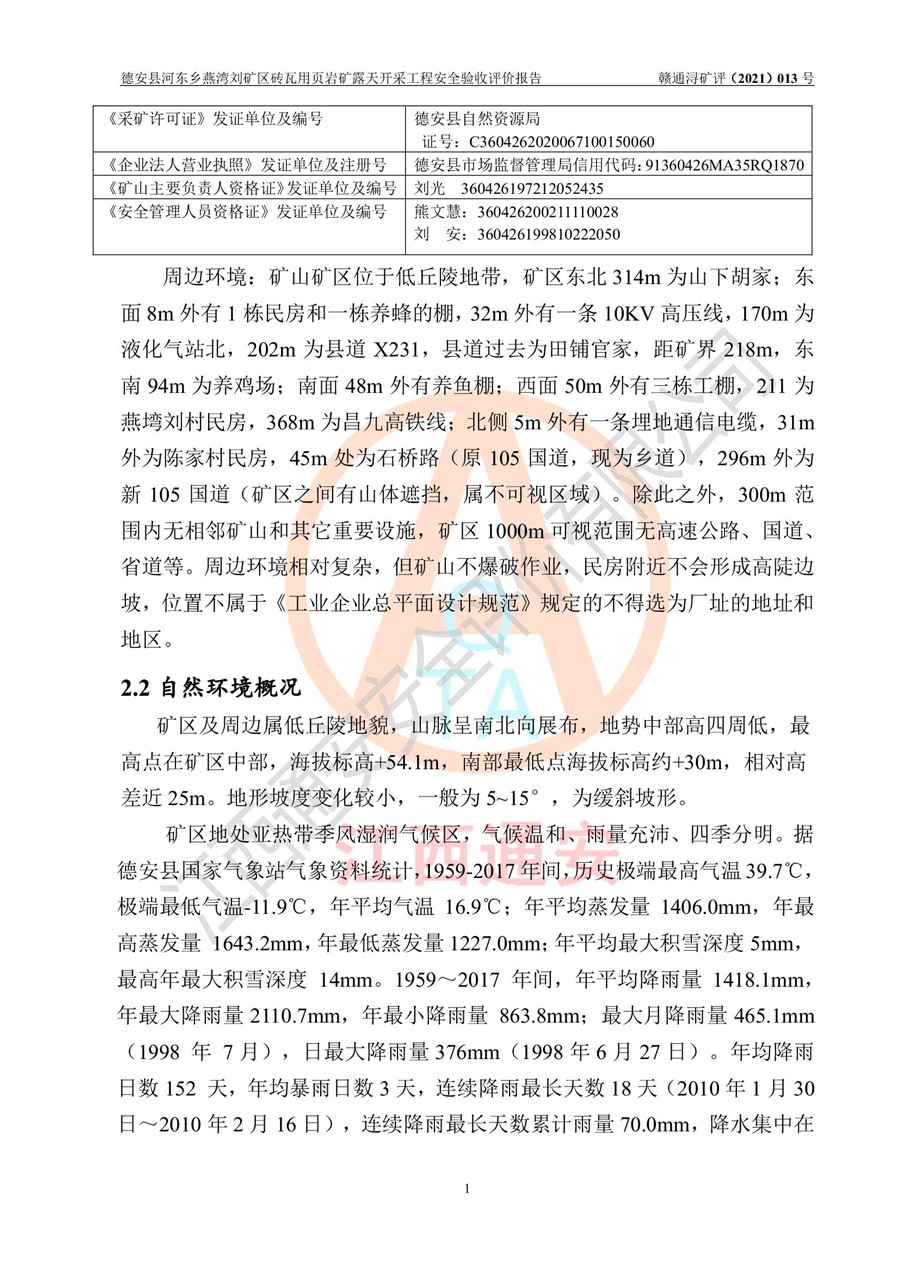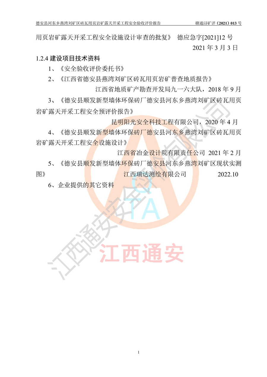 德安縣順發(fā)新型墻體**磚廠成立于2017年3月14日,位于德安縣河?xùn)|鄉(xiāng)后田村1組,為普通合伙企業(yè),執(zhí)行事務(wù)合伙人為劉俊勝,主要從事從事機制磚生產(chǎn)與銷售等。其下屬礦山——德安縣河?xùn)|鄉(xiāng)燕灣劉礦區(qū)磚瓦用頁巖礦于2018年9由江西省地質(zhì)礦產(chǎn)勘查開發(fā)局九一六大隊編制了《德安縣河?xùn)|鄉(xiāng)燕灣劉礦區(qū)磚瓦用頁巖礦普查地質(zhì)報告》,2018年10由九江市鑫晟礦業(yè)有限公司編制了《德安縣河?xùn)|鄉(xiāng)燕灣劉礦區(qū)磚瓦用頁巖礦開發(fā)利用方案》,2020年4月,委托昆明陽光安全科技工程有限公司編制了《德安縣順發(fā)新型墻體**磚廠德安縣河?xùn)|鄉(xiāng)燕灣劉礦區(qū)磚瓦用頁巖礦露天開采工程安全預(yù)評價報告》,2020年6月取得了《采礦許可證》(2021年6月延期),《采礦許可證》核定的礦區(qū)范圍由9個坐標(biāo)拐點構(gòu)成,礦區(qū)面積為0.0622km2,采掘深度+54.5m~+35m,開采規(guī)模24.2萬t/a。礦山2021年2月由江西省冶金設(shè)計院有限責(zé)任公司編制了《德安縣順發(fā)新型墻體**磚廠德安縣河?xùn)|鄉(xiāng)燕灣劉礦區(qū)磚瓦用頁巖礦露天開采工程安全設(shè)施設(shè)計》(以下簡稱《安全設(shè)施設(shè)計》),《安全設(shè)施設(shè)計》于2021年3月3日取得了德安縣應(yīng)急管理局審查備案批復(fù)(德應(yīng)急字[2021]12號)。 該礦山為山坡露天礦山,開采制磚用頁巖,基建由礦山自己施工?!栋踩O(shè)施設(shè)計》設(shè)計礦山采用公路開拓—汽車運輸方式,自上而下由挖掘機挖掘,分臺階分階段開采。礦山已按《安全設(shè)施設(shè)計》進行了基建期建設(shè),開拓道路已修至了+50m標(biāo)高首采平臺,完成了+50m標(biāo)高首采平臺建設(shè),達到了礦山《初步設(shè)計》及《安全設(shè)施設(shè)計》設(shè)計基建期建設(shè)要求 |