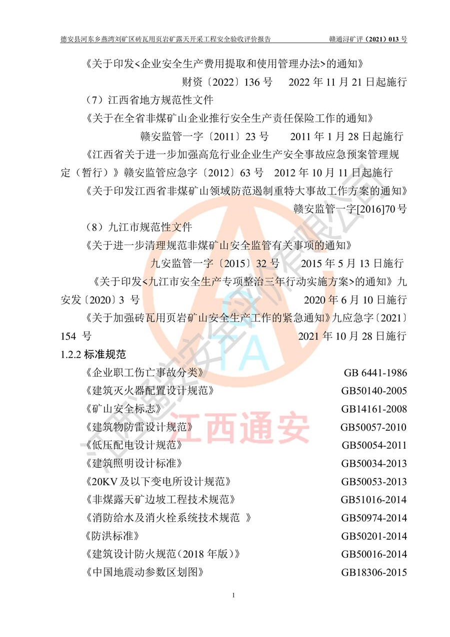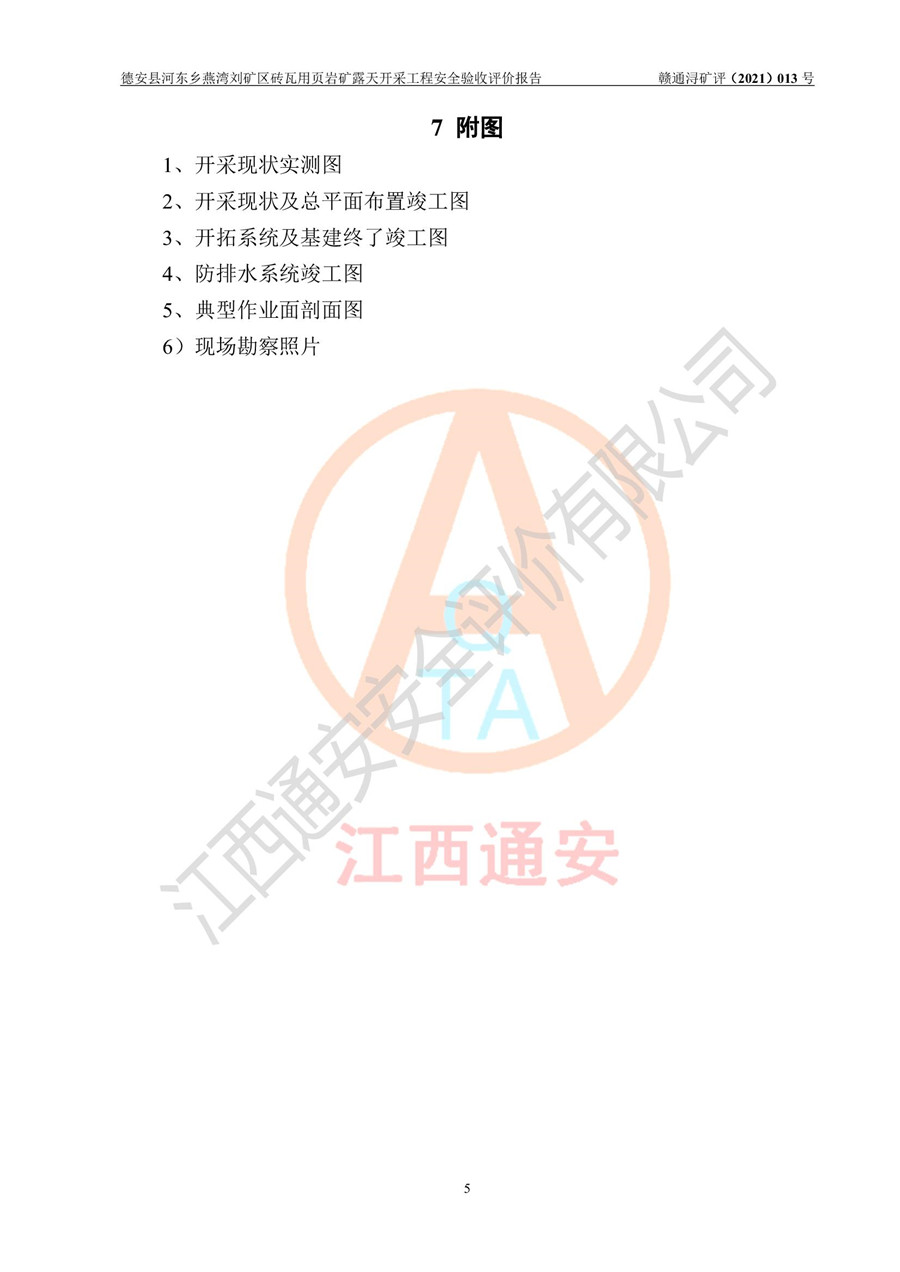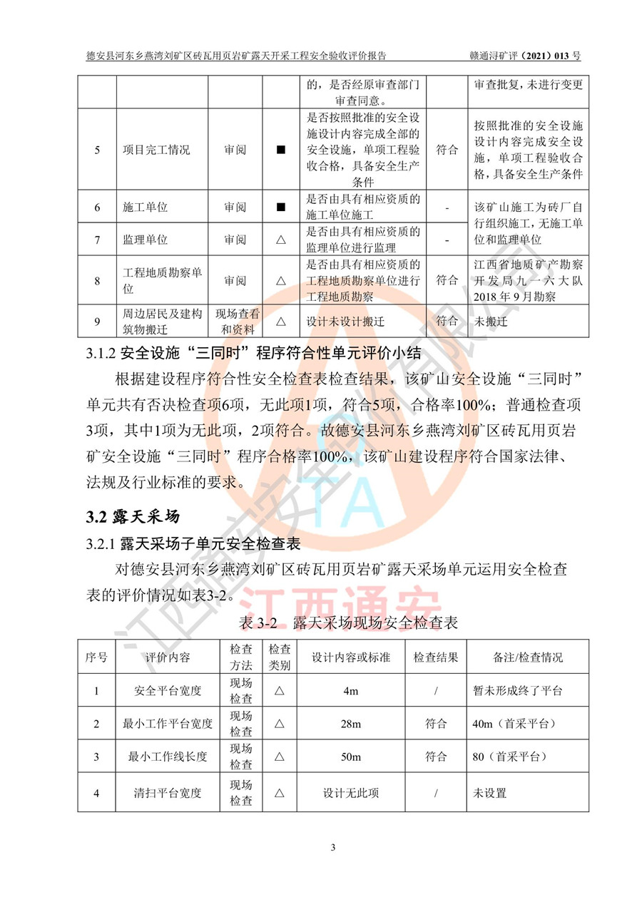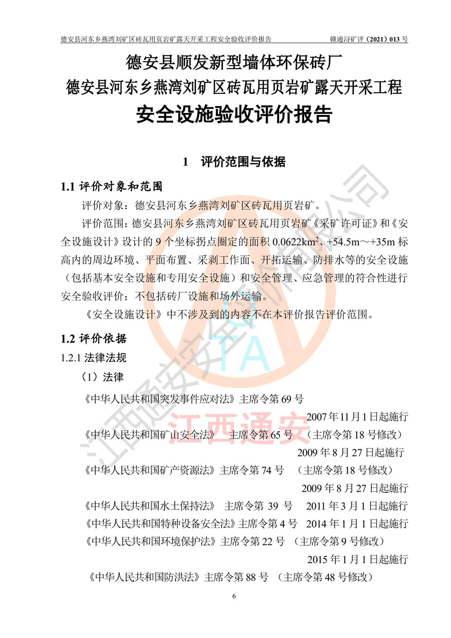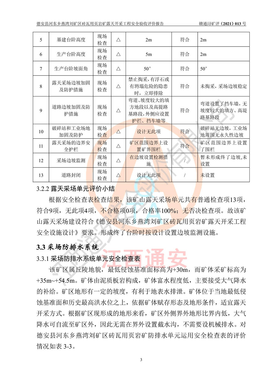 德安縣順發(fā)新型墻體**磚廠成立于2017年3月14日,位于德安縣河?xùn)|鄉(xiāng)后田村1組,為普通合伙企業(yè),執(zhí)行事務(wù)合伙人為劉俊勝,主要從事從事機制磚生產(chǎn)與銷售等。其下屬礦山——德安縣河?xùn)|鄉(xiāng)燕灣劉礦區(qū)磚瓦用頁巖礦于2018年9由江西省地質(zhì)礦產(chǎn)勘查開發(fā)局九一六大隊編制了《德安縣河?xùn)|鄉(xiāng)燕灣劉礦區(qū)磚瓦用頁巖礦普查地質(zhì)報告》,2018年10由九江市鑫晟礦業(yè)有限公司編制了《德安縣河?xùn)|鄉(xiāng)燕灣劉礦區(qū)磚瓦用頁巖礦開發(fā)利用方案》,2020年4月,委托昆明陽光安全科技工程有限公司編制了《德安縣順發(fā)新型墻體**磚廠德安縣河?xùn)|鄉(xiāng)燕灣劉礦區(qū)磚瓦用頁巖礦露天開采工程安全預(yù)評價報告》,2020年6月取得了《采礦許可證》(2021年6月延期),《采礦許可證》核定的礦區(qū)范圍由9個坐標(biāo)拐點構(gòu)成,礦區(qū)面積為0.0622km2,采掘深度+54.5m~+35m,開采規(guī)模24.2萬t/a。礦山2021年2月由江西省冶金設(shè)計院有限責(zé)任公司編制了《德安縣順發(fā)新型墻體**磚廠德安縣河?xùn)|鄉(xiāng)燕灣劉礦區(qū)磚瓦用頁巖礦露天開采工程安全設(shè)施設(shè)計》(以下簡稱《安全設(shè)施設(shè)計》),《安全設(shè)施設(shè)計》于2021年3月3日取得了德安縣應(yīng)急管理局審查備案批復(fù)(德應(yīng)急字[2021]12號)。 該礦山為山坡露天礦山,開采制磚用頁巖,基建由礦山自己施工?!栋踩O(shè)施設(shè)計》設(shè)計礦山采用公路開拓—汽車運輸方式,自上而下由挖掘機挖掘,分臺階分階段開采。礦山已按《安全設(shè)施設(shè)計》進行了基建期建設(shè),開拓道路已修至了+50m標(biāo)高首采平臺,完成了+50m標(biāo)高首采平臺建設(shè),達到了礦山《初步設(shè)計》及《安全設(shè)施設(shè)計》設(shè)計基建期建設(shè)要求 |