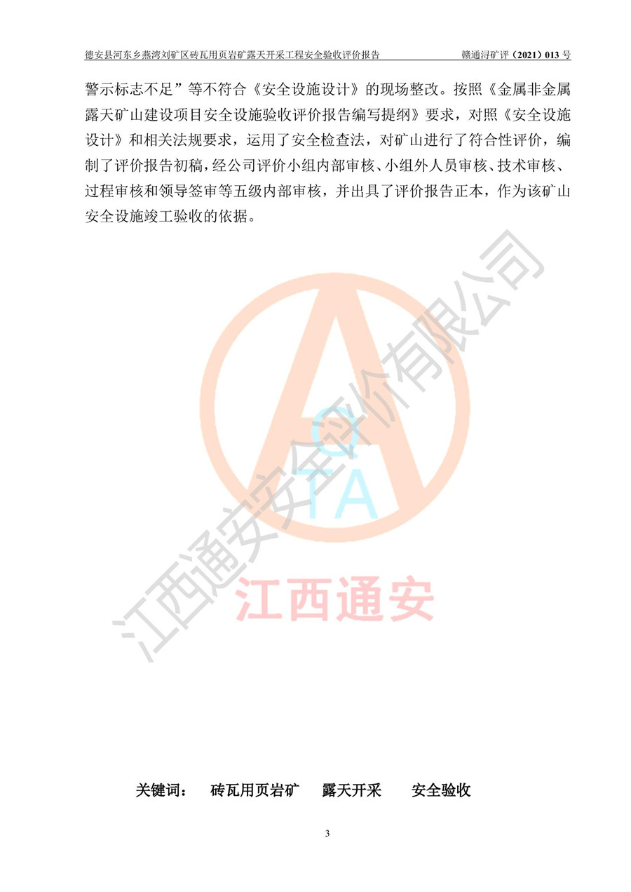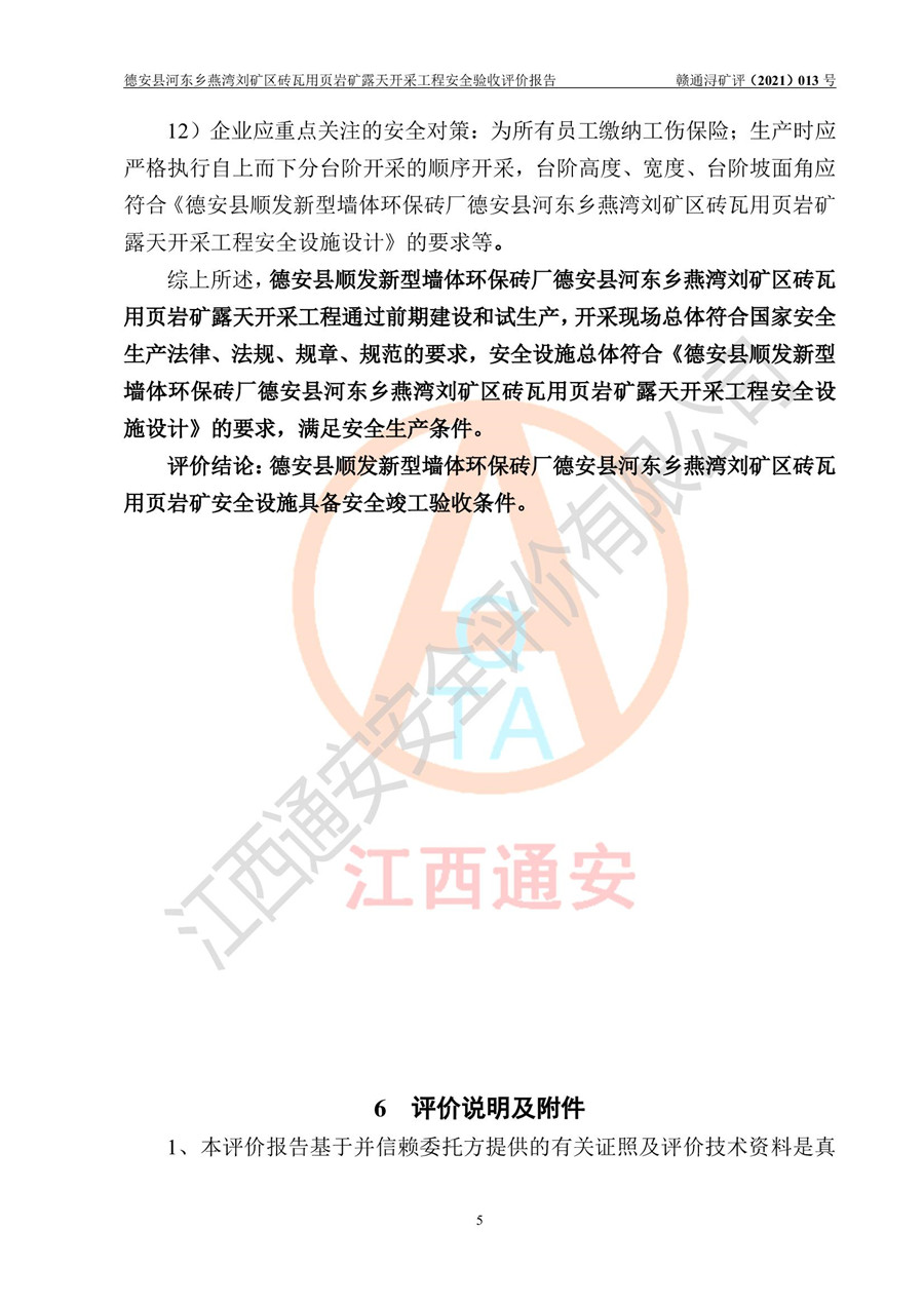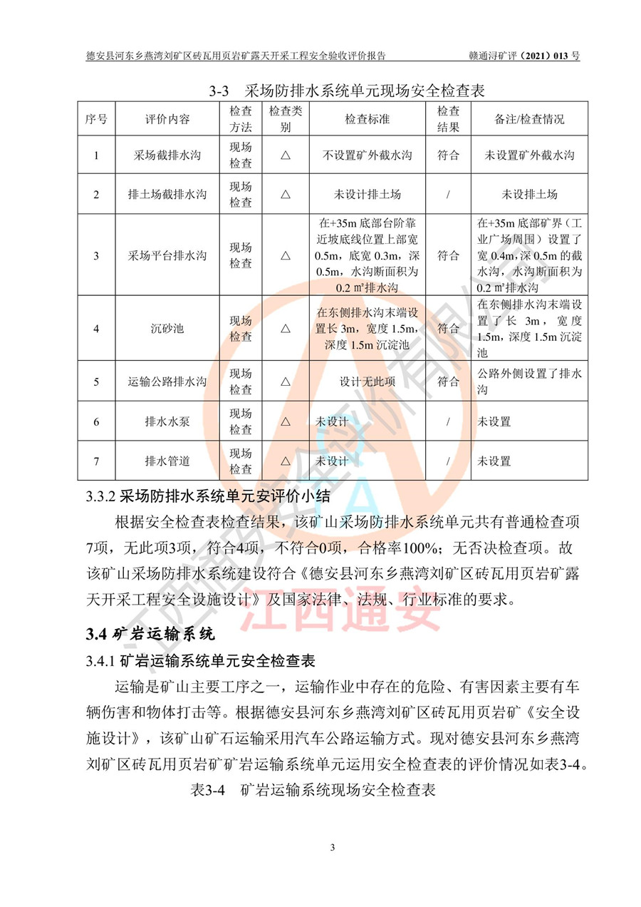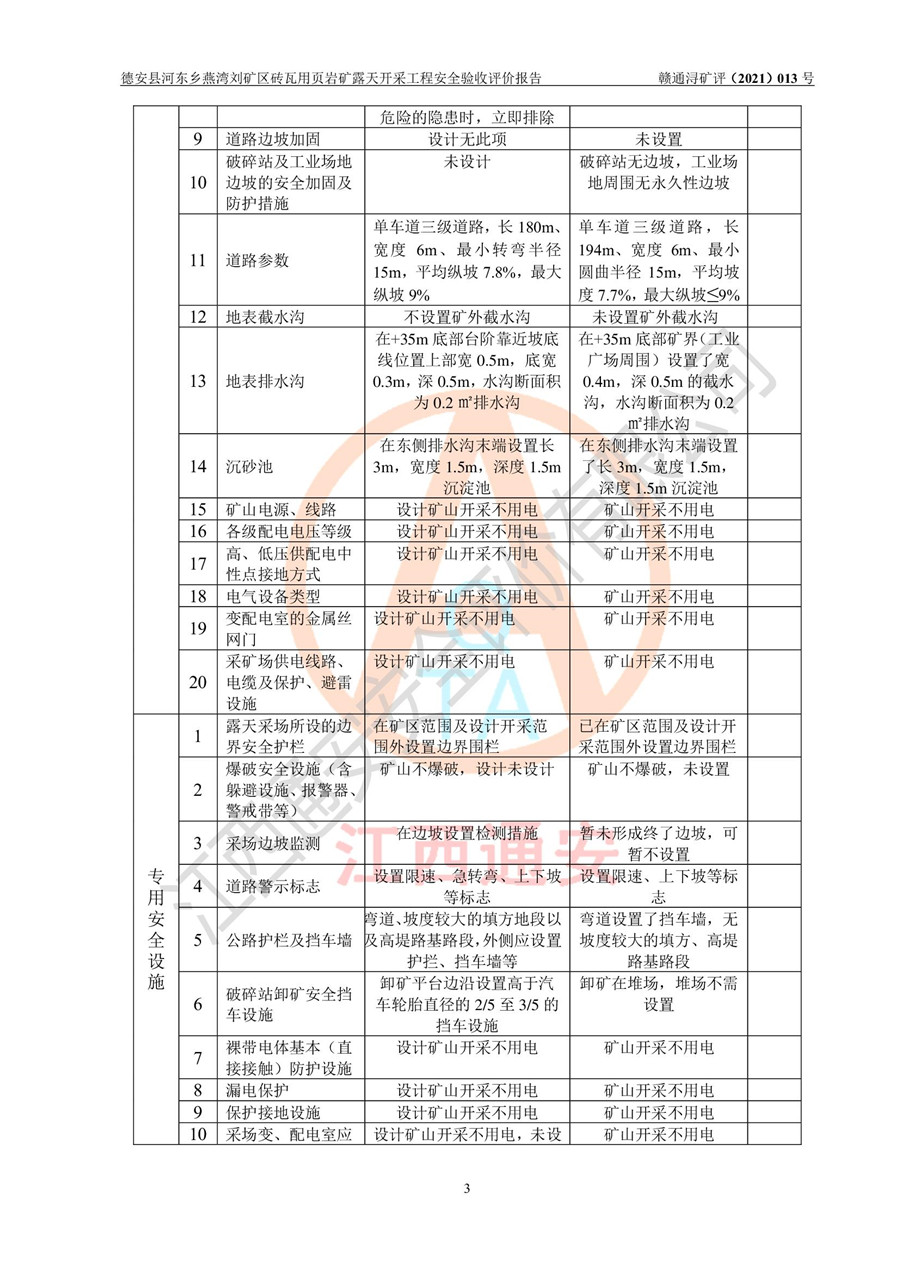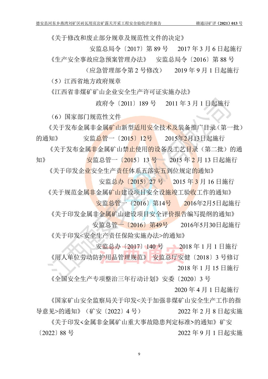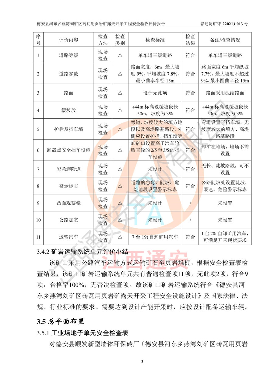 德安縣順發(fā)新型墻體**磚廠成立于2017年3月14日,位于德安縣河?xùn)|鄉(xiāng)后田村1組,為普通合伙企業(yè),執(zhí)行事務(wù)合伙人為劉俊勝,主要從事從事機制磚生產(chǎn)與銷售等。其下屬礦山——德安縣河?xùn)|鄉(xiāng)燕灣劉礦區(qū)磚瓦用頁巖礦于2018年9由江西省地質(zhì)礦產(chǎn)勘查開發(fā)局九一六大隊編制了《德安縣河?xùn)|鄉(xiāng)燕灣劉礦區(qū)磚瓦用頁巖礦普查地質(zhì)報告》,2018年10由九江市鑫晟礦業(yè)有限公司編制了《德安縣河?xùn)|鄉(xiāng)燕灣劉礦區(qū)磚瓦用頁巖礦開發(fā)利用方案》,2020年4月,委托昆明陽光安全科技工程有限公司編制了《德安縣順發(fā)新型墻體**磚廠德安縣河?xùn)|鄉(xiāng)燕灣劉礦區(qū)磚瓦用頁巖礦露天開采工程安全預(yù)評價報告》,2020年6月取得了《采礦許可證》(2021年6月延期),《采礦許可證》核定的礦區(qū)范圍由9個坐標(biāo)拐點構(gòu)成,礦區(qū)面積為0.0622km2,采掘深度+54.5m~+35m,開采規(guī)模24.2萬t/a。礦山2021年2月由江西省冶金設(shè)計院有限責(zé)任公司編制了《德安縣順發(fā)新型墻體**磚廠德安縣河?xùn)|鄉(xiāng)燕灣劉礦區(qū)磚瓦用頁巖礦露天開采工程安全設(shè)施設(shè)計》(以下簡稱《安全設(shè)施設(shè)計》),《安全設(shè)施設(shè)計》于2021年3月3日取得了德安縣應(yīng)急管理局審查備案批復(fù)(德應(yīng)急字[2021]12號)。 該礦山為山坡露天礦山,開采制磚用頁巖,基建由礦山自己施工?!栋踩O(shè)施設(shè)計》設(shè)計礦山采用公路開拓—汽車運輸方式,自上而下由挖掘機挖掘,分臺階分階段開采。礦山已按《安全設(shè)施設(shè)計》進行了基建期建設(shè),開拓道路已修至了+50m標(biāo)高首采平臺,完成了+50m標(biāo)高首采平臺建設(shè),達到了礦山《初步設(shè)計》及《安全設(shè)施設(shè)計》設(shè)計基建期建設(shè)要求 |