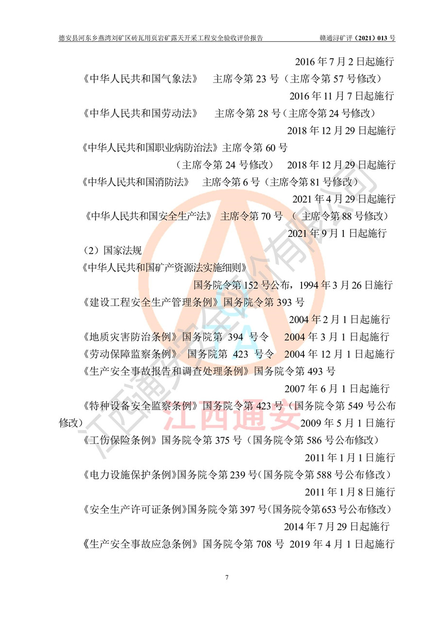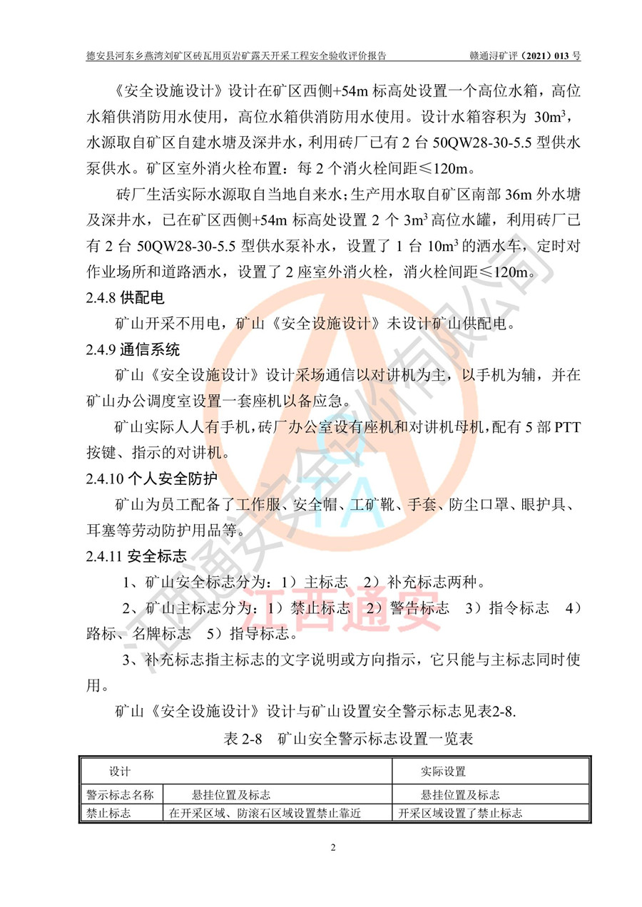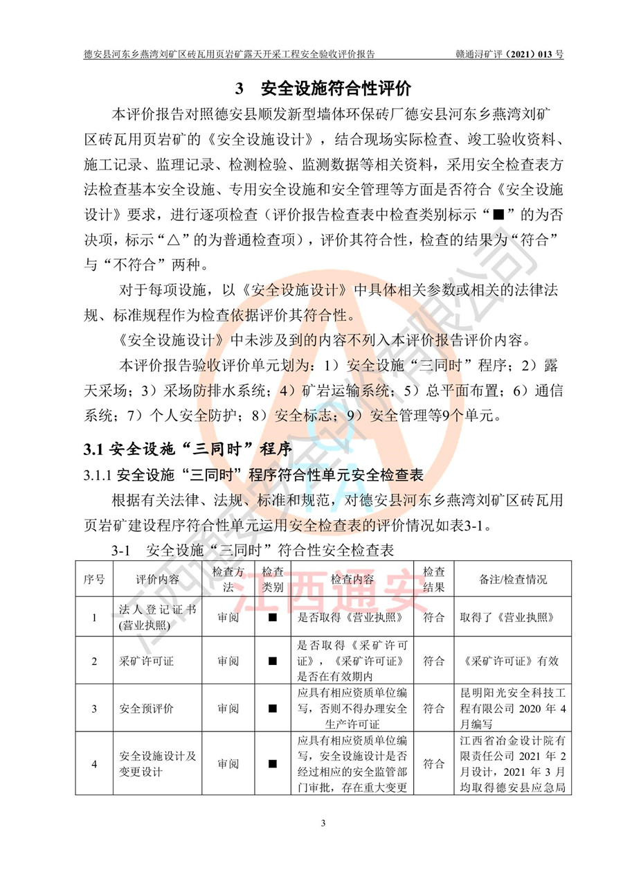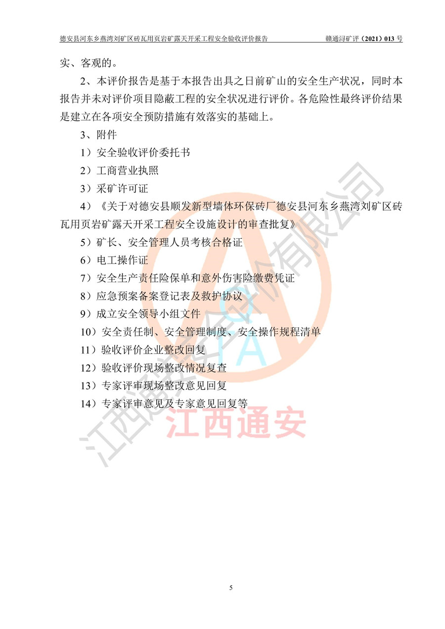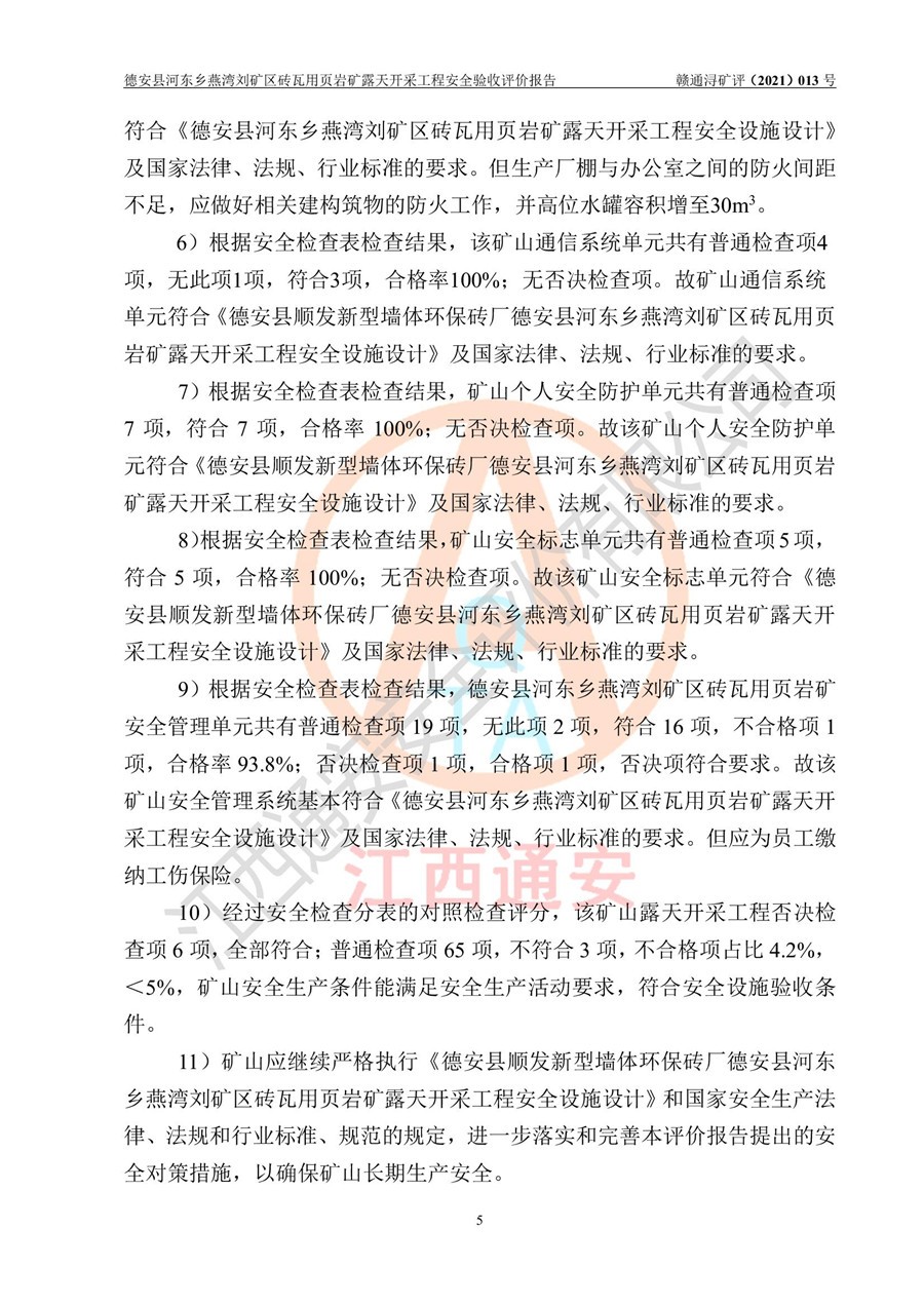 德安縣順發(fā)新型墻體**磚廠成立于2017年3月14日,位于德安縣河?xùn)|鄉(xiāng)后田村1組,為普通合伙企業(yè),執(zhí)行事務(wù)合伙人為劉俊勝,主要從事從事機制磚生產(chǎn)與銷售等。其下屬礦山——德安縣河?xùn)|鄉(xiāng)燕灣劉礦區(qū)磚瓦用頁巖礦于2018年9由江西省地質(zhì)礦產(chǎn)勘查開發(fā)局九一六大隊編制了《德安縣河?xùn)|鄉(xiāng)燕灣劉礦區(qū)磚瓦用頁巖礦普查地質(zhì)報告》,2018年10由九江市鑫晟礦業(yè)有限公司編制了《德安縣河?xùn)|鄉(xiāng)燕灣劉礦區(qū)磚瓦用頁巖礦開發(fā)利用方案》,2020年4月,委托昆明陽光安全科技工程有限公司編制了《德安縣順發(fā)新型墻體**磚廠德安縣河?xùn)|鄉(xiāng)燕灣劉礦區(qū)磚瓦用頁巖礦露天開采工程安全預(yù)評價報告》,2020年6月取得了《采礦許可證》(2021年6月延期),《采礦許可證》核定的礦區(qū)范圍由9個坐標(biāo)拐點構(gòu)成,礦區(qū)面積為0.0622km2,采掘深度+54.5m~+35m,開采規(guī)模24.2萬t/a。礦山2021年2月由江西省冶金設(shè)計院有限責(zé)任公司編制了《德安縣順發(fā)新型墻體**磚廠德安縣河?xùn)|鄉(xiāng)燕灣劉礦區(qū)磚瓦用頁巖礦露天開采工程安全設(shè)施設(shè)計》(以下簡稱《安全設(shè)施設(shè)計》),《安全設(shè)施設(shè)計》于2021年3月3日取得了德安縣應(yīng)急管理局審查備案批復(fù)(德應(yīng)急字[2021]12號)。 該礦山為山坡露天礦山,開采制磚用頁巖,基建由礦山自己施工?!栋踩O(shè)施設(shè)計》設(shè)計礦山采用公路開拓—汽車運輸方式,自上而下由挖掘機挖掘,分臺階分階段開采。礦山已按《安全設(shè)施設(shè)計》進行了基建期建設(shè),開拓道路已修至了+50m標(biāo)高首采平臺,完成了+50m標(biāo)高首采平臺建設(shè),達到了礦山《初步設(shè)計》及《安全設(shè)施設(shè)計》設(shè)計基建期建設(shè)要求 |