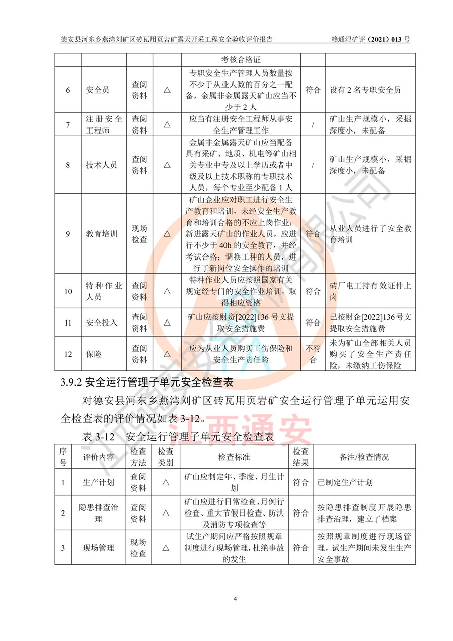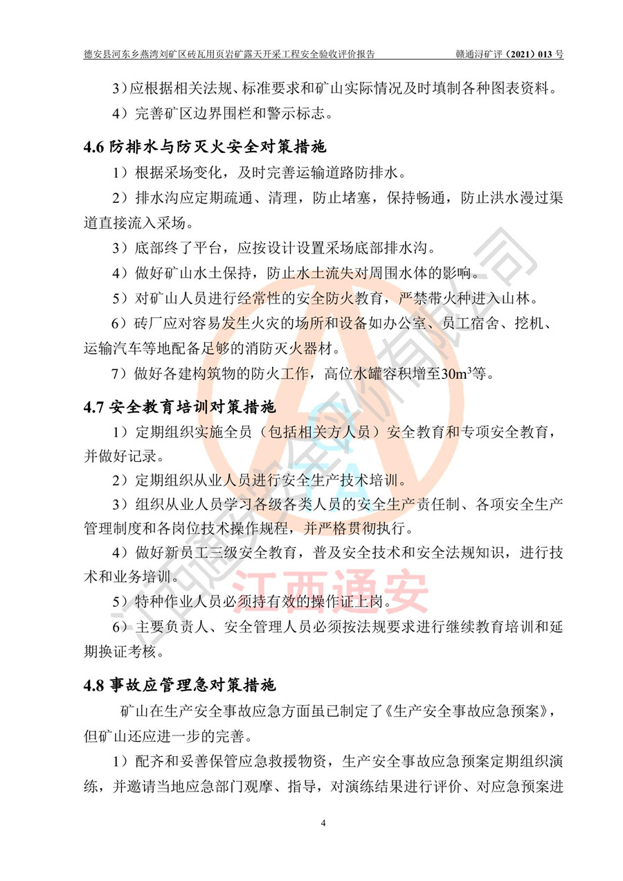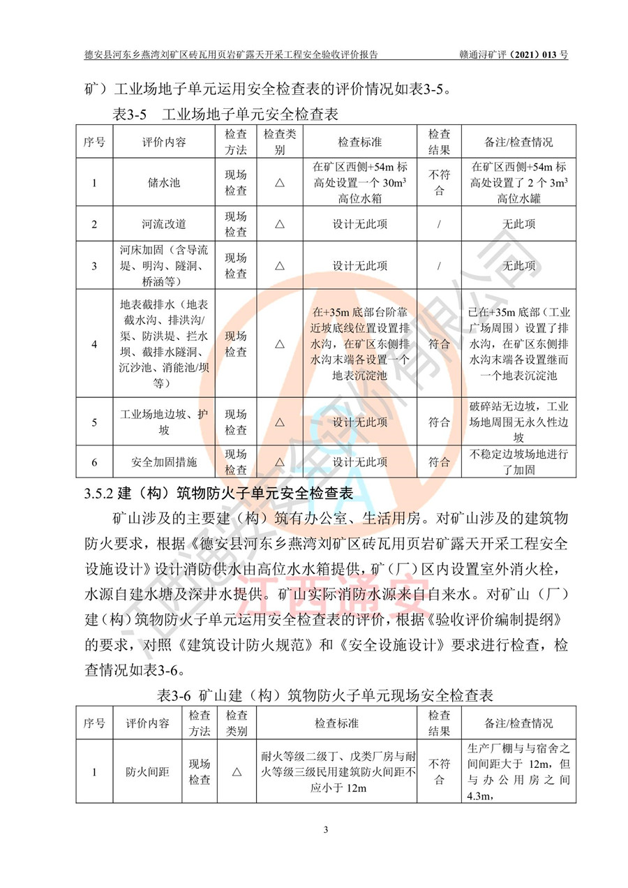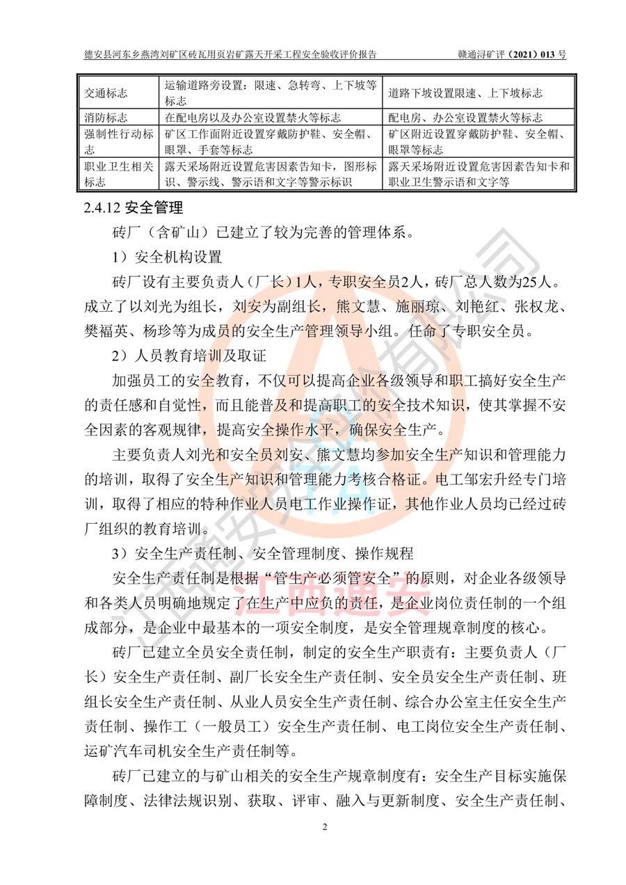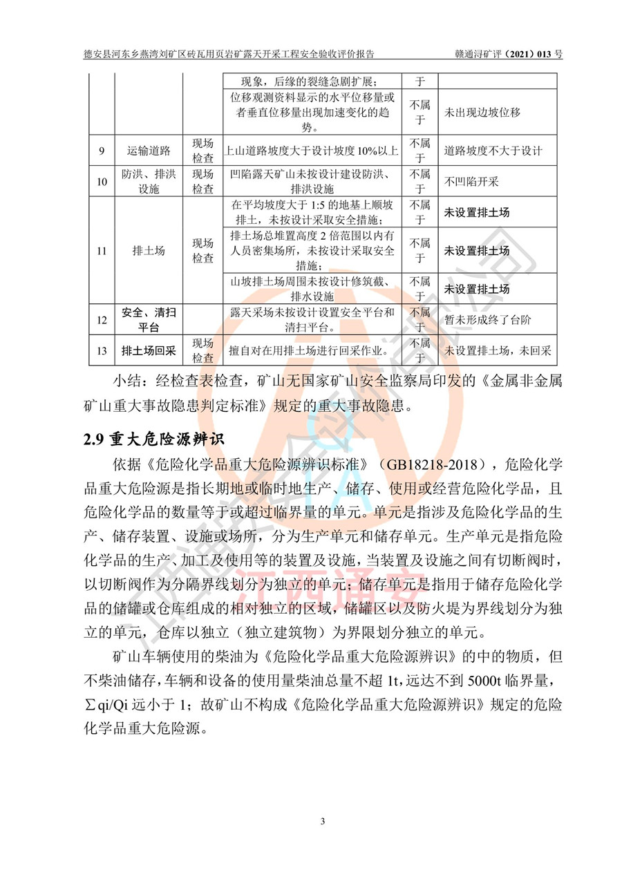德安縣順發(fā)新型墻體**磚廠成立于2017年3月14日,位于德安縣河?xùn)|鄉(xiāng)后田村1組,為普通合伙企業(yè),執(zhí)行事務(wù)合伙人為劉俊勝,主要從事從事機制磚生產(chǎn)與銷售等。其下屬礦山——德安縣河?xùn)|鄉(xiāng)燕灣劉礦區(qū)磚瓦用頁巖礦于2018年9由江西省地質(zhì)礦產(chǎn)勘查開發(fā)局九一六大隊編制了《德安縣河?xùn)|鄉(xiāng)燕灣劉礦區(qū)磚瓦用頁巖礦普查地質(zhì)報告》,2018年10由九江市鑫晟礦業(yè)有限公司編制了《德安縣河?xùn)|鄉(xiāng)燕灣劉礦區(qū)磚瓦用頁巖礦開發(fā)利用方案》,2020年4月,委托昆明陽光安全科技工程有限公司編制了《德安縣順發(fā)新型墻體**磚廠德安縣河?xùn)|鄉(xiāng)燕灣劉礦區(qū)磚瓦用頁巖礦露天開采工程安全預(yù)評價報告》,2020年6月取得了《采礦許可證》(2021年6月延期),《采礦許可證》核定的礦區(qū)范圍由9個坐標(biāo)拐點構(gòu)成,礦區(qū)面積為0.0622km2,采掘深度+54.5m~+35m,開采規(guī)模24.2萬t/a。礦山2021年2月由江西省冶金設(shè)計院有限責(zé)任公司編制了《德安縣順發(fā)新型墻體**磚廠德安縣河?xùn)|鄉(xiāng)燕灣劉礦區(qū)磚瓦用頁巖礦露天開采工程安全設(shè)施設(shè)計》(以下簡稱《安全設(shè)施設(shè)計》),《安全設(shè)施設(shè)計》于2021年3月3日取得了德安縣應(yīng)急管理局審查備案批復(fù)(德應(yīng)急字[2021]12號)。 該礦山為山坡露天礦山,開采制磚用頁巖,基建由礦山自己施工?!栋踩O(shè)施設(shè)計》設(shè)計礦山采用公路開拓—汽車運輸方式,自上而下由挖掘機挖掘,分臺階分階段開采。礦山已按《安全設(shè)施設(shè)計》進行了基建期建設(shè),開拓道路已修至了+50m標(biāo)高首采平臺,完成了+50m標(biāo)高首采平臺建設(shè),達到了礦山《初步設(shè)計》及《安全設(shè)施設(shè)計》設(shè)計基建期建設(shè)要求 |