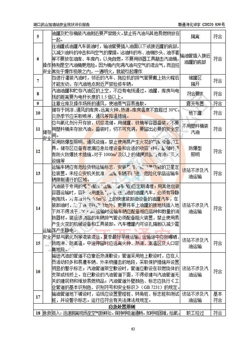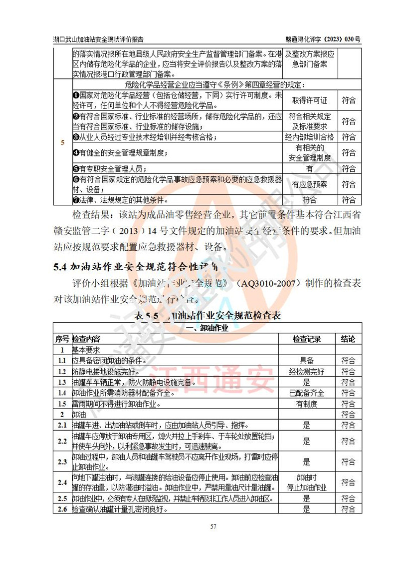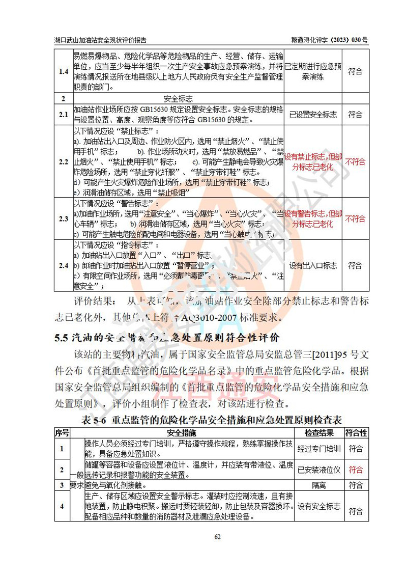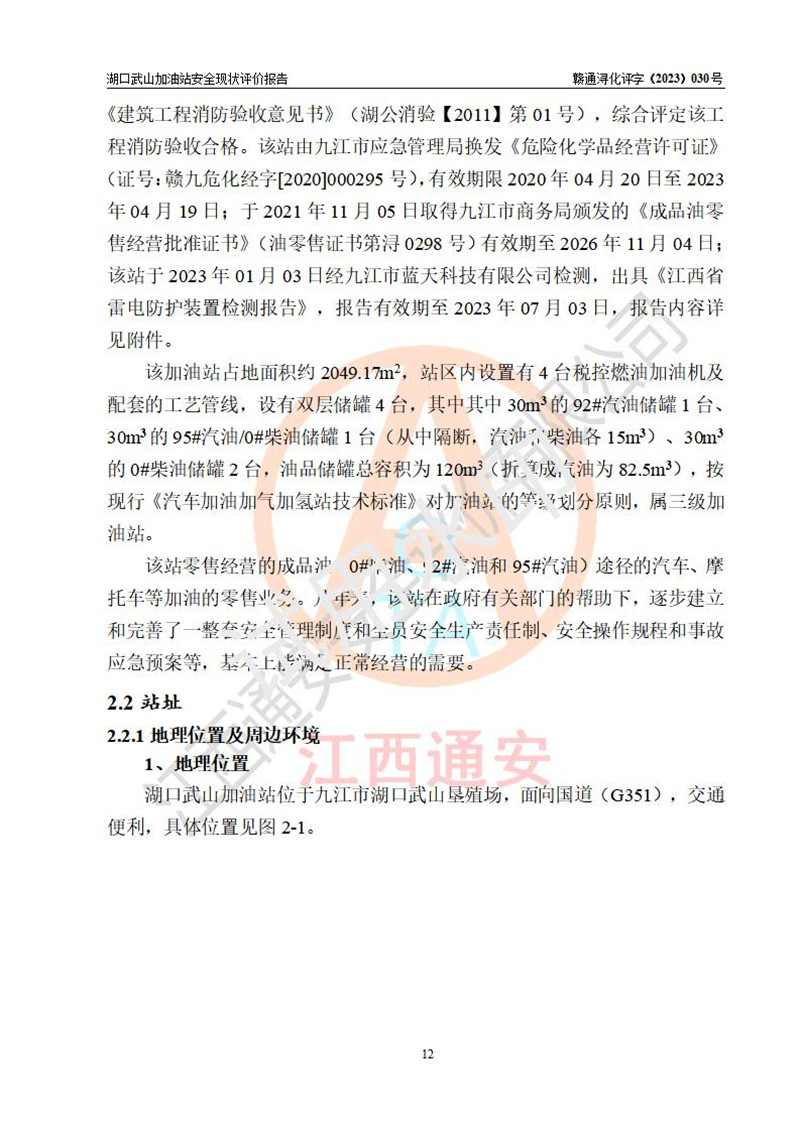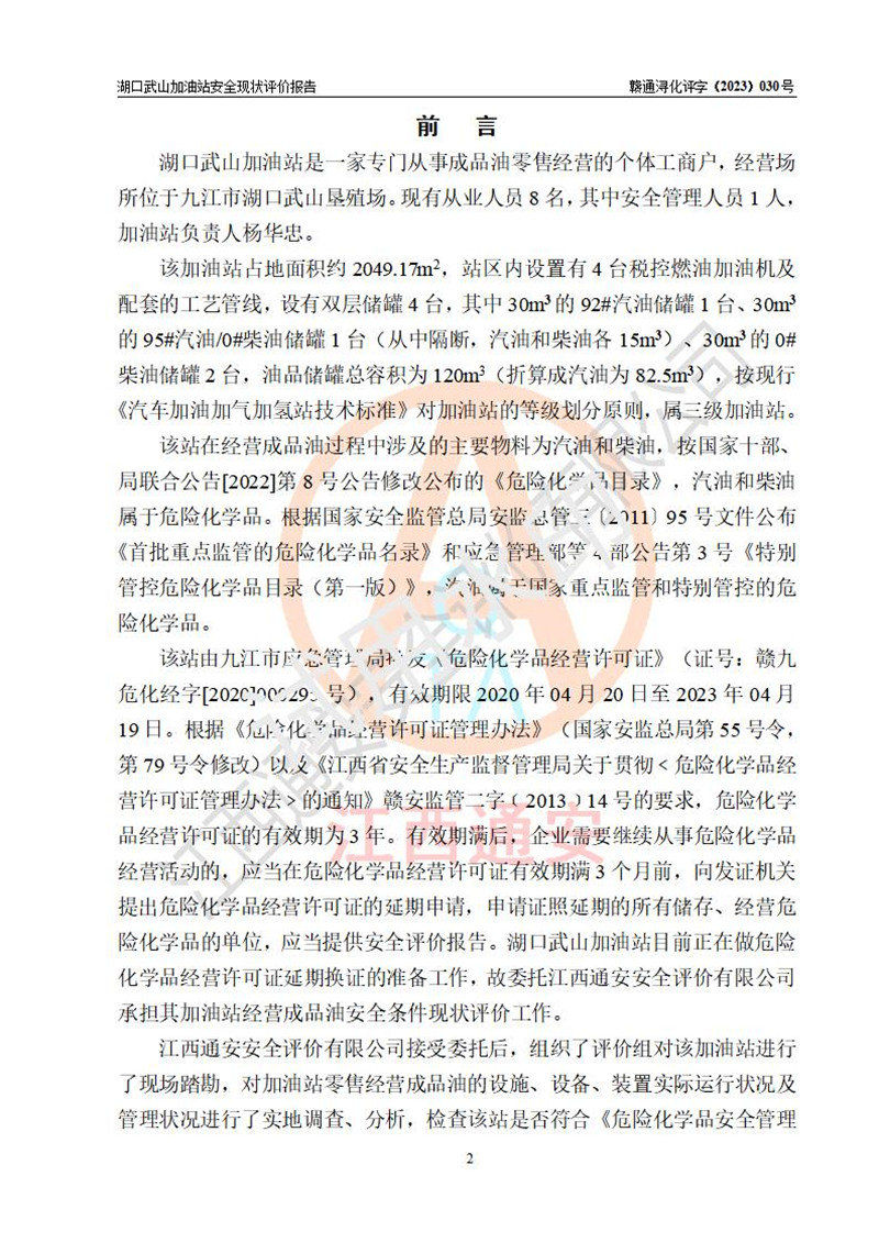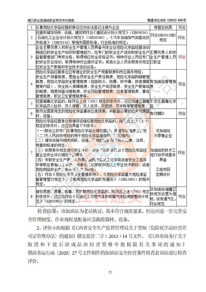 湖口武山加油站涉及的安全條件、安全經(jīng)營條件、安全生產(chǎn)管理符合《危險化學(xué)品經(jīng)營許可證管理辦法》、《汽車加油加氣加氫站技術(shù)標(biāo)準(zhǔn)》等**有關(guān)法規(guī)、標(biāo)準(zhǔn)、規(guī)范要求,能滿足危險化學(xué)品經(jīng)營安全條件。