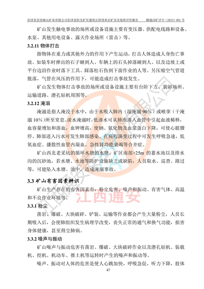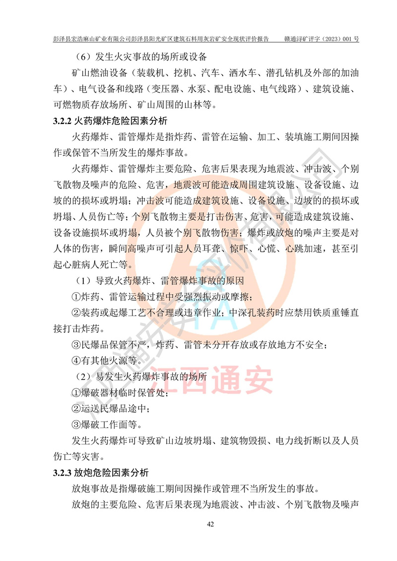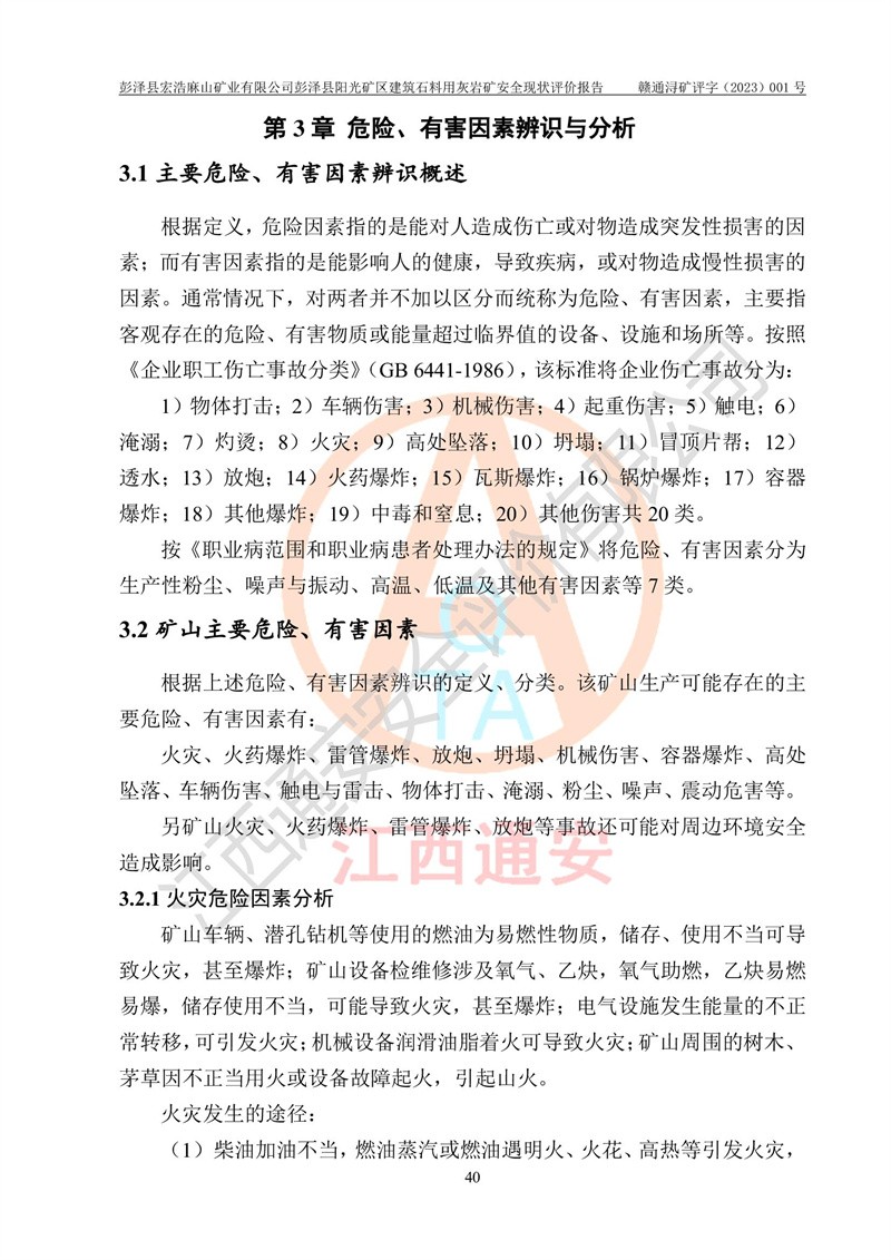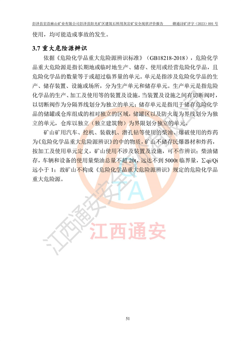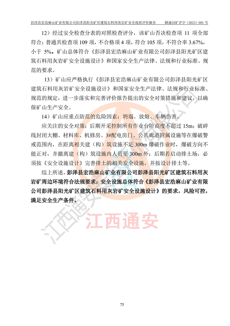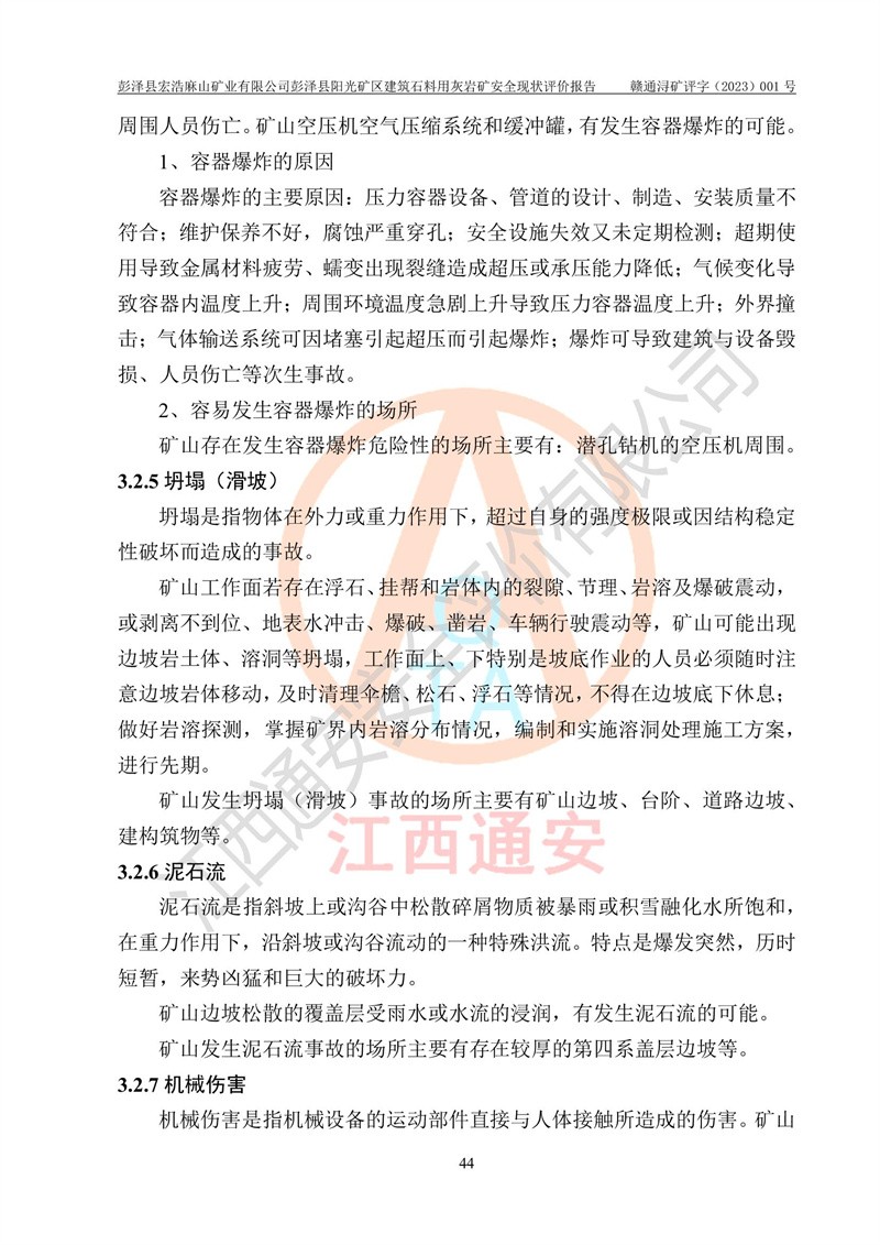(1)礦山存在火災(zāi)、火藥爆炸、雷管爆炸、放炮、坍塌(滑坡)、泥石流、機(jī)械傷害、容器爆炸、高處墜落、**傷害、觸電與雷擊、物體打擊、淹溺、高低溫、振動(dòng)、粉塵危害等危險(xiǎn)有害因素。礦山無(wú)**礦山安全監(jiān)察局印發(fā)的《金屬非金屬礦山重大生產(chǎn)安全事故隱患判定標(biāo)準(zhǔn)》規(guī)定的重大事故隱患;不構(gòu)成《危險(xiǎn)化學(xué)品重大危險(xiǎn)源辨識(shí)》規(guī)定的重大危險(xiǎn)源。 (2)礦山總體符合《彭澤縣宏浩麻山礦業(yè)有限公司彭澤縣陽(yáng)光礦區(qū)建筑石料用灰?guī)r礦安全設(shè)施設(shè)計(jì)》和**安全生產(chǎn)法律、法規(guī)和行業(yè)標(biāo)準(zhǔn)、規(guī)范的要求。。 (3)礦山應(yīng)重點(diǎn)防范的重大危險(xiǎn)有害因素有:坍塌、放炮、**傷害等。 總體結(jié)論:彭澤縣宏浩麻山礦業(yè)有限公司彭澤縣陽(yáng)光礦區(qū)建筑石料用灰?guī)r礦周邊環(huán)境符合法規(guī)要求;安全設(shè)施總體符合《彭澤縣宏浩麻山礦業(yè)有限公司彭澤縣陽(yáng)光礦區(qū)建筑石料用灰?guī)r礦安全設(shè)施設(shè)計(jì)》的要求,風(fēng)險(xiǎn)可控,滿足安全生產(chǎn)條件。 |