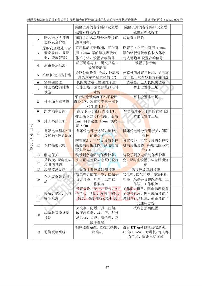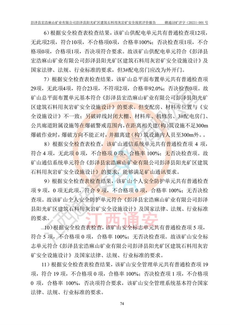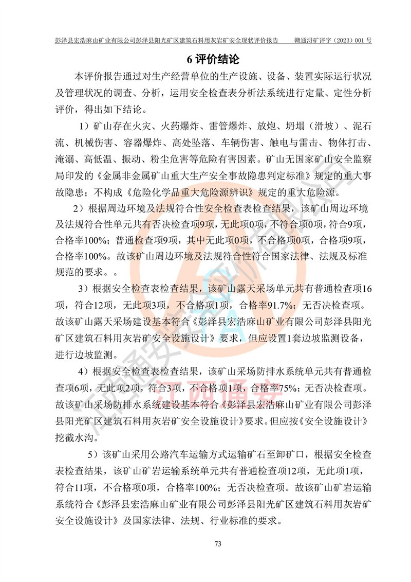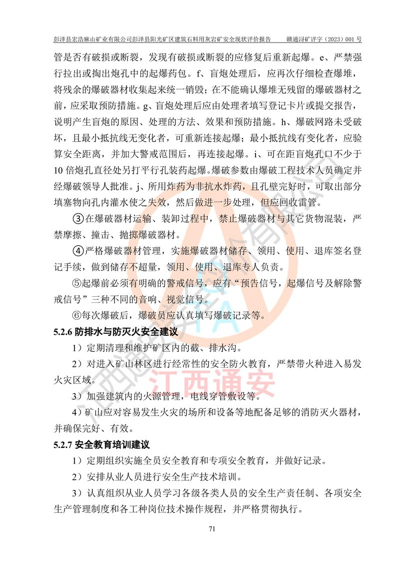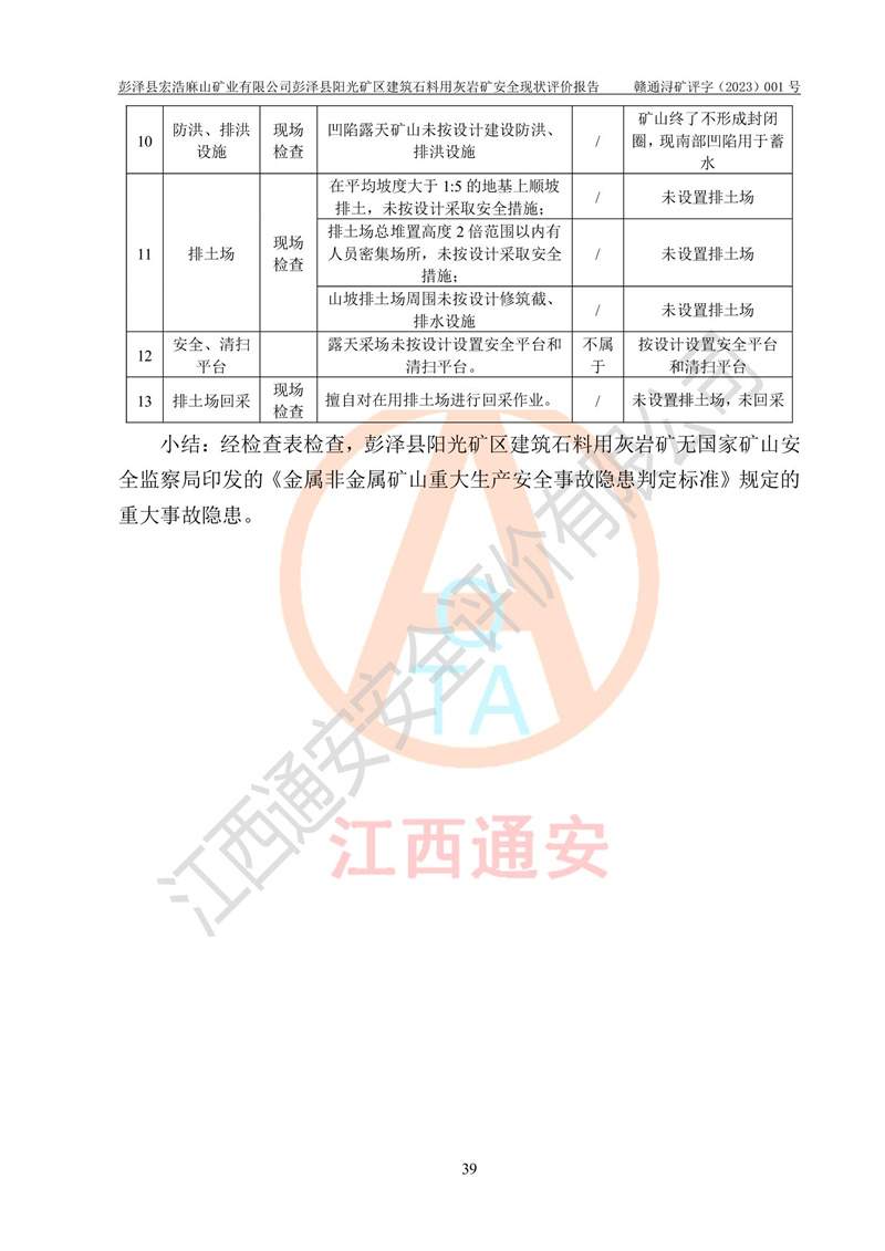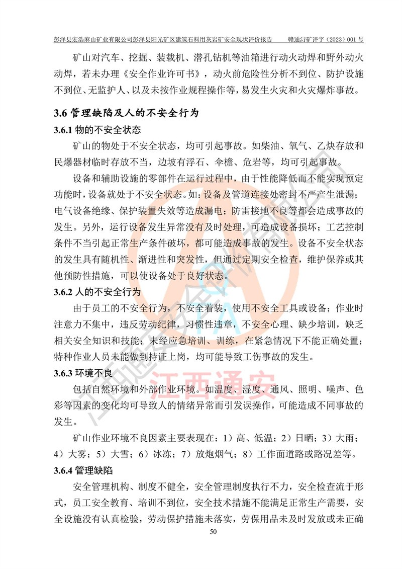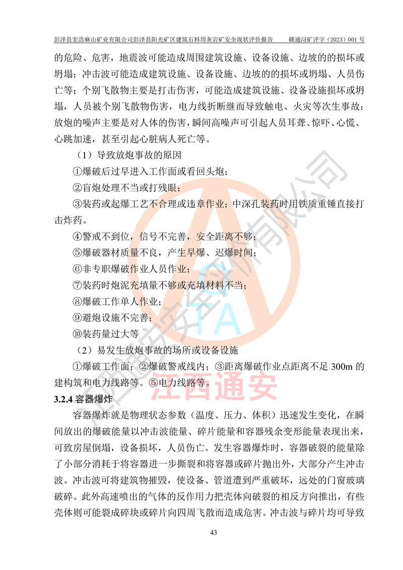 (1)礦山存在火災(zāi)、火藥爆炸、雷管爆炸、放炮、坍塌(滑坡)、泥石流、機(jī)械傷害、容器爆炸、高處墜落、**傷害、觸電與雷擊、物體打擊、淹溺、高低溫、振動(dòng)、粉塵危害等危險(xiǎn)有害因素。礦山無(wú)**礦山安全監(jiān)察局印發(fā)的《金屬非金屬礦山重大生產(chǎn)安全事故隱患判定標(biāo)準(zhǔn)》規(guī)定的重大事故隱患;不構(gòu)成《危險(xiǎn)化學(xué)品重大危險(xiǎn)源辨識(shí)》規(guī)定的重大危險(xiǎn)源。 (2)礦山總體符合《彭澤縣宏浩麻山礦業(yè)有限公司彭澤縣陽(yáng)光礦區(qū)建筑石料用灰?guī)r礦安全設(shè)施設(shè)計(jì)》和**安全生產(chǎn)法律、法規(guī)和行業(yè)標(biāo)準(zhǔn)、規(guī)范的要求。。 (3)礦山應(yīng)重點(diǎn)防范的重大危險(xiǎn)有害因素有:坍塌、放炮、**傷害等。 總體結(jié)論:彭澤縣宏浩麻山礦業(yè)有限公司彭澤縣陽(yáng)光礦區(qū)建筑石料用灰?guī)r礦周邊環(huán)境符合法規(guī)要求;安全設(shè)施總體符合《彭澤縣宏浩麻山礦業(yè)有限公司彭澤縣陽(yáng)光礦區(qū)建筑石料用灰?guī)r礦安全設(shè)施設(shè)計(jì)》的要求,風(fēng)險(xiǎn)可控,滿足安全生產(chǎn)條件。 |