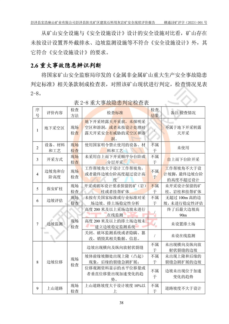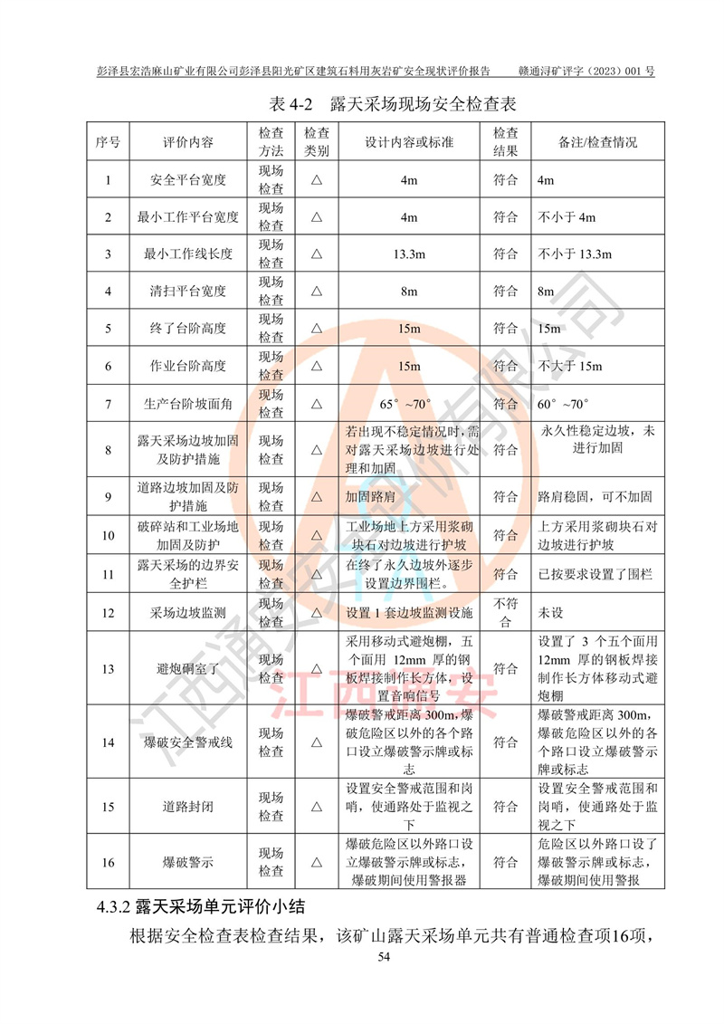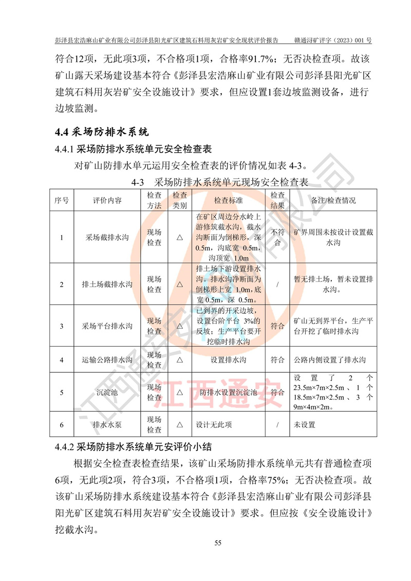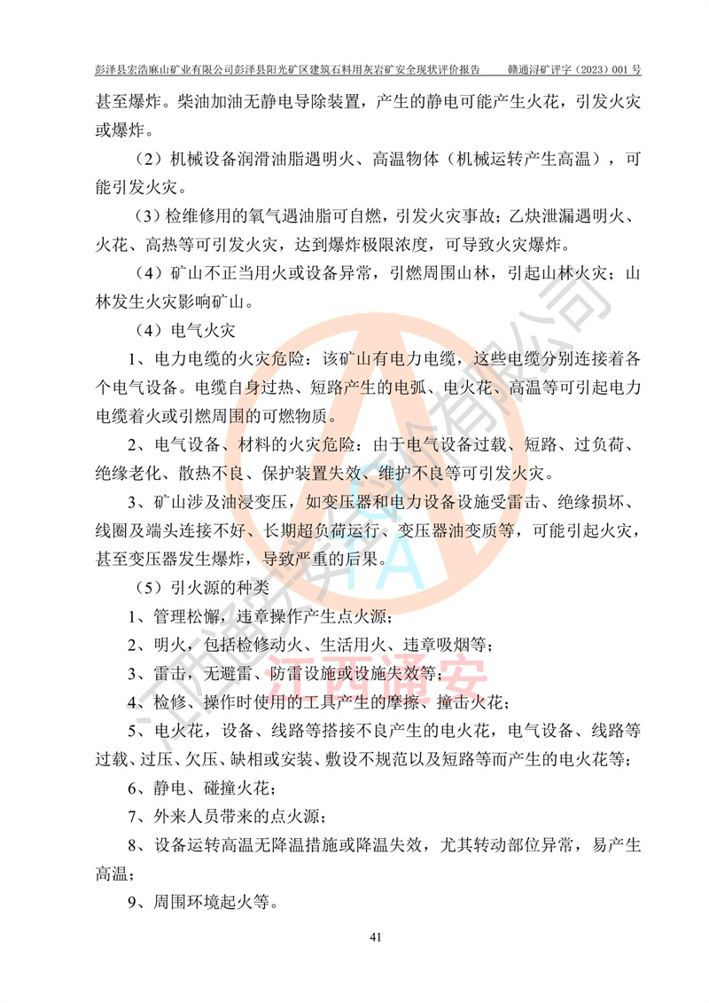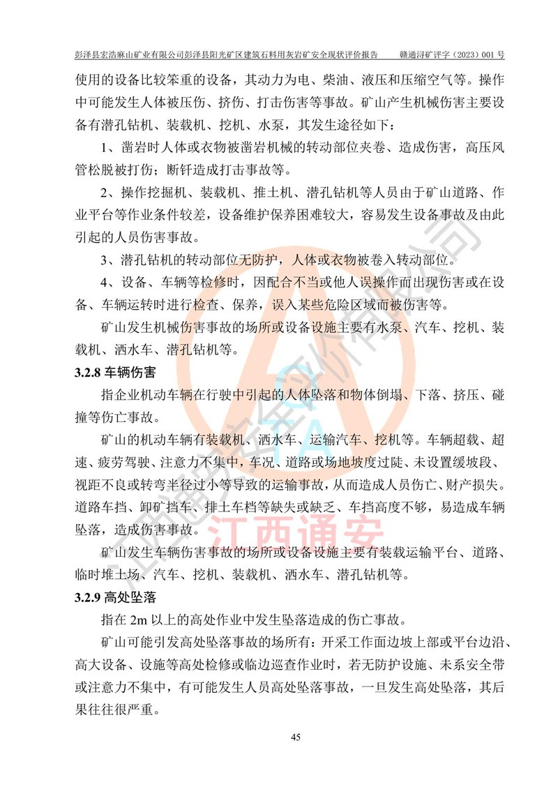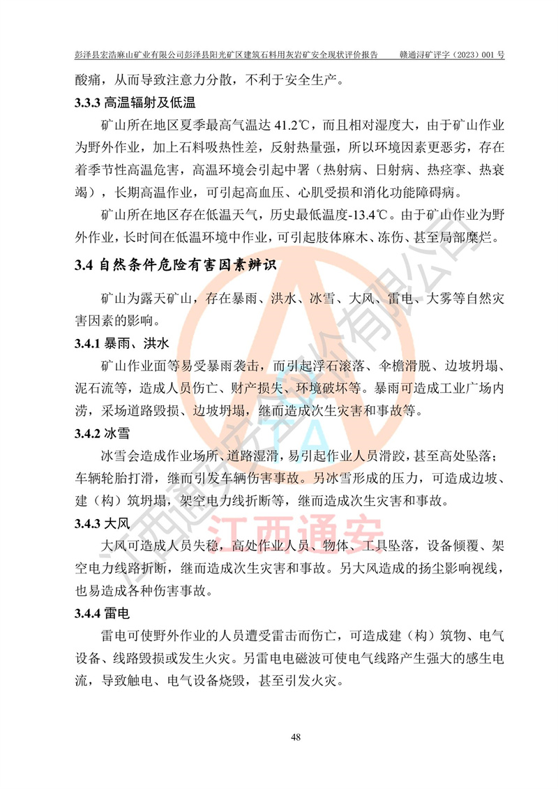 (1)礦山存在火災(zāi)、火藥爆炸、雷管爆炸、放炮、坍塌(滑坡)、泥石流、機(jī)械傷害、容器爆炸、高處墜落、**傷害、觸電與雷擊、物體打擊、淹溺、高低溫、振動(dòng)、粉塵危害等危險(xiǎn)有害因素。礦山無(wú)**礦山安全監(jiān)察局印發(fā)的《金屬非金屬礦山重大生產(chǎn)安全事故隱患判定標(biāo)準(zhǔn)》規(guī)定的重大事故隱患;不構(gòu)成《危險(xiǎn)化學(xué)品重大危險(xiǎn)源辨識(shí)》規(guī)定的重大危險(xiǎn)源。 (2)礦山總體符合《彭澤縣宏浩麻山礦業(yè)有限公司彭澤縣陽(yáng)光礦區(qū)建筑石料用灰?guī)r礦安全設(shè)施設(shè)計(jì)》和**安全生產(chǎn)法律、法規(guī)和行業(yè)標(biāo)準(zhǔn)、規(guī)范的要求。。 (3)礦山應(yīng)重點(diǎn)防范的重大危險(xiǎn)有害因素有:坍塌、放炮、**傷害等。 總體結(jié)論:彭澤縣宏浩麻山礦業(yè)有限公司彭澤縣陽(yáng)光礦區(qū)建筑石料用灰?guī)r礦周邊環(huán)境符合法規(guī)要求;安全設(shè)施總體符合《彭澤縣宏浩麻山礦業(yè)有限公司彭澤縣陽(yáng)光礦區(qū)建筑石料用灰?guī)r礦安全設(shè)施設(shè)計(jì)》的要求,風(fēng)險(xiǎn)可控,滿足安全生產(chǎn)條件。 |