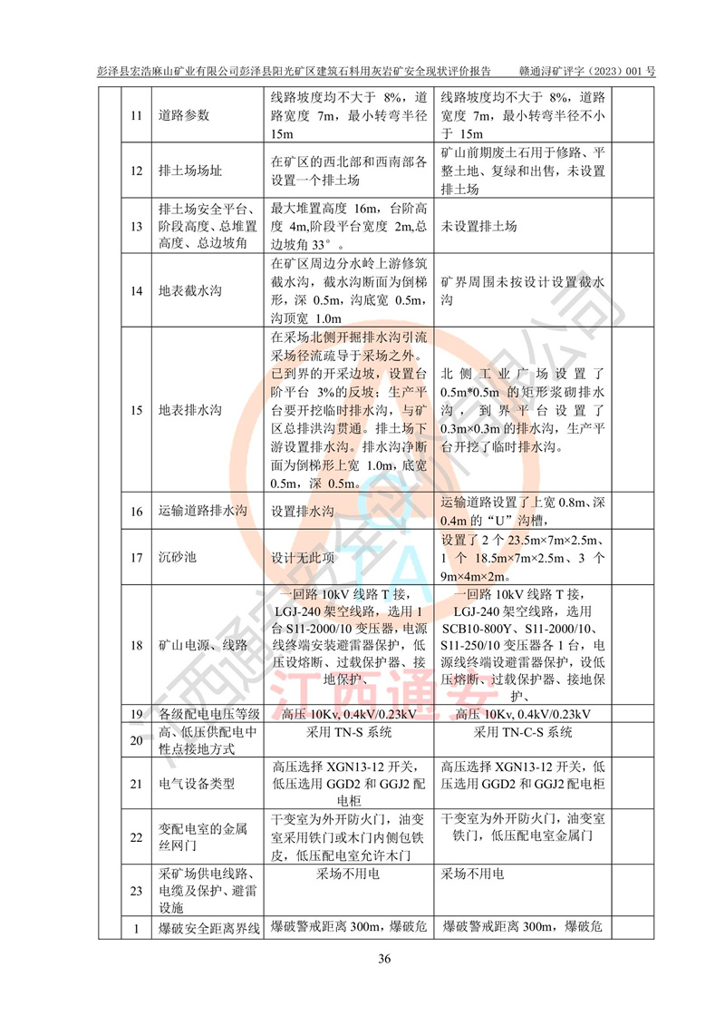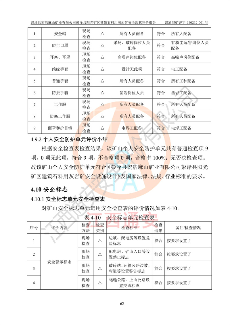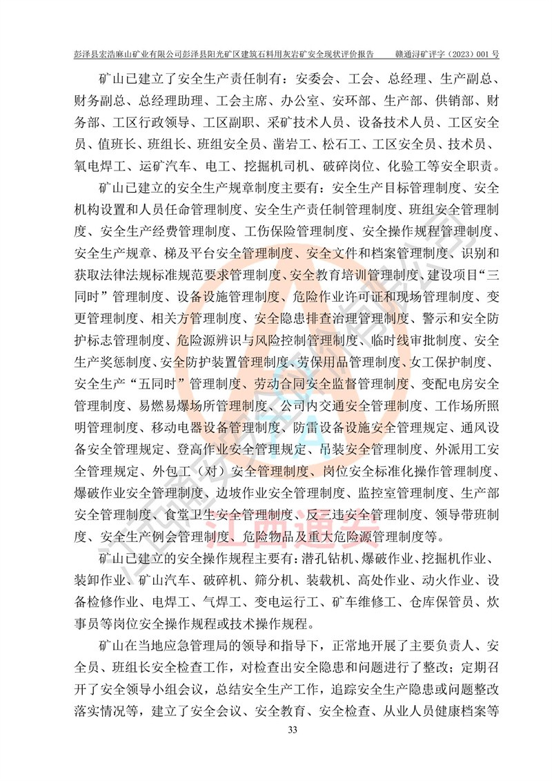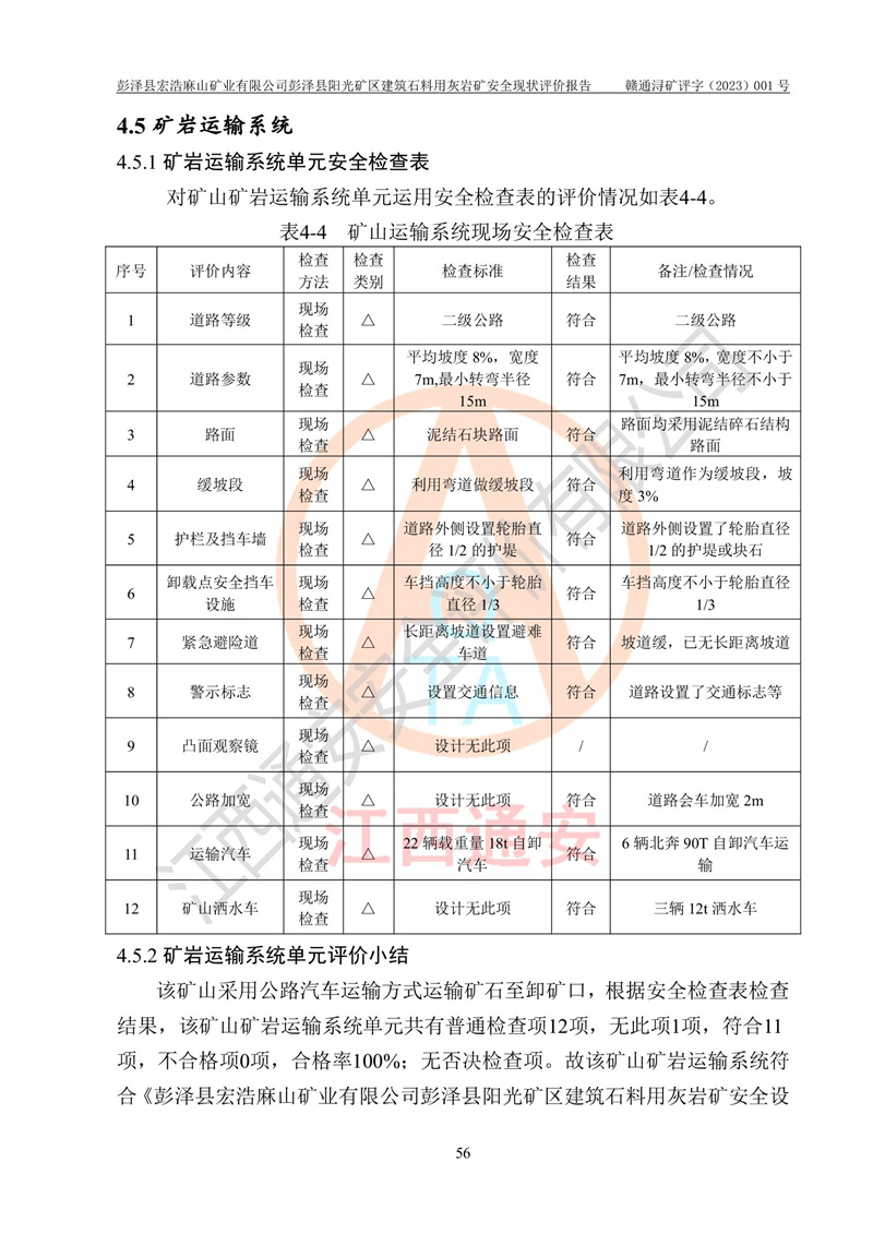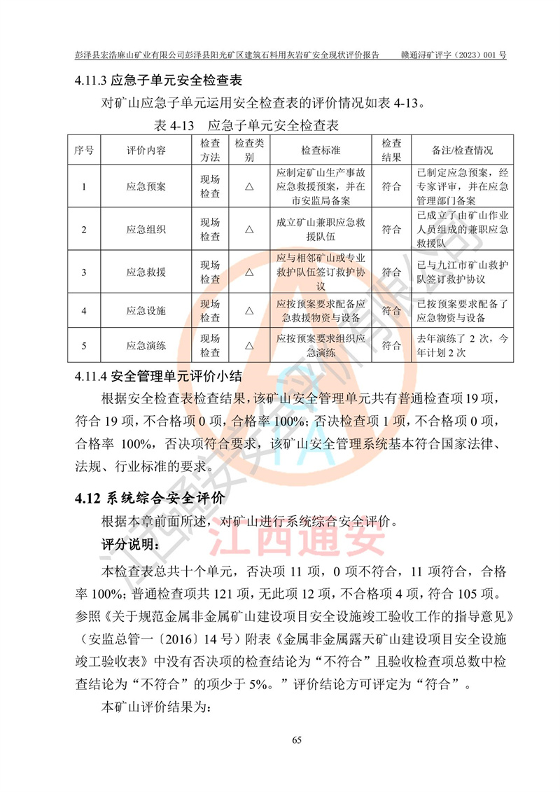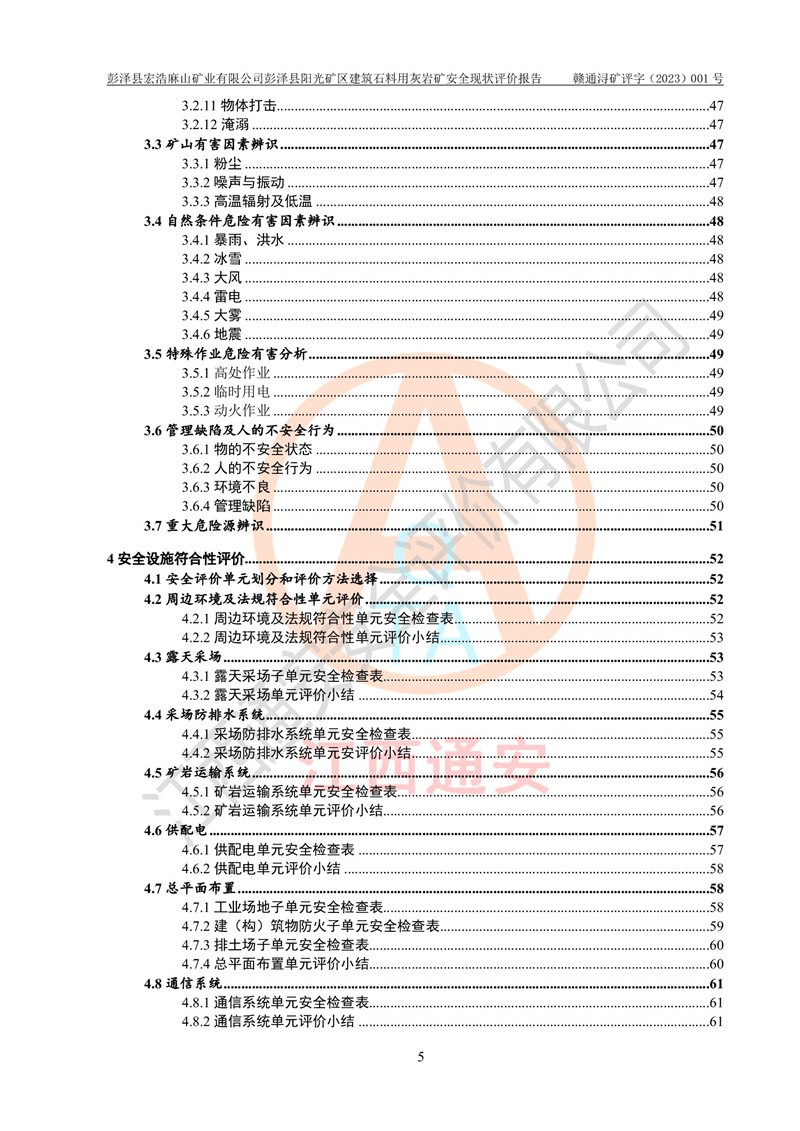 (1)礦山存在火災(zāi)、火藥爆炸、雷管爆炸、放炮、坍塌(滑坡)、泥石流、機(jī)械傷害、容器爆炸、高處墜落、**傷害、觸電與雷擊、物體打擊、淹溺、高低溫、振動(dòng)、粉塵危害等危險(xiǎn)有害因素。礦山無(wú)**礦山安全監(jiān)察局印發(fā)的《金屬非金屬礦山重大生產(chǎn)安全事故隱患判定標(biāo)準(zhǔn)》規(guī)定的重大事故隱患;不構(gòu)成《危險(xiǎn)化學(xué)品重大危險(xiǎn)源辨識(shí)》規(guī)定的重大危險(xiǎn)源。 (2)礦山總體符合《彭澤縣宏浩麻山礦業(yè)有限公司彭澤縣陽(yáng)光礦區(qū)建筑石料用灰?guī)r礦安全設(shè)施設(shè)計(jì)》和**安全生產(chǎn)法律、法規(guī)和行業(yè)標(biāo)準(zhǔn)、規(guī)范的要求。。 (3)礦山應(yīng)重點(diǎn)防范的重大危險(xiǎn)有害因素有:坍塌、放炮、**傷害等。 總體結(jié)論:彭澤縣宏浩麻山礦業(yè)有限公司彭澤縣陽(yáng)光礦區(qū)建筑石料用灰?guī)r礦周邊環(huán)境符合法規(guī)要求;安全設(shè)施總體符合《彭澤縣宏浩麻山礦業(yè)有限公司彭澤縣陽(yáng)光礦區(qū)建筑石料用灰?guī)r礦安全設(shè)施設(shè)計(jì)》的要求,風(fēng)險(xiǎn)可控,滿足安全生產(chǎn)條件。 |