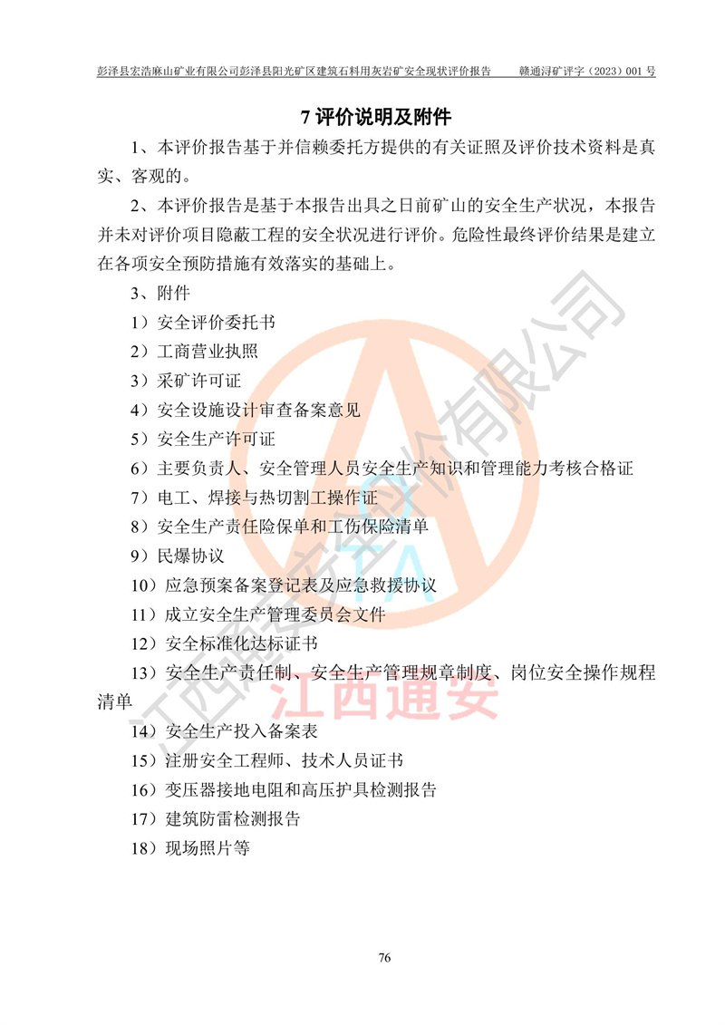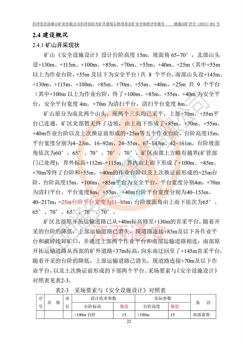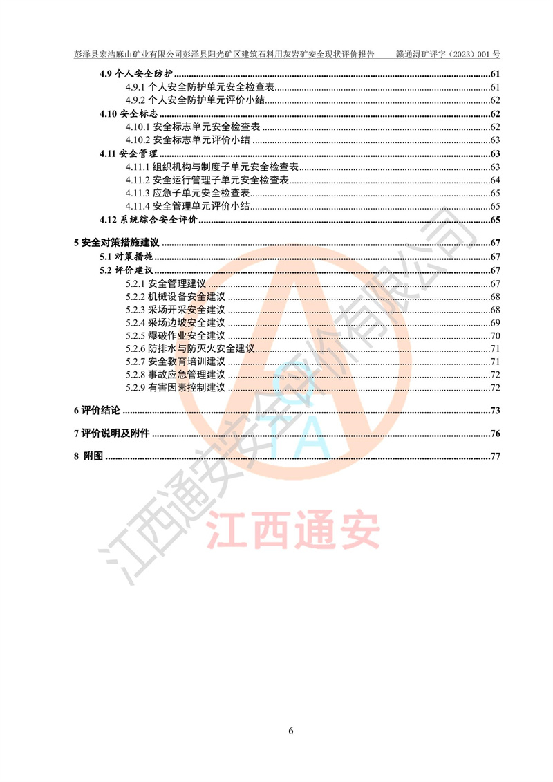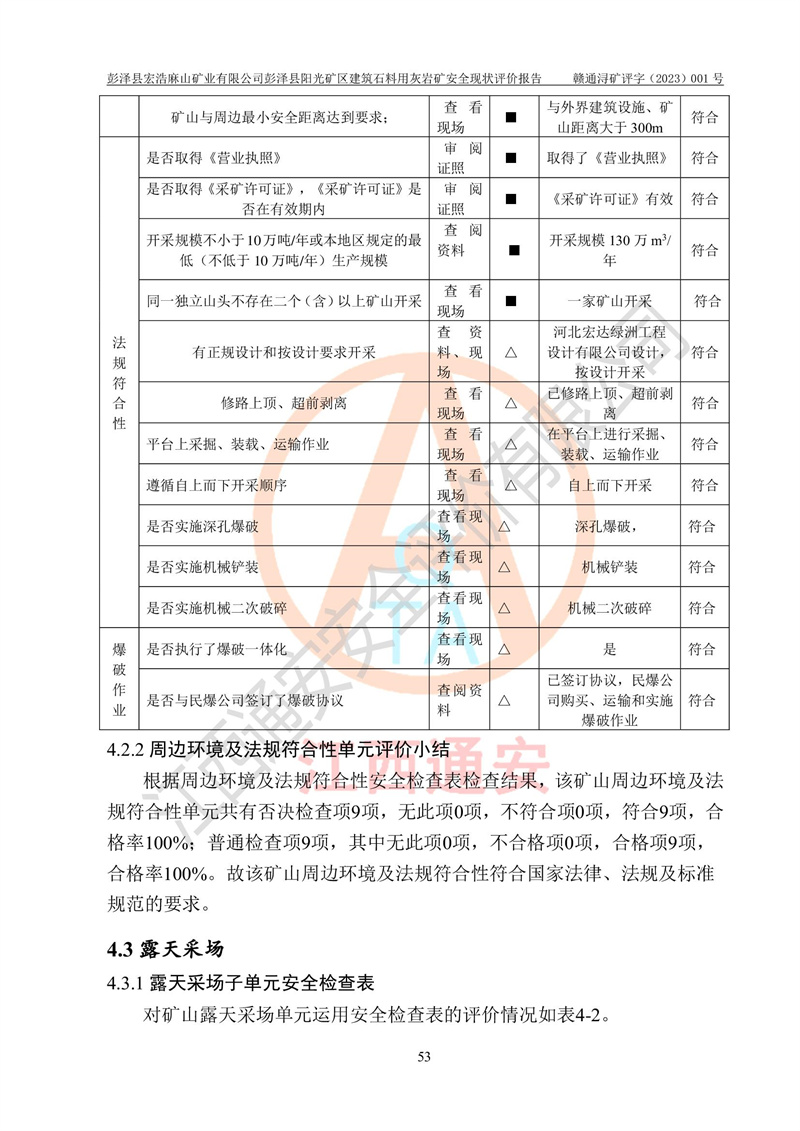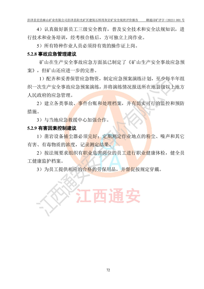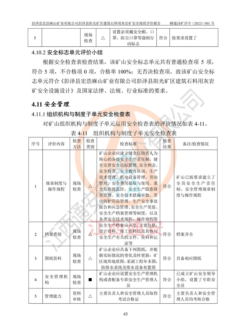 (1)礦山存在火災(zāi)、火藥爆炸、雷管爆炸、放炮、坍塌(滑坡)、泥石流、機(jī)械傷害、容器爆炸、高處墜落、**傷害、觸電與雷擊、物體打擊、淹溺、高低溫、振動(dòng)、粉塵危害等危險(xiǎn)有害因素。礦山無(wú)**礦山安全監(jiān)察局印發(fā)的《金屬非金屬礦山重大生產(chǎn)安全事故隱患判定標(biāo)準(zhǔn)》規(guī)定的重大事故隱患;不構(gòu)成《危險(xiǎn)化學(xué)品重大危險(xiǎn)源辨識(shí)》規(guī)定的重大危險(xiǎn)源。 (2)礦山總體符合《彭澤縣宏浩麻山礦業(yè)有限公司彭澤縣陽(yáng)光礦區(qū)建筑石料用灰?guī)r礦安全設(shè)施設(shè)計(jì)》和**安全生產(chǎn)法律、法規(guī)和行業(yè)標(biāo)準(zhǔn)、規(guī)范的要求。。 (3)礦山應(yīng)重點(diǎn)防范的重大危險(xiǎn)有害因素有:坍塌、放炮、**傷害等。 總體結(jié)論:彭澤縣宏浩麻山礦業(yè)有限公司彭澤縣陽(yáng)光礦區(qū)建筑石料用灰?guī)r礦周邊環(huán)境符合法規(guī)要求;安全設(shè)施總體符合《彭澤縣宏浩麻山礦業(yè)有限公司彭澤縣陽(yáng)光礦區(qū)建筑石料用灰?guī)r礦安全設(shè)施設(shè)計(jì)》的要求,風(fēng)險(xiǎn)可控,滿足安全生產(chǎn)條件。 |