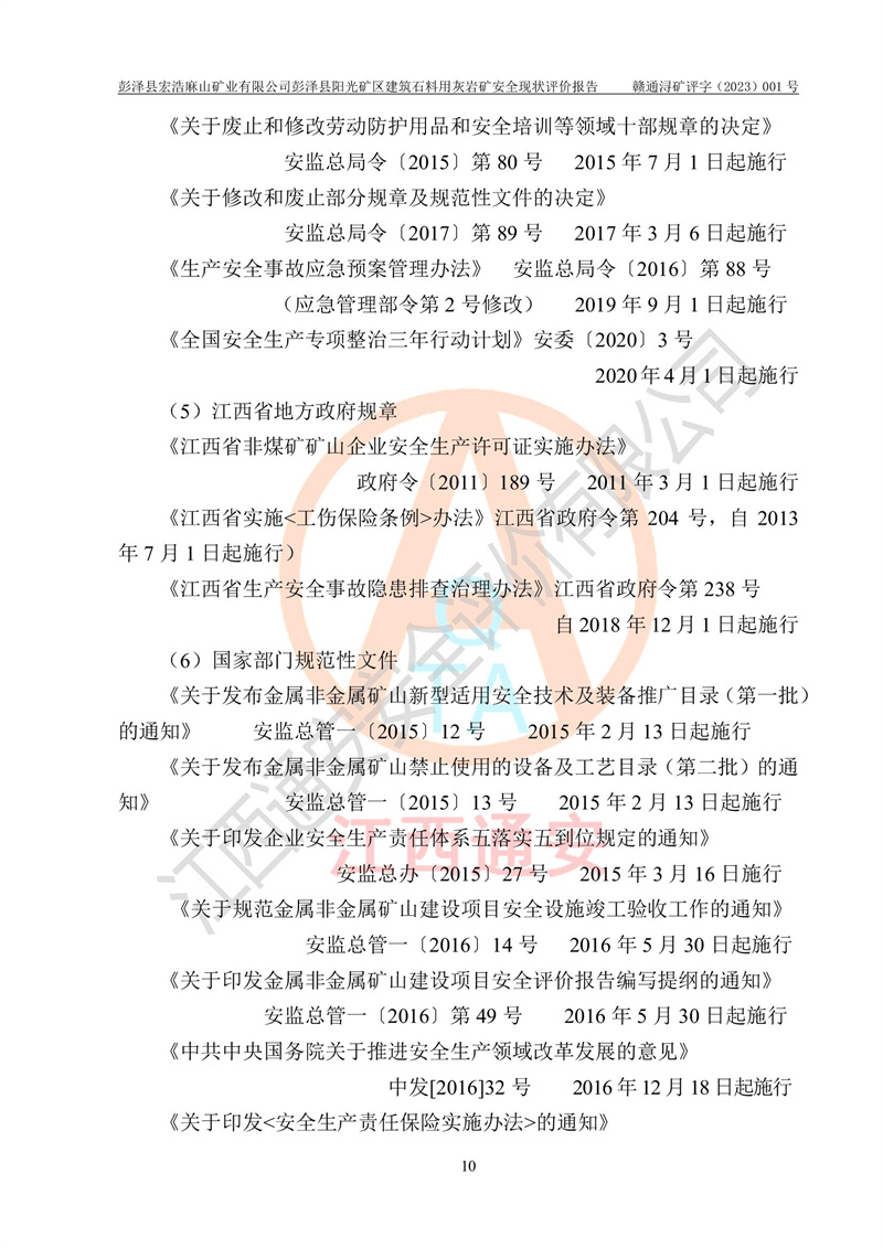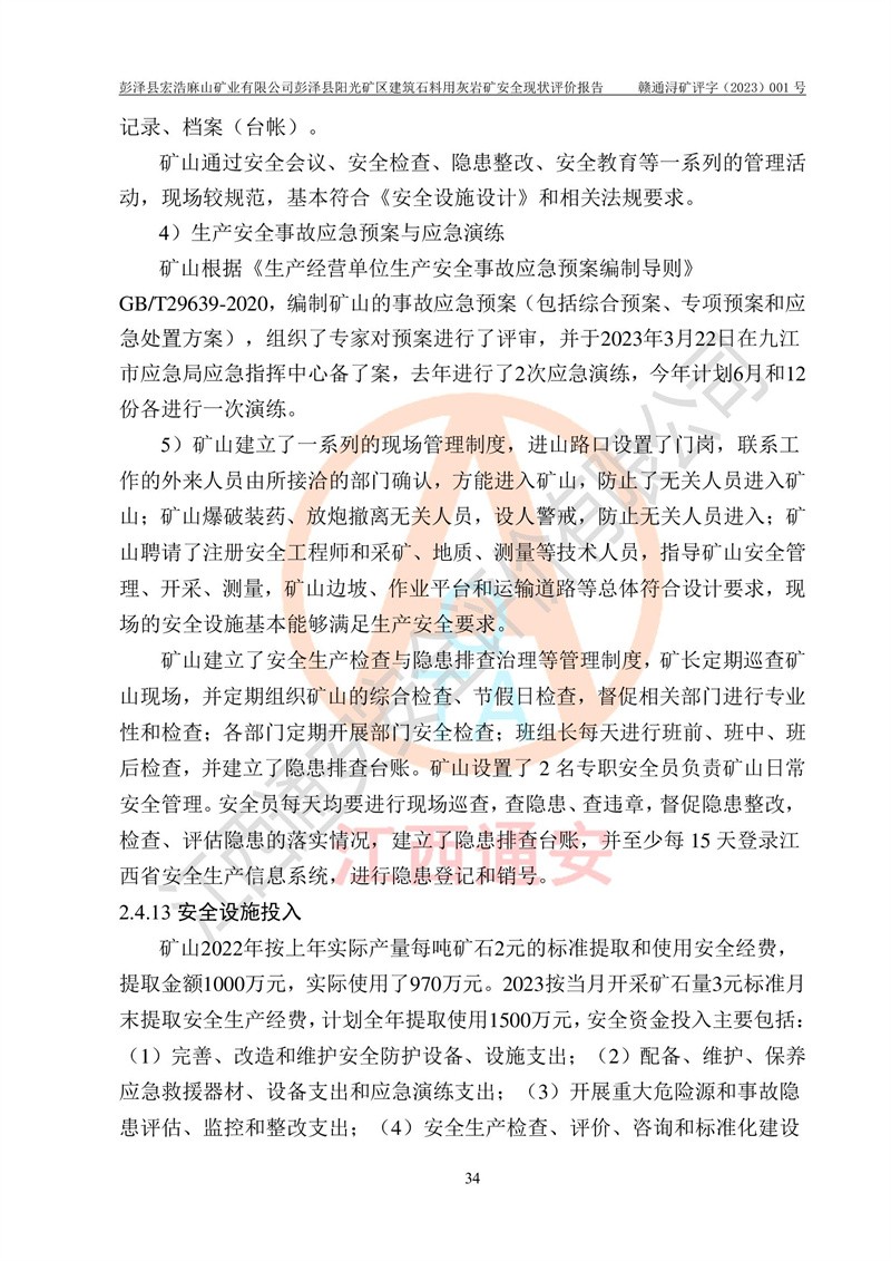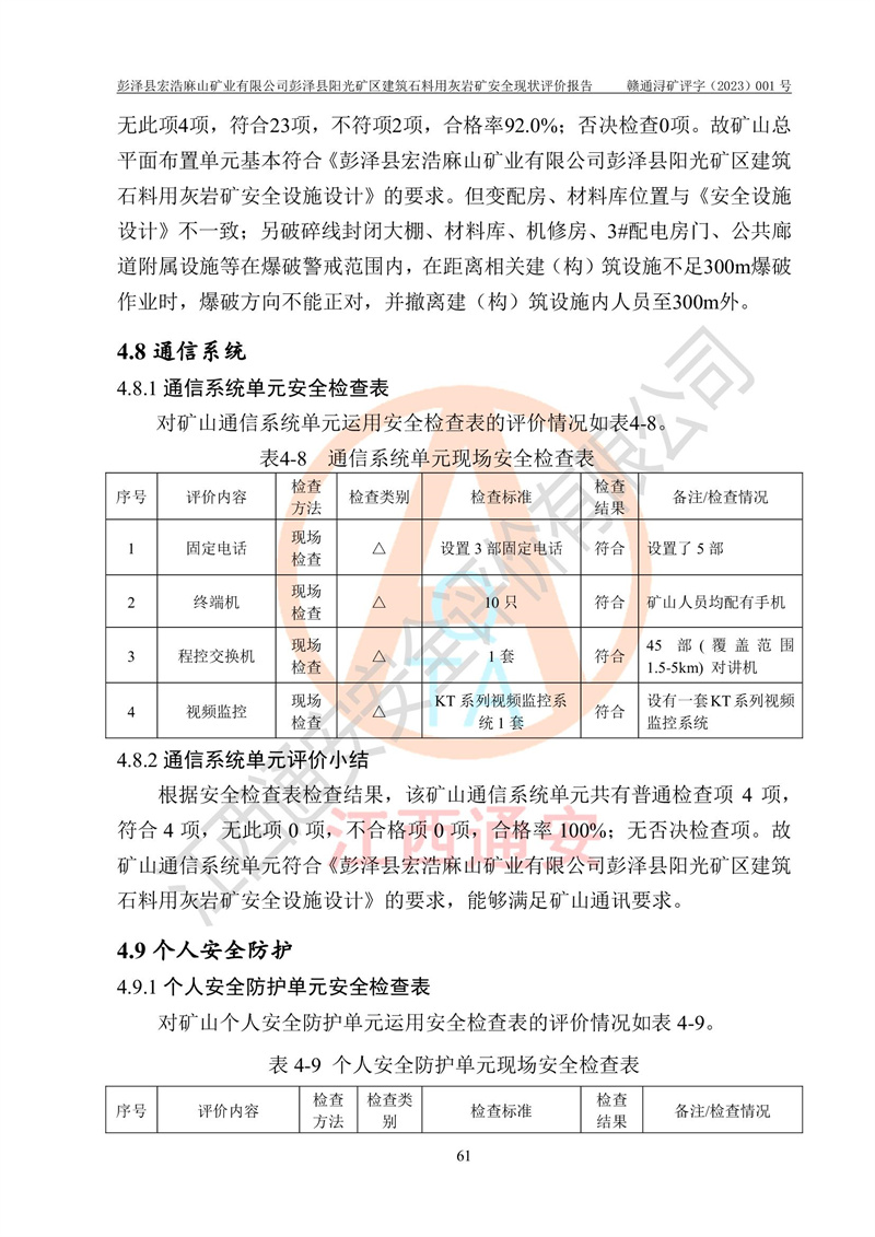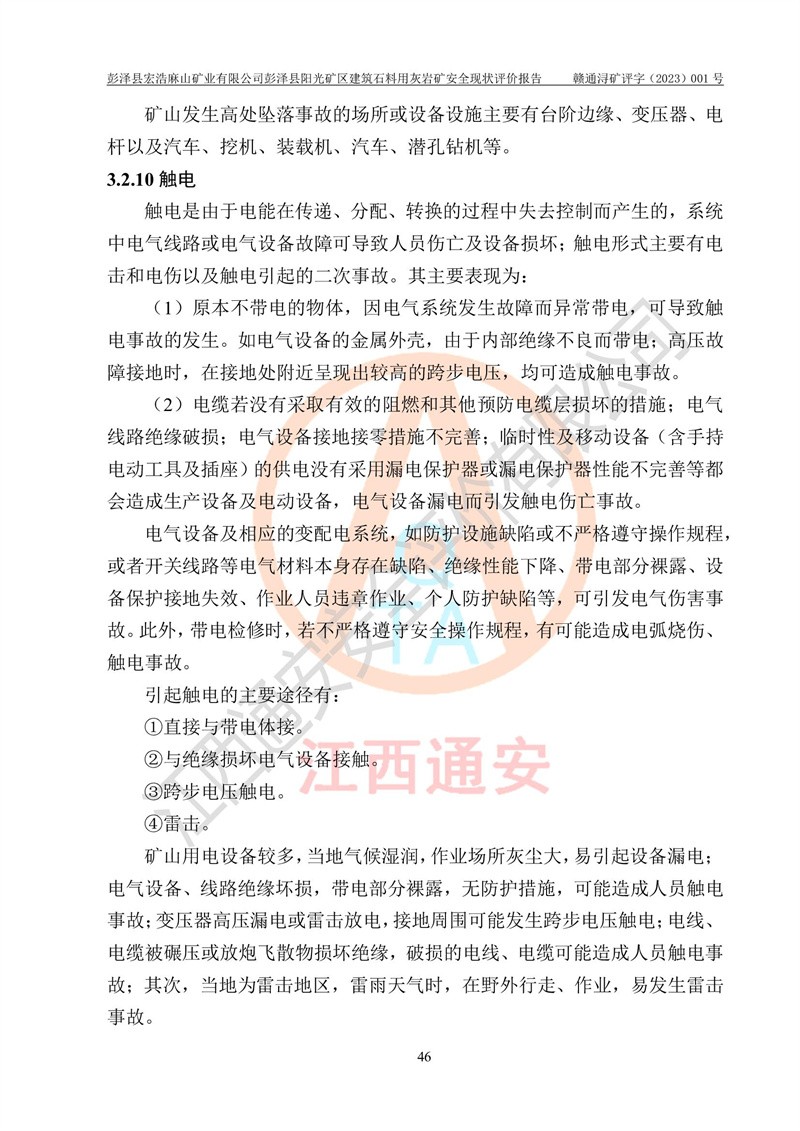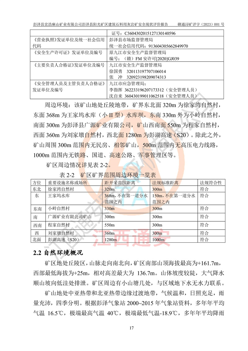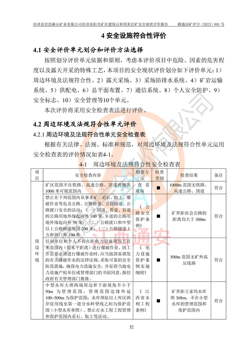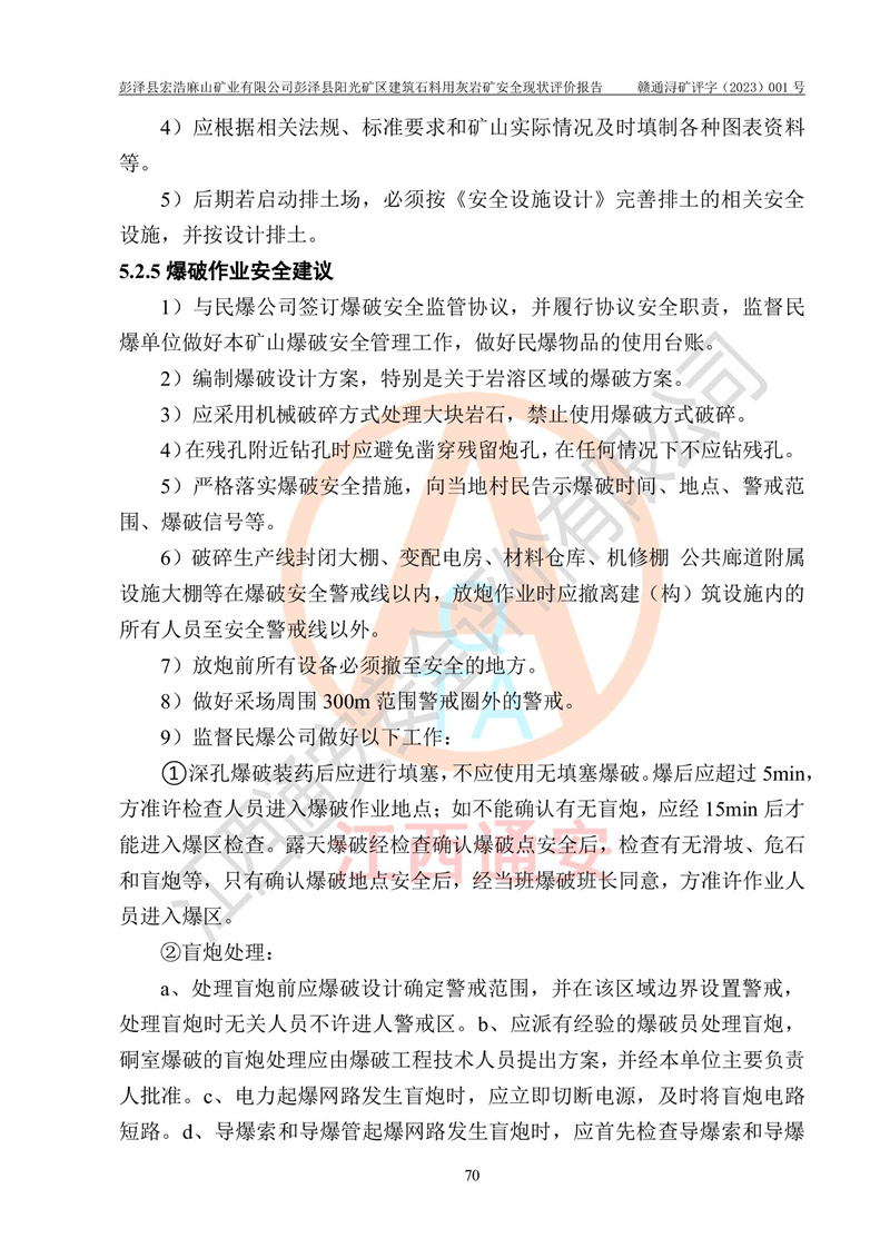 (1)礦山存在火災(zāi)、火藥爆炸、雷管爆炸、放炮、坍塌(滑坡)、泥石流、機(jī)械傷害、容器爆炸、高處墜落、**傷害、觸電與雷擊、物體打擊、淹溺、高低溫、振動(dòng)、粉塵危害等危險(xiǎn)有害因素。礦山無(wú)**礦山安全監(jiān)察局印發(fā)的《金屬非金屬礦山重大生產(chǎn)安全事故隱患判定標(biāo)準(zhǔn)》規(guī)定的重大事故隱患;不構(gòu)成《危險(xiǎn)化學(xué)品重大危險(xiǎn)源辨識(shí)》規(guī)定的重大危險(xiǎn)源。 (2)礦山總體符合《彭澤縣宏浩麻山礦業(yè)有限公司彭澤縣陽(yáng)光礦區(qū)建筑石料用灰?guī)r礦安全設(shè)施設(shè)計(jì)》和**安全生產(chǎn)法律、法規(guī)和行業(yè)標(biāo)準(zhǔn)、規(guī)范的要求。。 (3)礦山應(yīng)重點(diǎn)防范的重大危險(xiǎn)有害因素有:坍塌、放炮、**傷害等。 總體結(jié)論:彭澤縣宏浩麻山礦業(yè)有限公司彭澤縣陽(yáng)光礦區(qū)建筑石料用灰?guī)r礦周邊環(huán)境符合法規(guī)要求;安全設(shè)施總體符合《彭澤縣宏浩麻山礦業(yè)有限公司彭澤縣陽(yáng)光礦區(qū)建筑石料用灰?guī)r礦安全設(shè)施設(shè)計(jì)》的要求,風(fēng)險(xiǎn)可控,滿足安全生產(chǎn)條件。 |