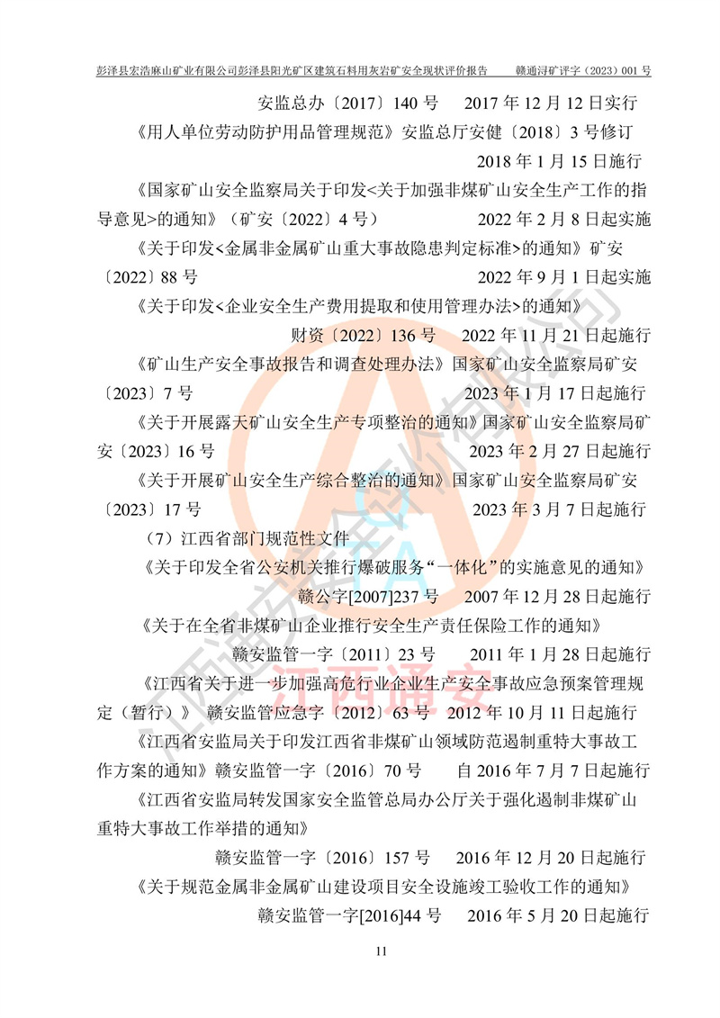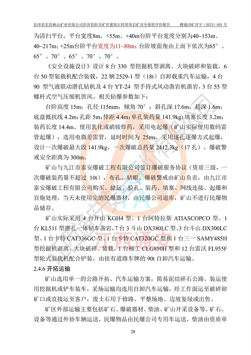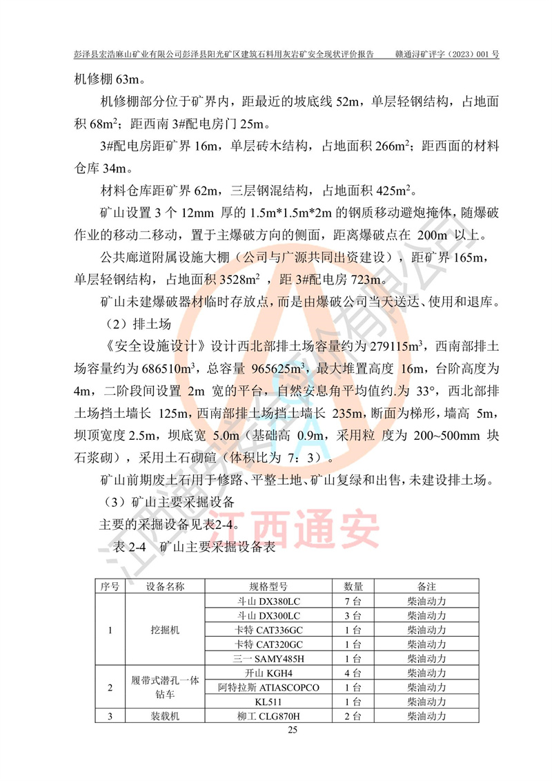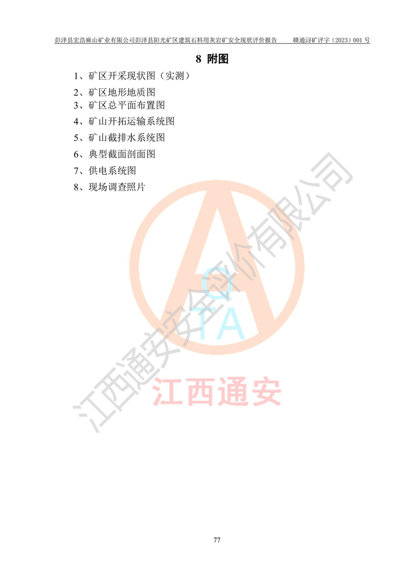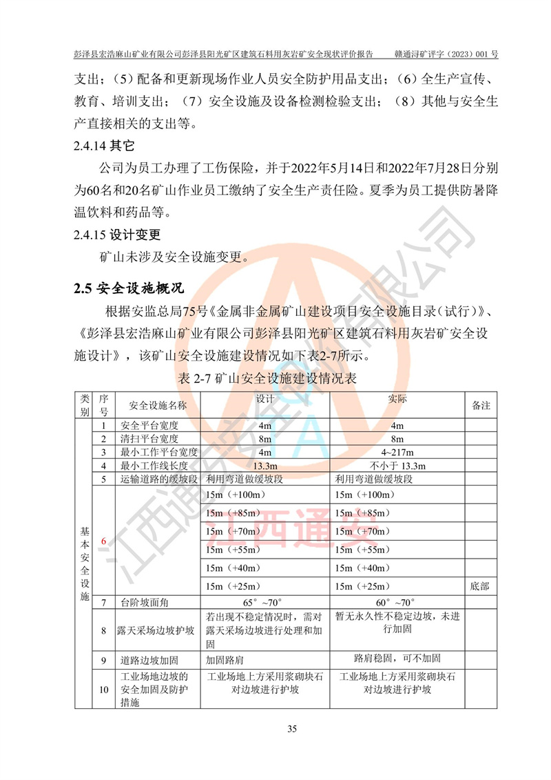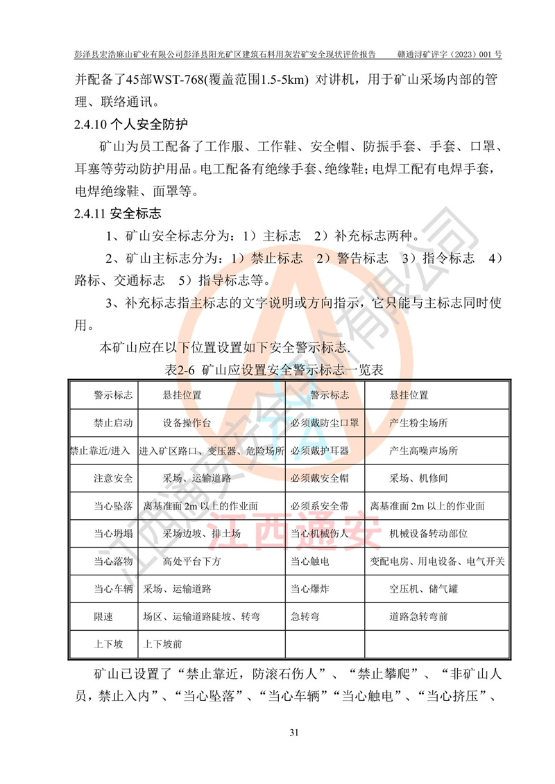 (1)礦山存在火災(zāi)、火藥爆炸、雷管爆炸、放炮、坍塌(滑坡)、泥石流、機(jī)械傷害、容器爆炸、高處墜落、**傷害、觸電與雷擊、物體打擊、淹溺、高低溫、振動(dòng)、粉塵危害等危險(xiǎn)有害因素。礦山無(wú)**礦山安全監(jiān)察局印發(fā)的《金屬非金屬礦山重大生產(chǎn)安全事故隱患判定標(biāo)準(zhǔn)》規(guī)定的重大事故隱患;不構(gòu)成《危險(xiǎn)化學(xué)品重大危險(xiǎn)源辨識(shí)》規(guī)定的重大危險(xiǎn)源。 (2)礦山總體符合《彭澤縣宏浩麻山礦業(yè)有限公司彭澤縣陽(yáng)光礦區(qū)建筑石料用灰?guī)r礦安全設(shè)施設(shè)計(jì)》和**安全生產(chǎn)法律、法規(guī)和行業(yè)標(biāo)準(zhǔn)、規(guī)范的要求。。 (3)礦山應(yīng)重點(diǎn)防范的重大危險(xiǎn)有害因素有:坍塌、放炮、**傷害等。 總體結(jié)論:彭澤縣宏浩麻山礦業(yè)有限公司彭澤縣陽(yáng)光礦區(qū)建筑石料用灰?guī)r礦周邊環(huán)境符合法規(guī)要求;安全設(shè)施總體符合《彭澤縣宏浩麻山礦業(yè)有限公司彭澤縣陽(yáng)光礦區(qū)建筑石料用灰?guī)r礦安全設(shè)施設(shè)計(jì)》的要求,風(fēng)險(xiǎn)可控,滿足安全生產(chǎn)條件。 |