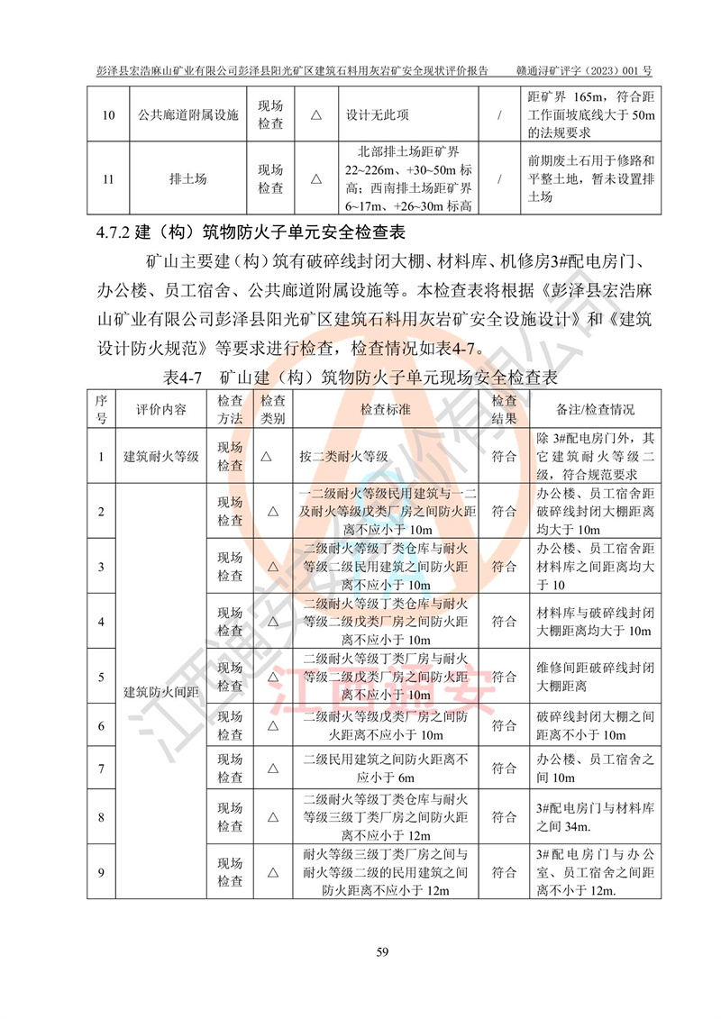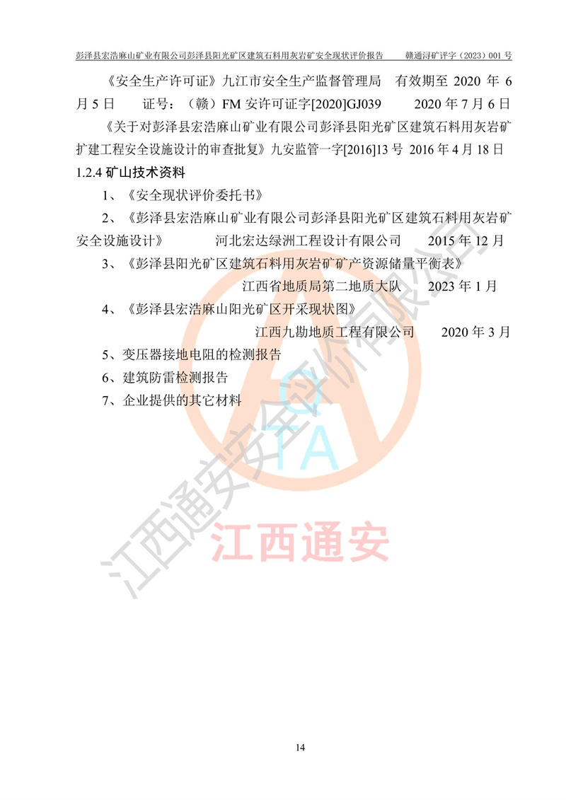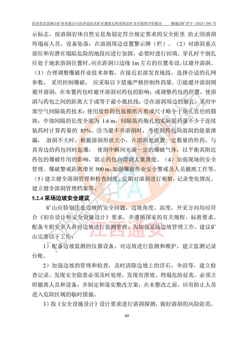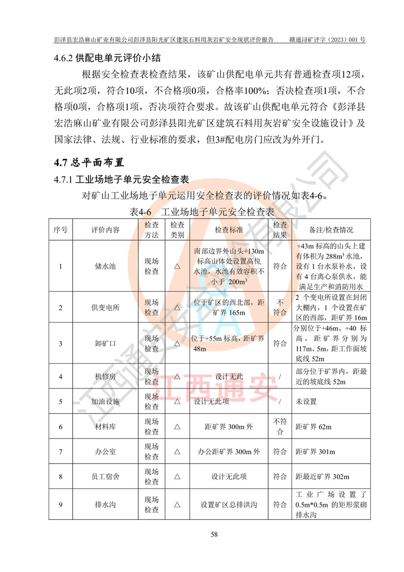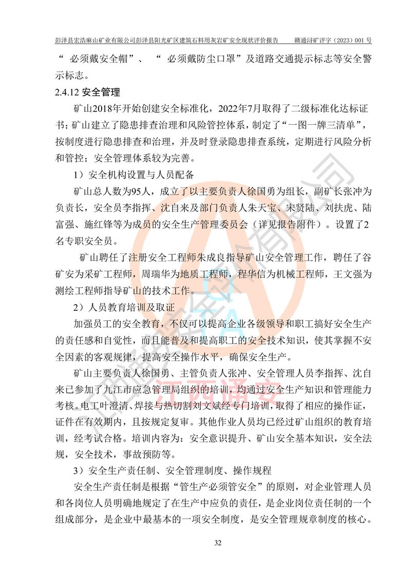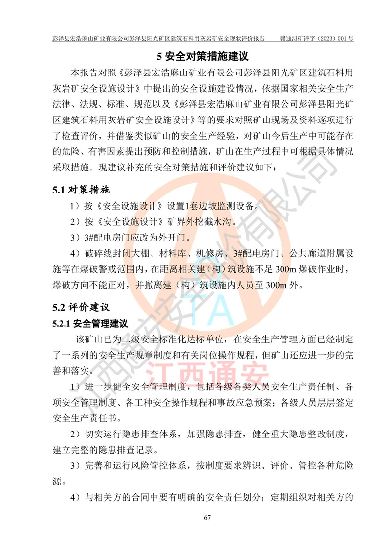 (1)礦山存在火災(zāi)、火藥爆炸、雷管爆炸、放炮、坍塌(滑坡)、泥石流、機(jī)械傷害、容器爆炸、高處墜落、**傷害、觸電與雷擊、物體打擊、淹溺、高低溫、振動(dòng)、粉塵危害等危險(xiǎn)有害因素。礦山無(wú)**礦山安全監(jiān)察局印發(fā)的《金屬非金屬礦山重大生產(chǎn)安全事故隱患判定標(biāo)準(zhǔn)》規(guī)定的重大事故隱患;不構(gòu)成《危險(xiǎn)化學(xué)品重大危險(xiǎn)源辨識(shí)》規(guī)定的重大危險(xiǎn)源。 (2)礦山總體符合《彭澤縣宏浩麻山礦業(yè)有限公司彭澤縣陽(yáng)光礦區(qū)建筑石料用灰?guī)r礦安全設(shè)施設(shè)計(jì)》和**安全生產(chǎn)法律、法規(guī)和行業(yè)標(biāo)準(zhǔn)、規(guī)范的要求。。 (3)礦山應(yīng)重點(diǎn)防范的重大危險(xiǎn)有害因素有:坍塌、放炮、**傷害等。 總體結(jié)論:彭澤縣宏浩麻山礦業(yè)有限公司彭澤縣陽(yáng)光礦區(qū)建筑石料用灰?guī)r礦周邊環(huán)境符合法規(guī)要求;安全設(shè)施總體符合《彭澤縣宏浩麻山礦業(yè)有限公司彭澤縣陽(yáng)光礦區(qū)建筑石料用灰?guī)r礦安全設(shè)施設(shè)計(jì)》的要求,風(fēng)險(xiǎn)可控,滿足安全生產(chǎn)條件。 |
