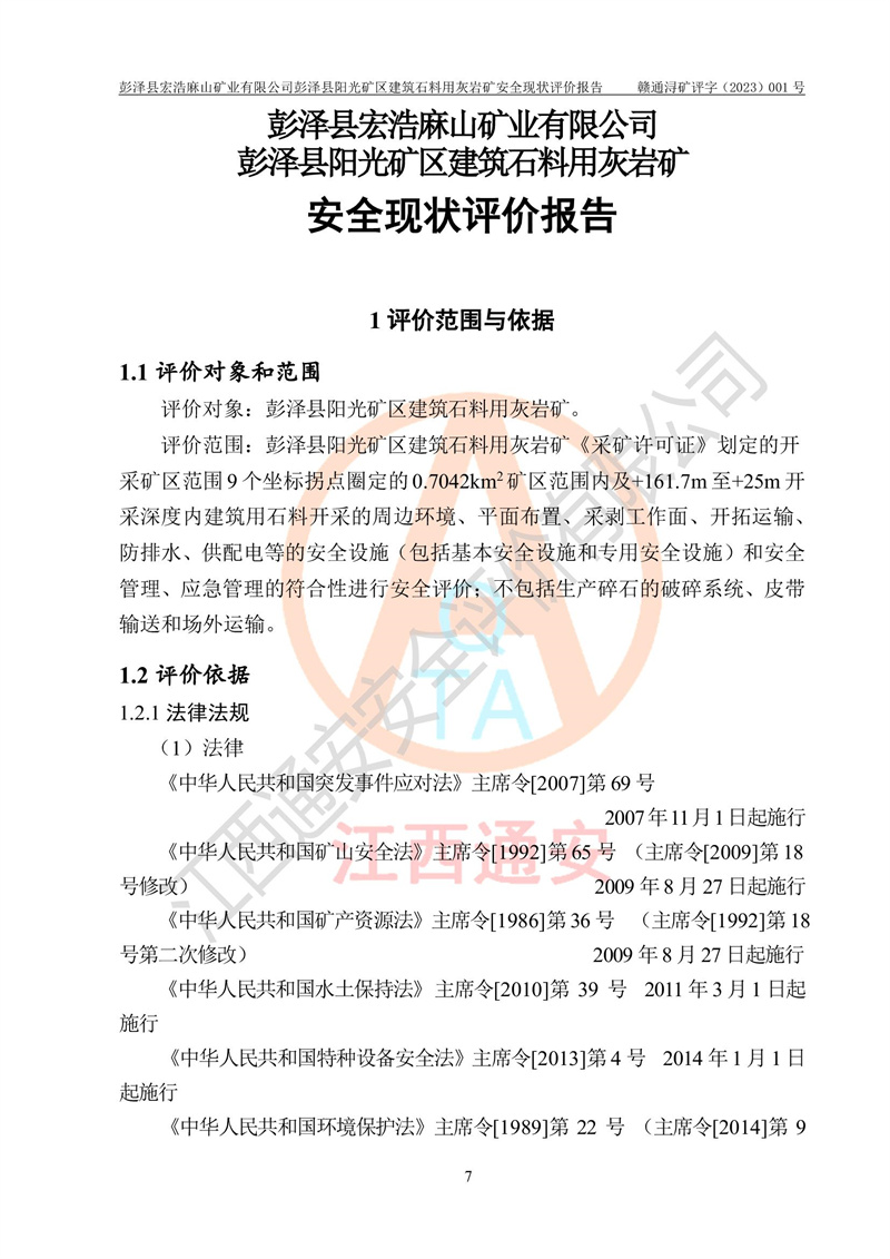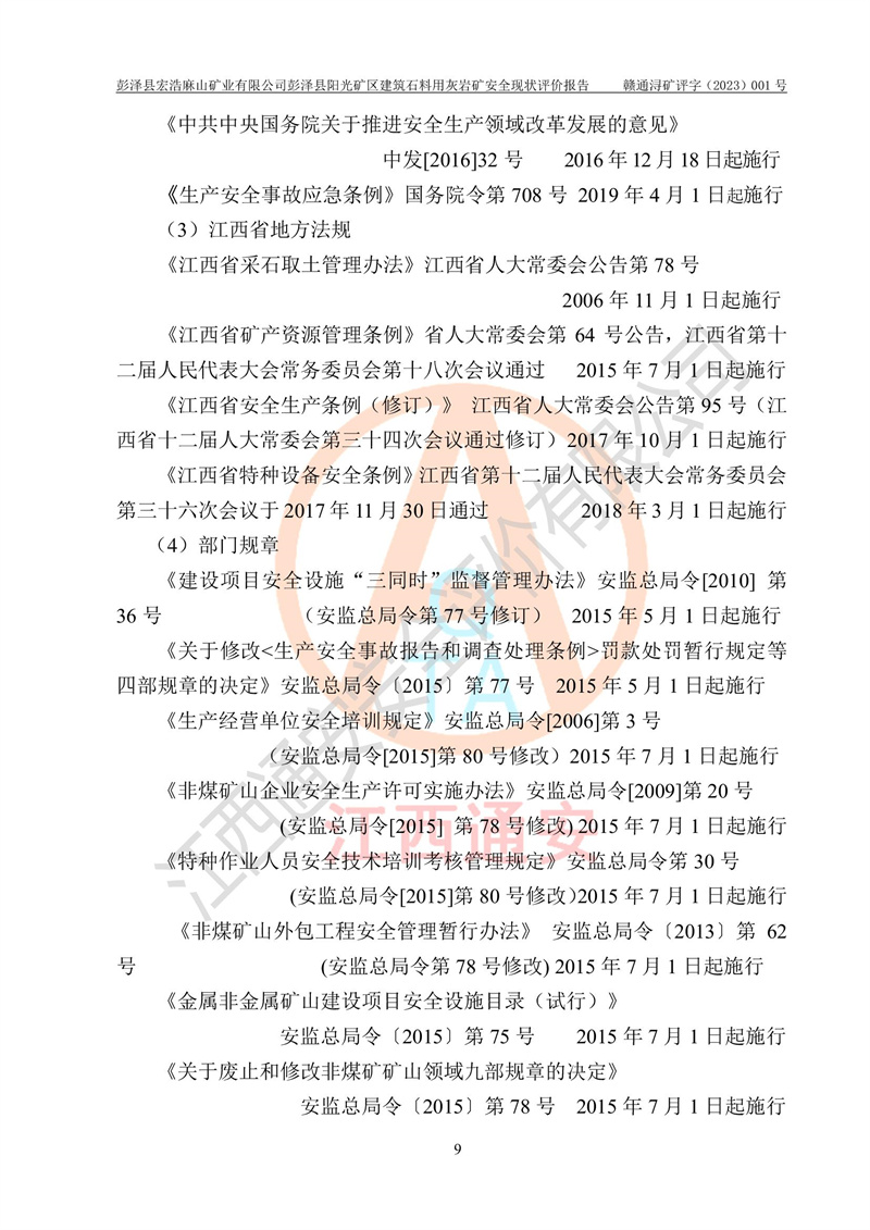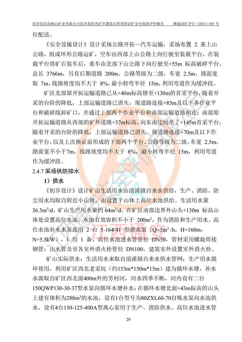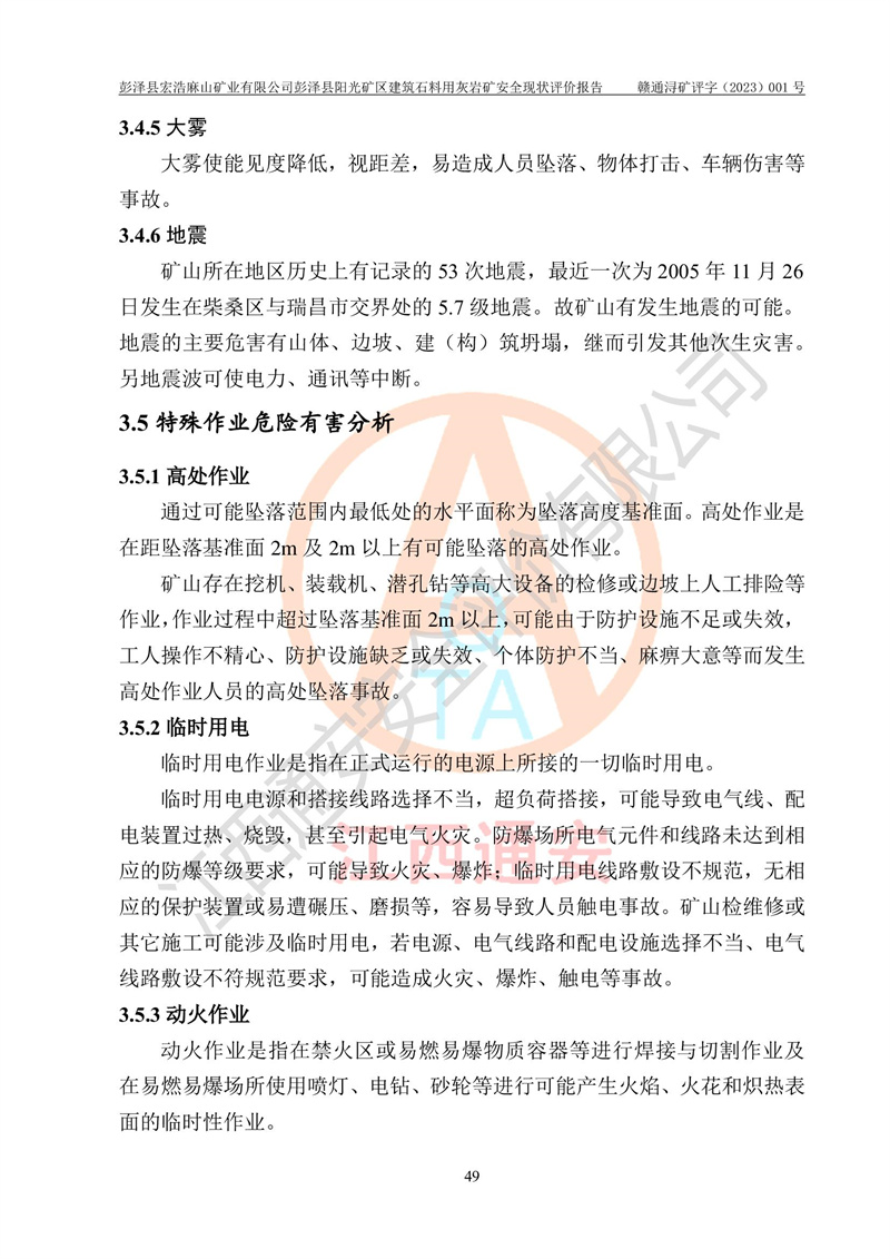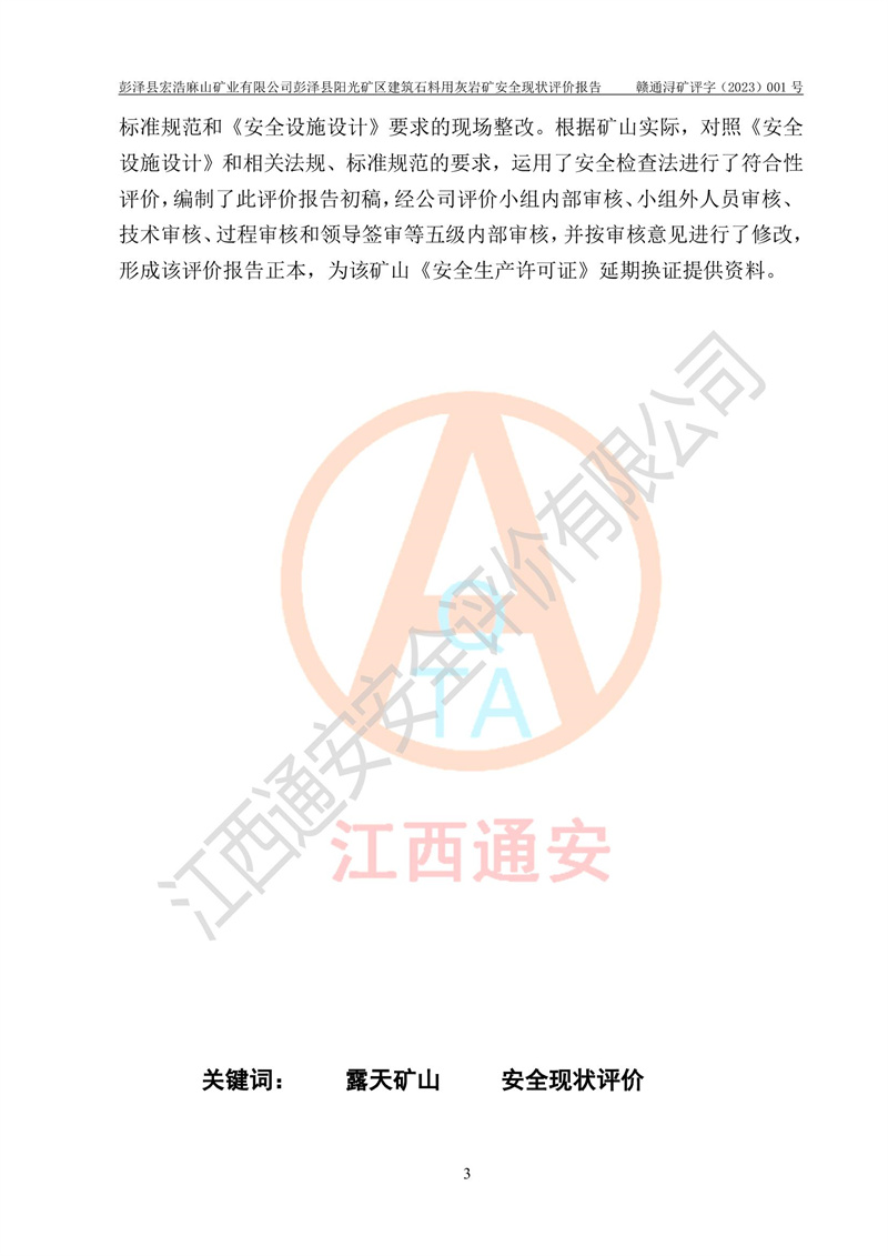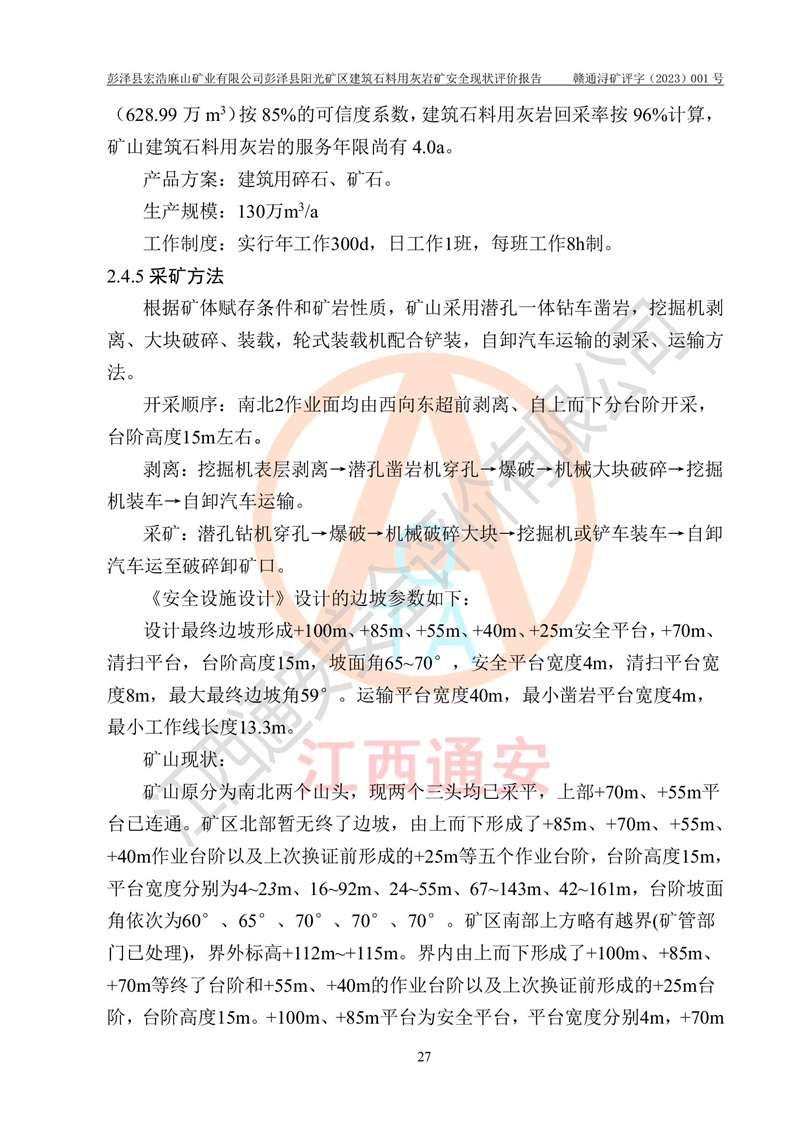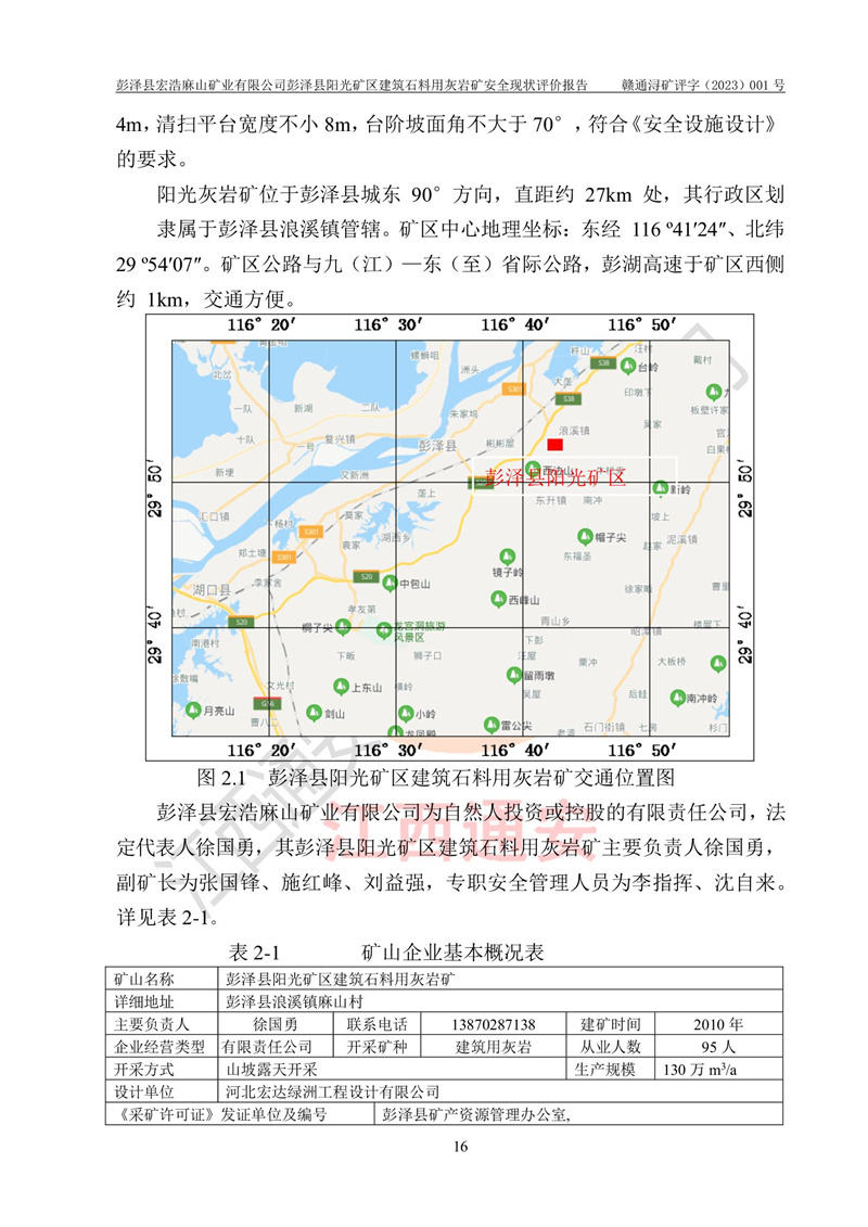 (1)礦山存在火災(zāi)、火藥爆炸、雷管爆炸、放炮、坍塌(滑坡)、泥石流、機(jī)械傷害、容器爆炸、高處墜落、**傷害、觸電與雷擊、物體打擊、淹溺、高低溫、振動(dòng)、粉塵危害等危險(xiǎn)有害因素。礦山無(wú)**礦山安全監(jiān)察局印發(fā)的《金屬非金屬礦山重大生產(chǎn)安全事故隱患判定標(biāo)準(zhǔn)》規(guī)定的重大事故隱患;不構(gòu)成《危險(xiǎn)化學(xué)品重大危險(xiǎn)源辨識(shí)》規(guī)定的重大危險(xiǎn)源。 (2)礦山總體符合《彭澤縣宏浩麻山礦業(yè)有限公司彭澤縣陽(yáng)光礦區(qū)建筑石料用灰?guī)r礦安全設(shè)施設(shè)計(jì)》和**安全生產(chǎn)法律、法規(guī)和行業(yè)標(biāo)準(zhǔn)、規(guī)范的要求。。 (3)礦山應(yīng)重點(diǎn)防范的重大危險(xiǎn)有害因素有:坍塌、放炮、**傷害等。 總體結(jié)論:彭澤縣宏浩麻山礦業(yè)有限公司彭澤縣陽(yáng)光礦區(qū)建筑石料用灰?guī)r礦周邊環(huán)境符合法規(guī)要求;安全設(shè)施總體符合《彭澤縣宏浩麻山礦業(yè)有限公司彭澤縣陽(yáng)光礦區(qū)建筑石料用灰?guī)r礦安全設(shè)施設(shè)計(jì)》的要求,風(fēng)險(xiǎn)可控,滿足安全生產(chǎn)條件。 |