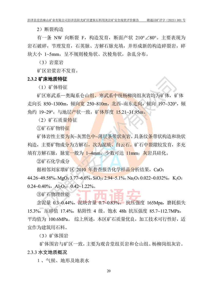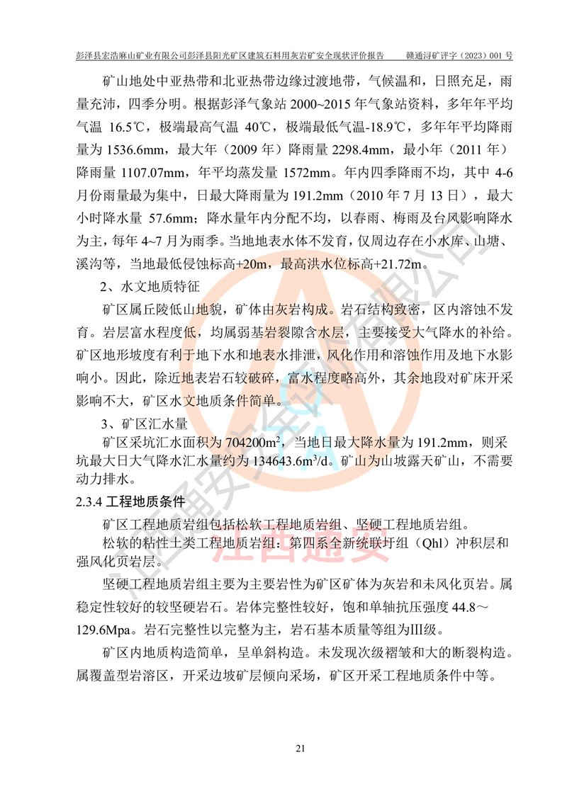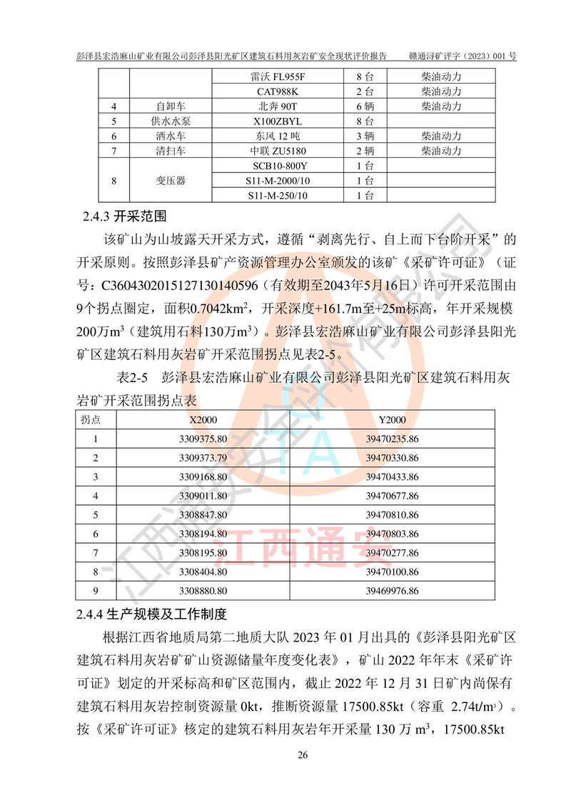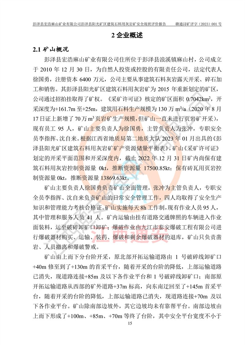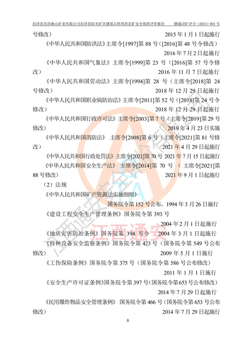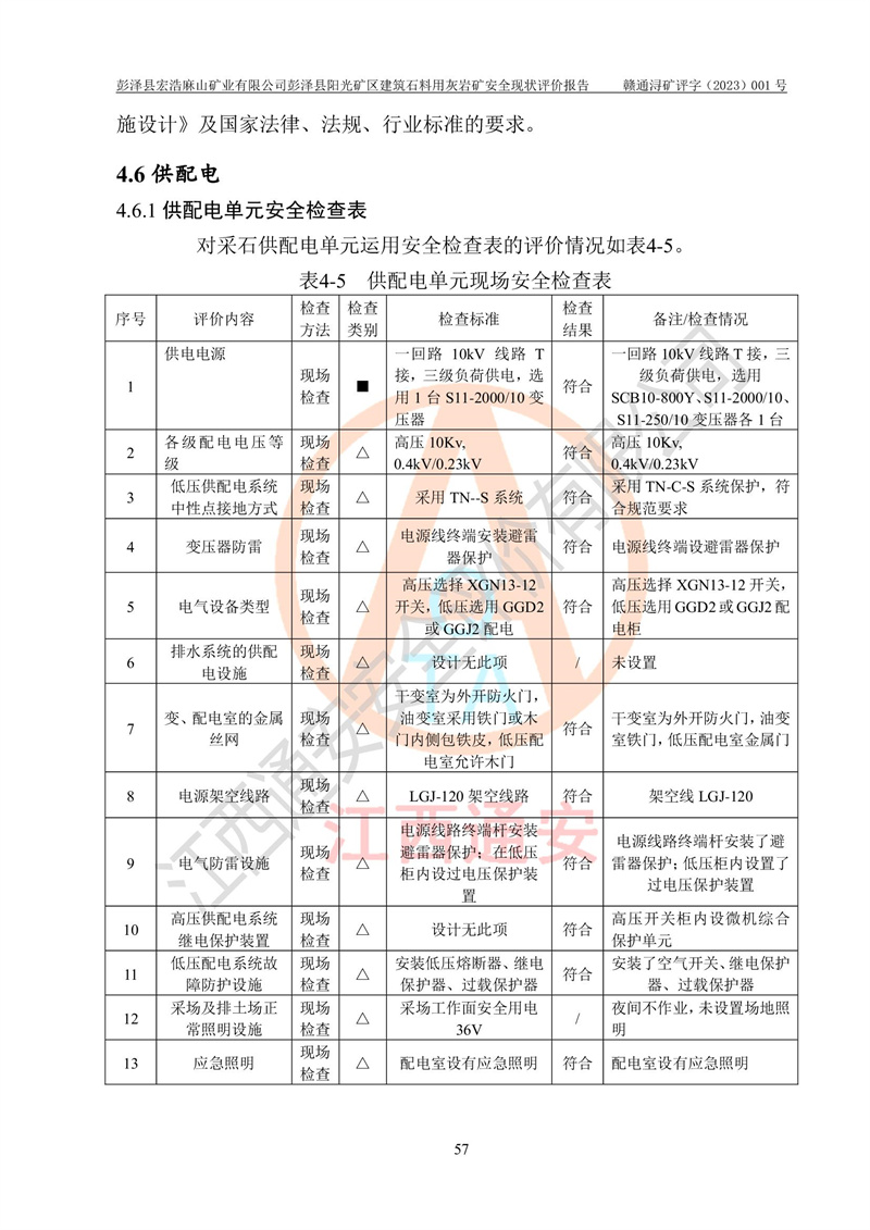 (1)礦山存在火災(zāi)、火藥爆炸、雷管爆炸、放炮、坍塌(滑坡)、泥石流、機(jī)械傷害、容器爆炸、高處墜落、**傷害、觸電與雷擊、物體打擊、淹溺、高低溫、振動(dòng)、粉塵危害等危險(xiǎn)有害因素。礦山無(wú)**礦山安全監(jiān)察局印發(fā)的《金屬非金屬礦山重大生產(chǎn)安全事故隱患判定標(biāo)準(zhǔn)》規(guī)定的重大事故隱患;不構(gòu)成《危險(xiǎn)化學(xué)品重大危險(xiǎn)源辨識(shí)》規(guī)定的重大危險(xiǎn)源。 (2)礦山總體符合《彭澤縣宏浩麻山礦業(yè)有限公司彭澤縣陽(yáng)光礦區(qū)建筑石料用灰?guī)r礦安全設(shè)施設(shè)計(jì)》和**安全生產(chǎn)法律、法規(guī)和行業(yè)標(biāo)準(zhǔn)、規(guī)范的要求。。 (3)礦山應(yīng)重點(diǎn)防范的重大危險(xiǎn)有害因素有:坍塌、放炮、**傷害等。 總體結(jié)論:彭澤縣宏浩麻山礦業(yè)有限公司彭澤縣陽(yáng)光礦區(qū)建筑石料用灰?guī)r礦周邊環(huán)境符合法規(guī)要求;安全設(shè)施總體符合《彭澤縣宏浩麻山礦業(yè)有限公司彭澤縣陽(yáng)光礦區(qū)建筑石料用灰?guī)r礦安全設(shè)施設(shè)計(jì)》的要求,風(fēng)險(xiǎn)可控,滿足安全生產(chǎn)條件。 |