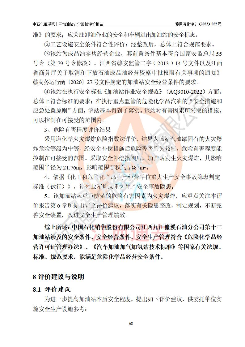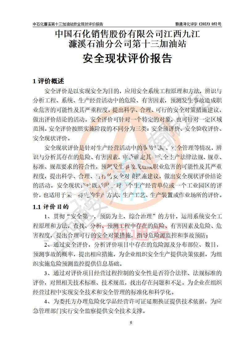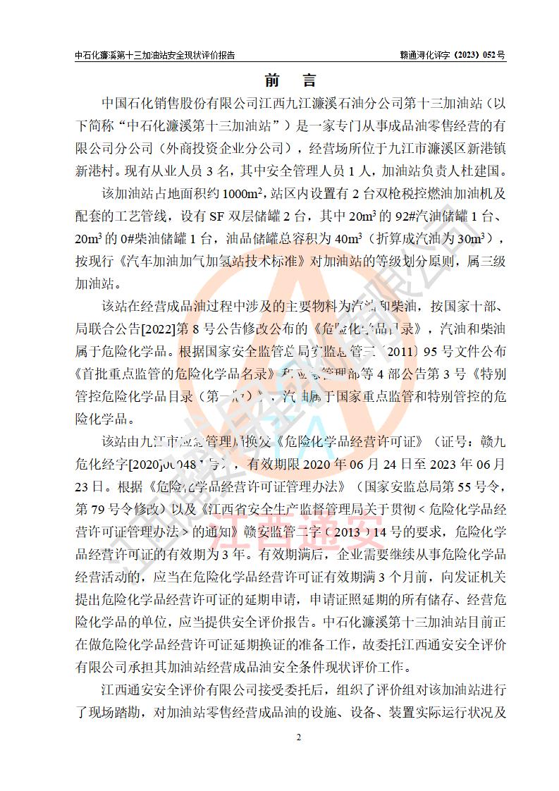 評價報告名稱 | 中國石化銷售股份有限公司江西九江濂溪石油分公司第十三加油站安全現(xiàn)狀評價報告 | |||