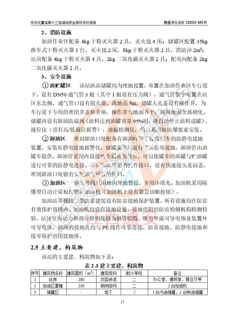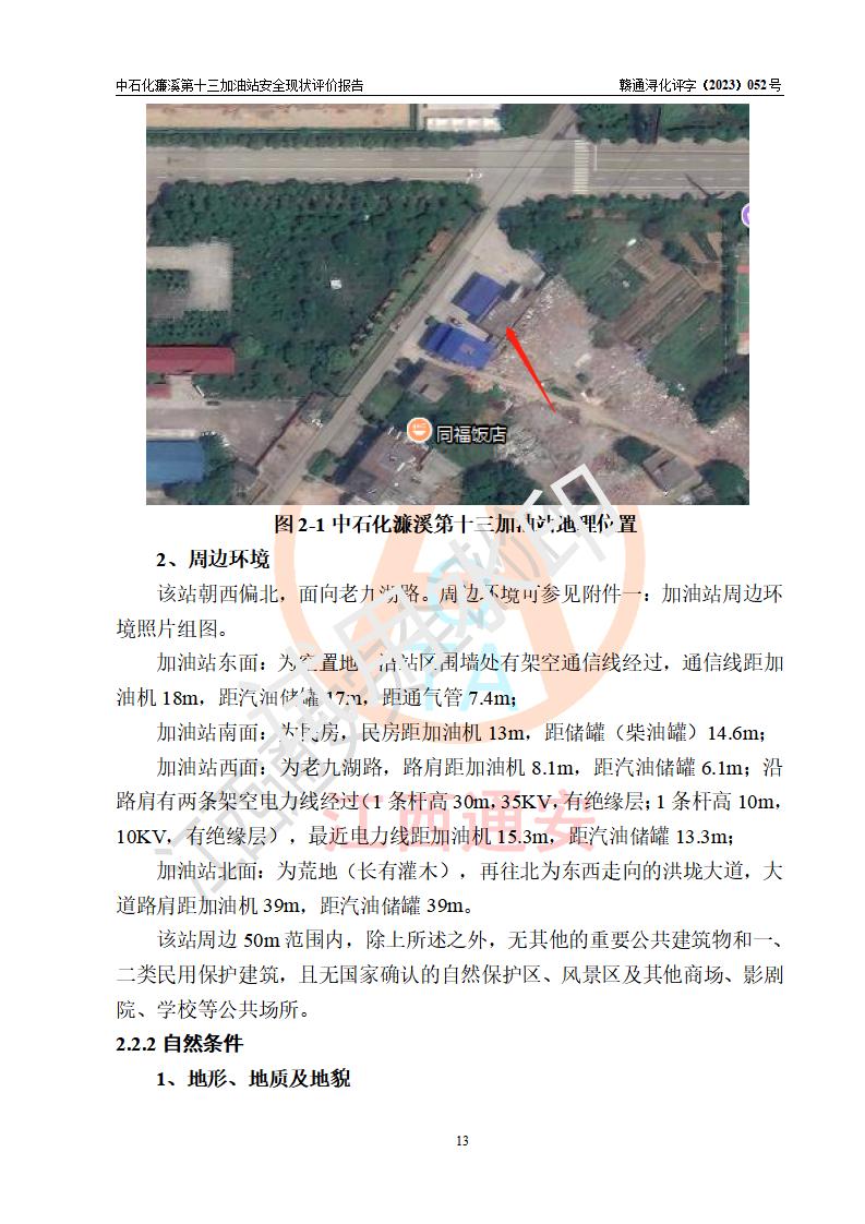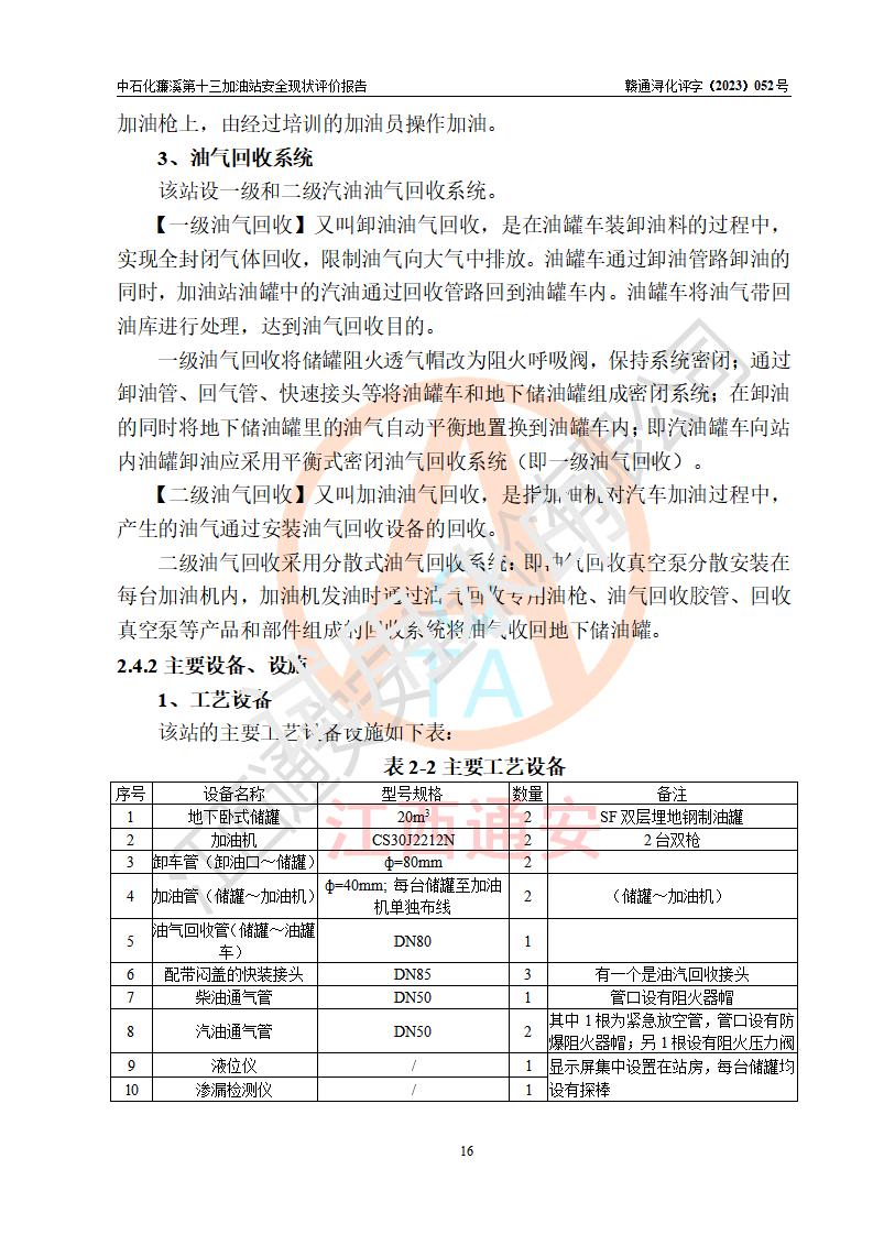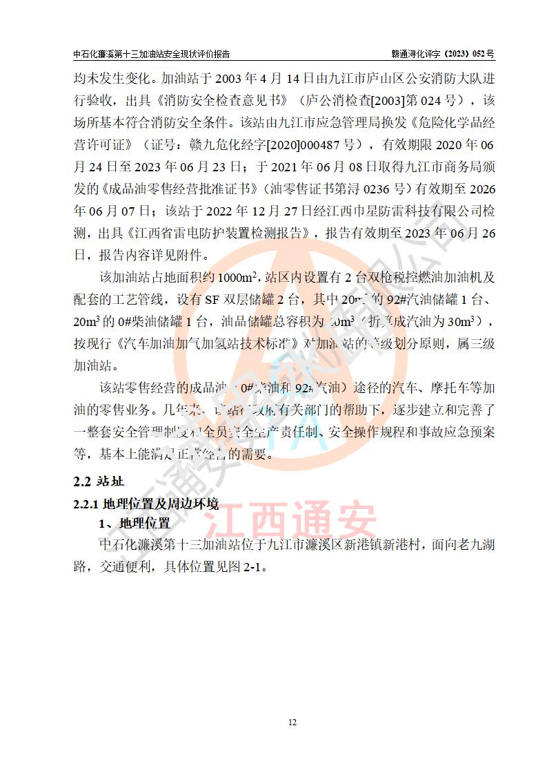 項目簡介 | 中國石化銷售股份有限公司江西九江濂溪石油分公司第十三加油站是一家專門從事成品油零售經(jīng)營的有限公司分公司(外商投資企業(yè)分公司),經(jīng)營場所位于九江市濂溪區(qū)新港鎮(zhèn)新港村?,F(xiàn)有從業(yè)人員3名,其中安全管理人員1人,加油站負責人杜建國。 該加油站占地面積約1000m2,站區(qū)內(nèi)設置有2臺雙槍稅控燃油加油機及配套的工藝管線,設有SF雙層儲罐2臺,其中20m3的92#汽油儲罐1臺、20m3的0#柴油儲罐1臺,油品儲罐總?cè)莘e為40m3(折算成汽油為30m3),按現(xiàn)行《汽車加油加氣加氫站技術(shù)標準》對加油站的等級劃分原則,屬三級加油站。 該站由九江市應急管理局換發(fā)《危險化學品經(jīng)營許可證》(證號:贛九?;?jīng)字[2020]000487號),**期限2020年06月24日至2023年06月23日。 | |||