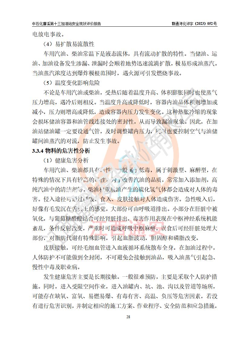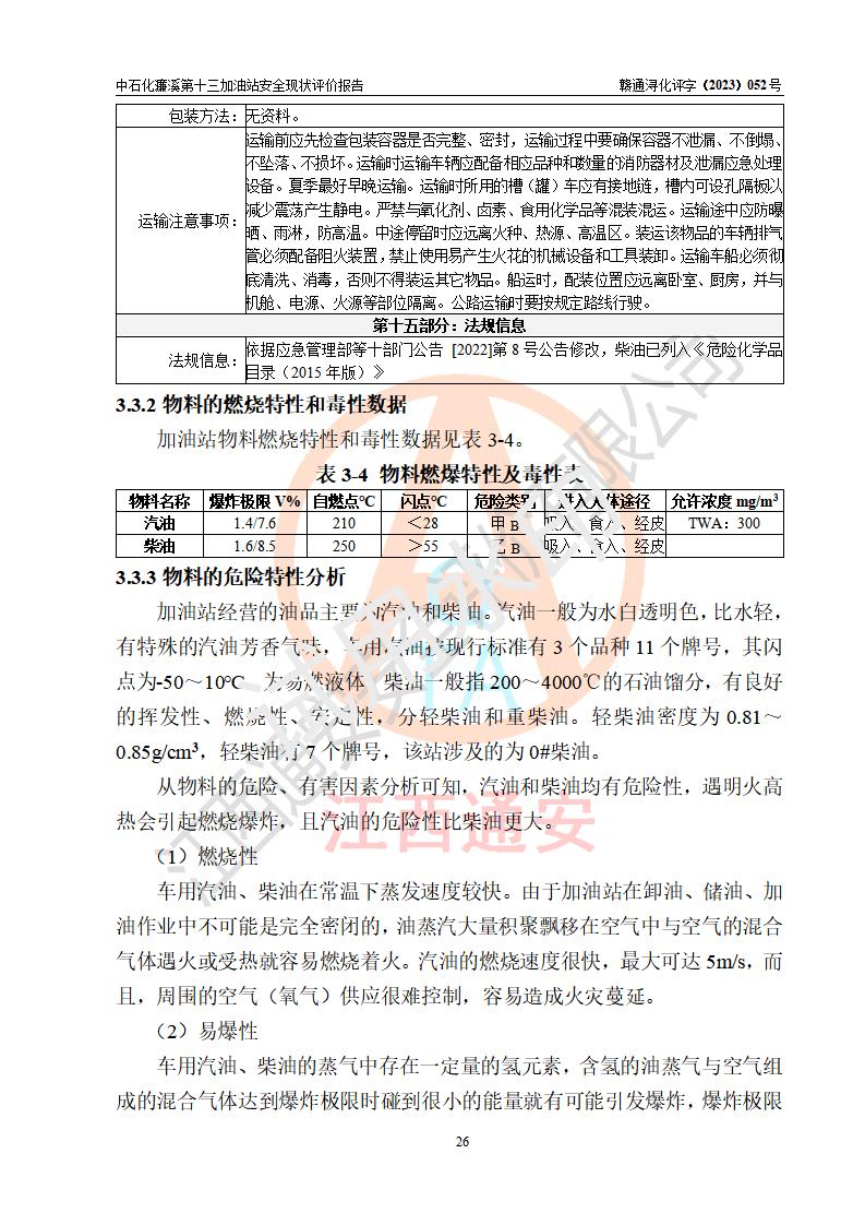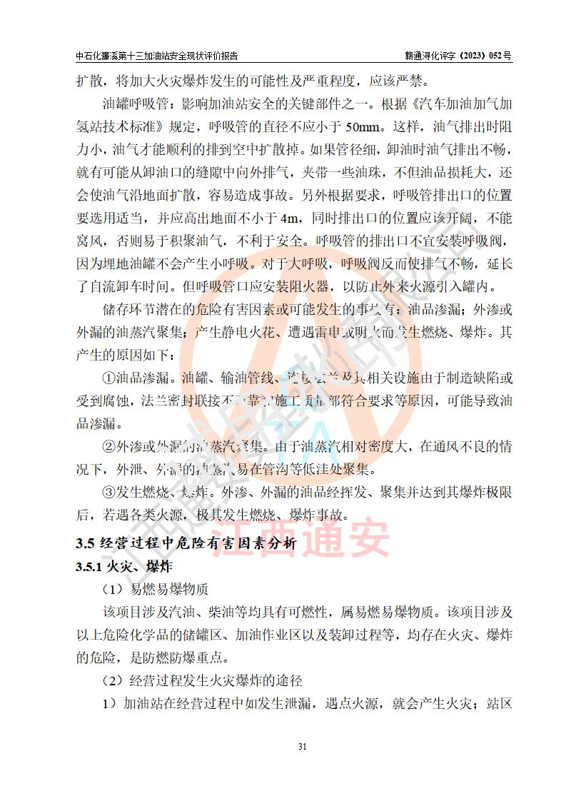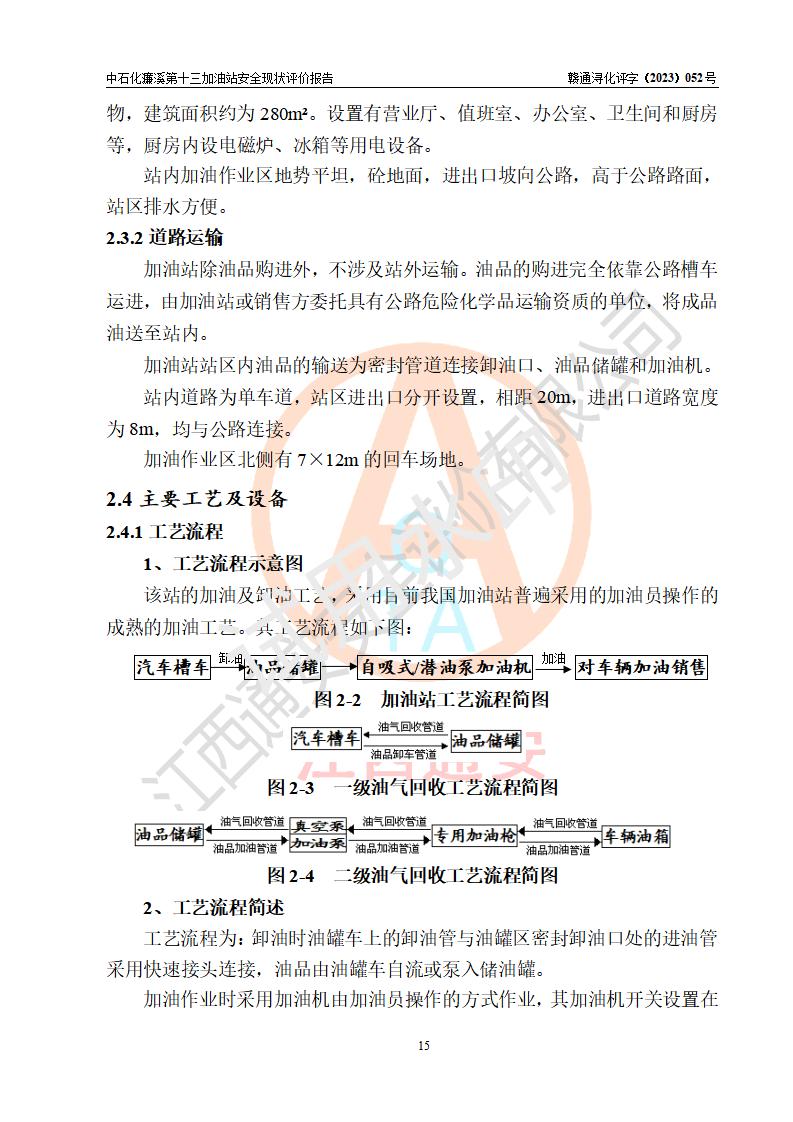 項目簡介 | 中國石化銷售股份有限公司江西九江濂溪石油分公司第十三加油站是一家專門從事成品油零售經(jīng)營的有限公司分公司(外商投資企業(yè)分公司),經(jīng)營場所位于九江市濂溪區(qū)新港鎮(zhèn)新港村?,F(xiàn)有從業(yè)人員3名,其中安全管理人員1人,加油站負責人杜建國。 該加油站占地面積約1000m2,站區(qū)內(nèi)設置有2臺雙槍稅控燃油加油機及配套的工藝管線,設有SF雙層儲罐2臺,其中20m3的92#汽油儲罐1臺、20m3的0#柴油儲罐1臺,油品儲罐總?cè)莘e為40m3(折算成汽油為30m3),按現(xiàn)行《汽車加油加氣加氫站技術(shù)標準》對加油站的等級劃分原則,屬三級加油站。 該站由九江市應急管理局換發(fā)《危險化學品經(jīng)營許可證》(證號:贛九?;?jīng)字[2020]000487號),**期限2020年06月24日至2023年06月23日。 | |||
