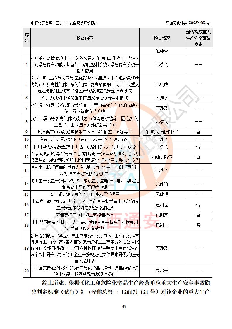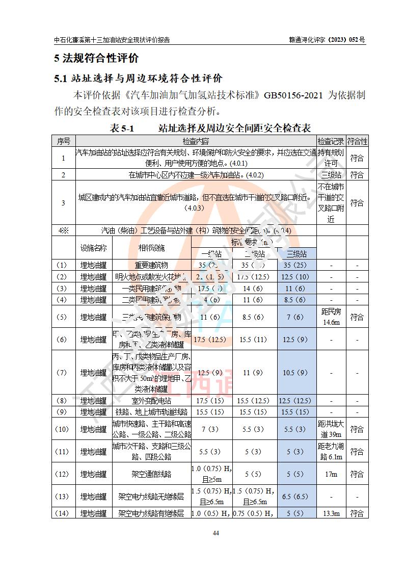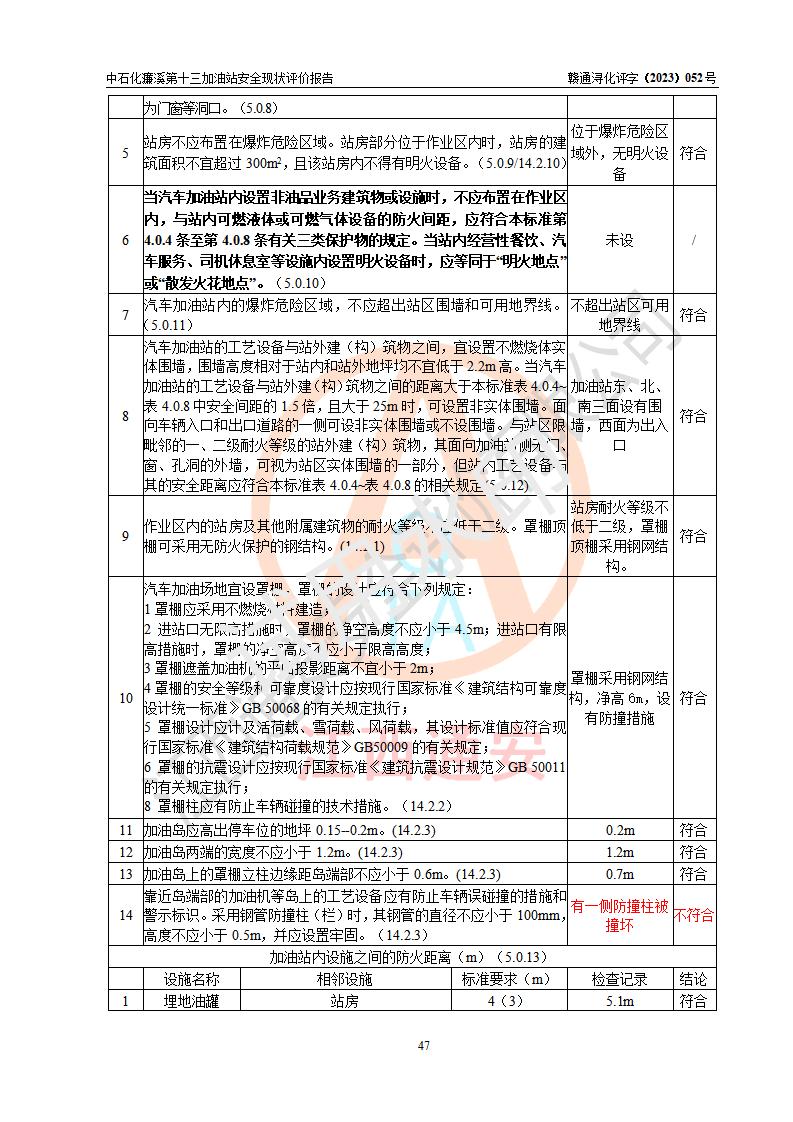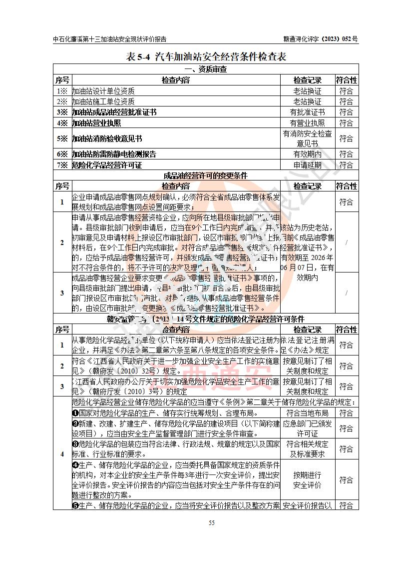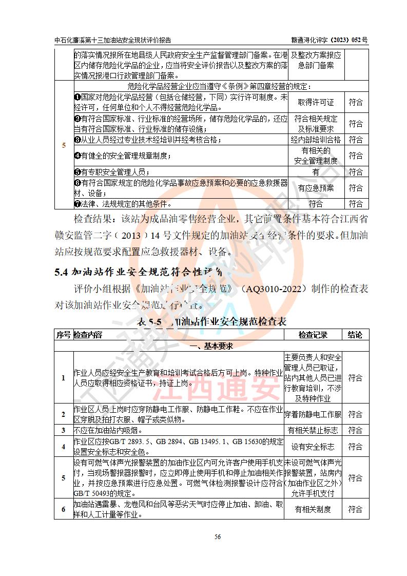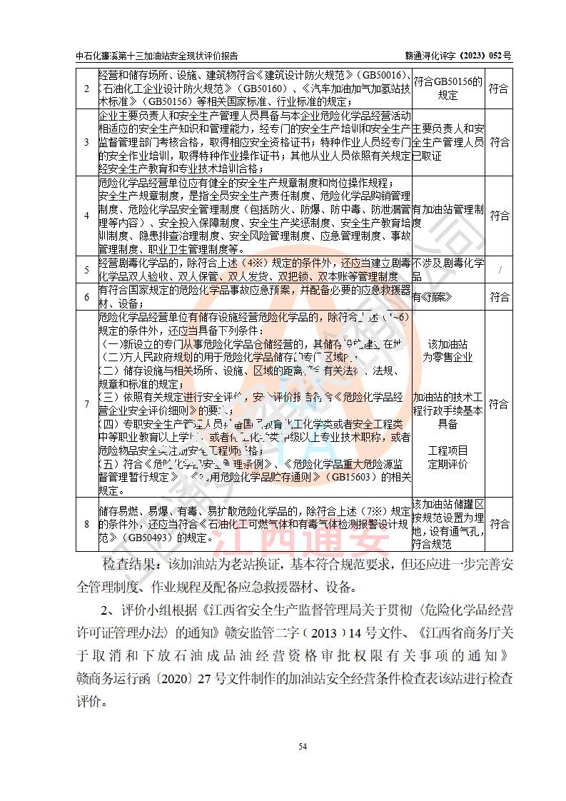 評價結(jié)論 | 中國石化銷售股份有限公司江西九江濂溪石油分公司第十三加油站涉及的安全條件、安全經(jīng)營條件、安全生產(chǎn)管理符合《危險化學品經(jīng)營許可證管理辦法》、《汽車加油加氣加氫站技術(shù)標準》等**有關(guān)法規(guī)、標準、規(guī)范要求,能滿足危險化學品經(jīng)營安全條件。 | |||