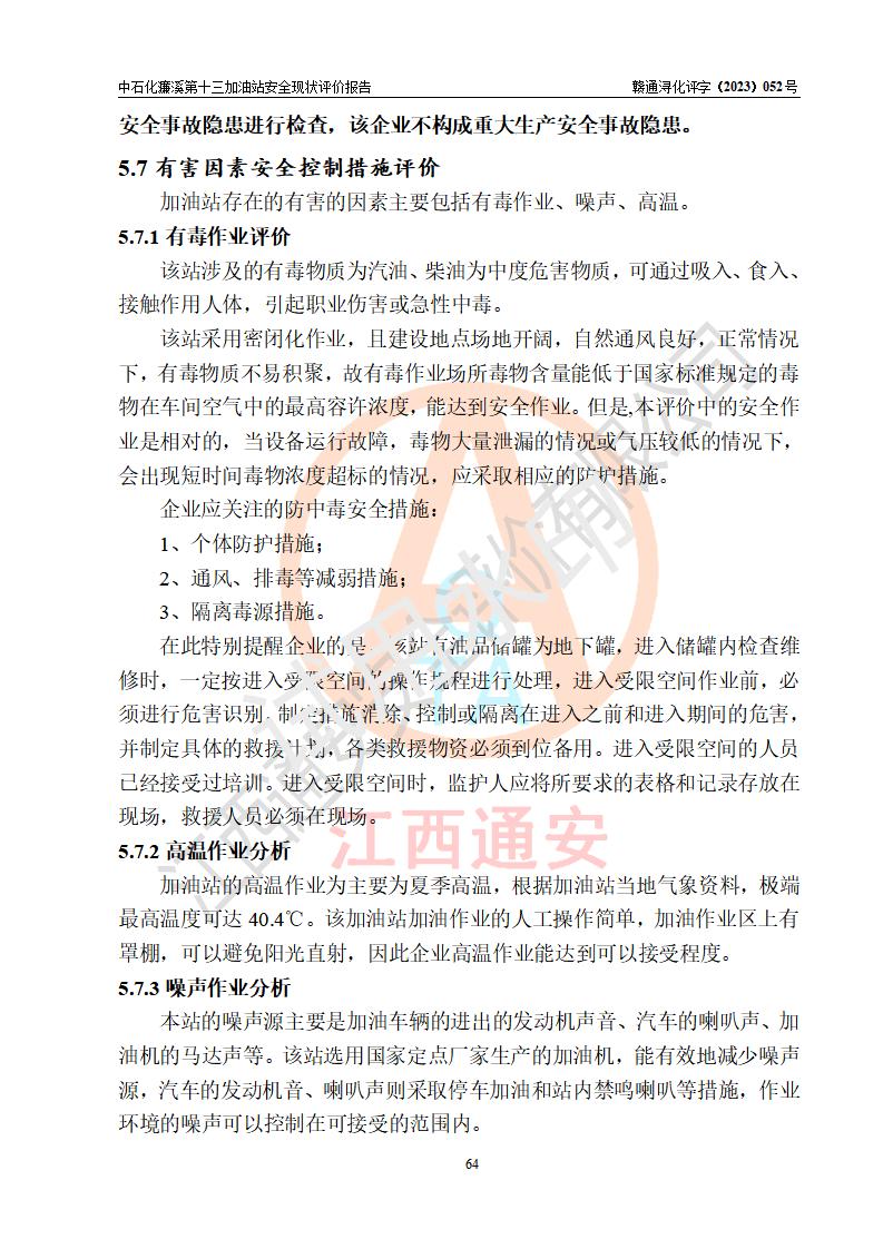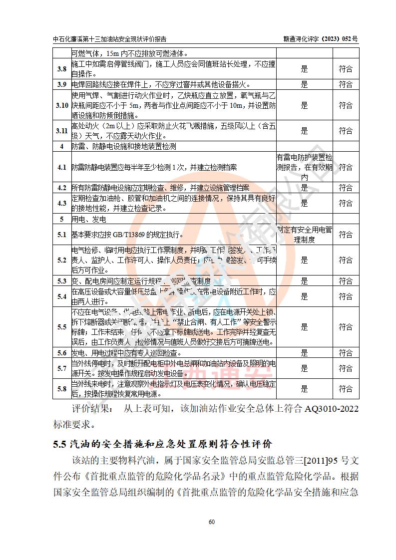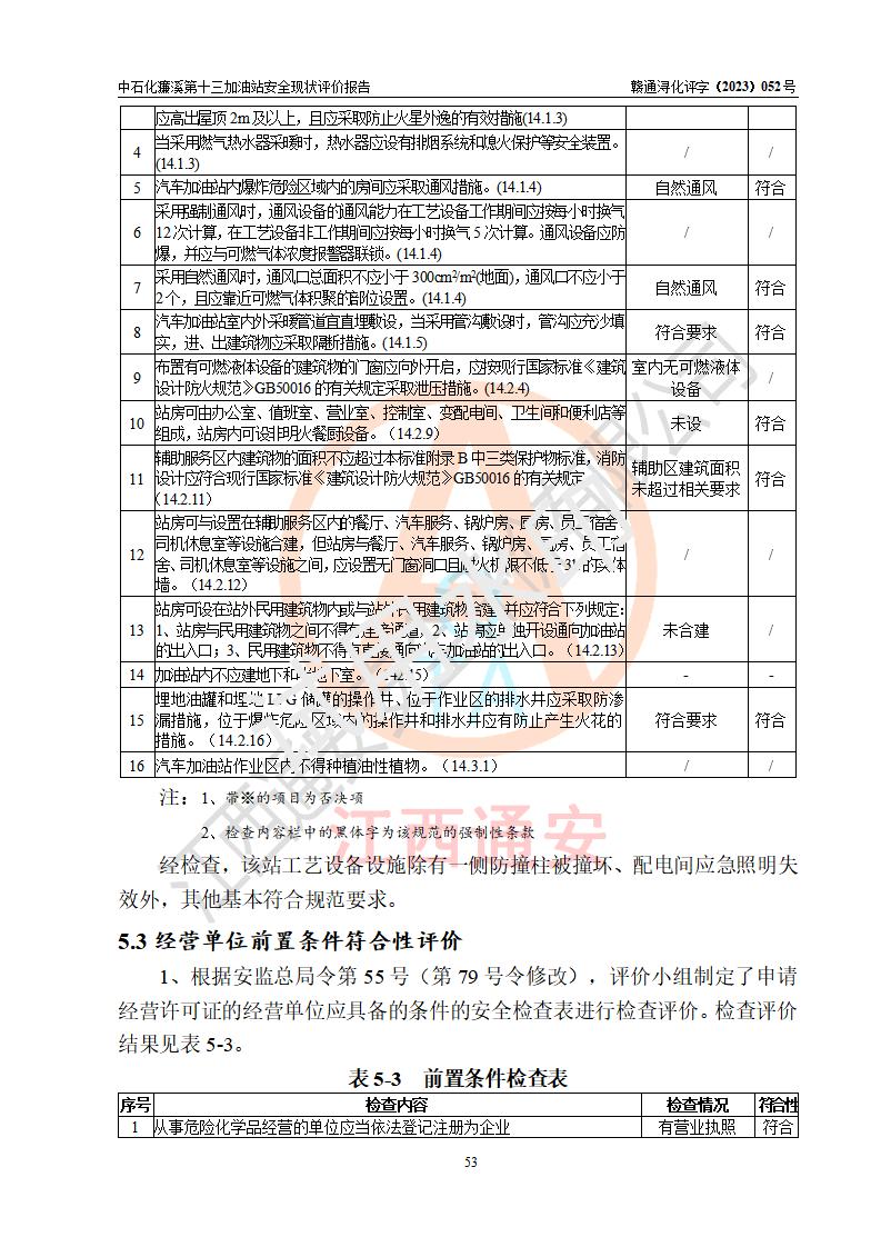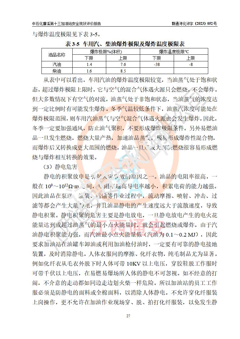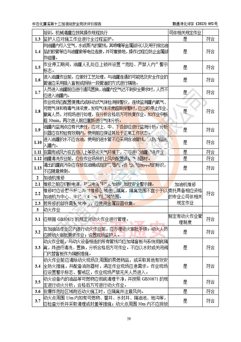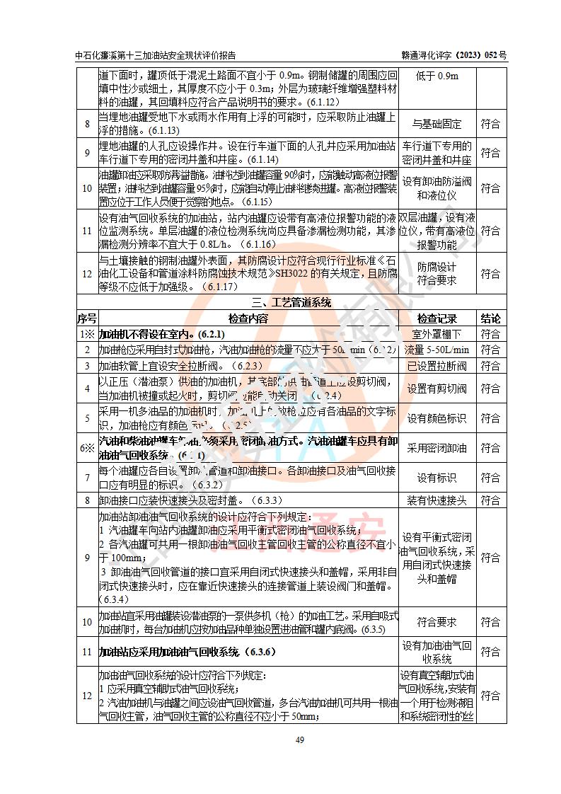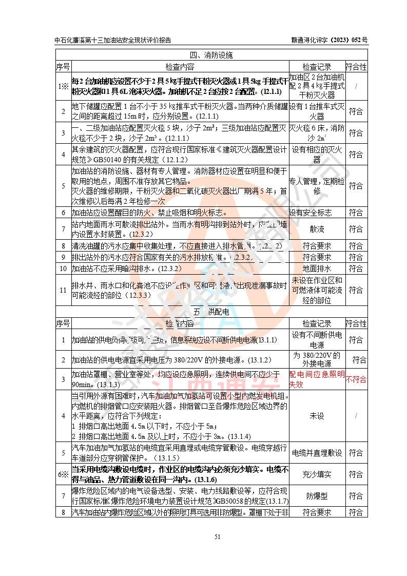評價結(jié)論 | 中國石化銷售股份有限公司江西九江濂溪石油分公司第十三加油站涉及的安全條件、安全經(jīng)營條件、安全生產(chǎn)管理符合《危險化學品經(jīng)營許可證管理辦法》、《汽車加油加氣加氫站技術(shù)標準》等**有關(guān)法規(guī)、標準、規(guī)范要求,能滿足危險化學品經(jīng)營安全條件。 | |||