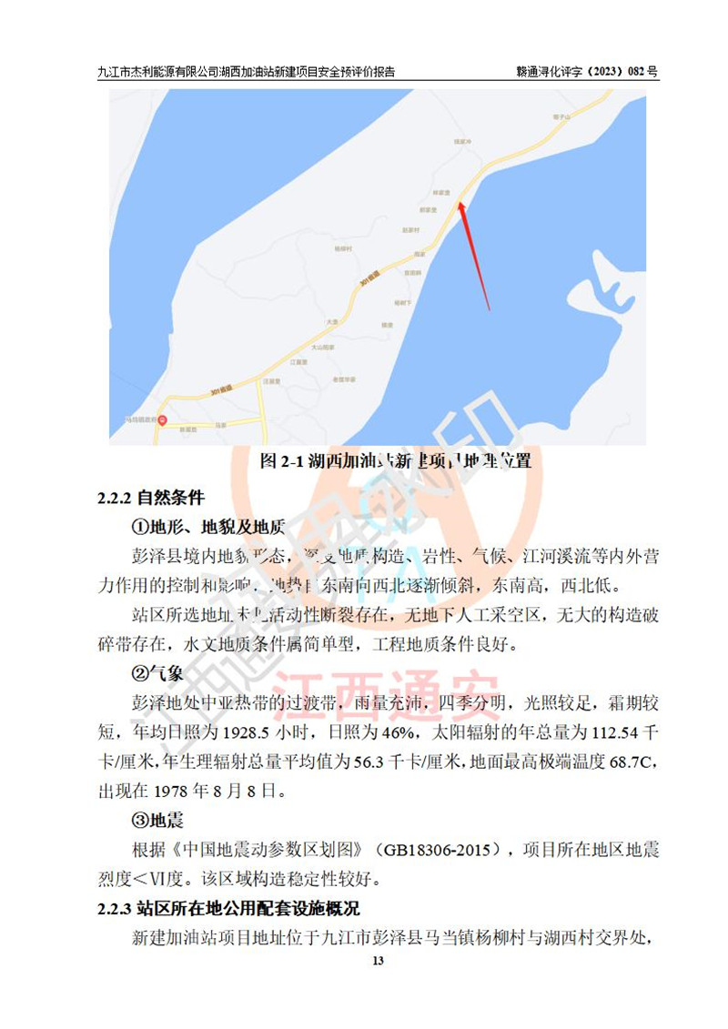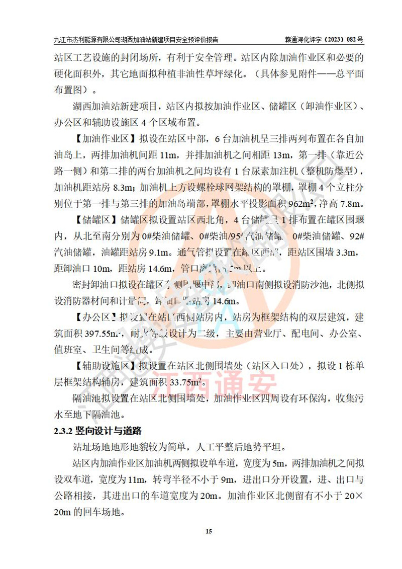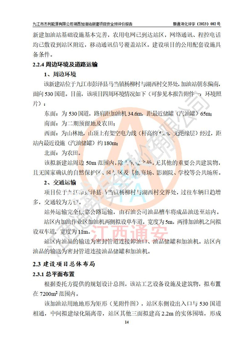 項目簡介 | 九江市杰利能源有限公司于2023年03月09日取得營業(yè)執(zhí)照,注冊地址位于江西省九江市彭澤縣馬當鎮(zhèn)楊柳村與湖西村交界處,經(jīng)營范圍:成品油批發(fā)(不含危險化學品),食品銷售,餐飲服務(wù)等等(除依法經(jīng)批準的項目外,憑營業(yè)執(zhí)照依法自主開展經(jīng)營活動)。依據(jù)江西省商務(wù)廳文件(贛商務(wù)辦運行字【2017】1號),在九江市彭澤縣馬當鎮(zhèn)楊柳村與湖西村交界處新建一座二級加油站(站名為湖西加油站)。 該項目已取得備案通知書,項目統(tǒng)一代碼為2111-360430-04-01-213892,該項目的建設(shè)用地已取得彭澤縣自然資源局頒發(fā)的不動產(chǎn)權(quán)證書:贛(2021)彭澤縣不動產(chǎn)權(quán)第0010108號。 擬新建加油站總用地面積為7200m2,站內(nèi)擬設(shè)2臺4槍和4臺雙槍潛油泵加油機及配套的工藝管線,擬設(shè)SF油品儲罐4臺,其中40m3的0#柴油儲罐1臺、40m3的92#汽油儲罐1臺、50m3的0#柴油儲罐1臺、50m3的95#汽油和0#柴油儲罐1臺(從中隔斷,汽油和柴油各25m3),油罐總?cè)莘e為180m3(折算成汽油容積為122.5m3),按現(xiàn)行的《汽車加油加氣加氫站技術(shù)標準》對加油站的等級劃分,屬二級加油站。 | |||