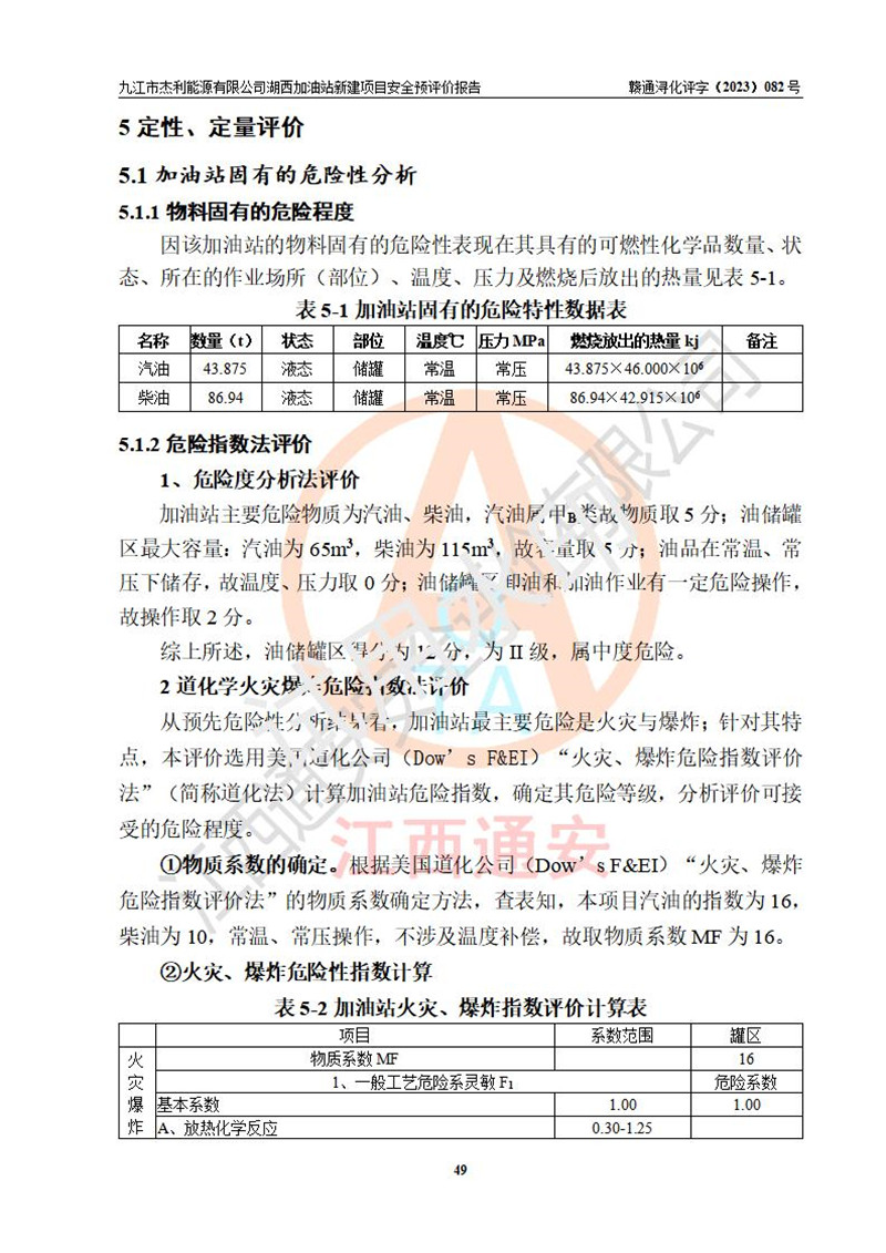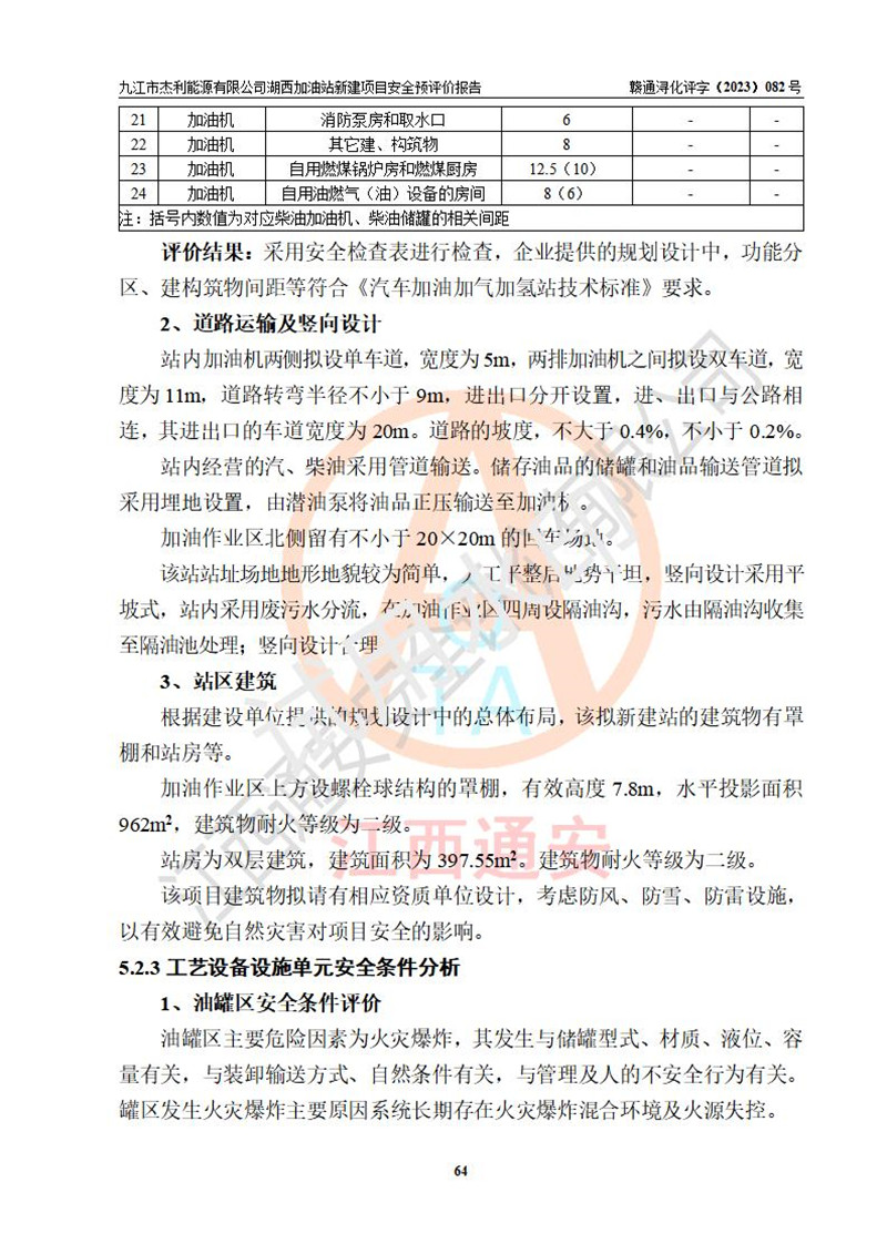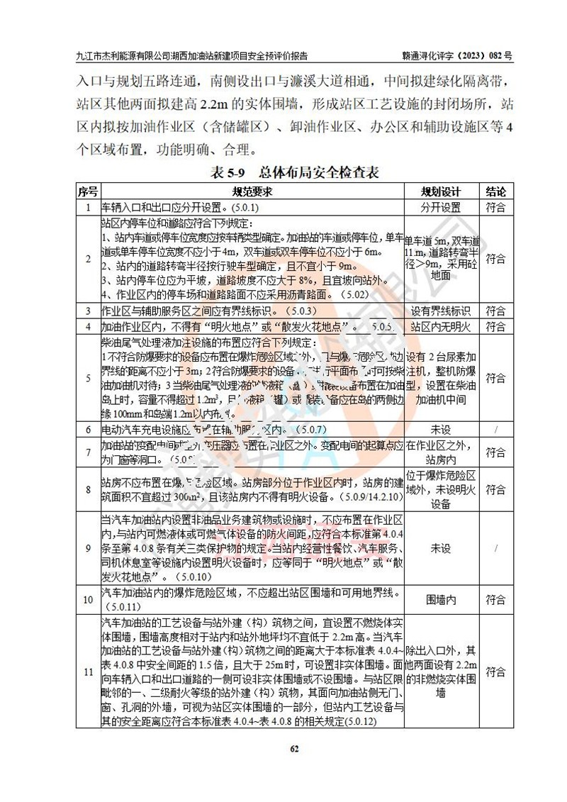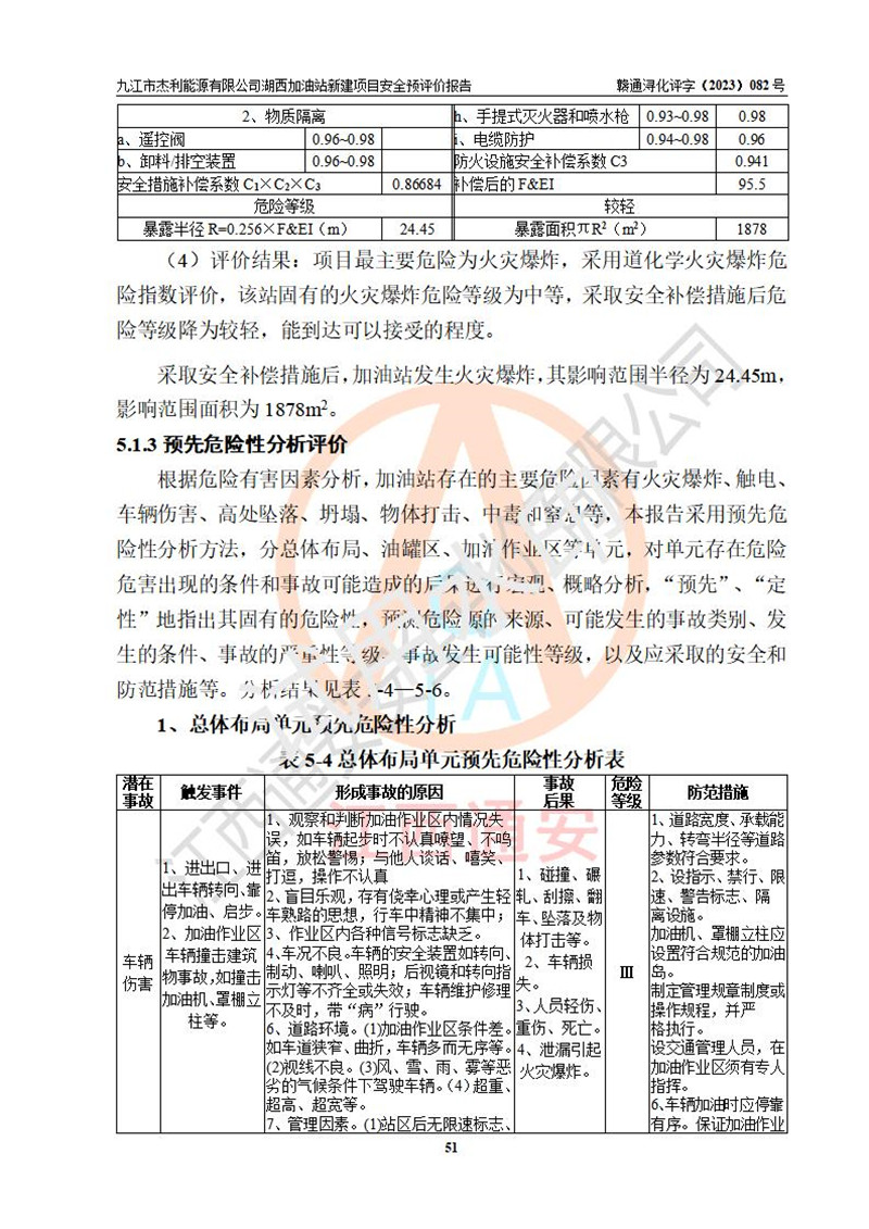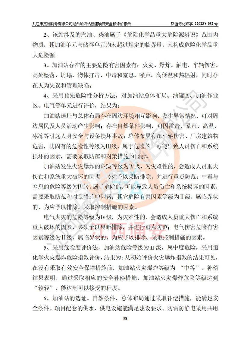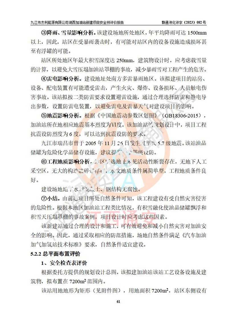 評價結(jié)論 | 九江市杰利能源有限公司湖西加油站新建項目的選址、自然條件適宜該項目工程的建設(shè);項目規(guī)劃設(shè)計中的總體布局方案可行,符合有關(guān)法規(guī)、標準要求;項目選擇的工藝過程及設(shè)備設(shè)施的安全可靠性能達到**法規(guī)、標準規(guī)定要求;項目存在的危險有害因素可控,在落實項目建設(shè)方案及評價報告提出的有關(guān)安全對策措施后,其危險有害程度能達到可以接受的程度,項目建設(shè)能夠?qū)崿F(xiàn)安全運行的目標。 | |||