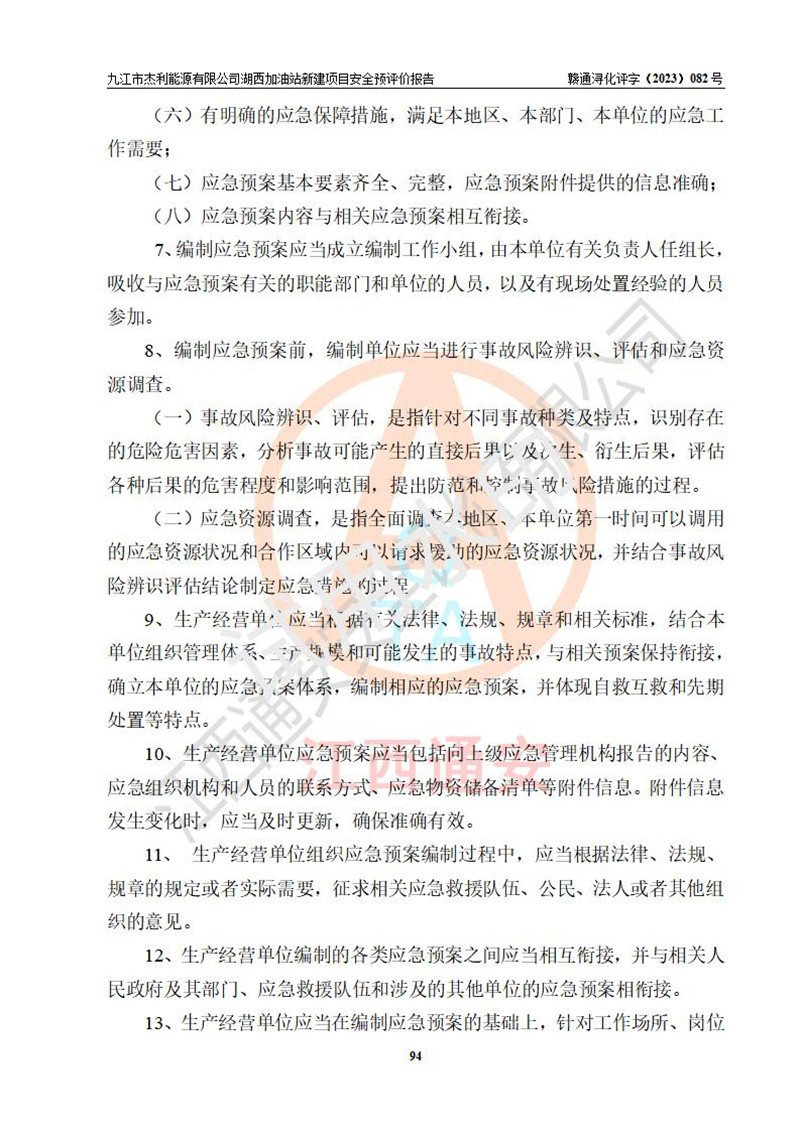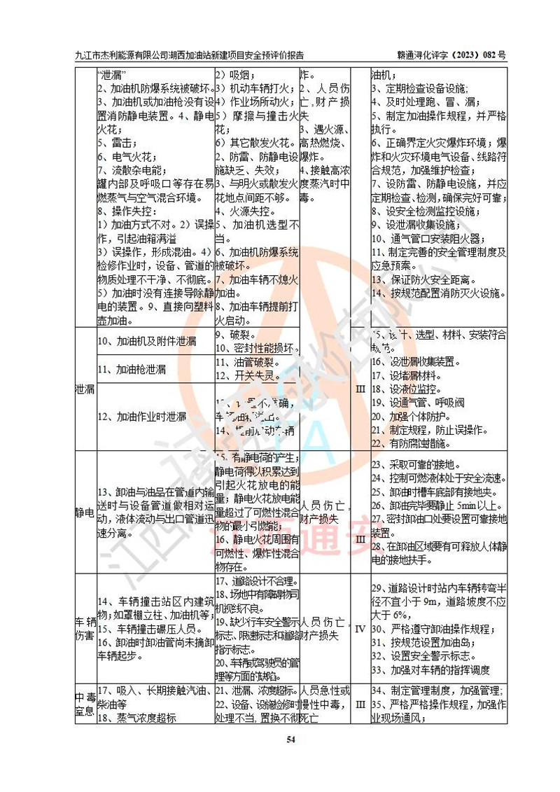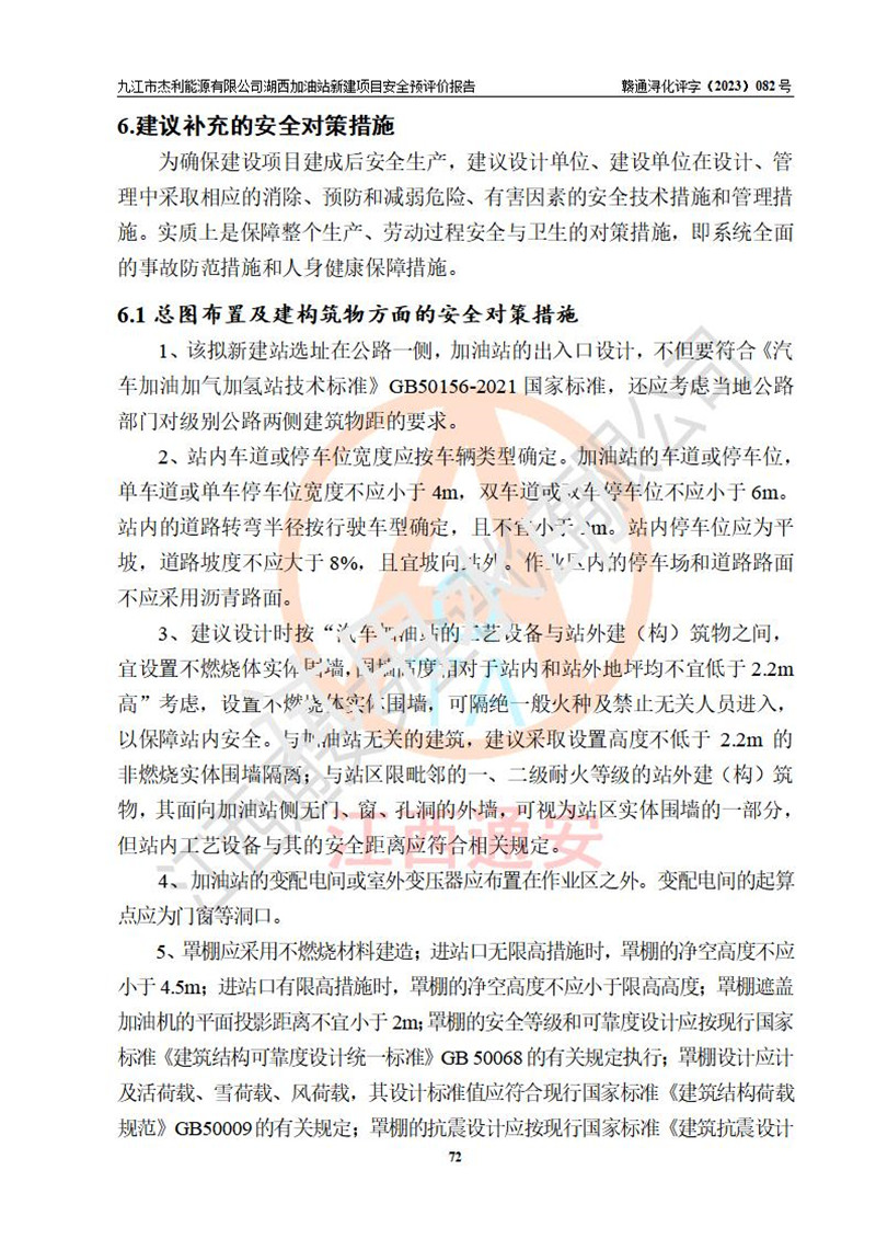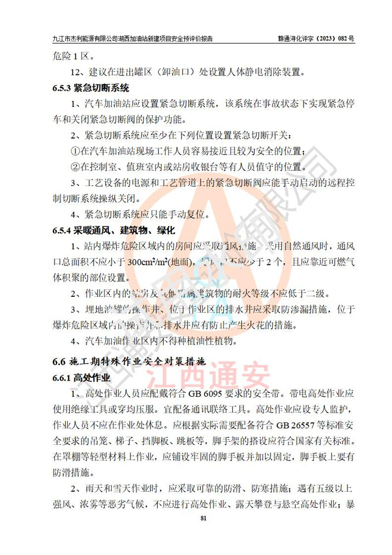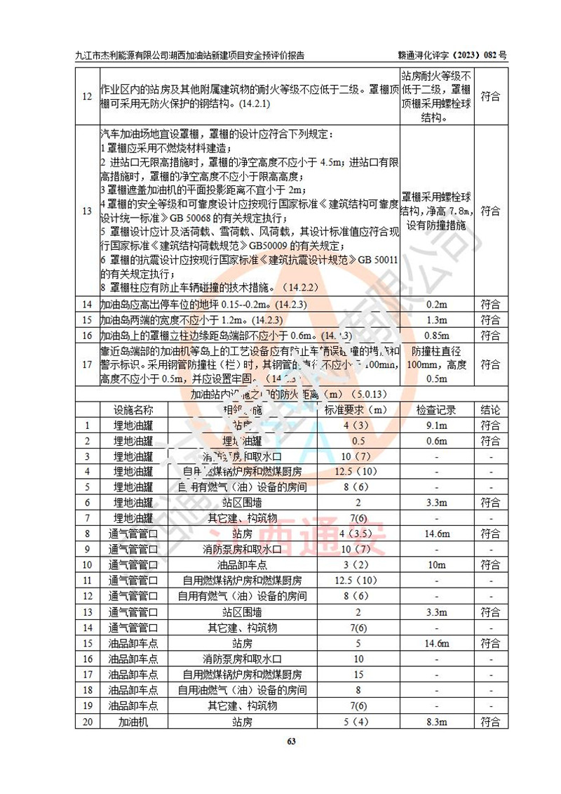 評價結(jié)論 | 九江市杰利能源有限公司湖西加油站新建項目的選址、自然條件適宜該項目工程的建設(shè);項目規(guī)劃設(shè)計中的總體布局方案可行,符合有關(guān)法規(guī)、標準要求;項目選擇的工藝過程及設(shè)備設(shè)施的安全可靠性能達到**法規(guī)、標準規(guī)定要求;項目存在的危險有害因素可控,在落實項目建設(shè)方案及評價報告提出的有關(guān)安全對策措施后,其危險有害程度能達到可以接受的程度,項目建設(shè)能夠?qū)崿F(xiàn)安全運行的目標。 | |||