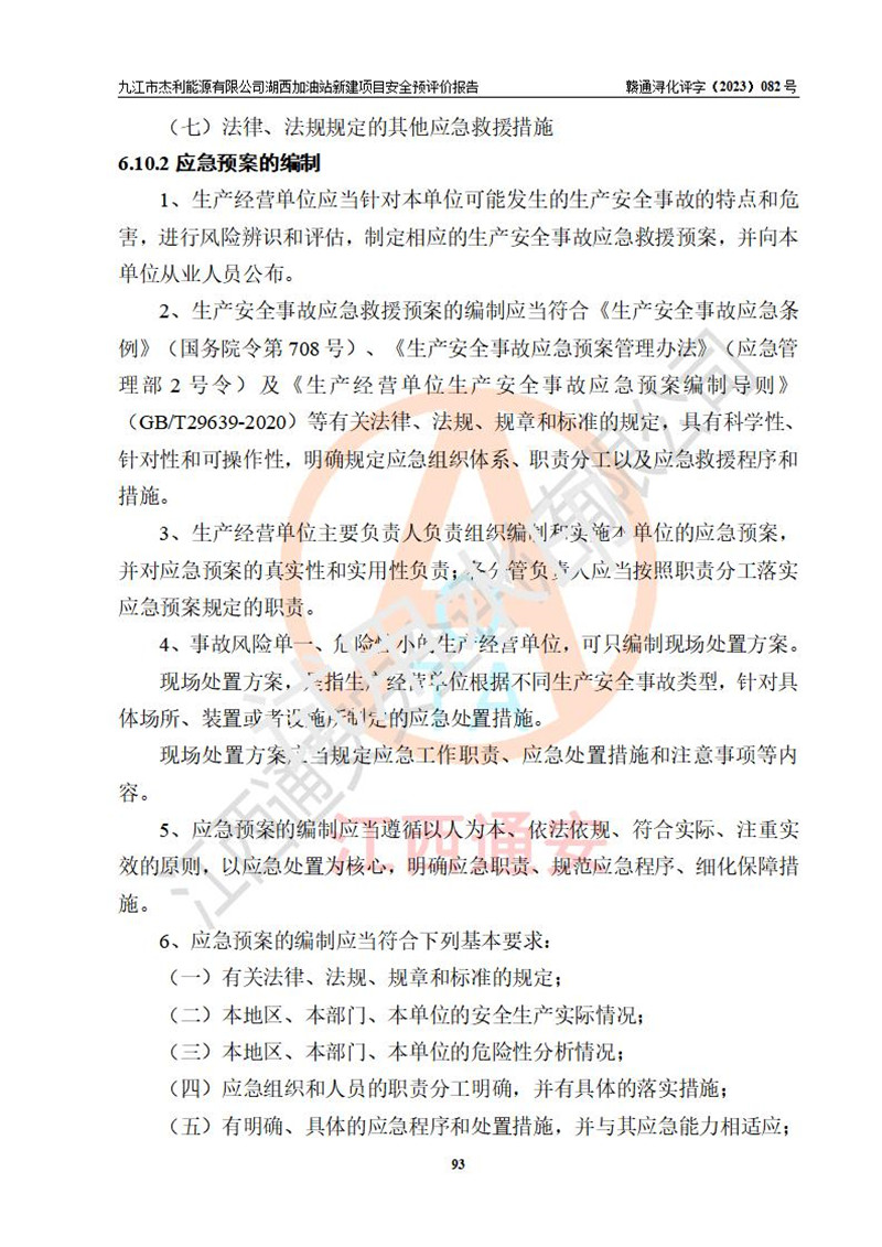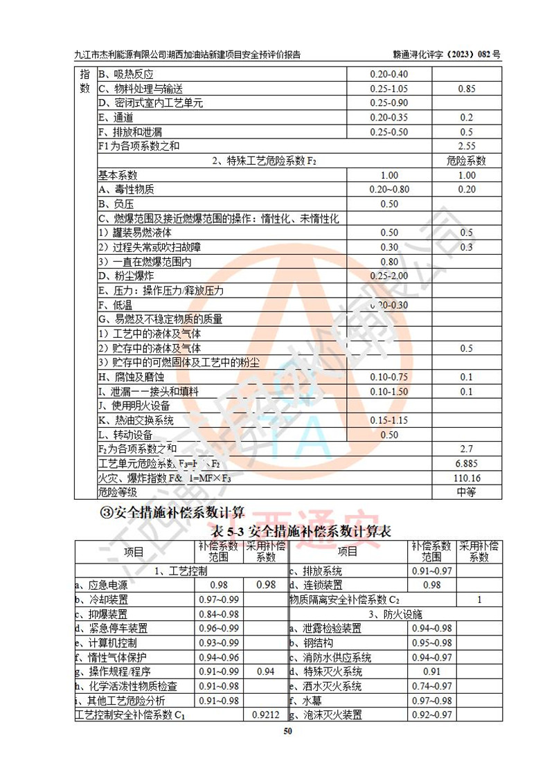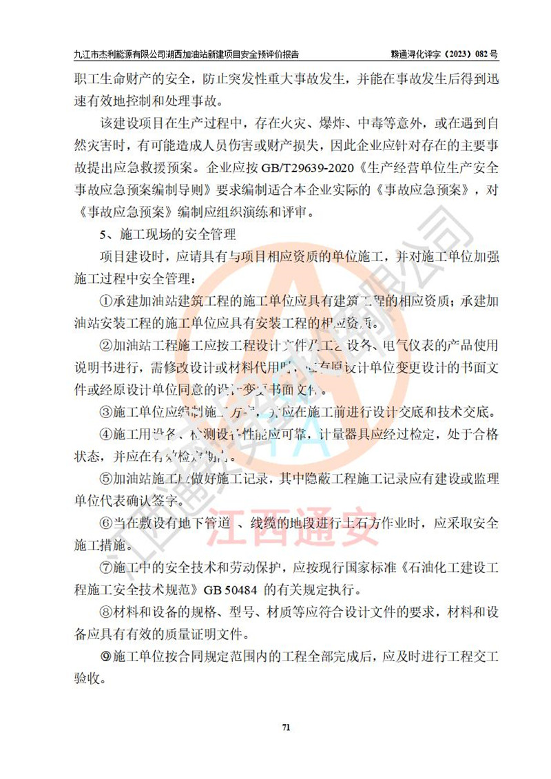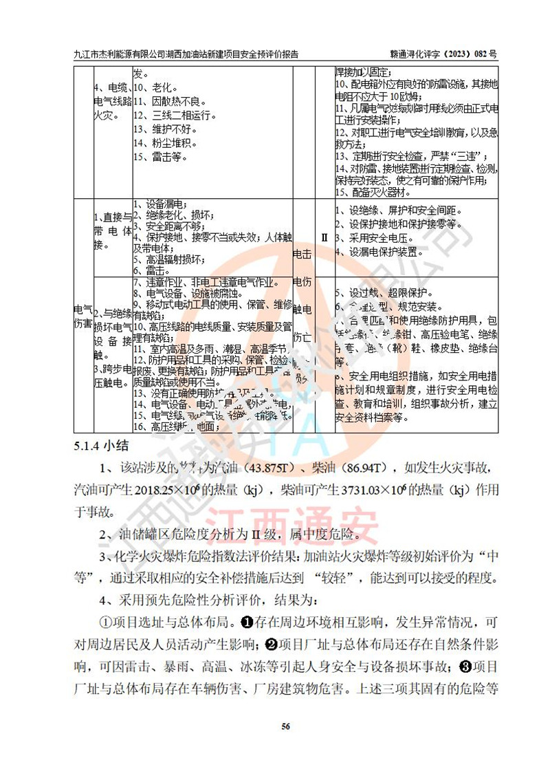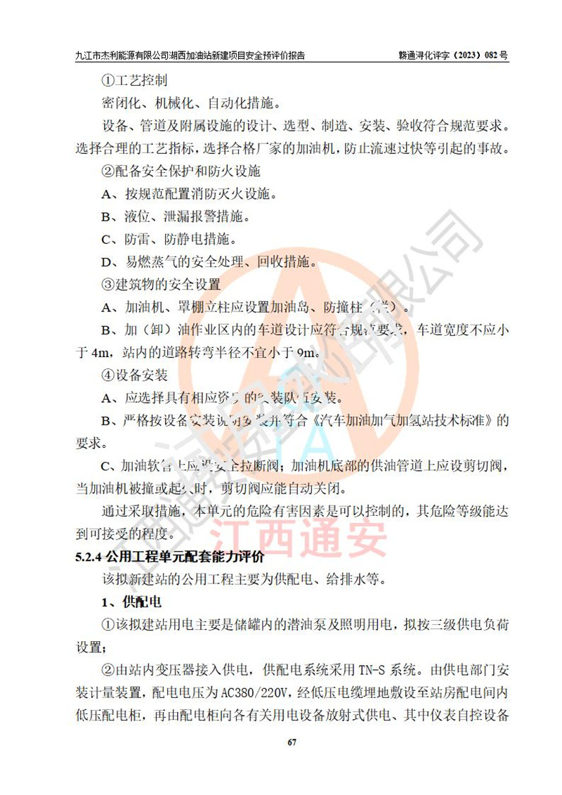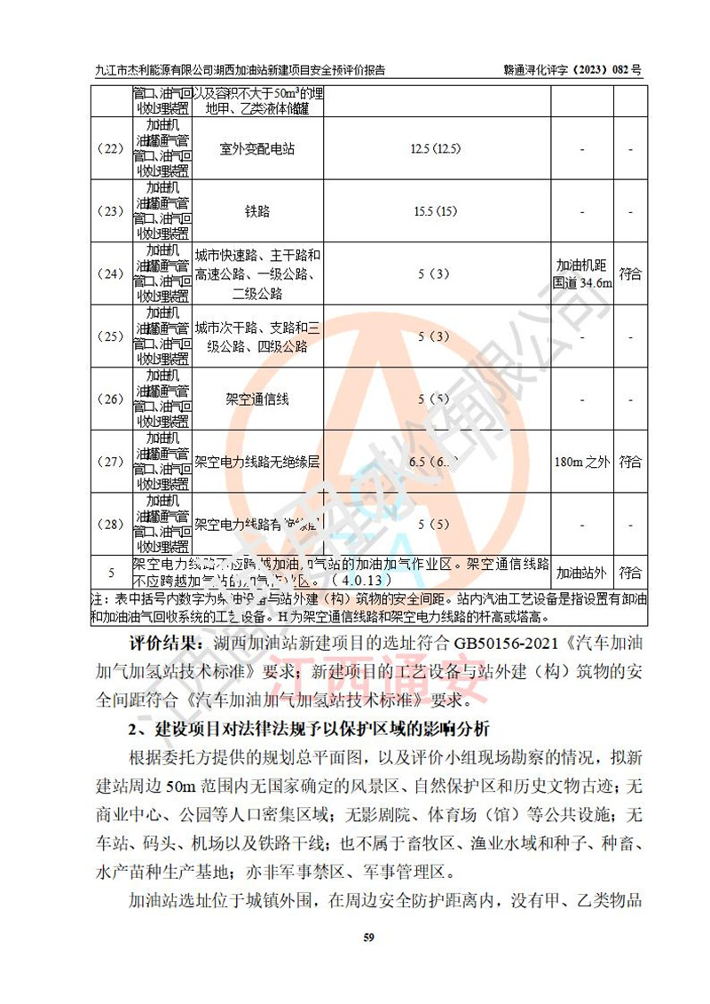評價結(jié)論 | 九江市杰利能源有限公司湖西加油站新建項目的選址、自然條件適宜該項目工程的建設(shè);項目規(guī)劃設(shè)計中的總體布局方案可行,符合有關(guān)法規(guī)、標準要求;項目選擇的工藝過程及設(shè)備設(shè)施的安全可靠性能達到**法規(guī)、標準規(guī)定要求;項目存在的危險有害因素可控,在落實項目建設(shè)方案及評價報告提出的有關(guān)安全對策措施后,其危險有害程度能達到可以接受的程度,項目建設(shè)能夠?qū)崿F(xiàn)安全運行的目標。 | |||