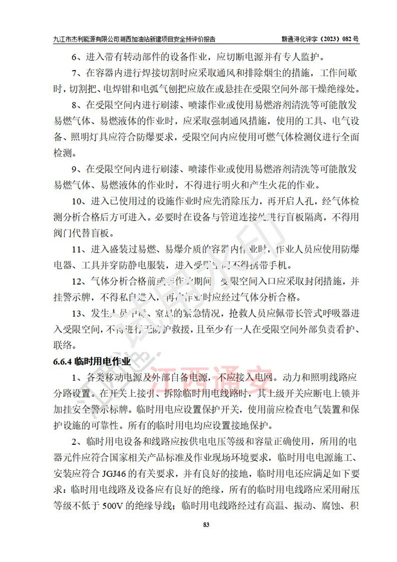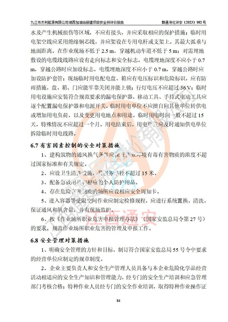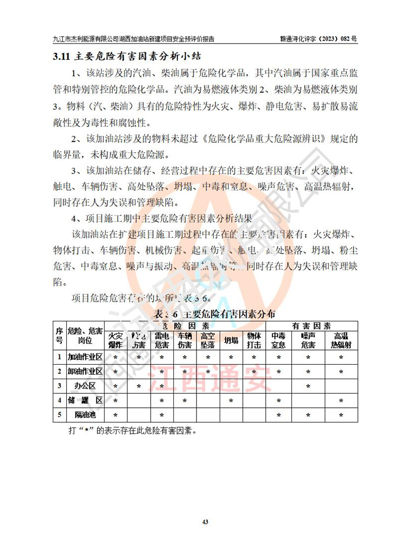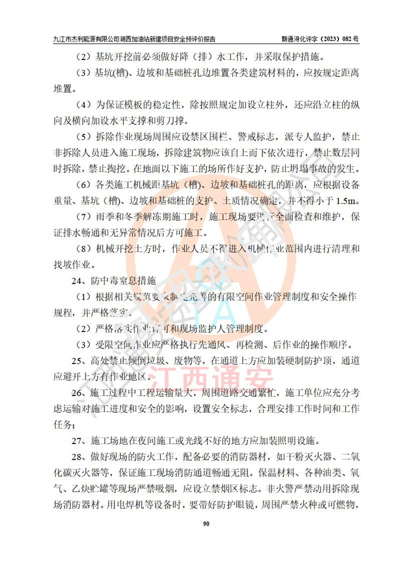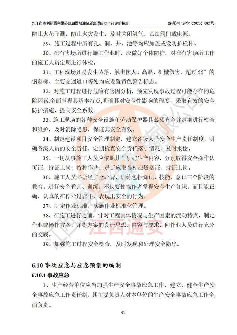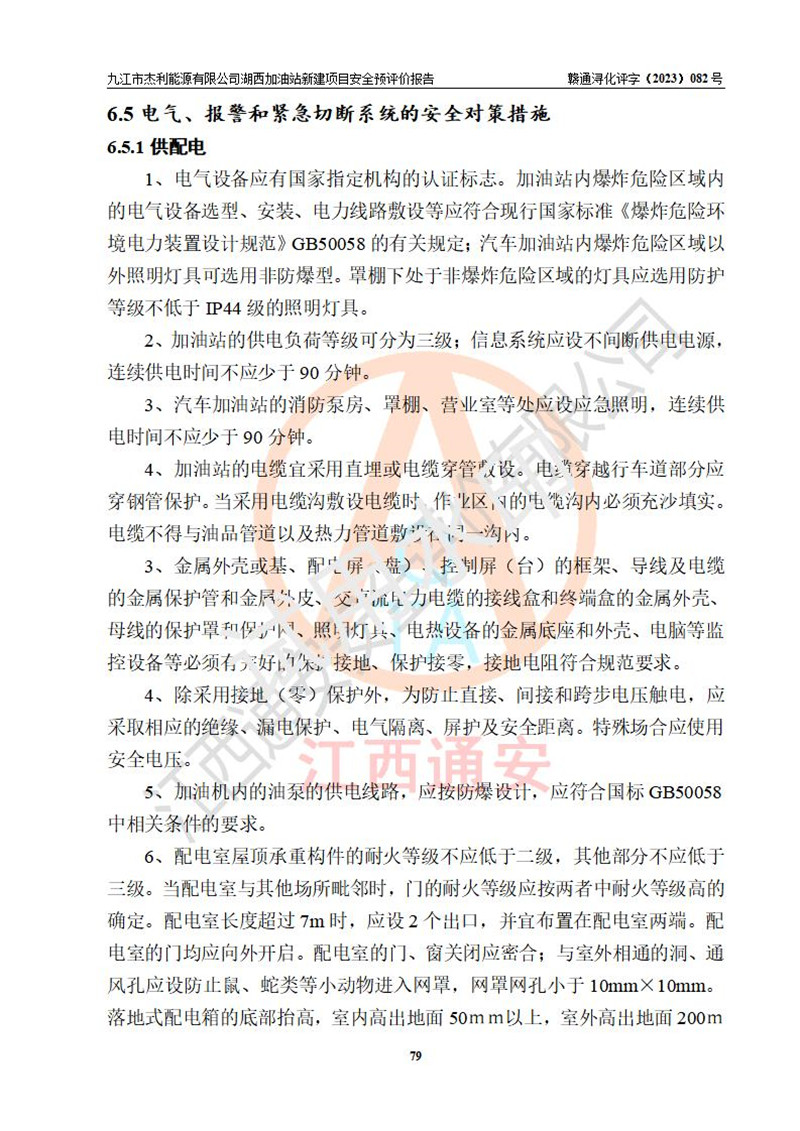 評價結(jié)論 | 九江市杰利能源有限公司湖西加油站新建項目的選址、自然條件適宜該項目工程的建設(shè);項目規(guī)劃設(shè)計中的總體布局方案可行,符合有關(guān)法規(guī)、標準要求;項目選擇的工藝過程及設(shè)備設(shè)施的安全可靠性能達到**法規(guī)、標準規(guī)定要求;項目存在的危險有害因素可控,在落實項目建設(shè)方案及評價報告提出的有關(guān)安全對策措施后,其危險有害程度能達到可以接受的程度,項目建設(shè)能夠?qū)崿F(xiàn)安全運行的目標。 | |||