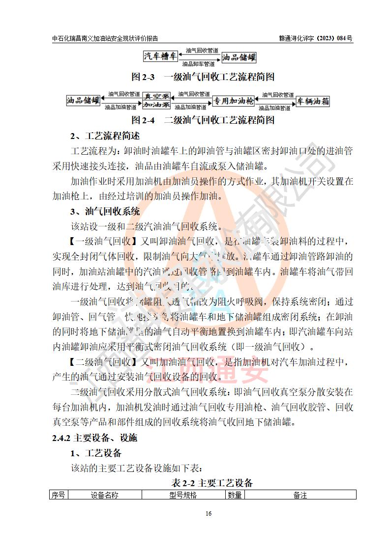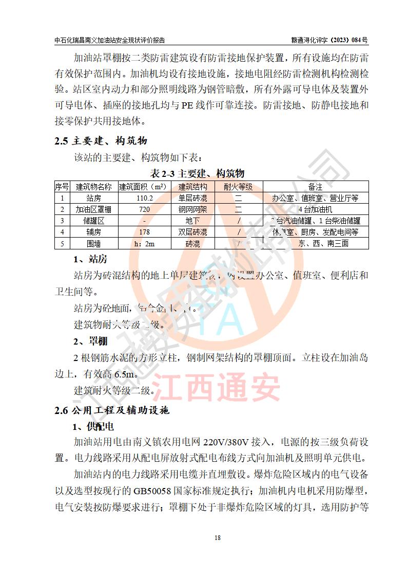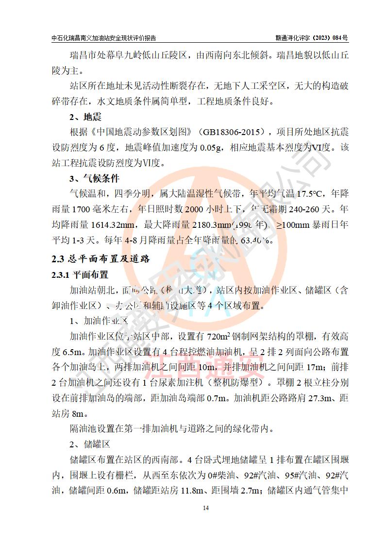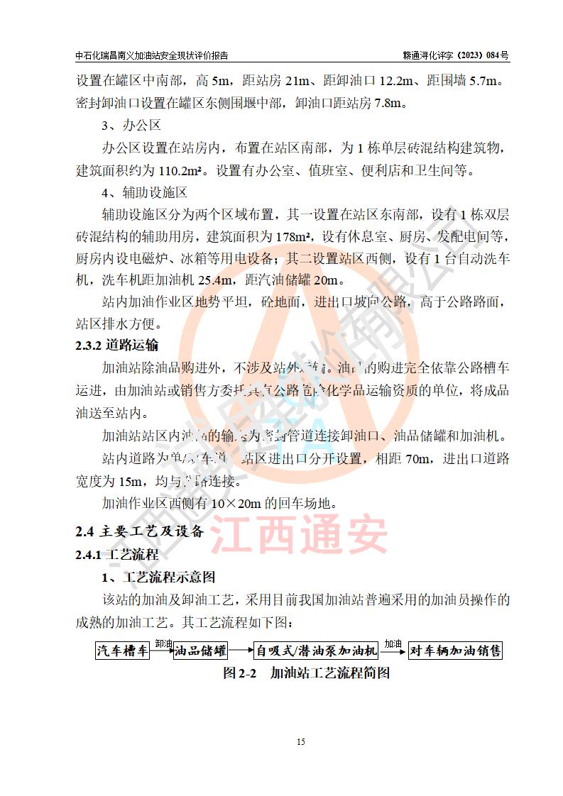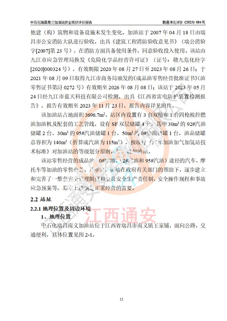 項(xiàng)目簡(jiǎn)介 | 中國石化銷售股份有限公司江西九江瑞昌石油分公司南義加油站是一家專門從事成品油零售經(jīng)營(yíng)的有限公司分公司(外商投資企業(yè)分公司),經(jīng)營(yíng)場(chǎng)所位于江西省瑞昌市南義鎮(zhèn)王家鋪?,F(xiàn)有從業(yè)人員4名,其中安全管理人員1人,加油站負(fù)責(zé)人陳小勇。 該加油站占地面積3696.7m2,站區(qū)內(nèi)設(shè)置有3臺(tái)雙槍和1臺(tái)四槍稅控燃油加油機(jī)及配套的工藝管線,設(shè)有SF雙層儲(chǔ)罐4臺(tái),其中30m3的92#汽油儲(chǔ)罐2臺(tái)、30m3的95#汽油儲(chǔ)罐1臺(tái)、50m3的0#柴油儲(chǔ)罐1臺(tái),油品儲(chǔ)罐總?cè)莘e為140m3(折算成汽油為115m3),按現(xiàn)行《汽車加油加氣加氫站技術(shù)標(biāo)準(zhǔn)》對(duì)加油站的等級(jí)劃分原則,屬二級(jí)加油站。 該站由九江市應(yīng)急管理局換發(fā)《危險(xiǎn)化學(xué)品經(jīng)營(yíng)許可證》(證號(hào):贛九?;?jīng)字[2020]000324號(hào)),**期限2020年08月27日至2023年08月26日。 | |||