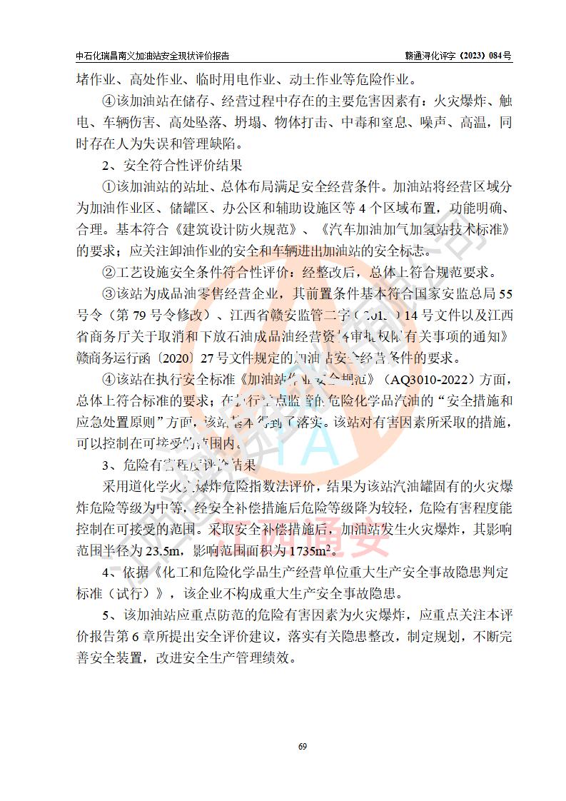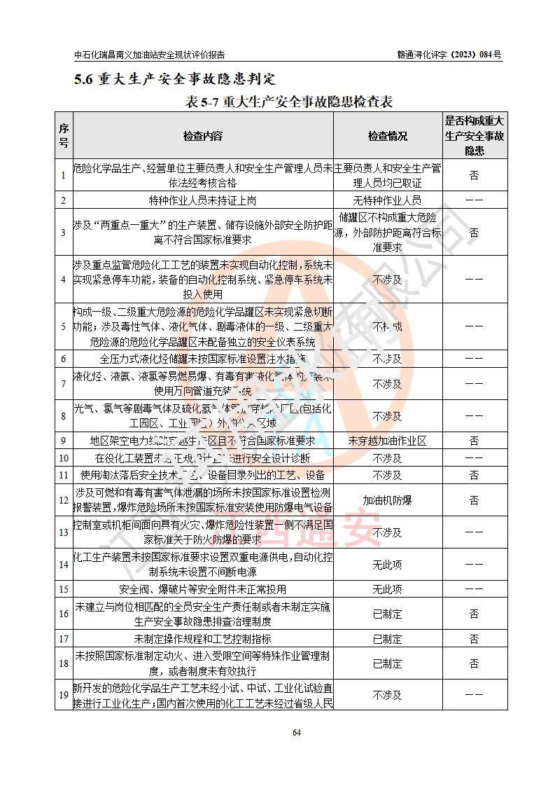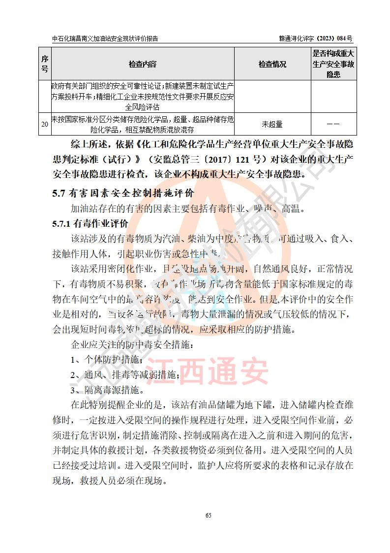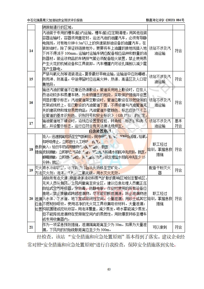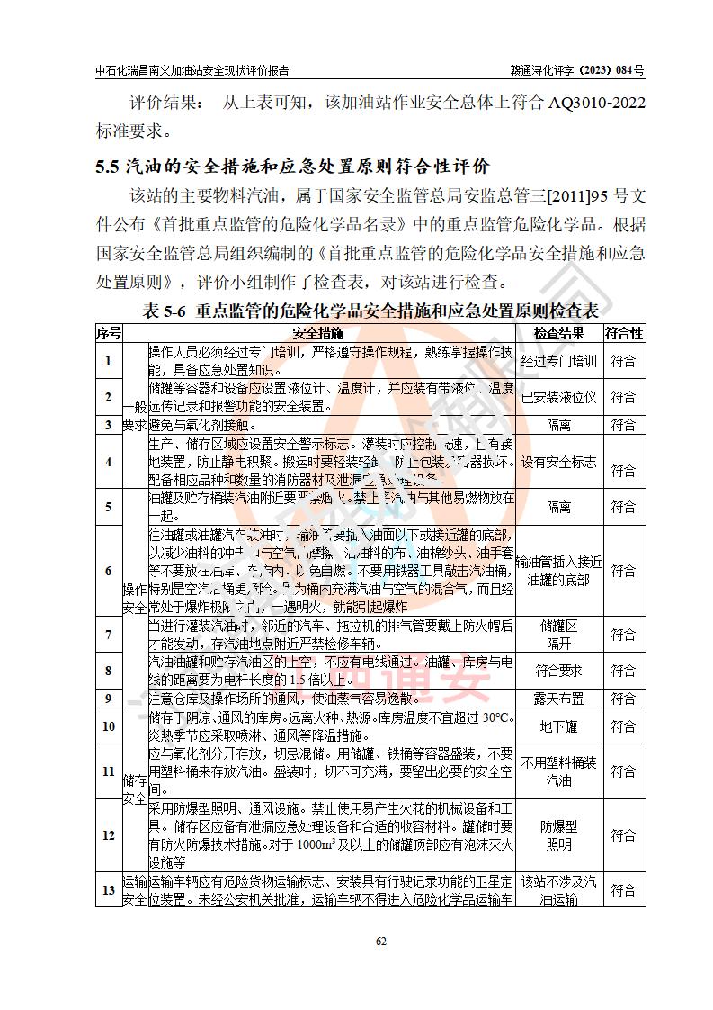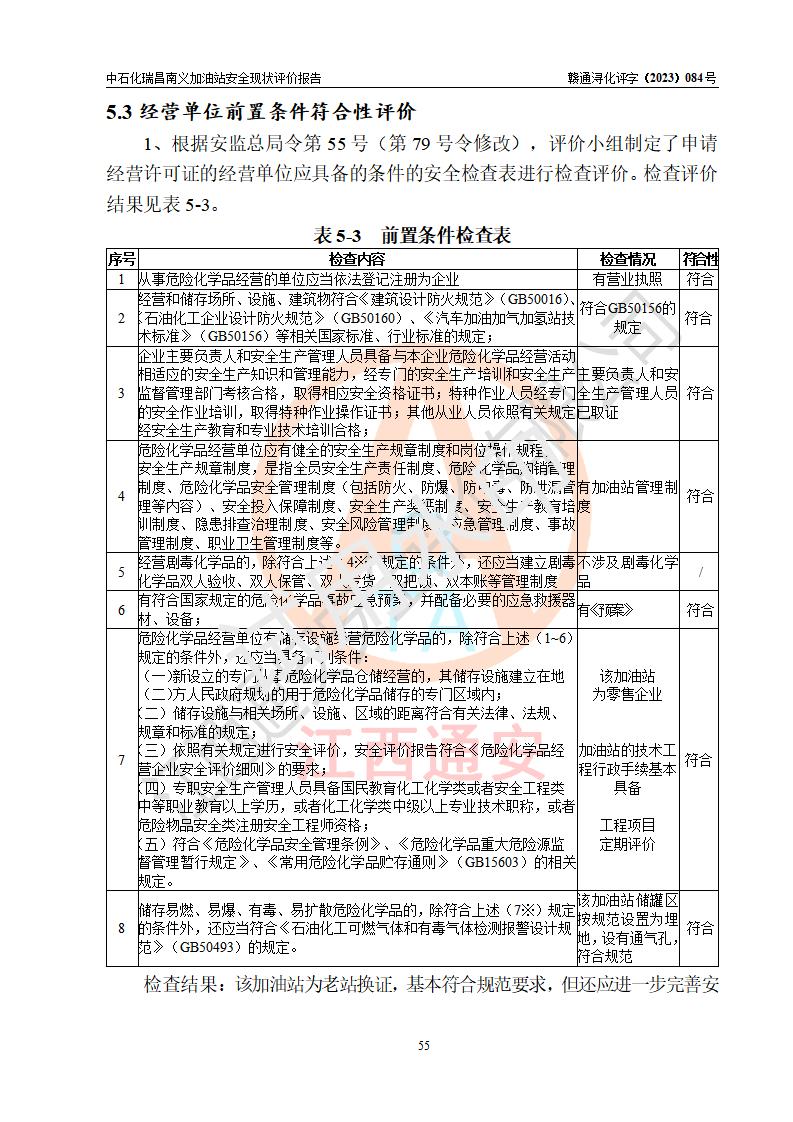 評(píng)價(jià)結(jié)論 | 中國石化銷售股份有限公司江西九江瑞昌石油分公司南義加油站涉及的安全條件、安全經(jīng)營(yíng)條件、安全生產(chǎn)管理符合《危險(xiǎn)化學(xué)品經(jīng)營(yíng)許可證管理辦法》、《汽車加油加氣加氫站技術(shù)標(biāo)準(zhǔn)》等**有關(guān)法規(guī)、標(biāo)準(zhǔn)、規(guī)范要求,能滿足危險(xiǎn)化學(xué)品經(jīng)營(yíng)安全條件。 | |||
