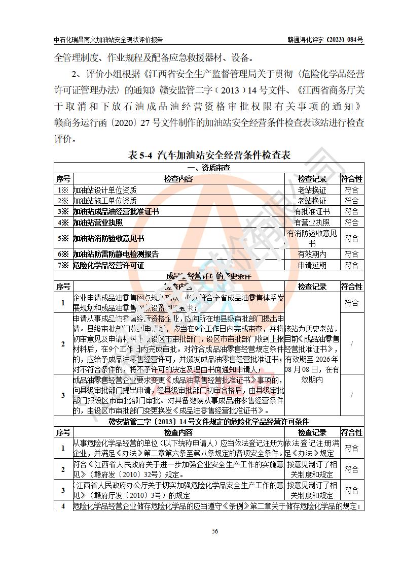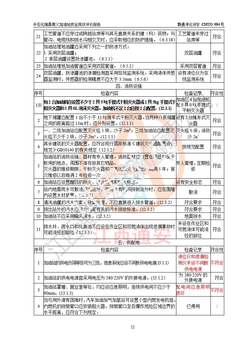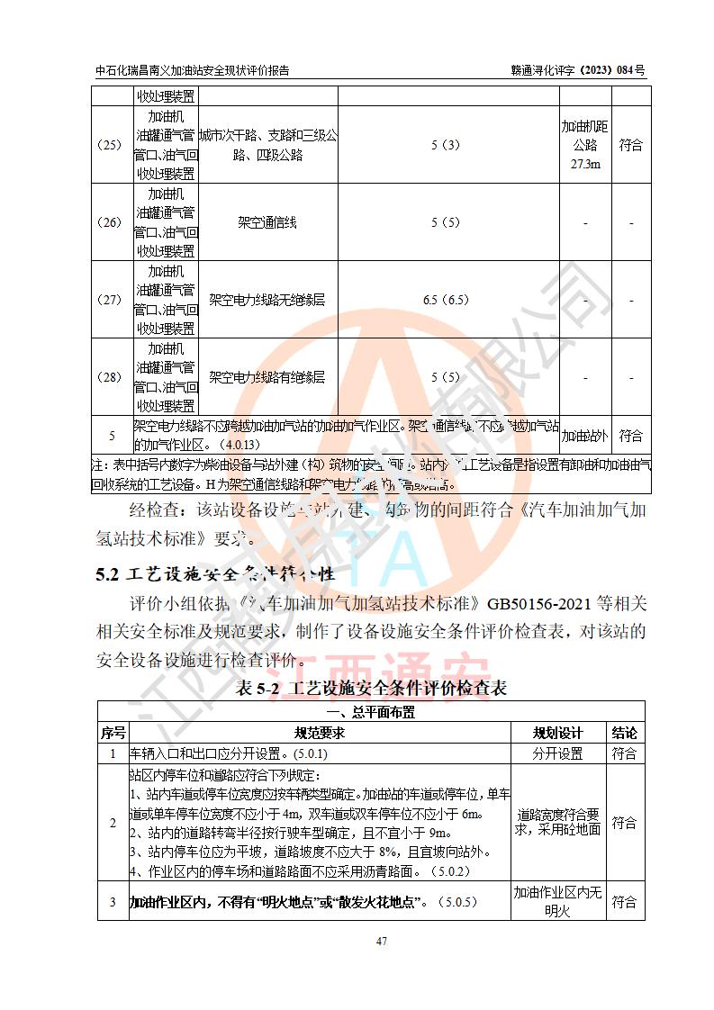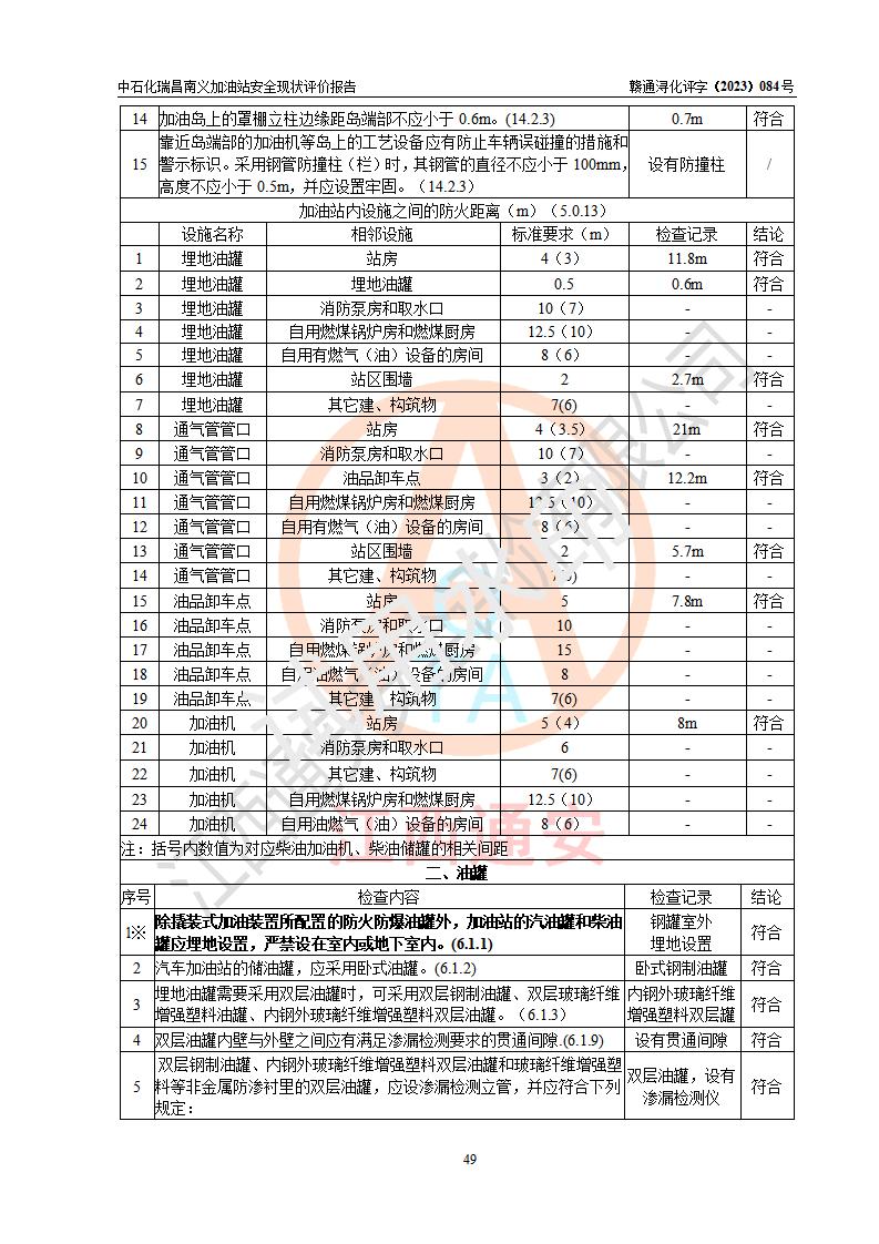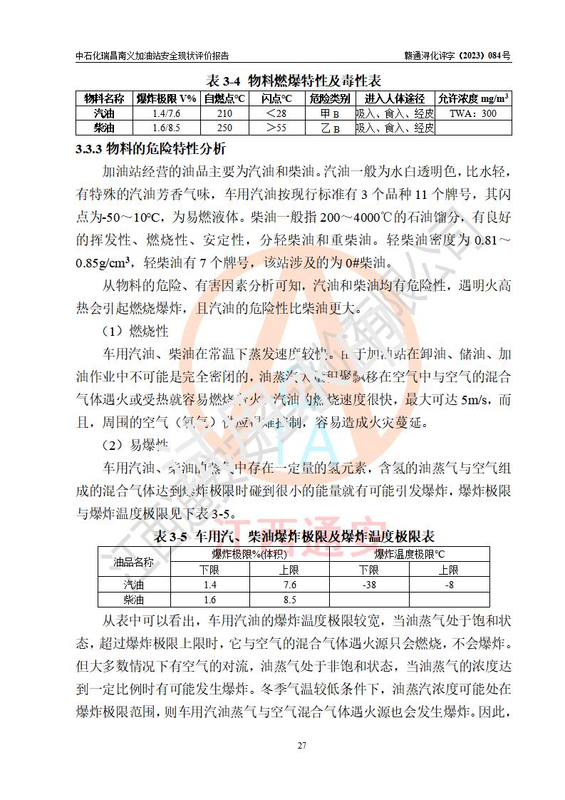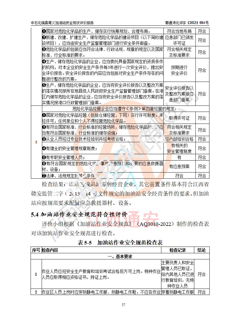 評(píng)價(jià)結(jié)論 | 中國石化銷售股份有限公司江西九江瑞昌石油分公司南義加油站涉及的安全條件、安全經(jīng)營(yíng)條件、安全生產(chǎn)管理符合《危險(xiǎn)化學(xué)品經(jīng)營(yíng)許可證管理辦法》、《汽車加油加氣加氫站技術(shù)標(biāo)準(zhǔn)》等**有關(guān)法規(guī)、標(biāo)準(zhǔn)、規(guī)范要求,能滿足危險(xiǎn)化學(xué)品經(jīng)營(yíng)安全條件。 | |||