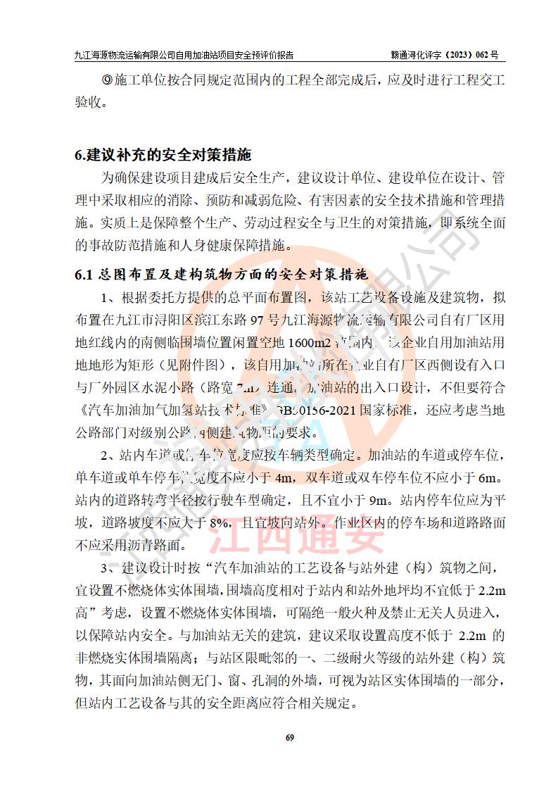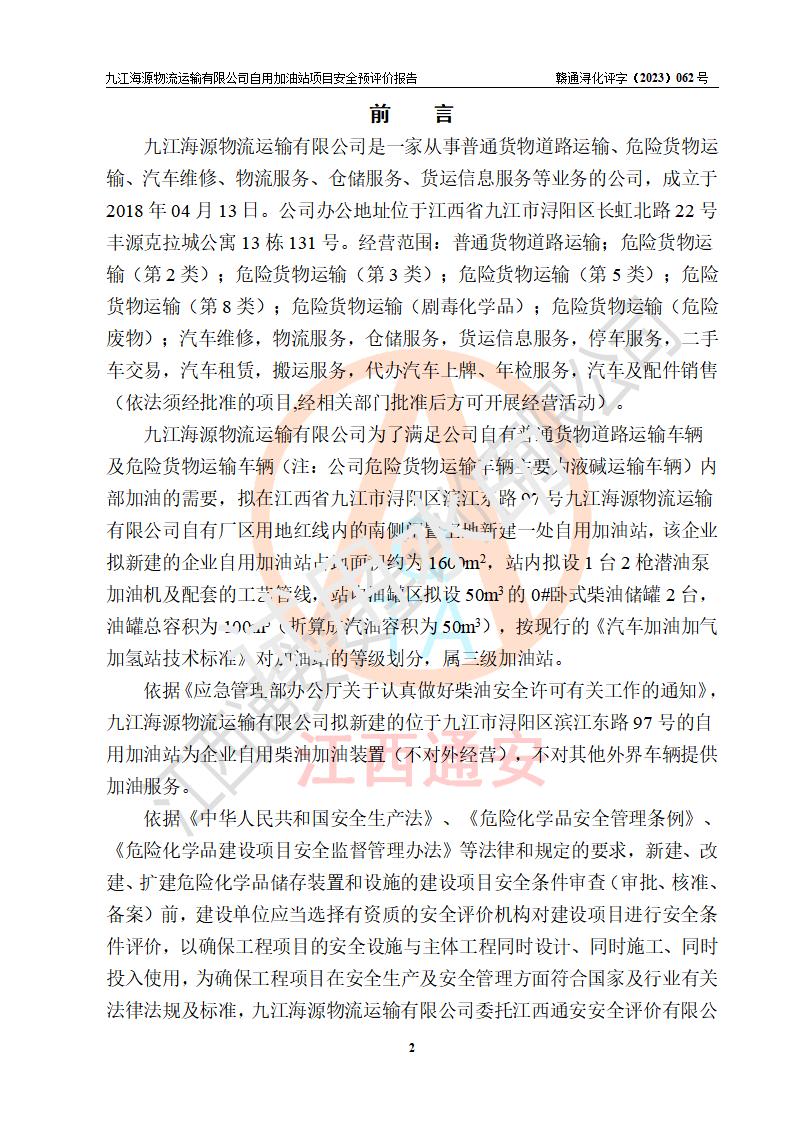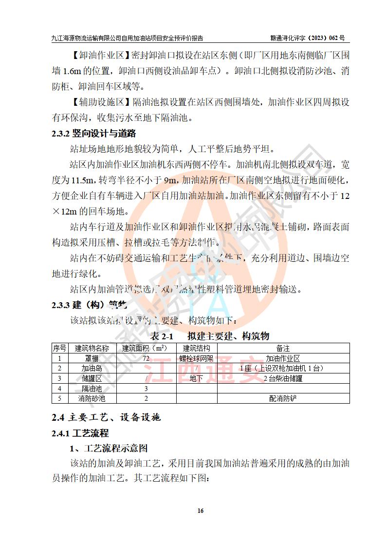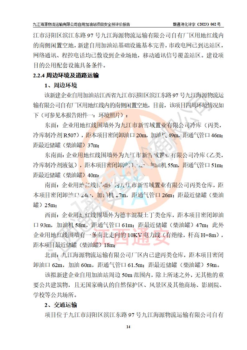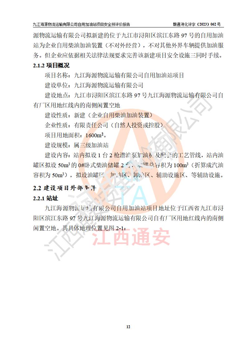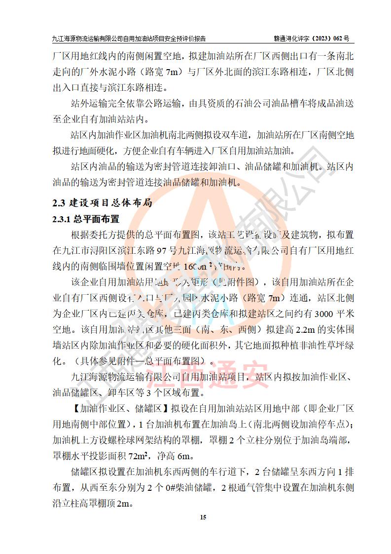 項目簡介 | 九江海源物流運輸有限公司是一家從事普通貨物道路運輸、危險貨物運輸、汽車維修、物流服務(wù)、倉儲服務(wù)、貨運信息服務(wù)等業(yè)務(wù)的公司,成立于2018年04月13日。公司辦公地址位于江西省九江市潯陽區(qū)長虹北路22號豐源克拉城公寓13棟131號。 九江海源物流運輸有限公司為了滿足公司自有普通貨物道路運輸**及危險貨物運輸**(注:公司危險貨物運輸**主要為液堿運輸**)內(nèi)部加油的需要,擬在江西省九江市潯陽區(qū)濱江東路97號九江海源物流運輸有限公司自有廠區(qū)用地紅線內(nèi)的南側(cè)閑置空地新建一處自用加油站,該企業(yè)擬新建的企業(yè)自用加油站占地面積約為1600m2,站內(nèi)擬設(shè)1臺2槍潛油泵加油機(jī)及配套的工藝管線,站內(nèi)油罐區(qū)擬設(shè)50m3的0#臥式柴油儲罐2臺,油罐總?cè)莘e為100m3(折算成汽油容積為50m3),按現(xiàn)行的《汽車加油加氣加氫站技術(shù)標(biāo)準(zhǔn)》對加油站的等級劃分,屬三級加油站。 依據(jù)《應(yīng)急管理部辦公廳關(guān)于認(rèn)真做好柴油安全許可有關(guān)工作的通知》,九江海源物流運輸有限公司擬新建的位于九江市潯陽區(qū)濱江東路97號的自用加油站為企業(yè)自用柴油加油裝置(不對外經(jīng)營),不對其他外界**提供加油服務(wù)。 | |||