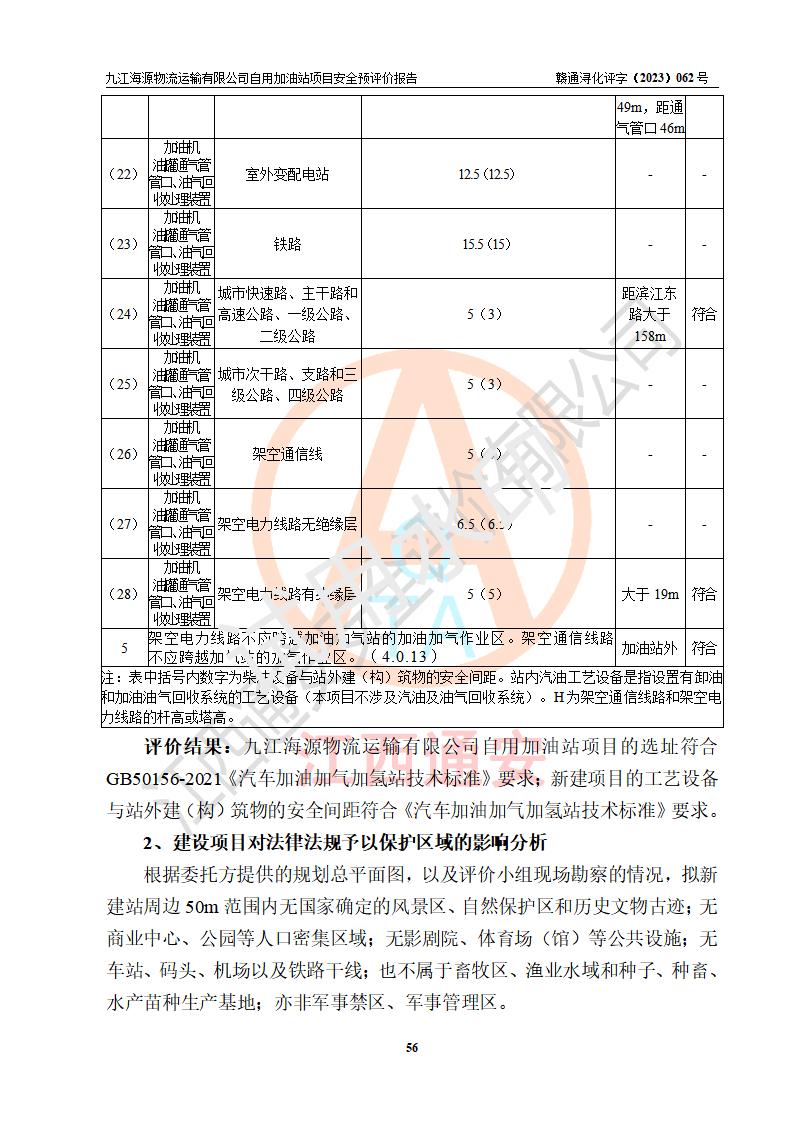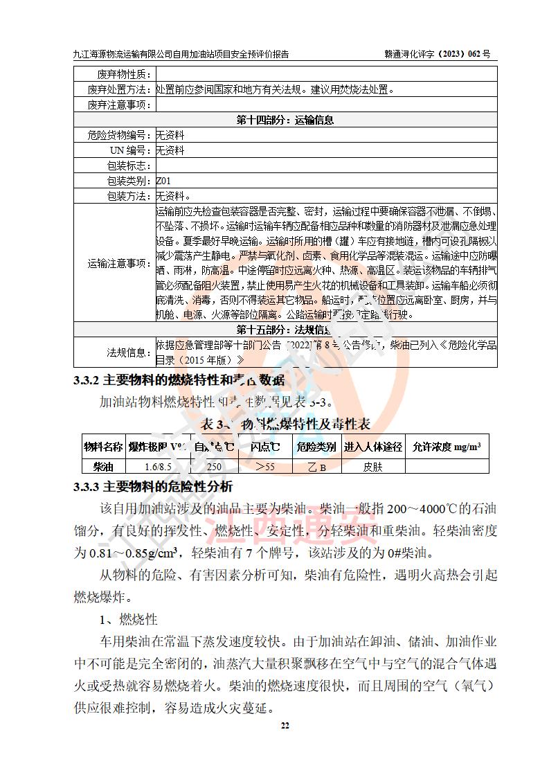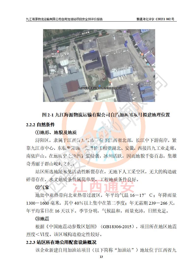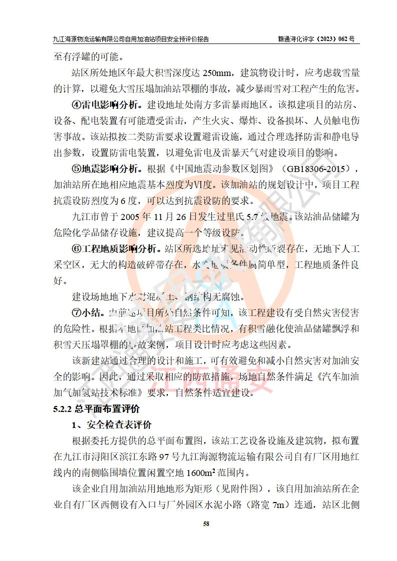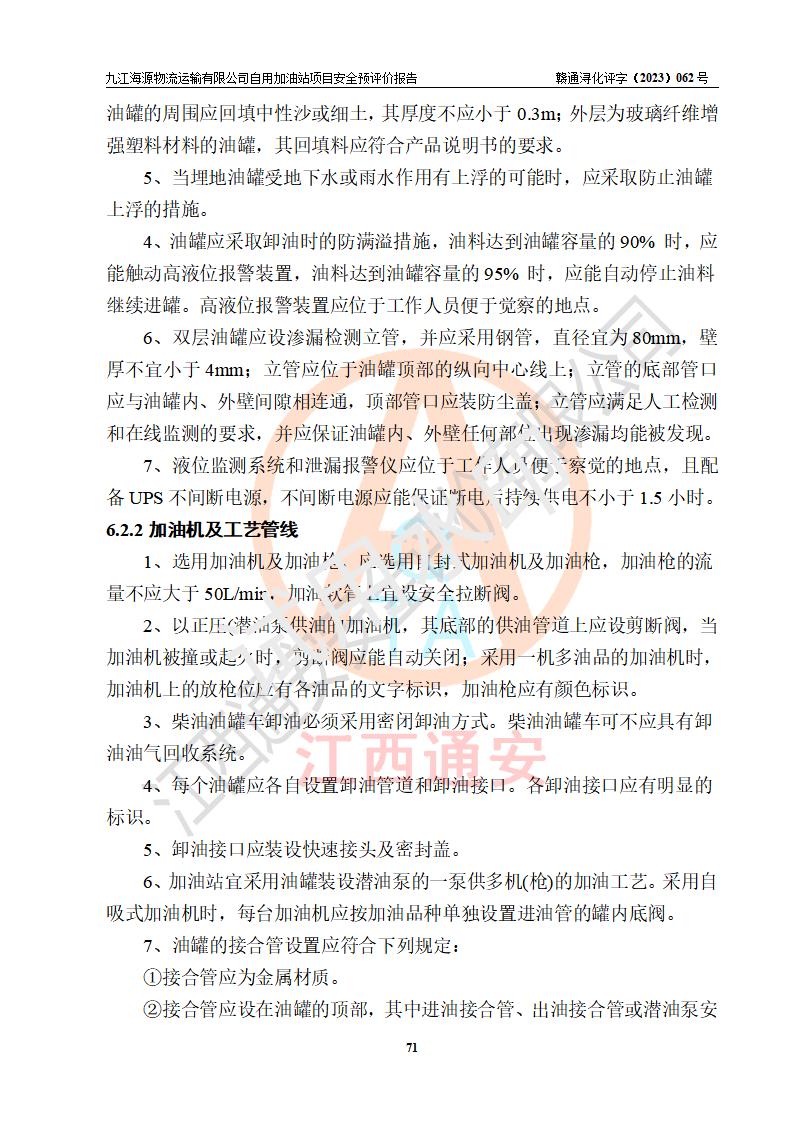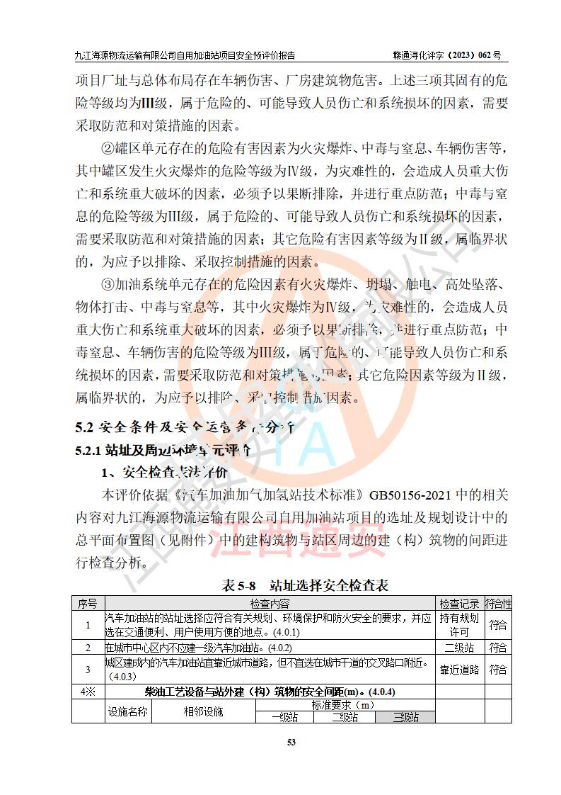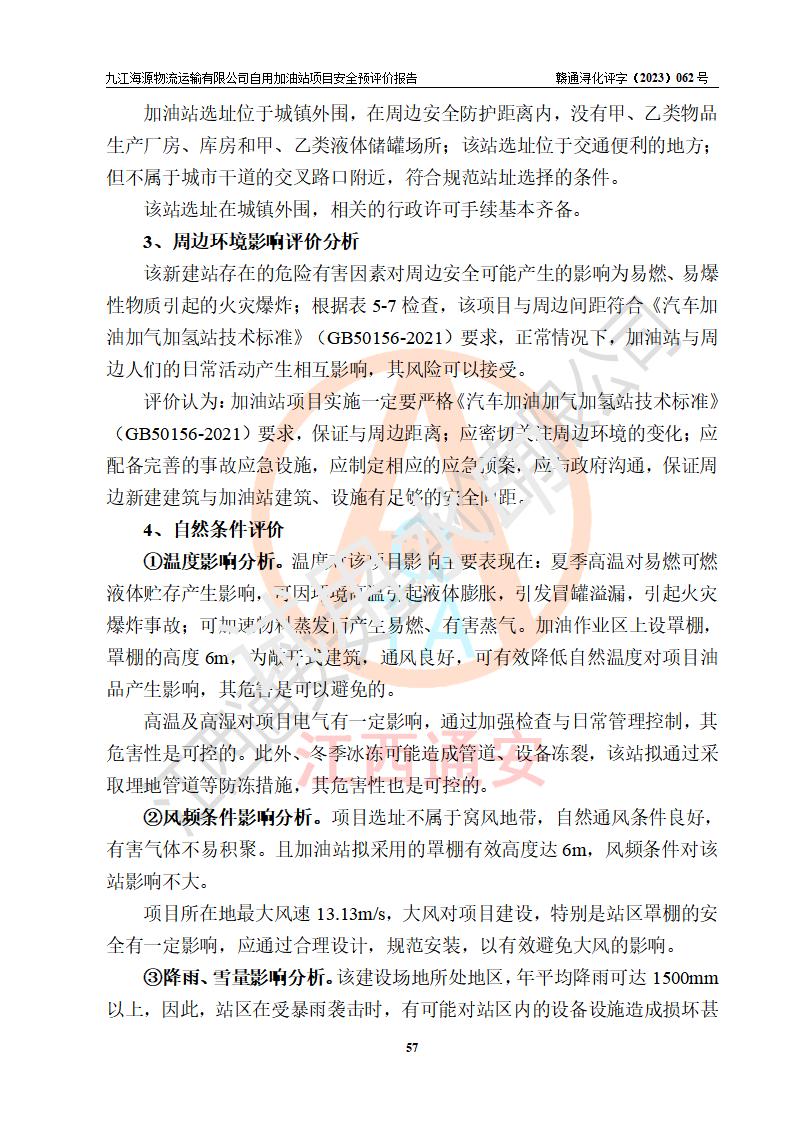 項目簡介 | 九江海源物流運輸有限公司是一家從事普通貨物道路運輸、危險貨物運輸、汽車維修、物流服務(wù)、倉儲服務(wù)、貨運信息服務(wù)等業(yè)務(wù)的公司,成立于2018年04月13日。公司辦公地址位于江西省九江市潯陽區(qū)長虹北路22號豐源克拉城公寓13棟131號。 九江海源物流運輸有限公司為了滿足公司自有普通貨物道路運輸**及危險貨物運輸**(注:公司危險貨物運輸**主要為液堿運輸**)內(nèi)部加油的需要,擬在江西省九江市潯陽區(qū)濱江東路97號九江海源物流運輸有限公司自有廠區(qū)用地紅線內(nèi)的南側(cè)閑置空地新建一處自用加油站,該企業(yè)擬新建的企業(yè)自用加油站占地面積約為1600m2,站內(nèi)擬設(shè)1臺2槍潛油泵加油機(jī)及配套的工藝管線,站內(nèi)油罐區(qū)擬設(shè)50m3的0#臥式柴油儲罐2臺,油罐總?cè)莘e為100m3(折算成汽油容積為50m3),按現(xiàn)行的《汽車加油加氣加氫站技術(shù)標(biāo)準(zhǔn)》對加油站的等級劃分,屬三級加油站。 依據(jù)《應(yīng)急管理部辦公廳關(guān)于認(rèn)真做好柴油安全許可有關(guān)工作的通知》,九江海源物流運輸有限公司擬新建的位于九江市潯陽區(qū)濱江東路97號的自用加油站為企業(yè)自用柴油加油裝置(不對外經(jīng)營),不對其他外界**提供加油服務(wù)。 | |||
