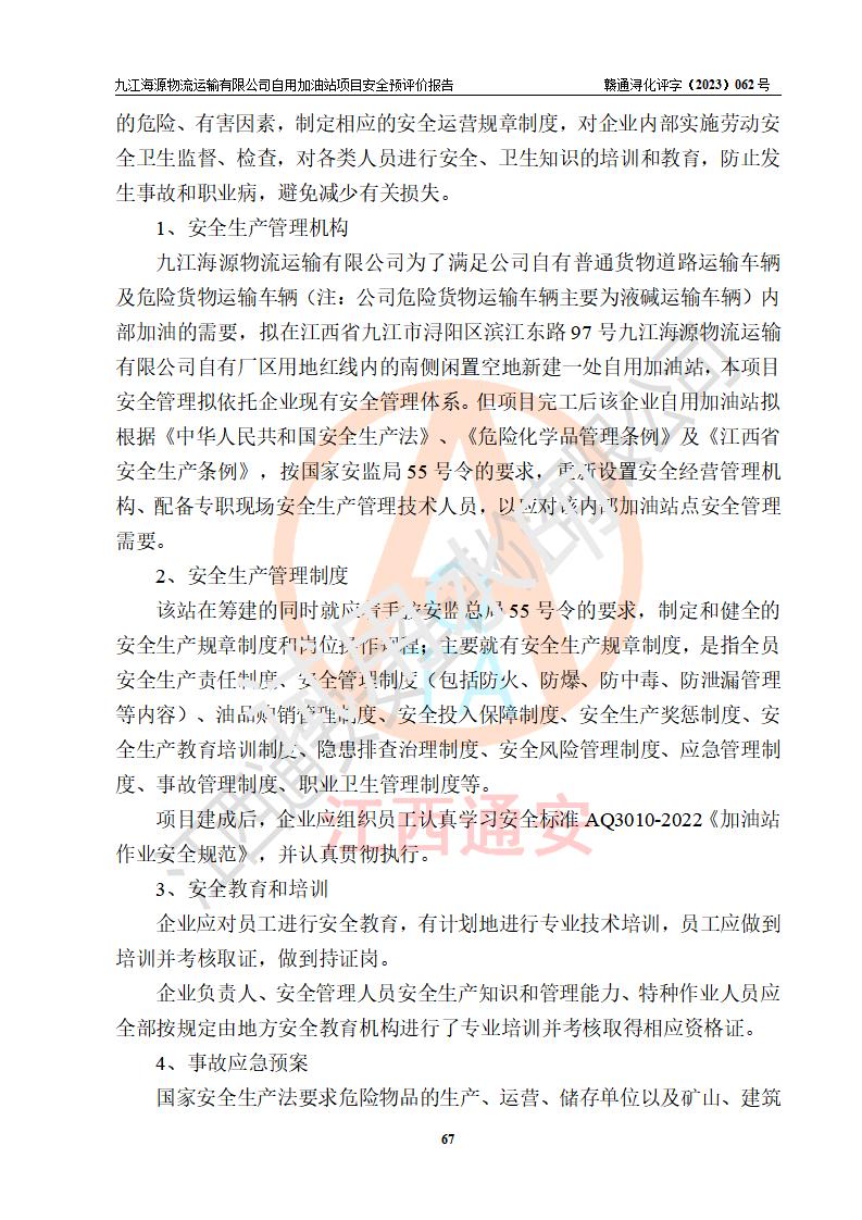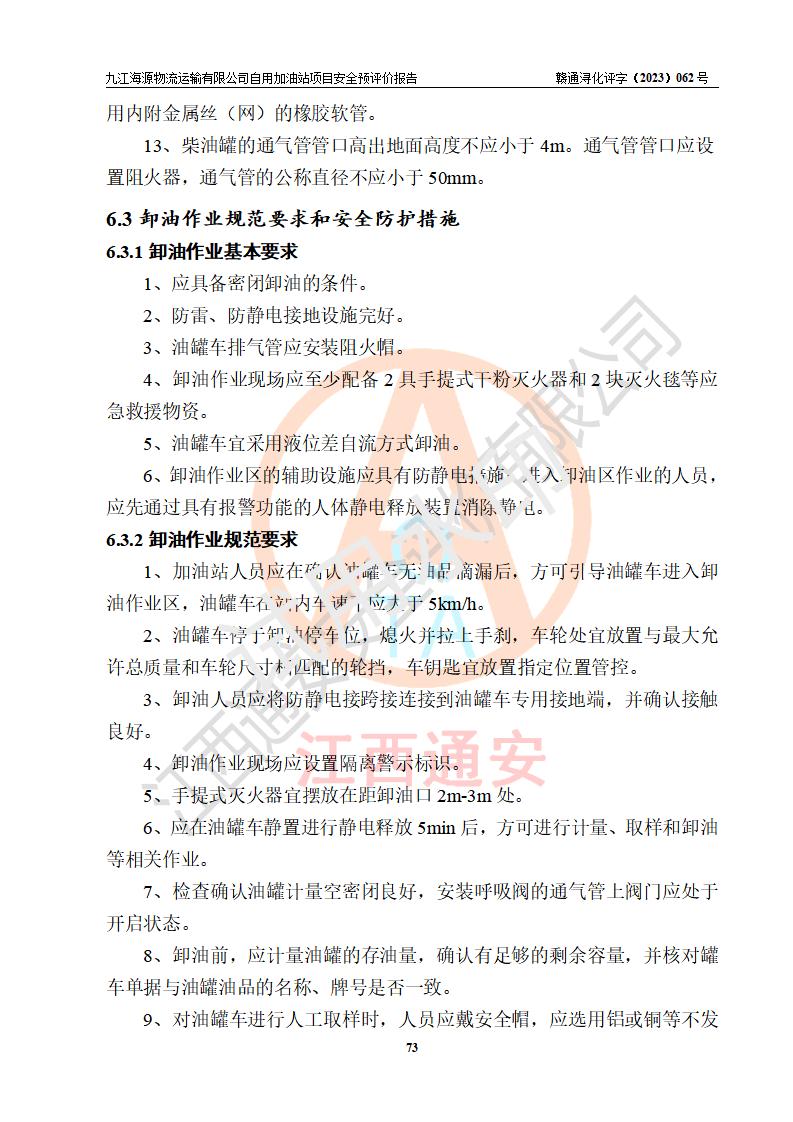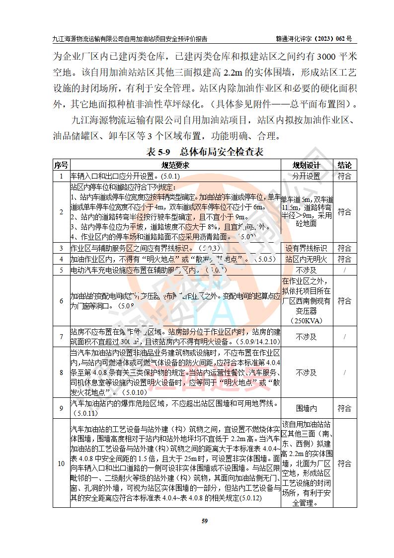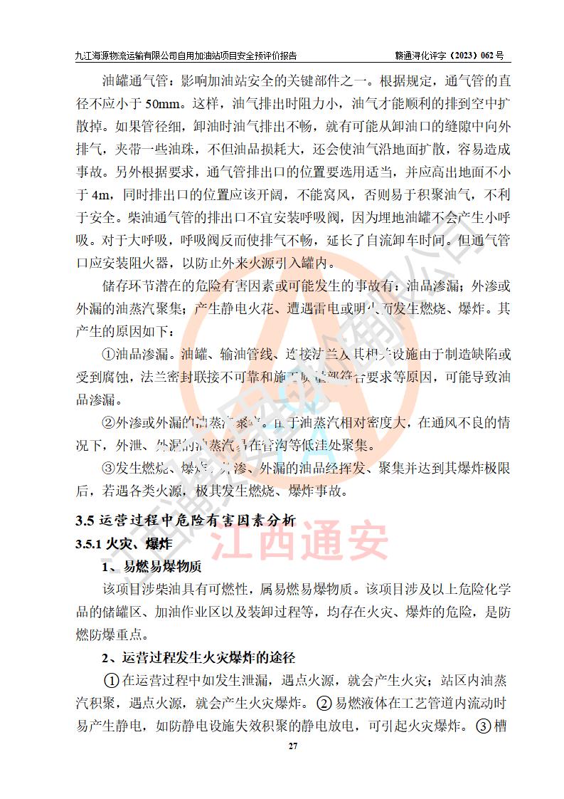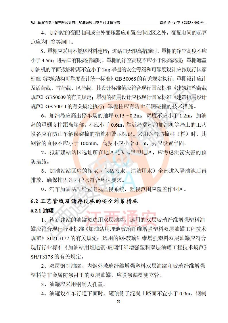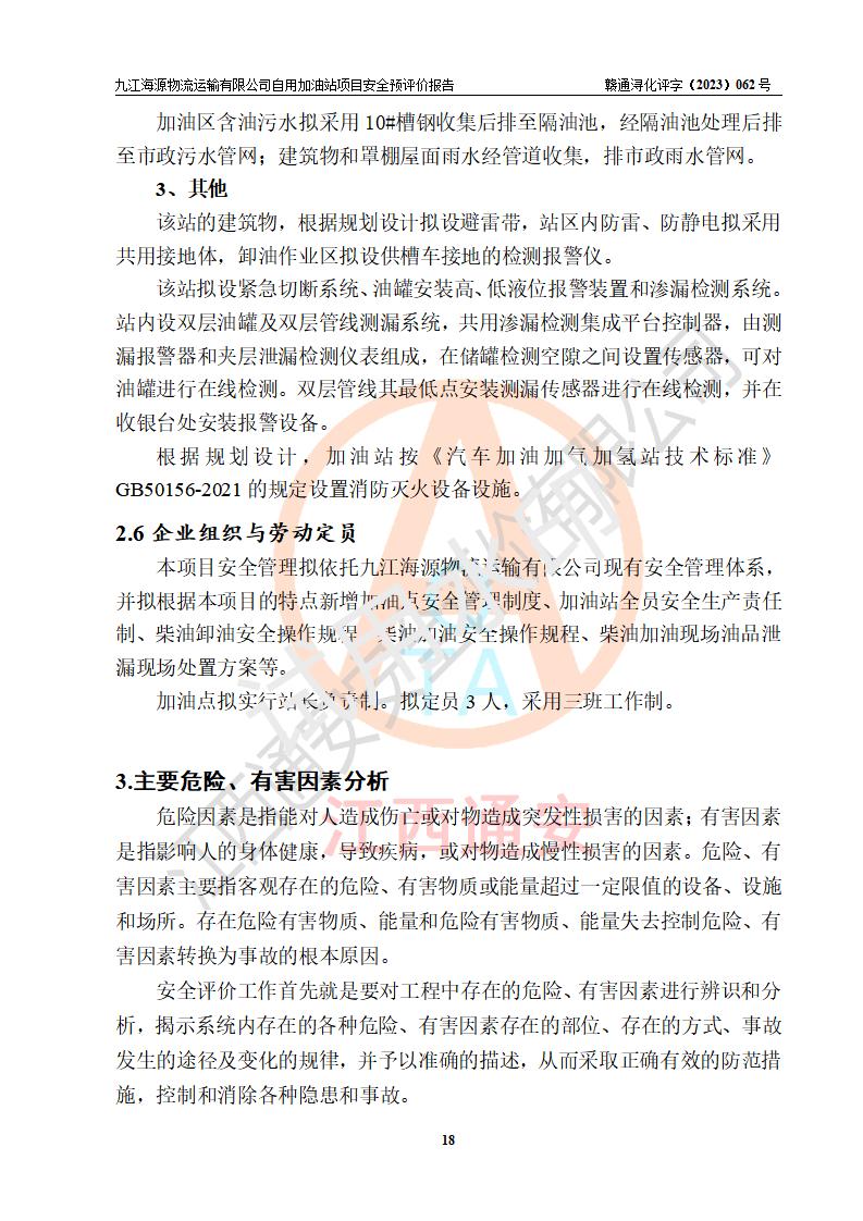 項目簡介 | 九江海源物流運輸有限公司是一家從事普通貨物道路運輸、危險貨物運輸、汽車維修、物流服務(wù)、倉儲服務(wù)、貨運信息服務(wù)等業(yè)務(wù)的公司,成立于2018年04月13日。公司辦公地址位于江西省九江市潯陽區(qū)長虹北路22號豐源克拉城公寓13棟131號。 九江海源物流運輸有限公司為了滿足公司自有普通貨物道路運輸**及危險貨物運輸**(注:公司危險貨物運輸**主要為液堿運輸**)內(nèi)部加油的需要,擬在江西省九江市潯陽區(qū)濱江東路97號九江海源物流運輸有限公司自有廠區(qū)用地紅線內(nèi)的南側(cè)閑置空地新建一處自用加油站,該企業(yè)擬新建的企業(yè)自用加油站占地面積約為1600m2,站內(nèi)擬設(shè)1臺2槍潛油泵加油機(jī)及配套的工藝管線,站內(nèi)油罐區(qū)擬設(shè)50m3的0#臥式柴油儲罐2臺,油罐總?cè)莘e為100m3(折算成汽油容積為50m3),按現(xiàn)行的《汽車加油加氣加氫站技術(shù)標(biāo)準(zhǔn)》對加油站的等級劃分,屬三級加油站。 依據(jù)《應(yīng)急管理部辦公廳關(guān)于認(rèn)真做好柴油安全許可有關(guān)工作的通知》,九江海源物流運輸有限公司擬新建的位于九江市潯陽區(qū)濱江東路97號的自用加油站為企業(yè)自用柴油加油裝置(不對外經(jīng)營),不對其他外界**提供加油服務(wù)。 | |||