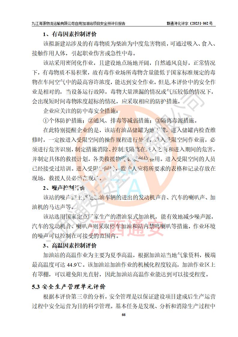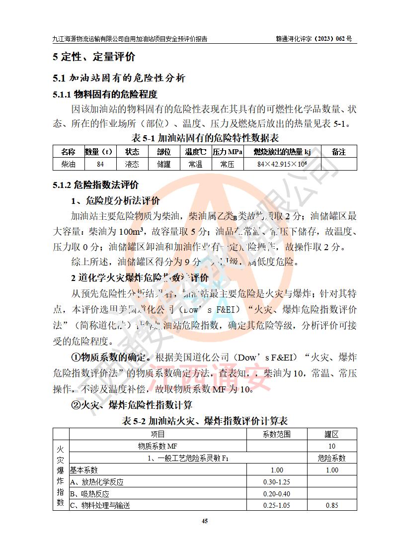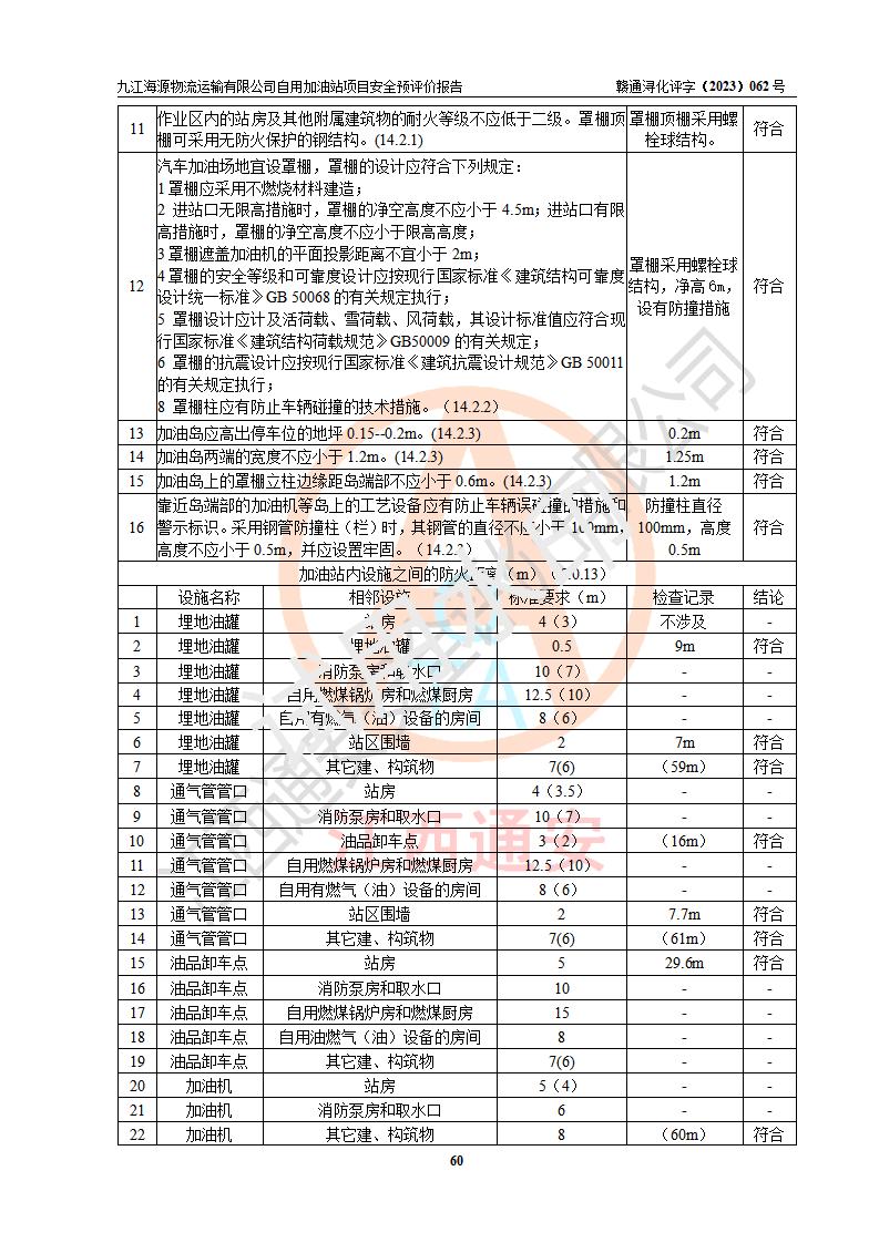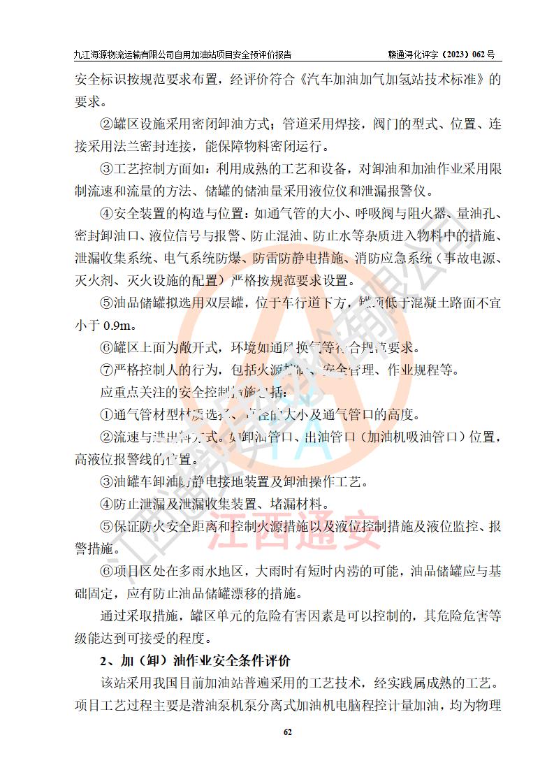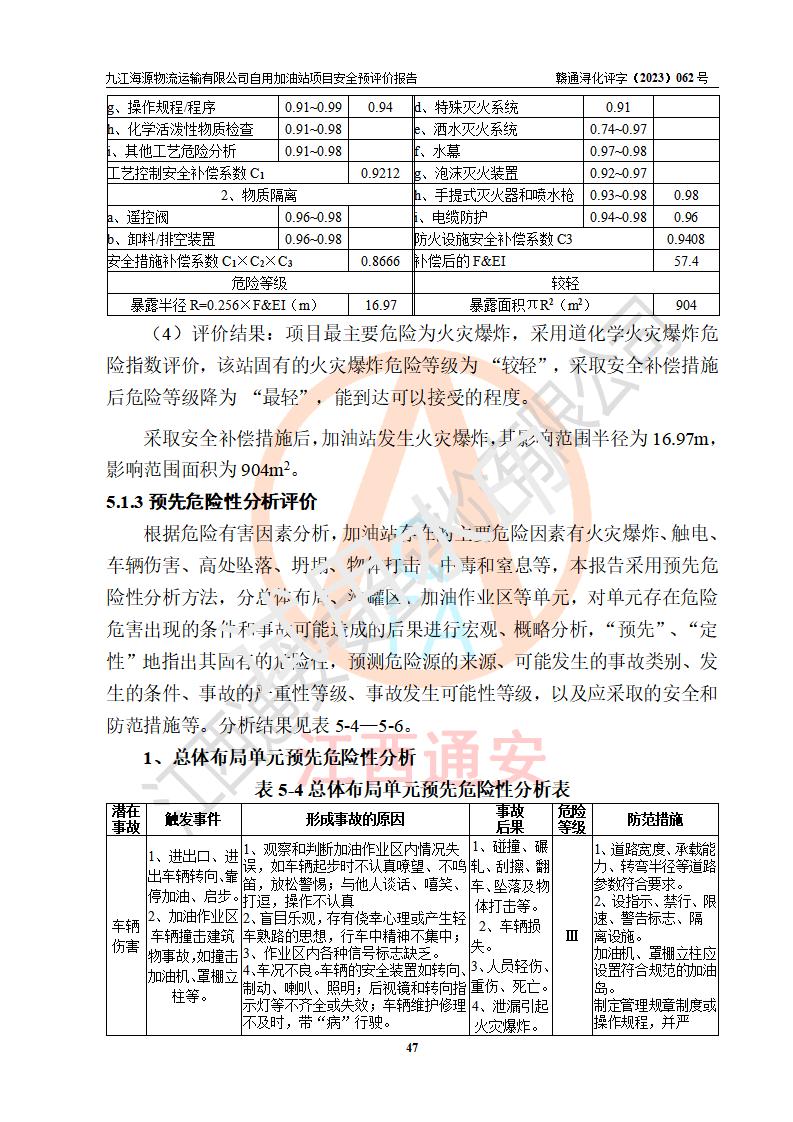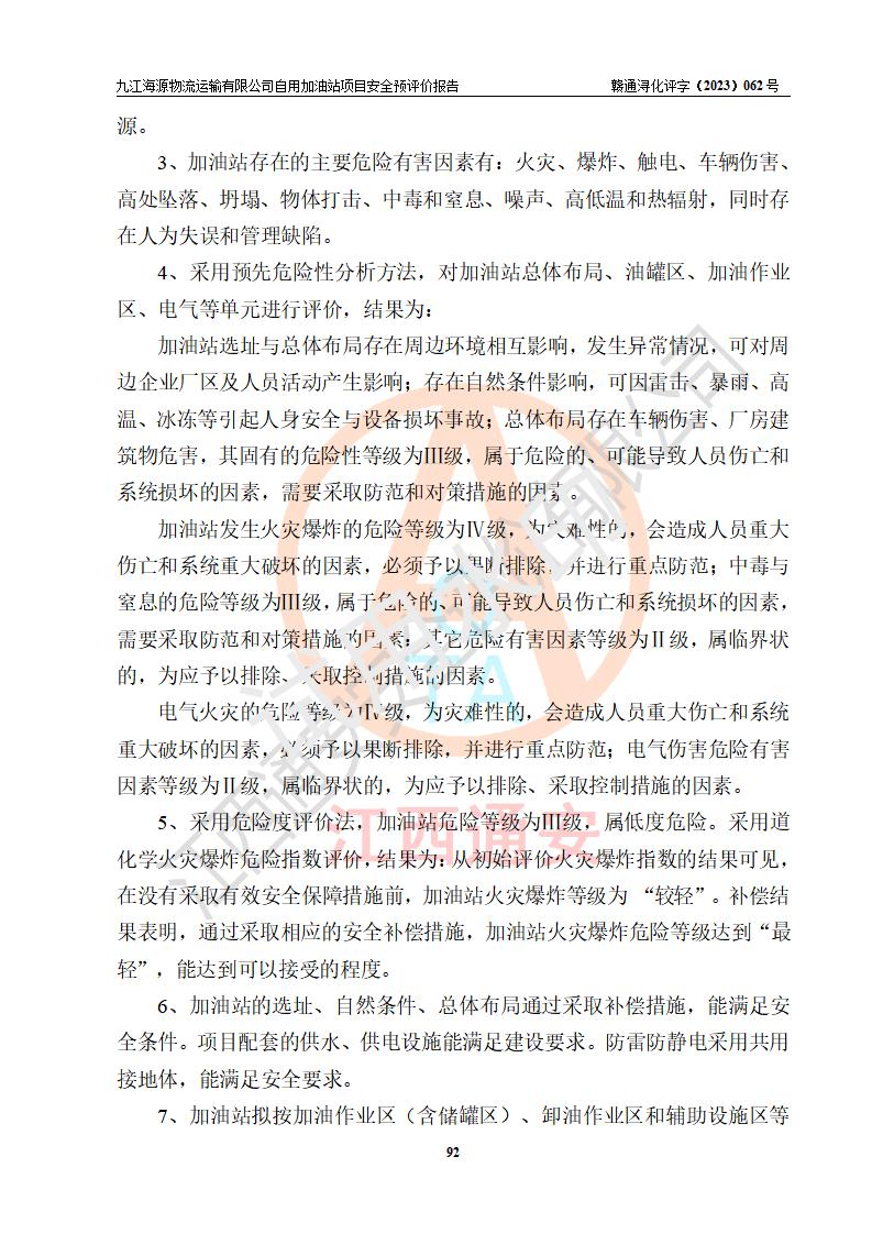 評價結(jié)論 | 九江海源物流運輸有限公司自用加油站項目的選址、自然條件適宜該項目工程的建設(shè);項目規(guī)劃設(shè)計中的總體布局方案可行,符合有關(guān)法規(guī)、標(biāo)準(zhǔn)要求;項目選擇的工藝過程及設(shè)備設(shè)施的安全可靠性能達(dá)到**法規(guī)、標(biāo)準(zhǔn)規(guī)定要求;項目存在的危險有害因素可控,在落實項目建設(shè)方案及評價報告提出的有關(guān)安全對策措施后,其危險有害程度能達(dá)到可以接受的程度,項目建設(shè)能夠?qū)崿F(xiàn)安全運行的目標(biāo)。 | |||