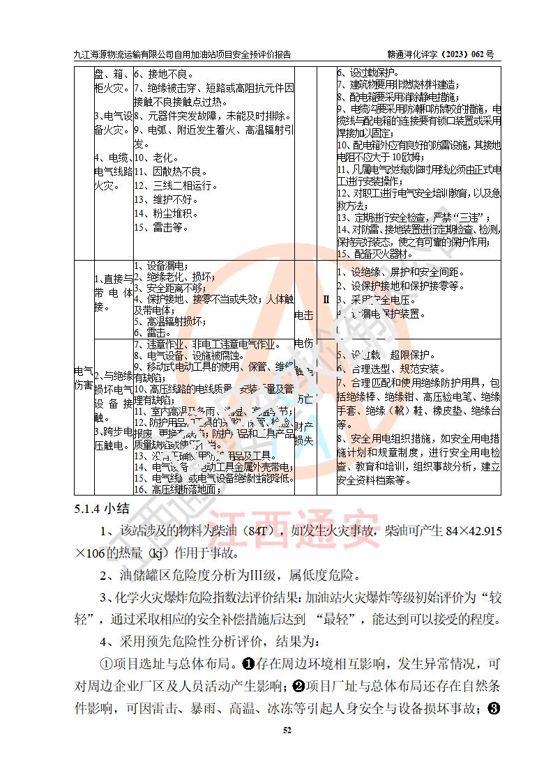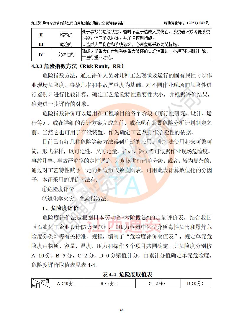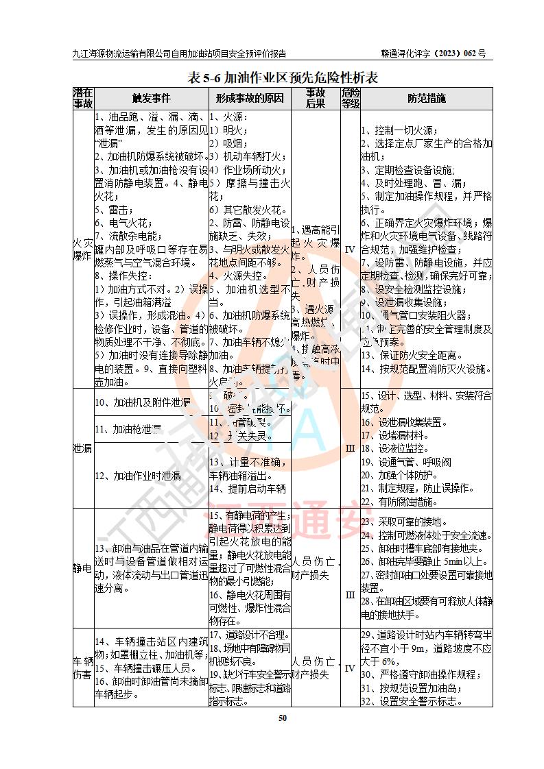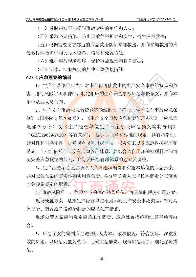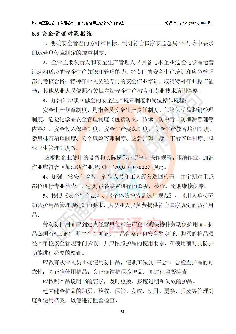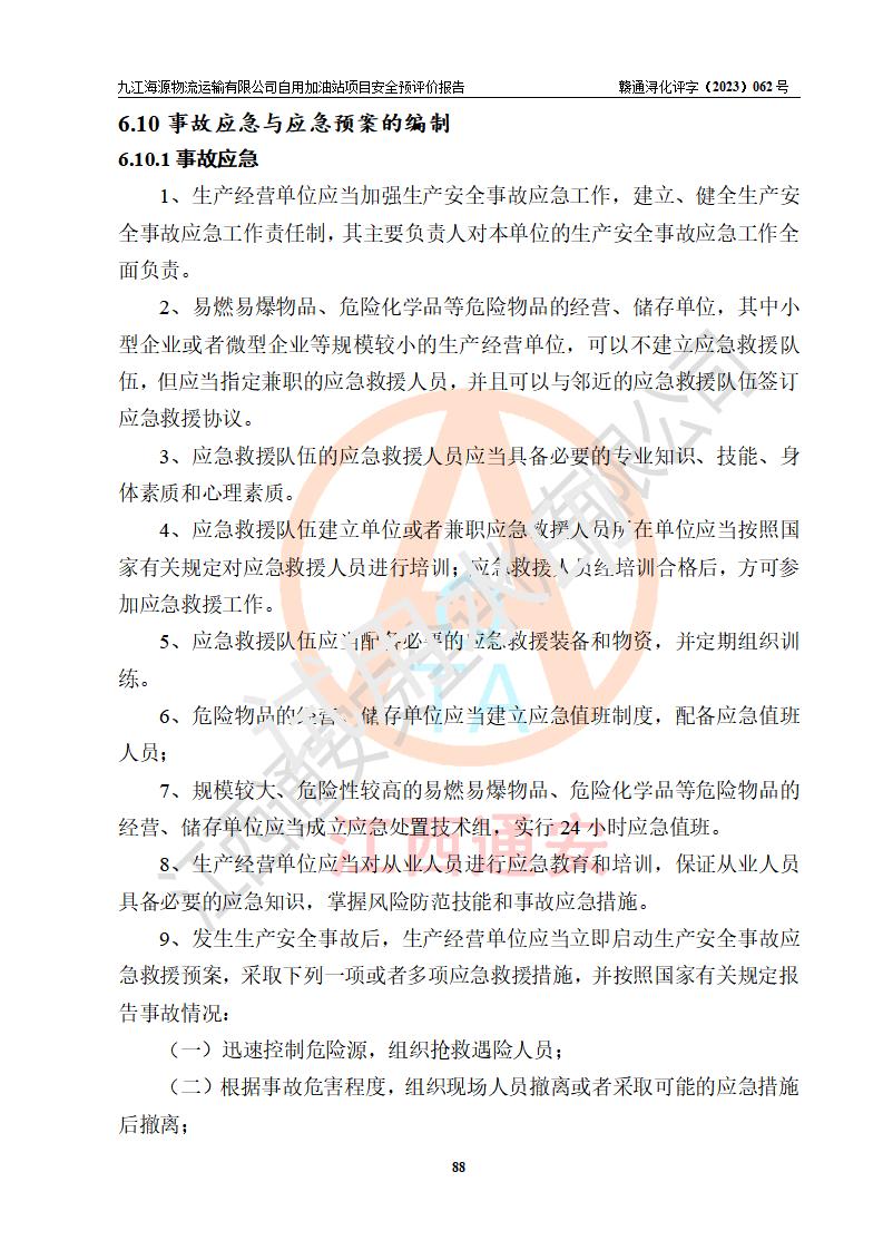 評價結(jié)論 | 九江海源物流運輸有限公司自用加油站項目的選址、自然條件適宜該項目工程的建設(shè);項目規(guī)劃設(shè)計中的總體布局方案可行,符合有關(guān)法規(guī)、標(biāo)準(zhǔn)要求;項目選擇的工藝過程及設(shè)備設(shè)施的安全可靠性能達(dá)到**法規(guī)、標(biāo)準(zhǔn)規(guī)定要求;項目存在的危險有害因素可控,在落實項目建設(shè)方案及評價報告提出的有關(guān)安全對策措施后,其危險有害程度能達(dá)到可以接受的程度,項目建設(shè)能夠?qū)崿F(xiàn)安全運行的目標(biāo)。 | |||