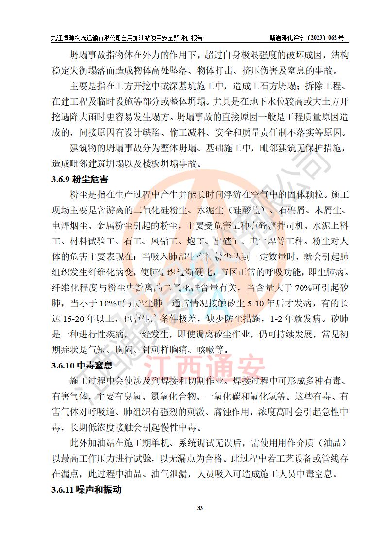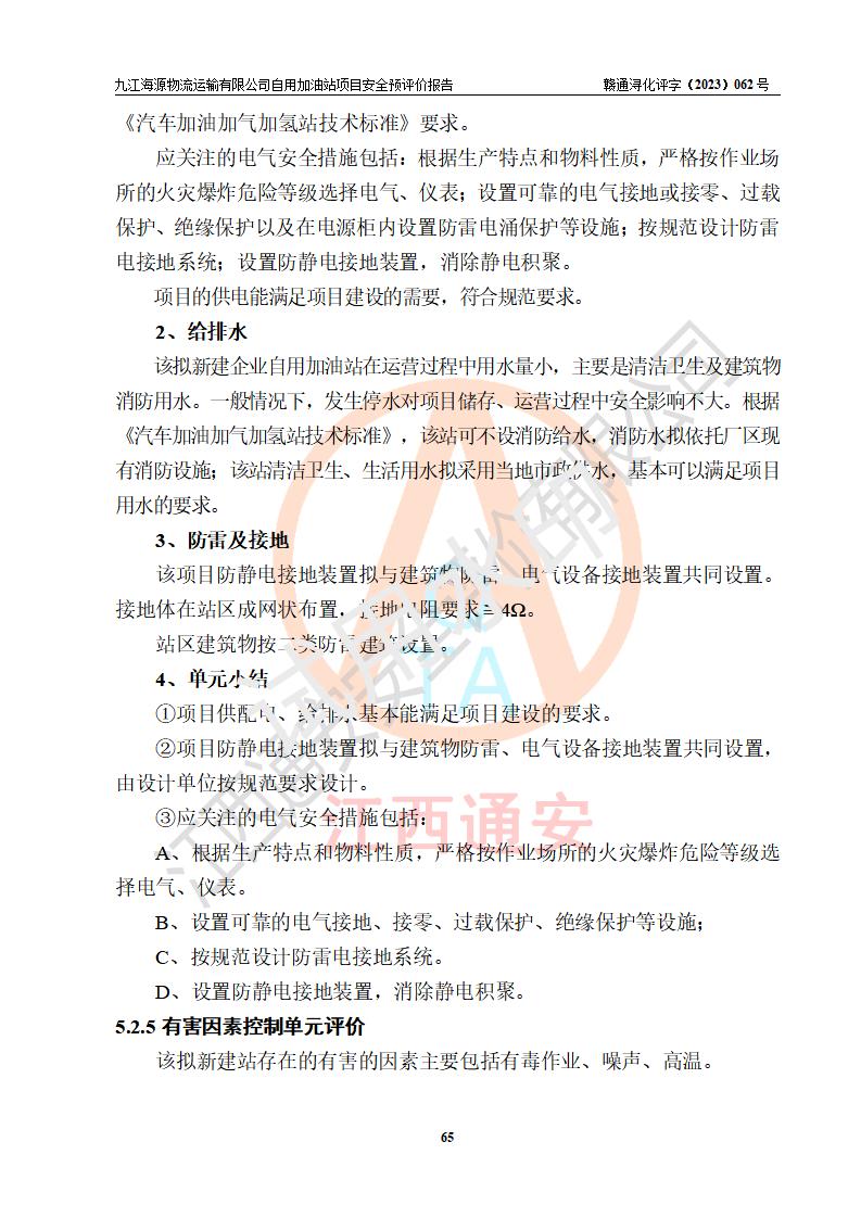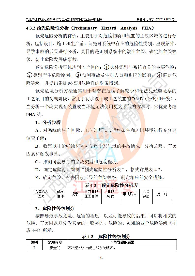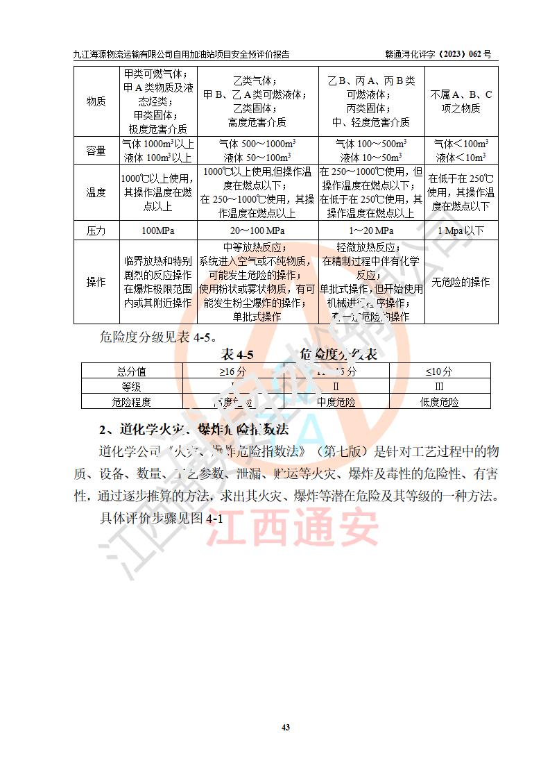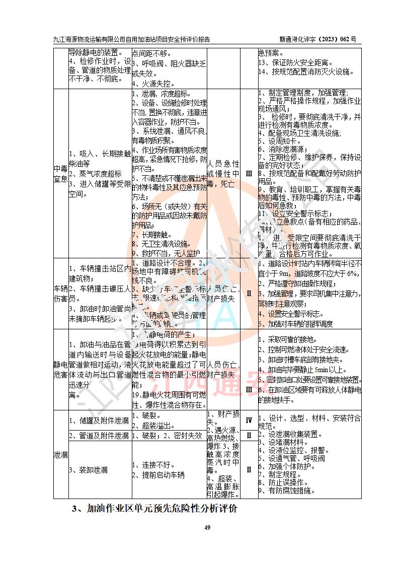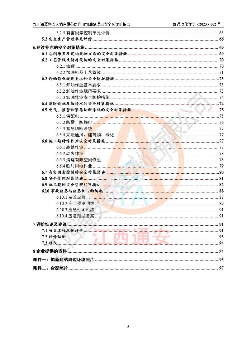 評價結(jié)論 | 九江海源物流運輸有限公司自用加油站項目的選址、自然條件適宜該項目工程的建設(shè);項目規(guī)劃設(shè)計中的總體布局方案可行,符合有關(guān)法規(guī)、標(biāo)準(zhǔn)要求;項目選擇的工藝過程及設(shè)備設(shè)施的安全可靠性能達(dá)到**法規(guī)、標(biāo)準(zhǔn)規(guī)定要求;項目存在的危險有害因素可控,在落實項目建設(shè)方案及評價報告提出的有關(guān)安全對策措施后,其危險有害程度能達(dá)到可以接受的程度,項目建設(shè)能夠?qū)崿F(xiàn)安全運行的目標(biāo)。 | |||