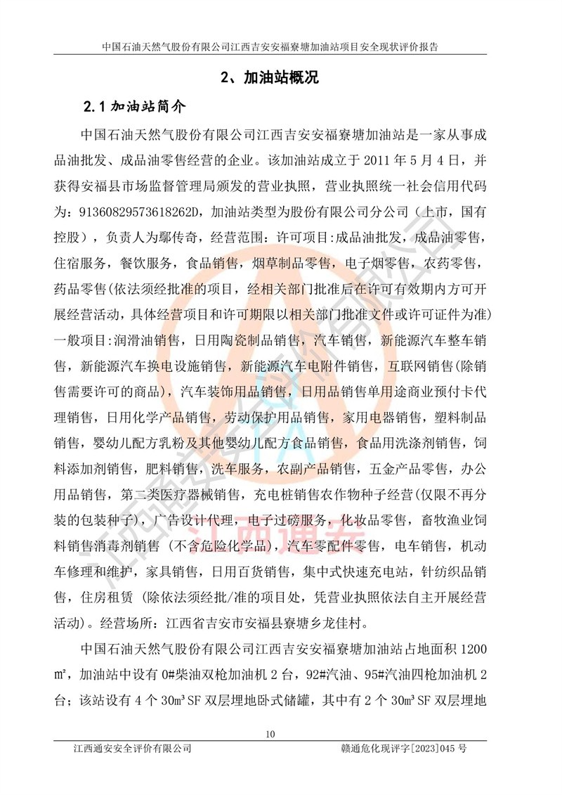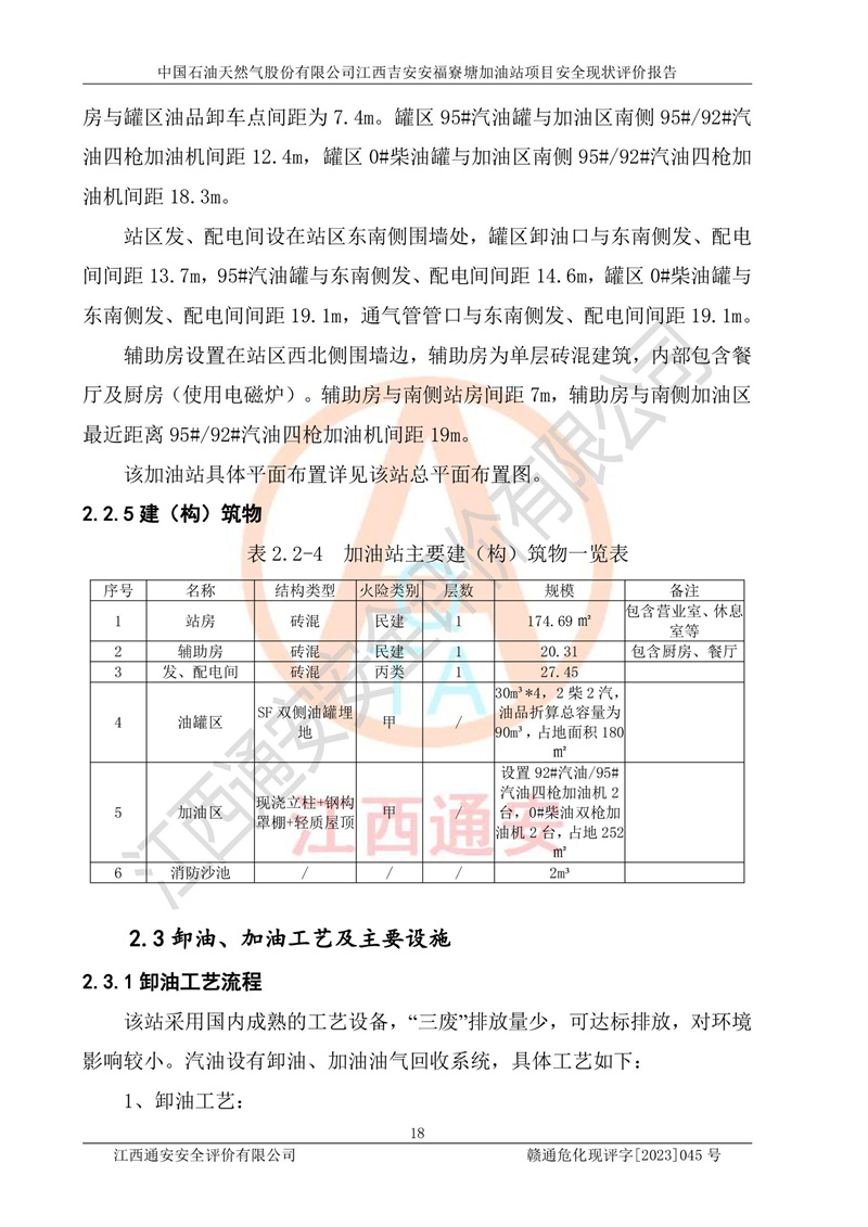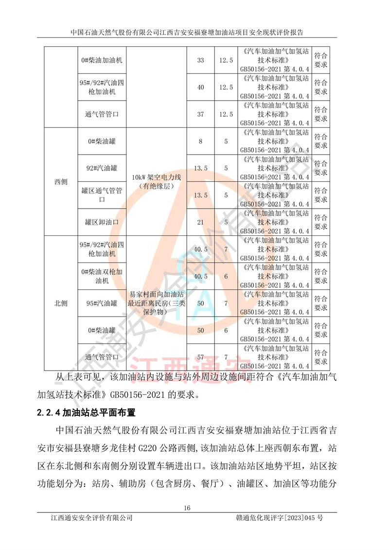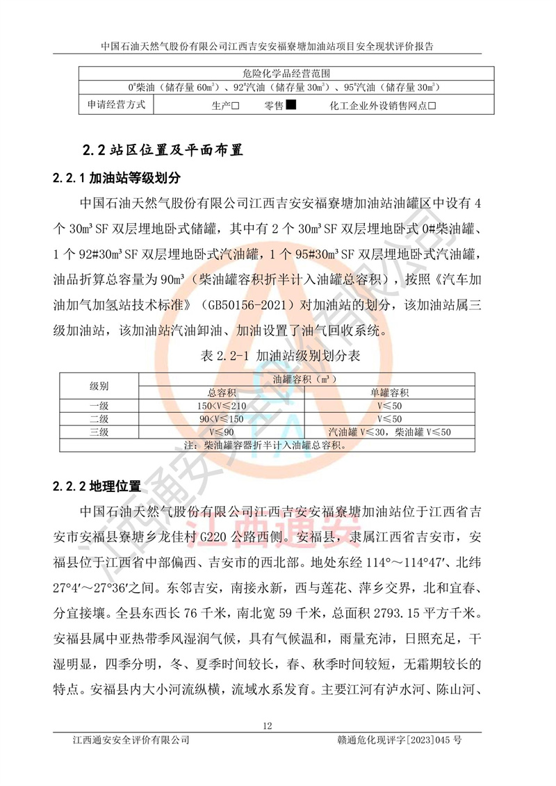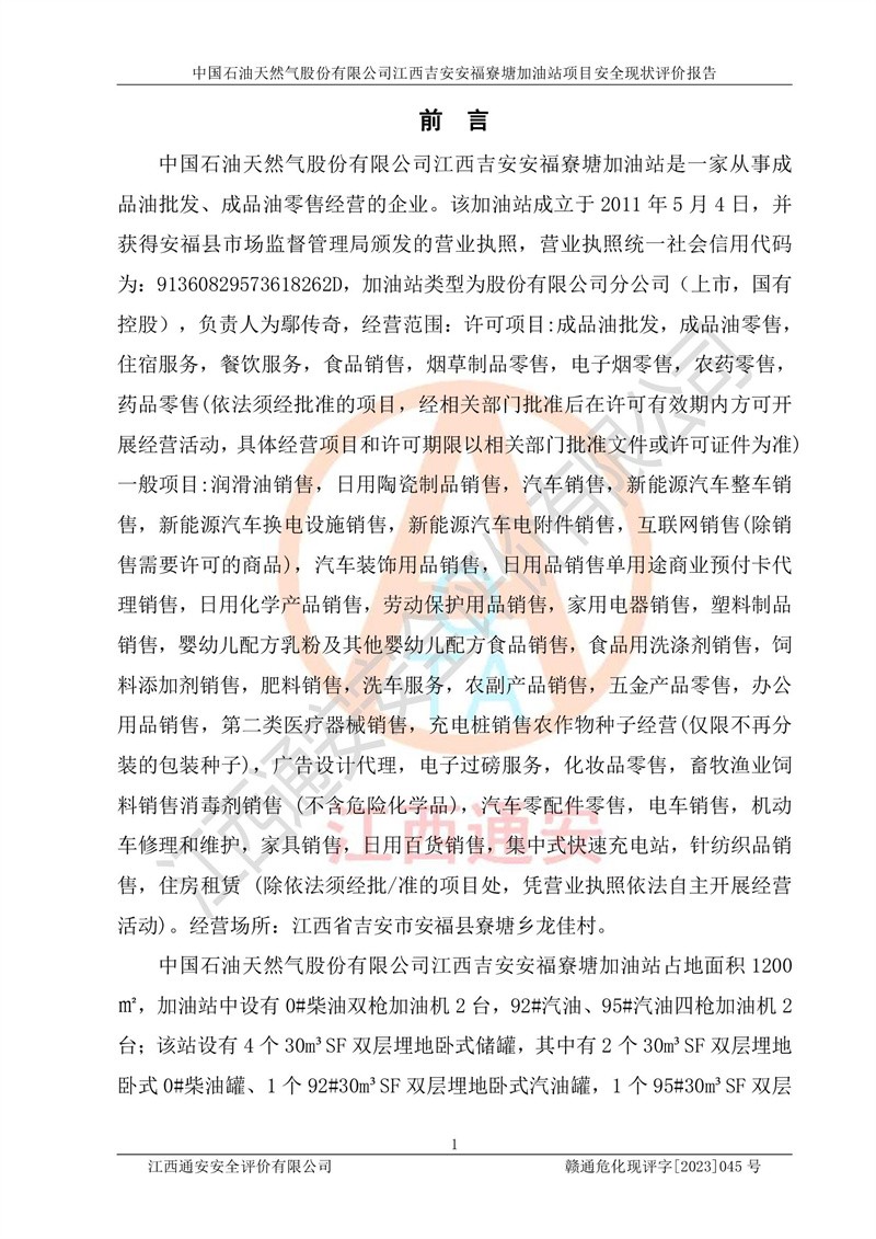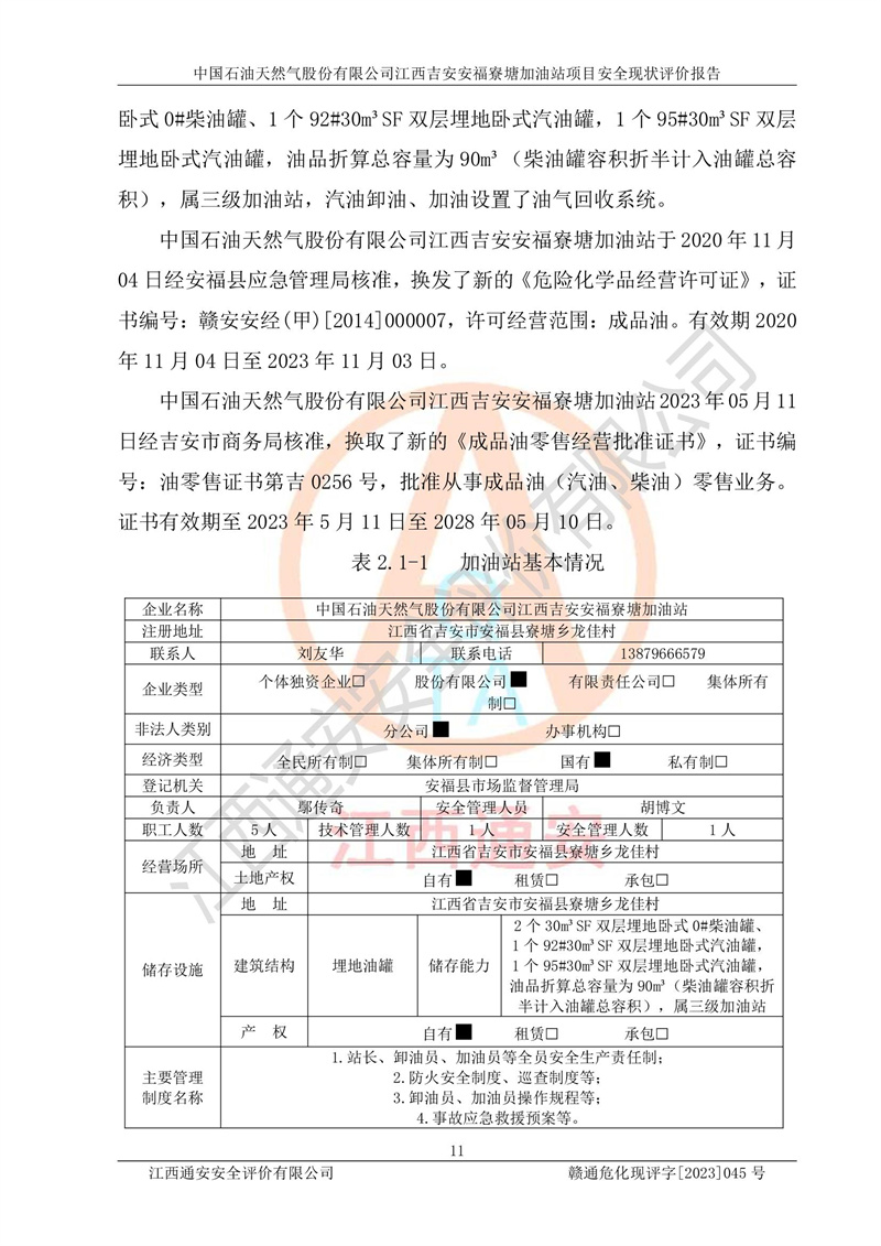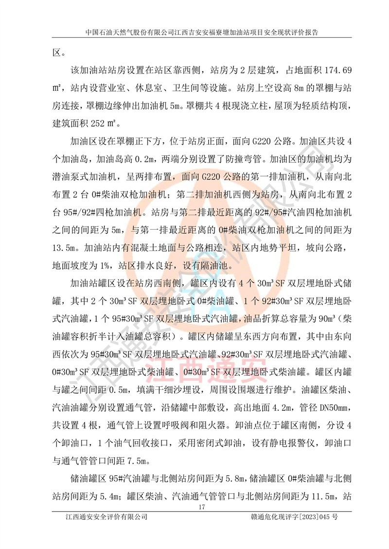 中國石油天然氣股份有限公司江西吉安安福寮塘加油站是一家從事成品油批發(fā)、成品油零售經(jīng)營的企業(yè)。該加油站成立于2011年5月4日,并獲得安??h市場監(jiān)督管理局頒發(fā)的營業(yè)執(zhí)照,營業(yè)執(zhí)照統(tǒng)一社會(huì)信用代碼為:91360829573618262D,加油站類型為股份有限公司分公司(上市,國有控股),負(fù)責(zé)人為鄢**,經(jīng)營范圍:許可項(xiàng)目:成品油批發(fā),成品油零售,住宿服務(wù),餐飲服務(wù),食品銷售,煙草制品零售,***零售,農(nóng)藥零售,藥品零售(依法須經(jīng)批準(zhǔn)的項(xiàng)目,經(jīng)相關(guān)部門批準(zhǔn)后在許可**期內(nèi)方可開展經(jīng)營活動(dòng),具體經(jīng)營項(xiàng)目和許可期限以相關(guān)部門批準(zhǔn)文件或許可證件為準(zhǔn))一般項(xiàng)目:潤滑油銷售,日用陶瓷制品銷售,汽車銷售,新能源汽車整車銷售,新能源汽車換電設(shè)施銷售,新能源汽車電附件銷售,互聯(lián)網(wǎng)銷售(除銷售需要許可的商品),汽車裝飾用品銷售,日用品銷售單用途商業(yè)預(yù)付卡代理銷售,日用化學(xué)產(chǎn)品銷售,勞動(dòng)保護(hù)用品銷售,家用電器銷售,塑料制品銷售,嬰幼兒配方乳粉及其他嬰幼兒配方食品銷售,食品用洗滌劑銷售,飼料添加劑銷售,肥料銷售,洗車服務(wù),農(nóng)副產(chǎn)品銷售,五金產(chǎn)品零售,辦公用品銷售,第二類醫(yī)療器械銷售,充電樁銷售農(nóng)作物種子經(jīng)營(**不再分裝的包裝種子),廣告設(shè)計(jì)代理,電子過磅服務(wù),化妝品零售,畜牧漁業(yè)飼料銷售消毒劑銷售 (不含危險(xiǎn)化學(xué)品),汽車零配件零售,電車銷售,機(jī)動(dòng)車修理和維護(hù),家具銷售,日用百貨銷售,集中式**充電站,針紡織品銷售,住房租賃 (除依法須經(jīng)批/準(zhǔn)的項(xiàng)目處,憑營業(yè)執(zhí)照依法自主開展經(jīng)營活動(dòng))。經(jīng)營場所:江西省吉安市安??h寮塘鄉(xiāng)龍佳村。 中國石油天然氣股份有限公司江西吉安安福寮塘加油站占地面積1200㎡,加油站中設(shè)有0#柴油雙槍加油機(jī)2臺(tái),92#汽油、95#汽油四槍加油機(jī)2臺(tái);該站設(shè)有4個(gè)30m3SF雙層埋地臥式儲(chǔ)罐,其中有2個(gè)30m3SF雙層埋地臥式0#柴油罐、1個(gè)92#30m3SF雙層埋地臥式汽油罐,1個(gè)95#30m3SF雙層埋地臥式汽油罐,油品折算總?cè)萘繛?/span>90m3(柴油罐容積折半計(jì)入油罐總?cè)莘e),屬三級加油站,汽油卸油、加油設(shè)置了油氣回收系統(tǒng)。 中國石油天然氣股份有限公司江西吉安安福寮塘加油站于2020年11月04日經(jīng)安??h應(yīng)急管理局核準(zhǔn),換發(fā)了新的《危險(xiǎn)化學(xué)品經(jīng)營許可證》,證書編號(hào):贛安安經(jīng)(甲)[2014]000007,許可經(jīng)營范圍:成品油。**期2020年11月04日至2023年11月03日。 中國石油天然氣股份有限公司江西吉安安福寮塘加油站2023年05月11日經(jīng)吉安市商務(wù)局核準(zhǔn),換取了新的《成品油零售經(jīng)營批準(zhǔn)證書》,證書編號(hào):油零售證書第吉0256號(hào),批準(zhǔn)從事成品油(汽油、柴油)零售業(yè)務(wù)。證書**期至2023年5月11日至2028年05月10日。 |